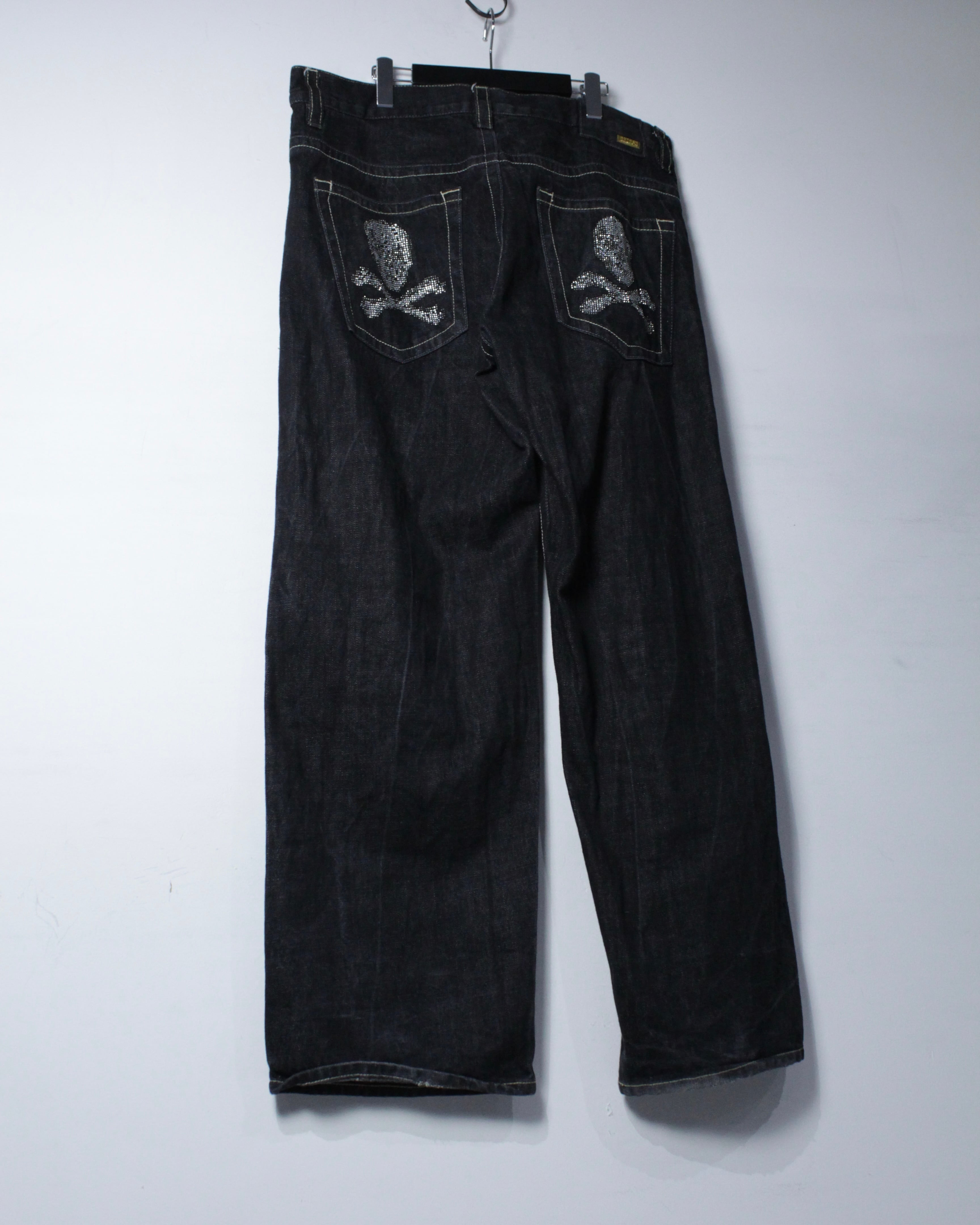 バックポケットにはラインストーンで表現されたスカルモチーフを配置。アイコニックかつラグジュアリーなアクセントとなり、シンプルなフロントとのコントラストで後ろ姿まで抜かりないデザイン。ステッチワークやブランドプレートなど、細部にまで抜かりない作り込みも魅力です。