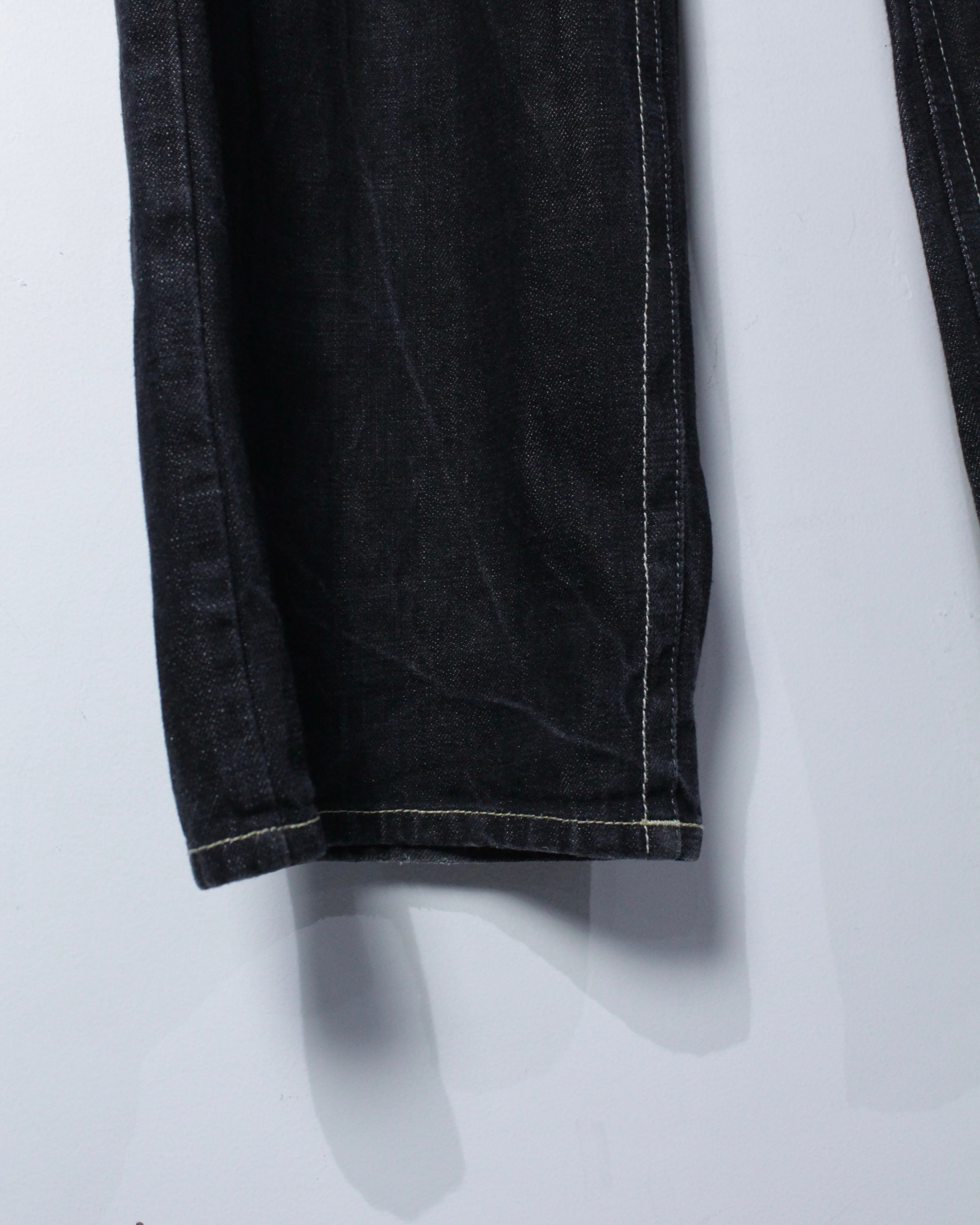 ブラックデニムをベースに、程よくフェードした表情がヴィンテージライクな雰囲気を演出。無骨さと洗練が同居する生地感に、ワイドなシルエットを掛け合わせることで、今のストリートにフィットする一本に仕上がっております。