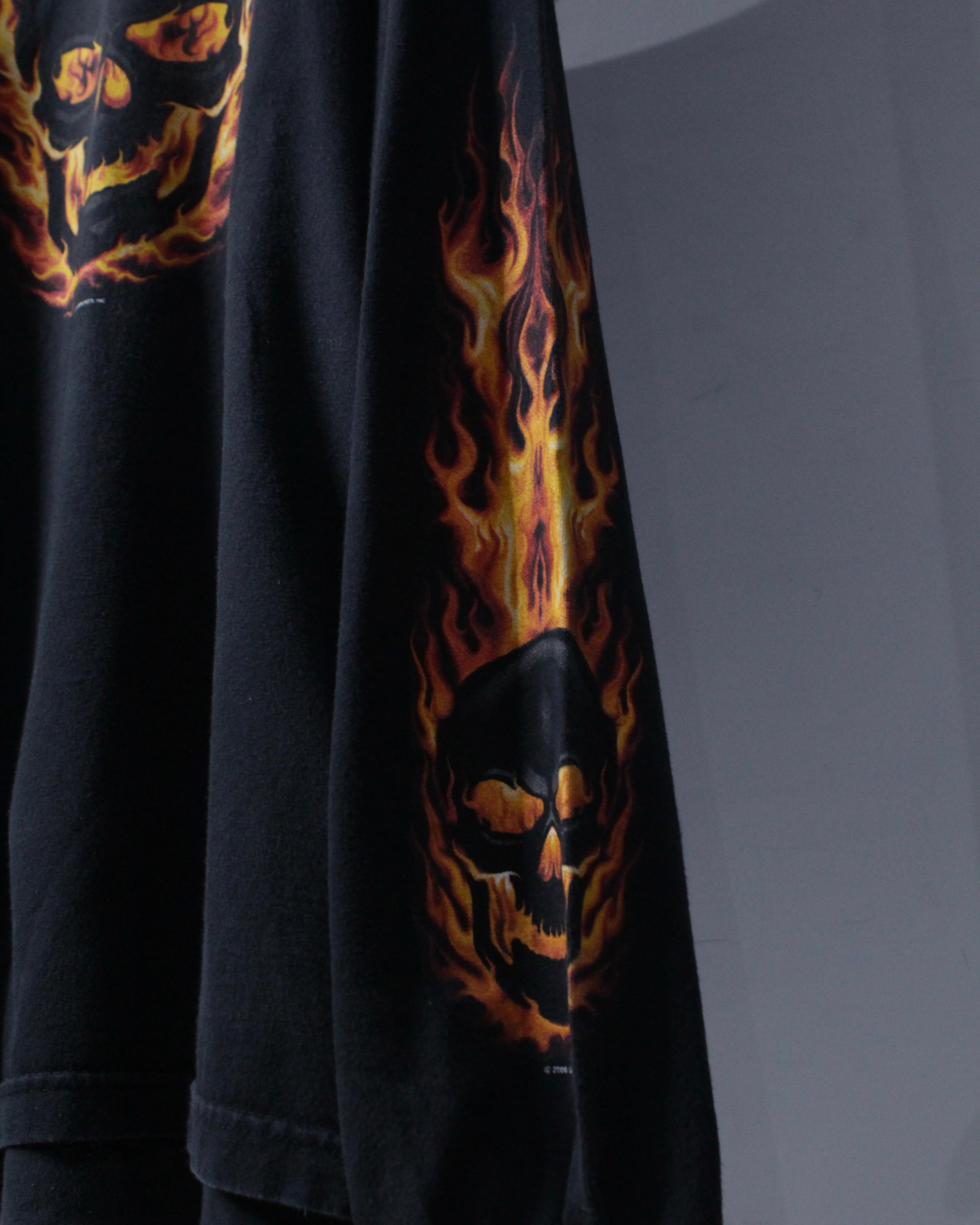 アイコニックなスカルモチーフに加え、炎のグラデーションがリアルに表現されており、シンプルなロンTの枠を超えたグラフィックの完成度。1枚でスタイリングの主役となるインパクトを持ちながらも、ブラックベースで着回しやすい点もポイントです。