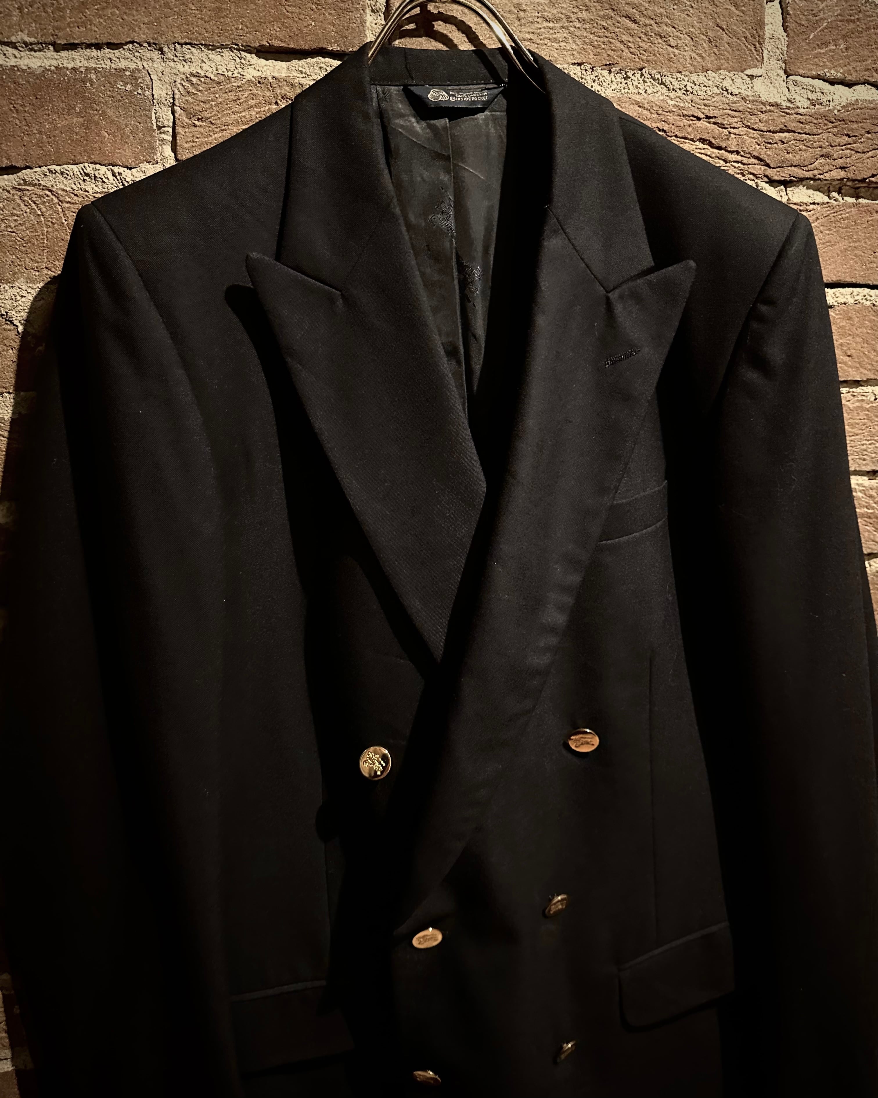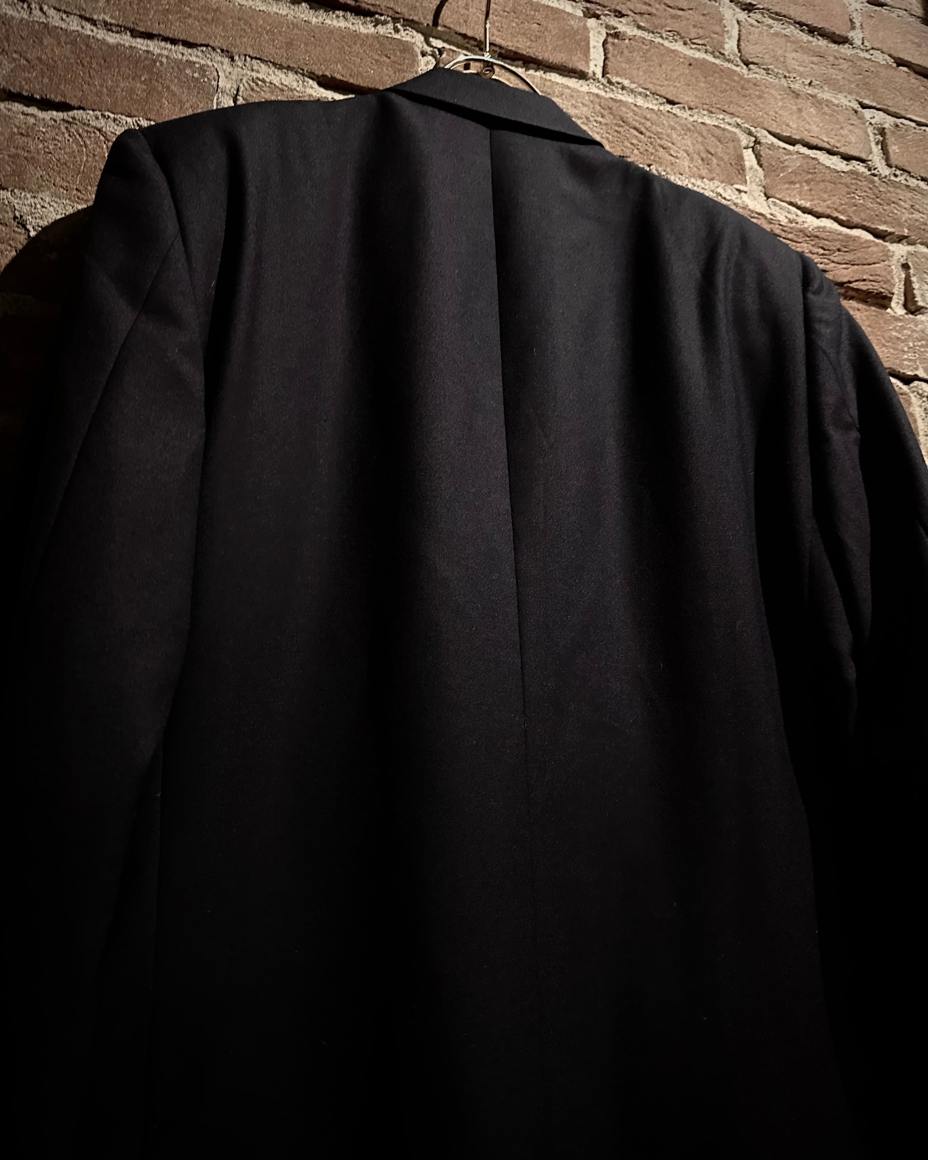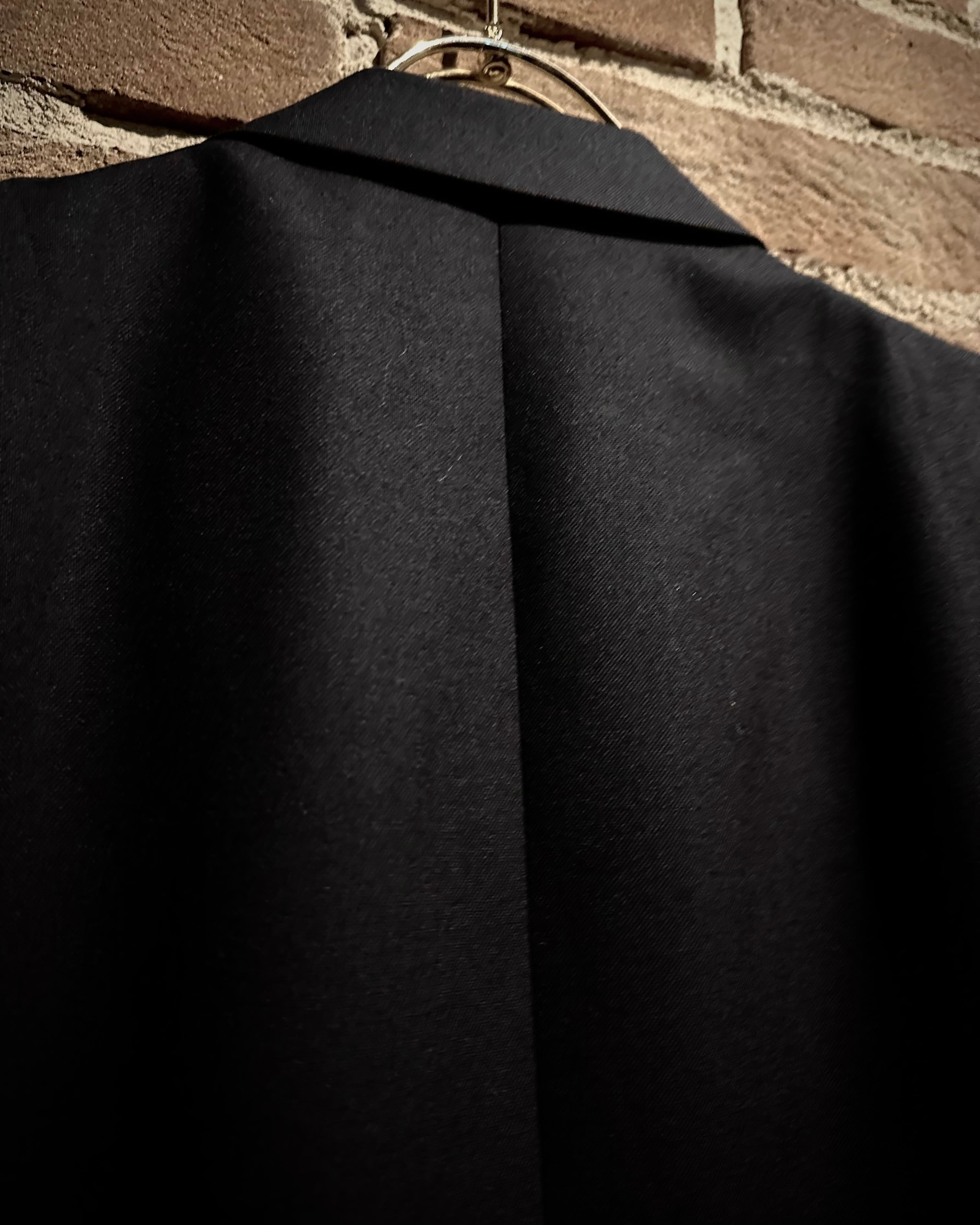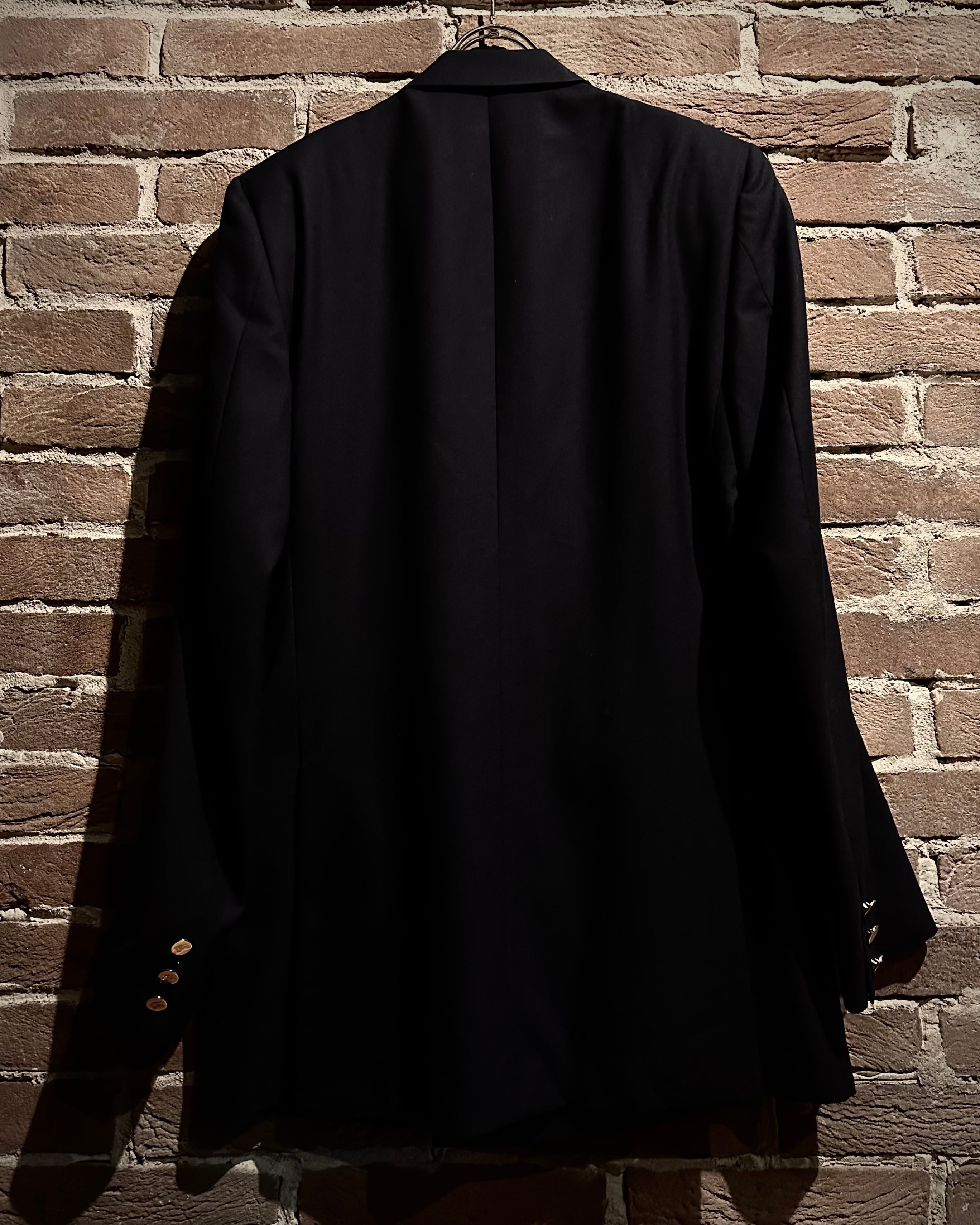 フロントは重厚感あるダブルブレスト仕様に、ブランドロゴを刻んだ金ボタンを配置。ピークドラペルとの組み合わせにより、クラシカルで力強い印象を与えつつ、ラグジュアリーなアクセントとしても機能しています。