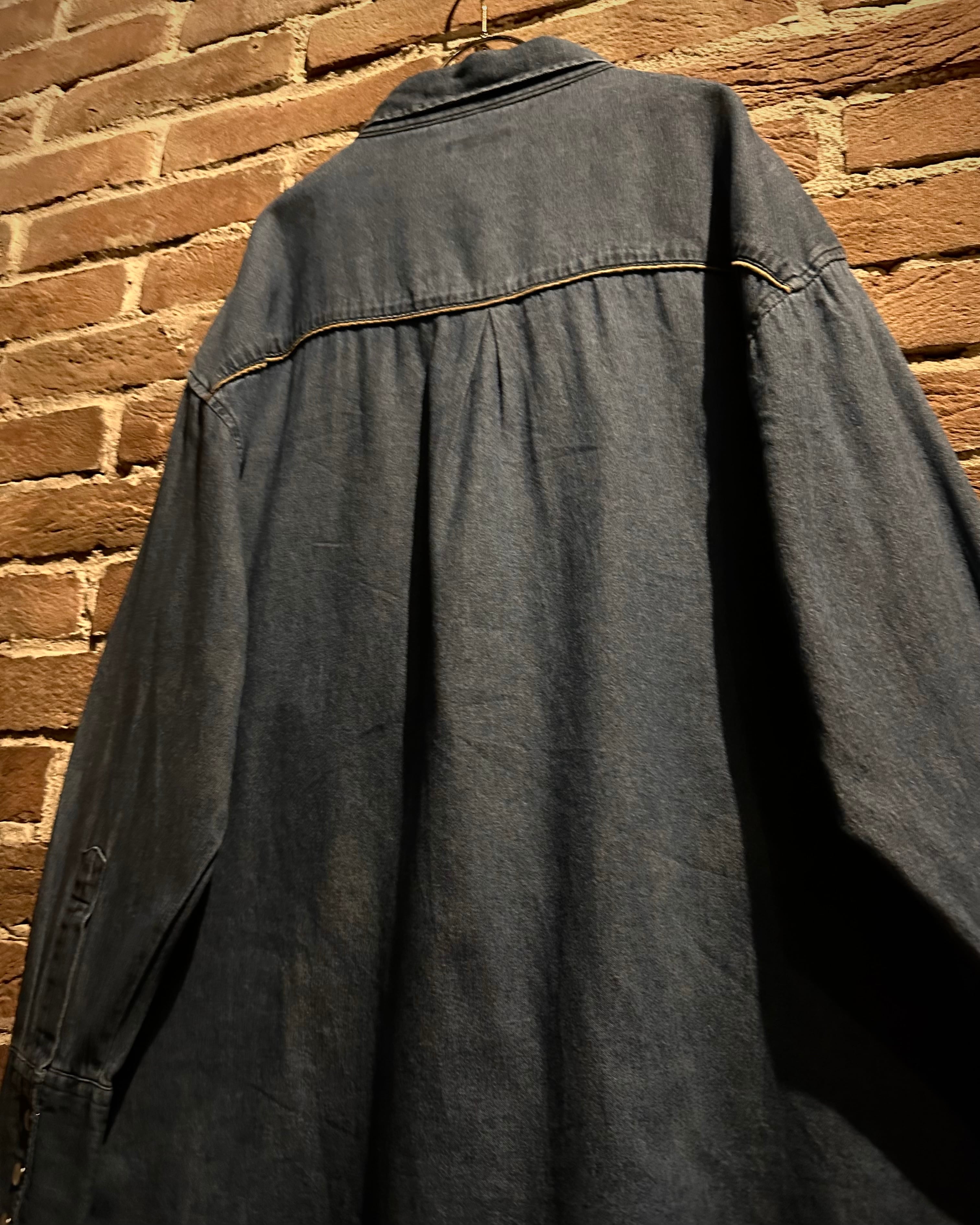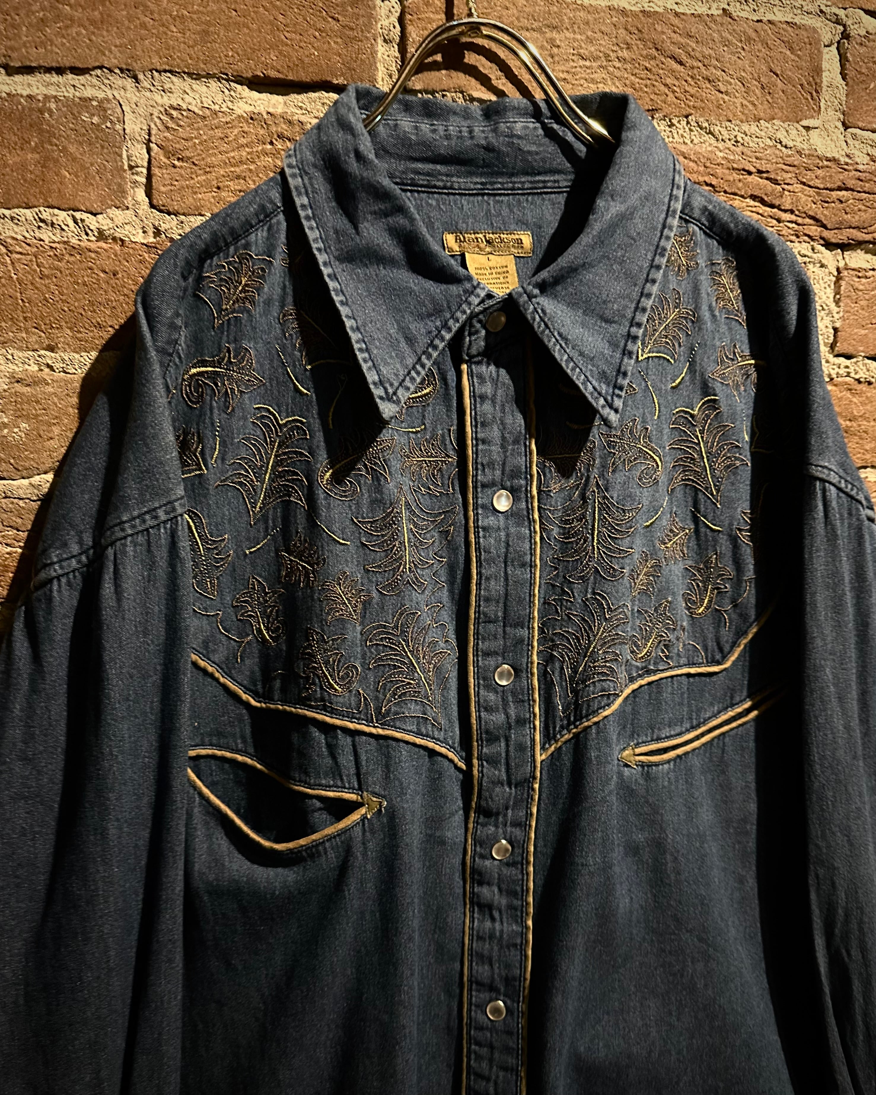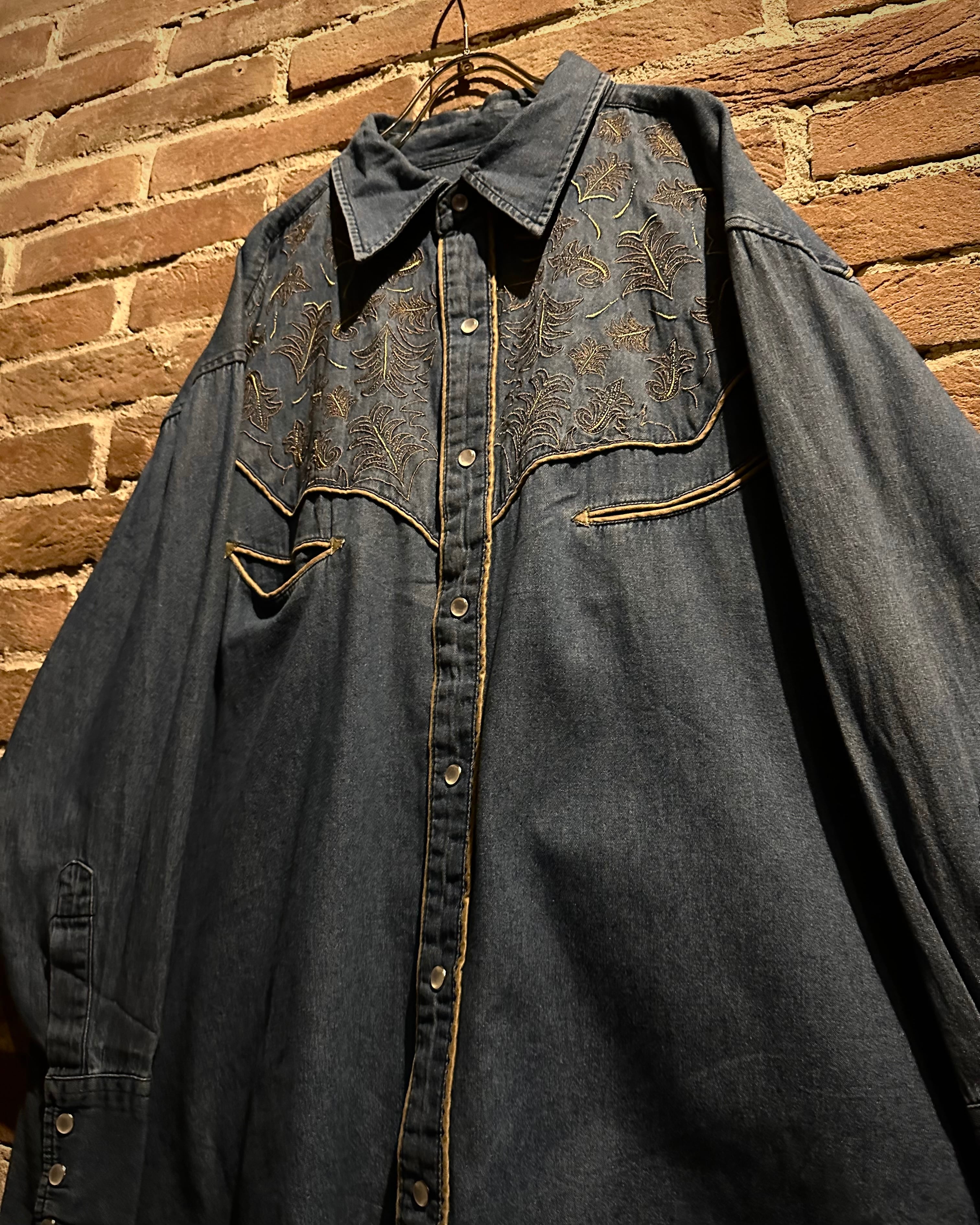 ハリとコシを備えた薄手のデニムをベースに、ヨーク部分にはボタニカルモチーフの刺繍を贅沢に配置したウエスタンシャツの逸品。