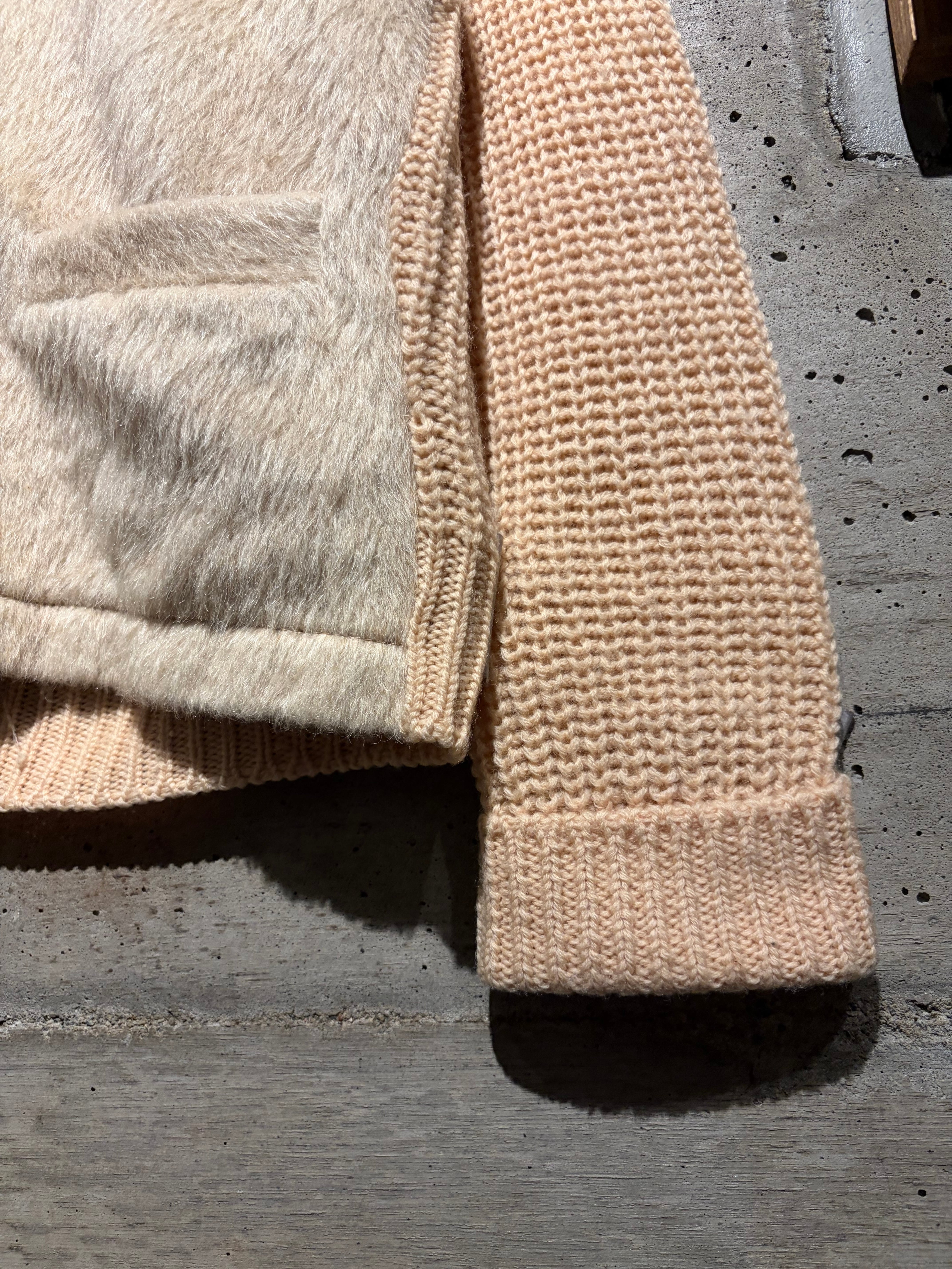 この年代では稀少なゆとりのあるサイジング。素材としては、ふんわりとした毛足の長いフロントに対し、ボディは程よい肉感のウールニット。保温性はもちろん、軽やかな着心地で春秋冬シーズンにストレスなく着用いただけるかと。