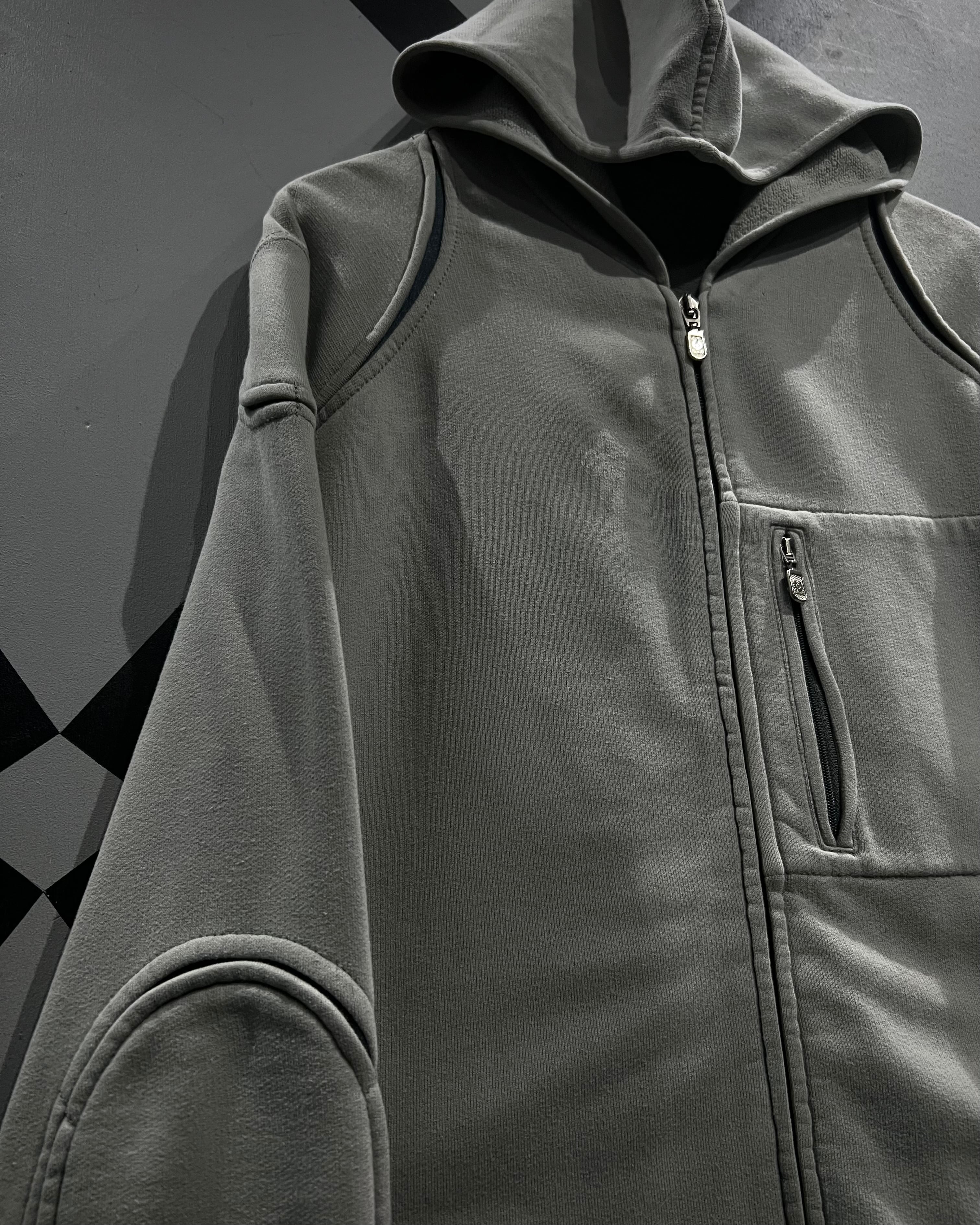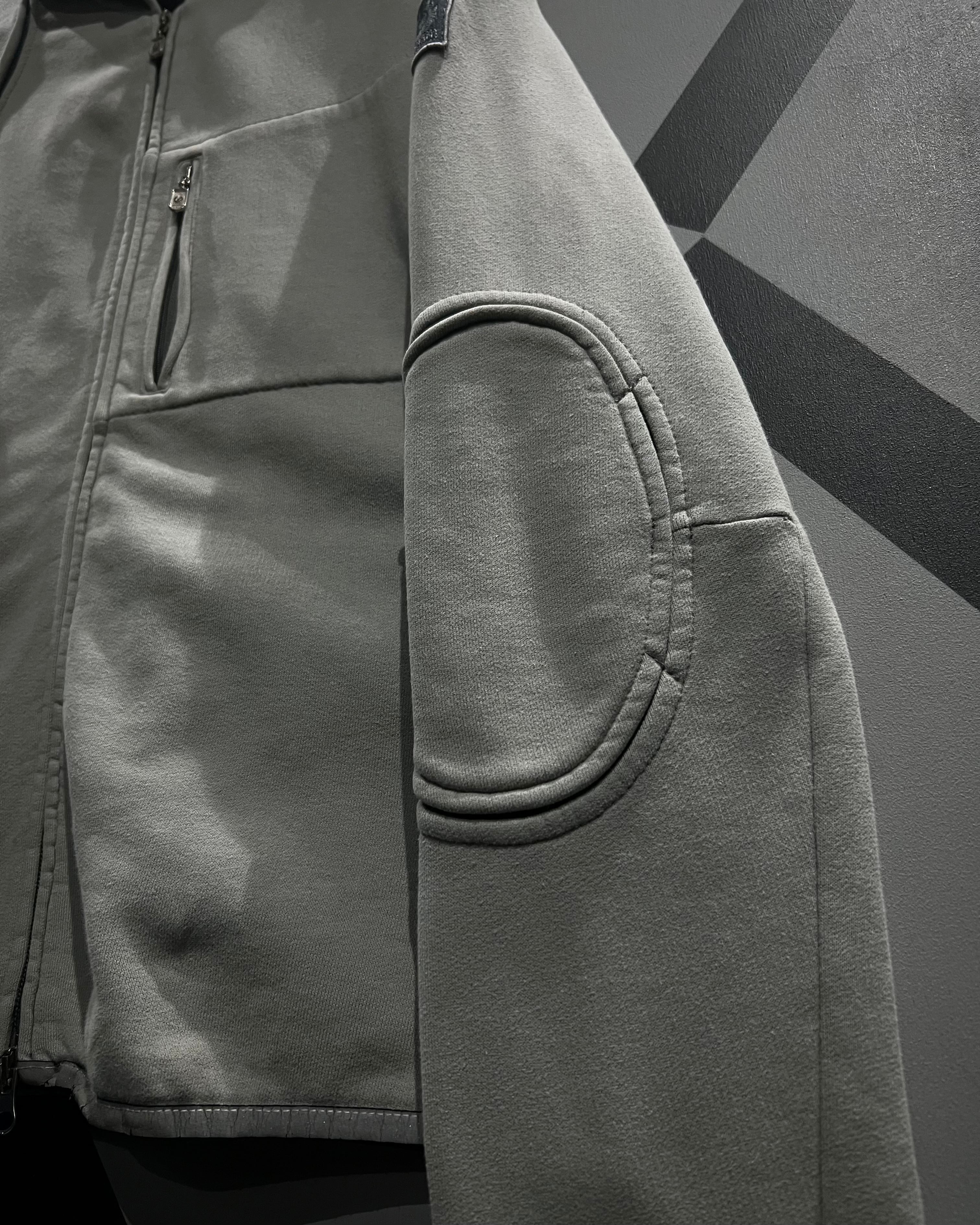 ライトグレーの柔らかなボディに、肩や肘へと立体的に切り替えを施したテクニカルな1着。スウェットライクな生地感ながら、ギア的なアプローチを感じさせるデザインが特徴で、シンプルな中にしっかりとブランドらしさが詰まっています。
