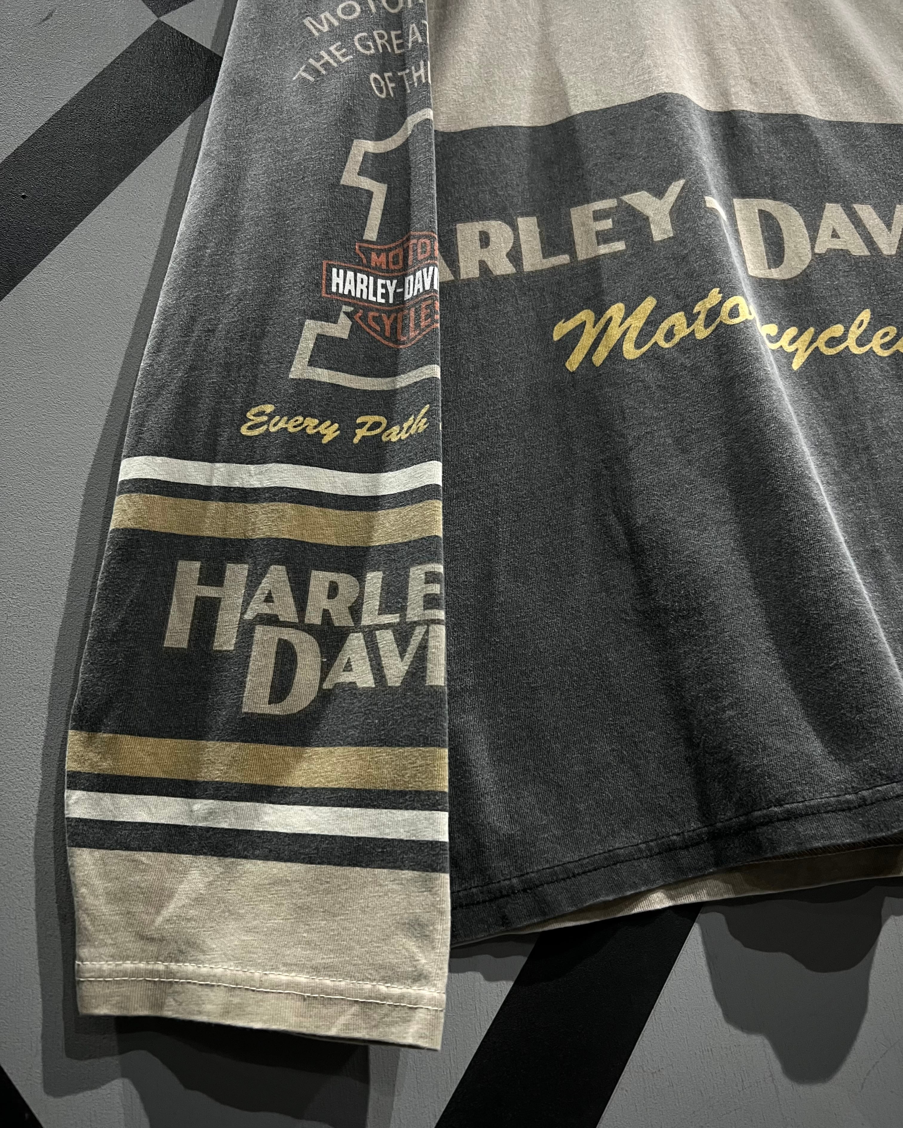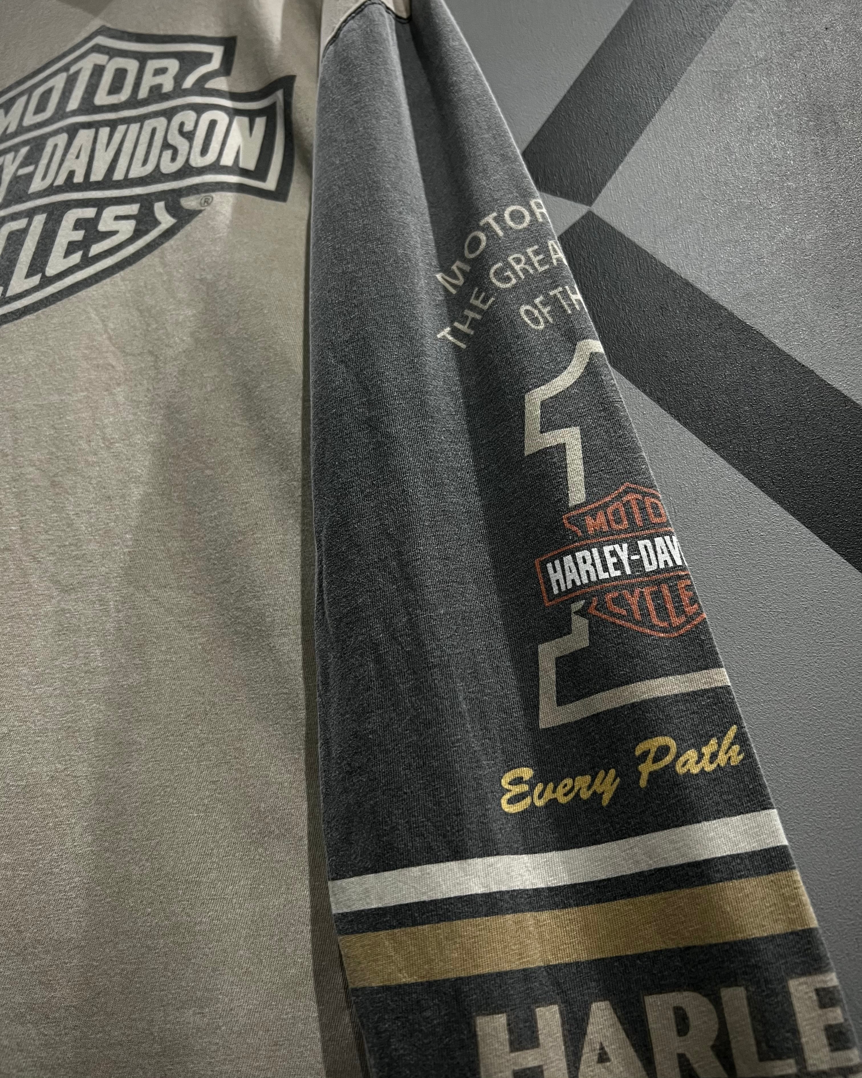 ベージュ×グレーで切り替えたボディに、前後とアームにブランドロゴやバイカーモチーフを配したハーフジップの長袖プルオーバー。前後死角なしで、ハーレーらしさを強く感じられるデザインが魅力です。
