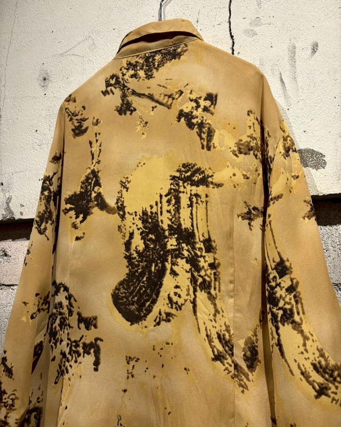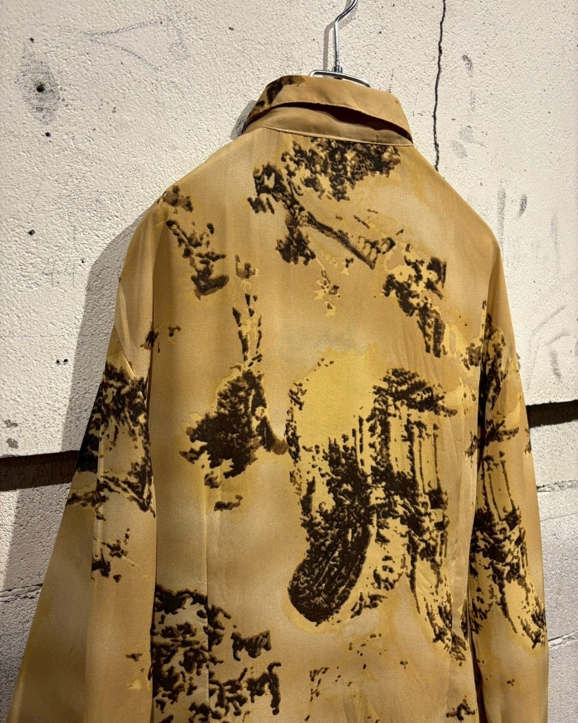 ポリエステルベースの滑らかなボディに、ブリーチを施したかのようなムラ感あるカラーリングを全面に表現した1着。