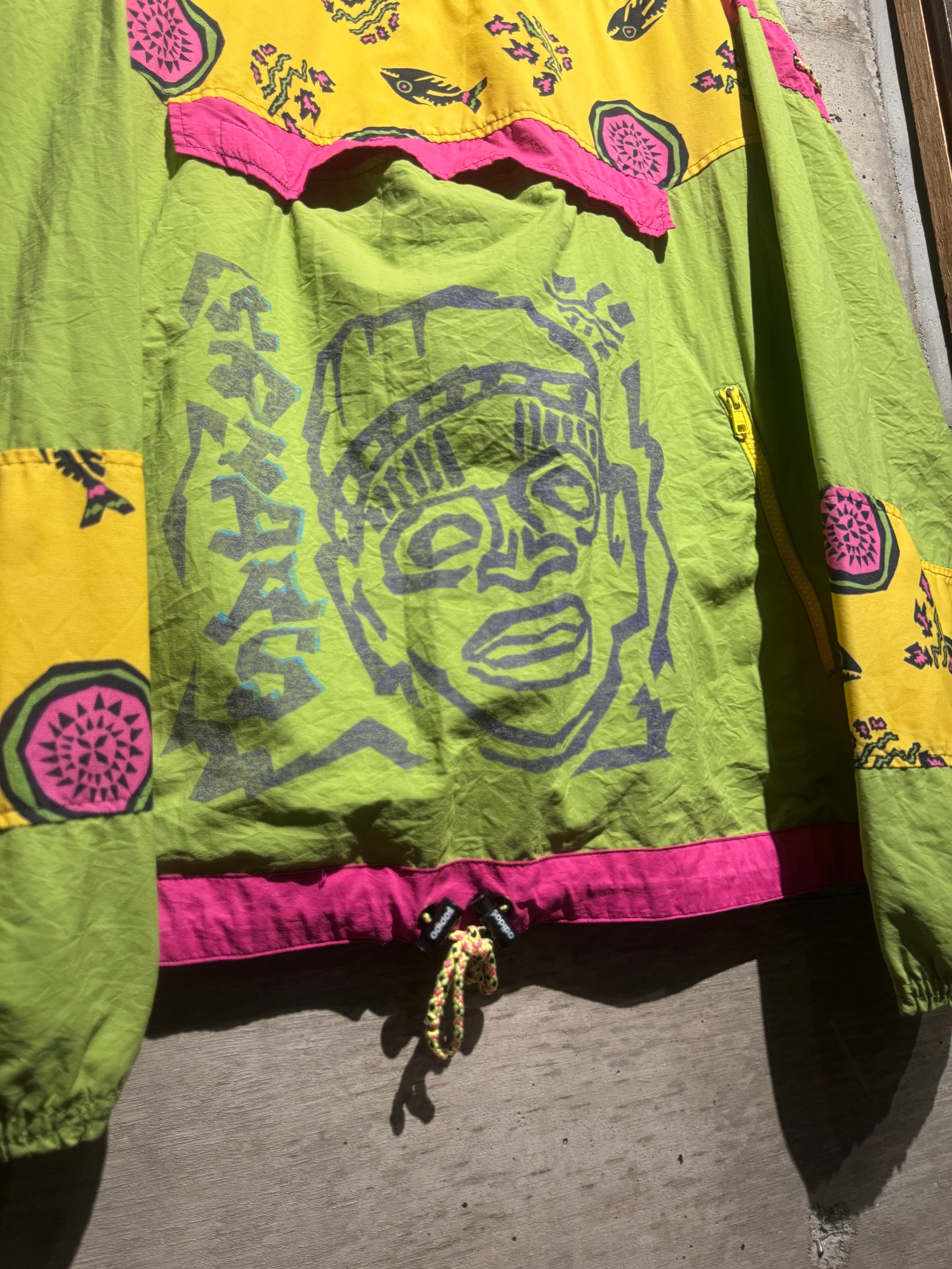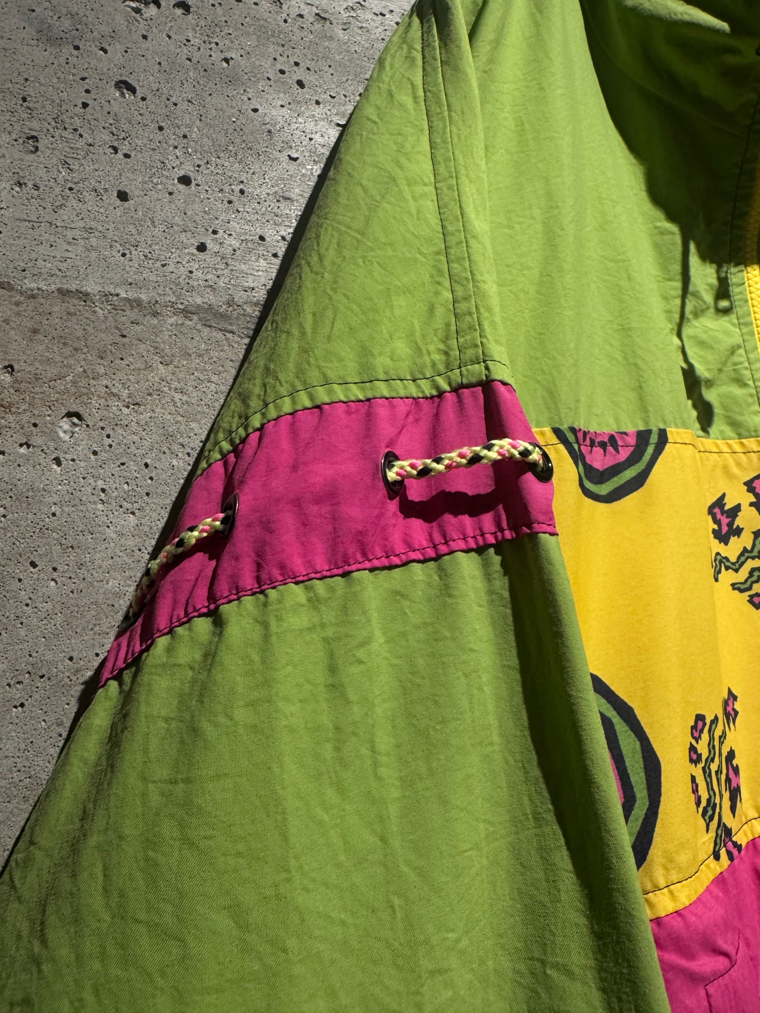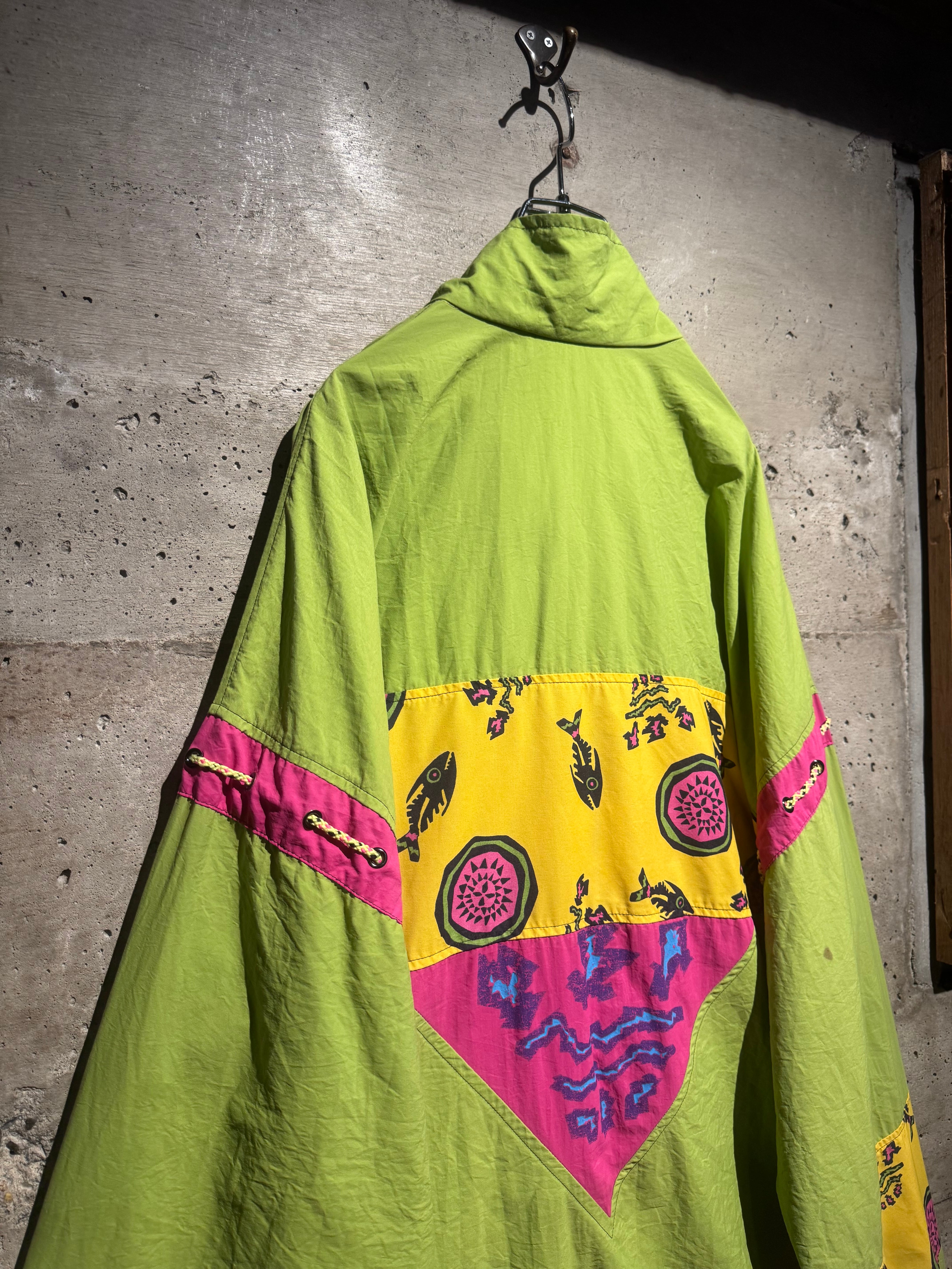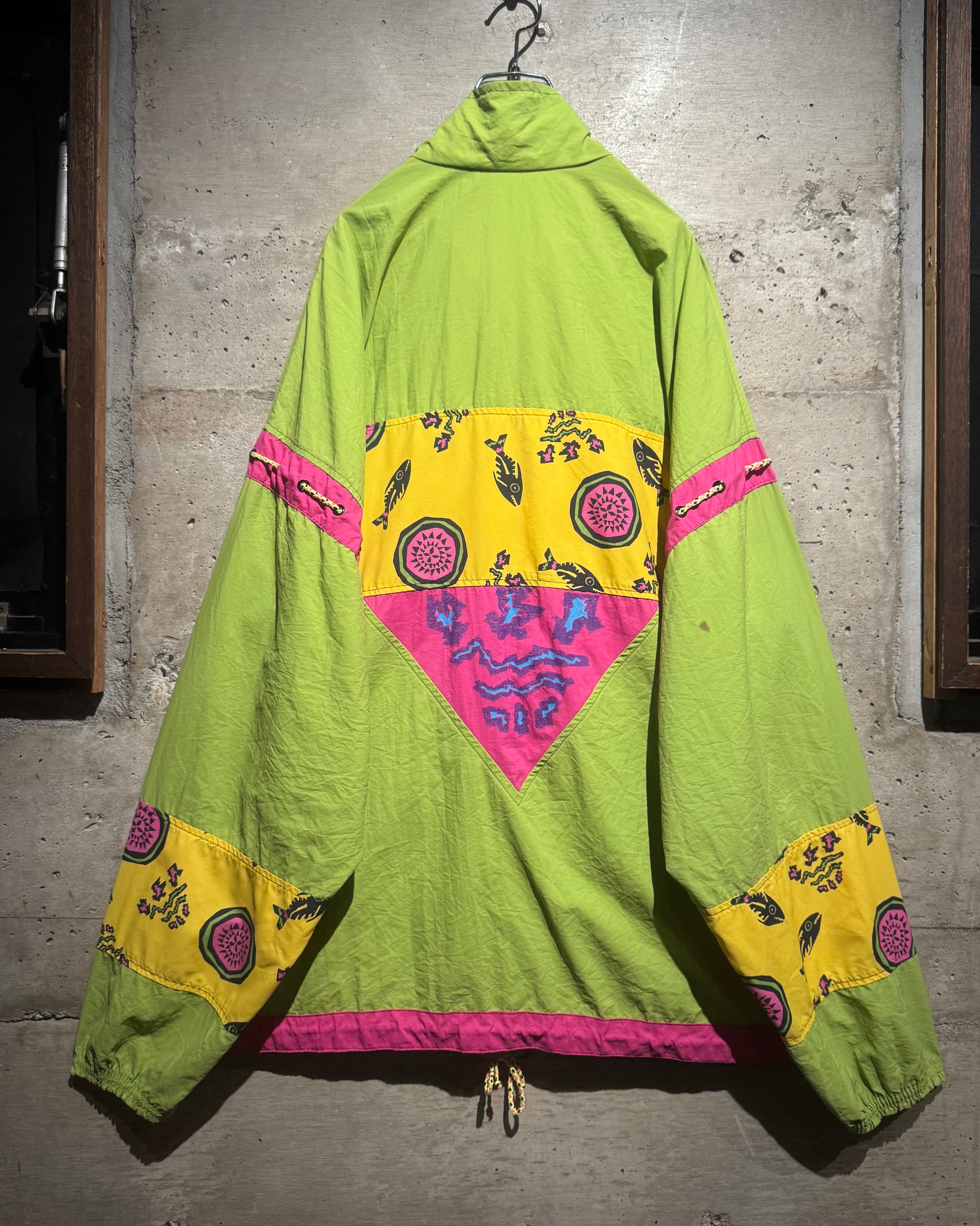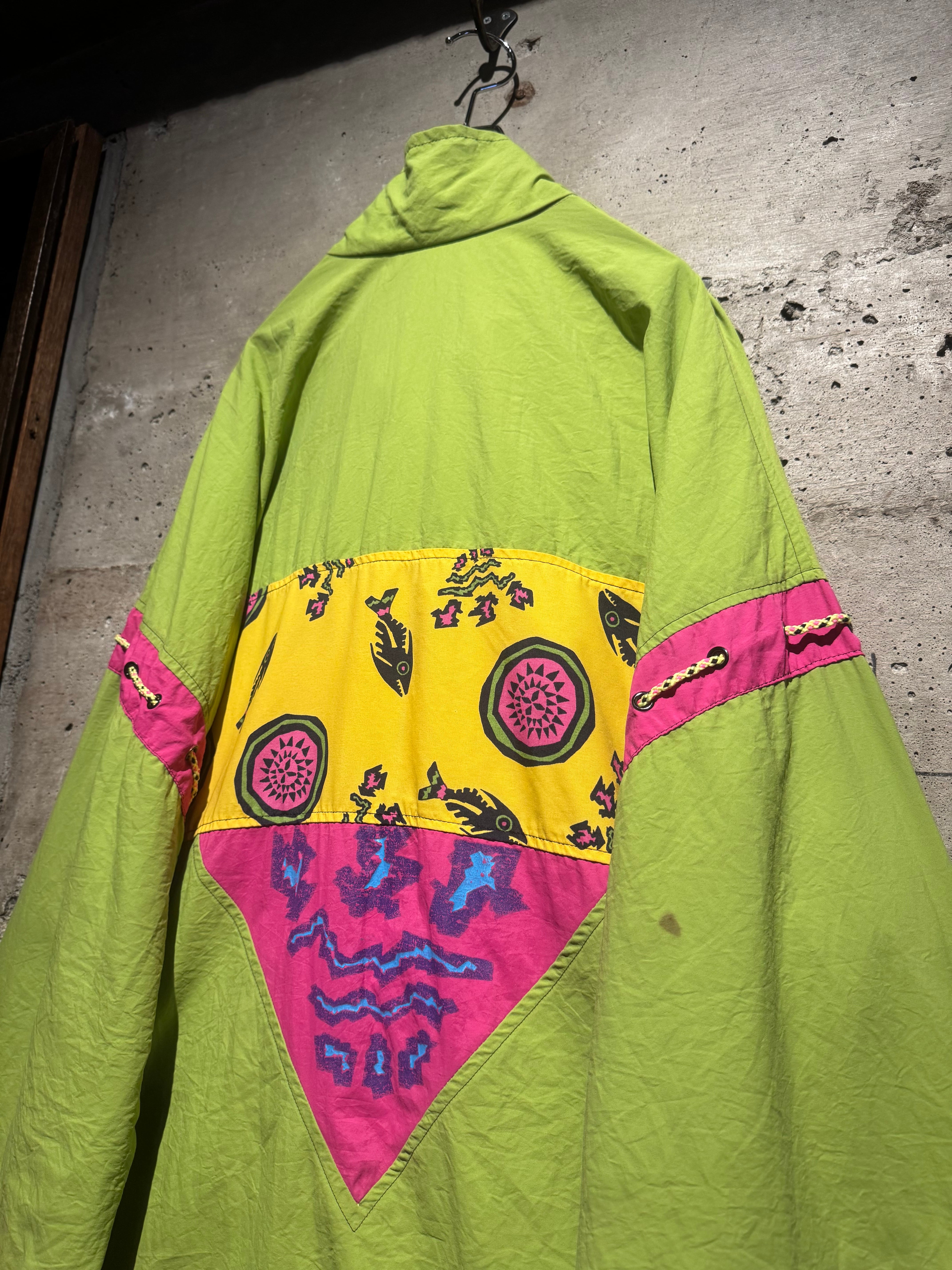 どこか民族調やアートピースのようなニュアンスを感じさせるデザインと、当時らしいポップかつエネルギッシュな配色が掛け合わさり、90’sの空気感を色濃く反映した仕上がりとなっています。