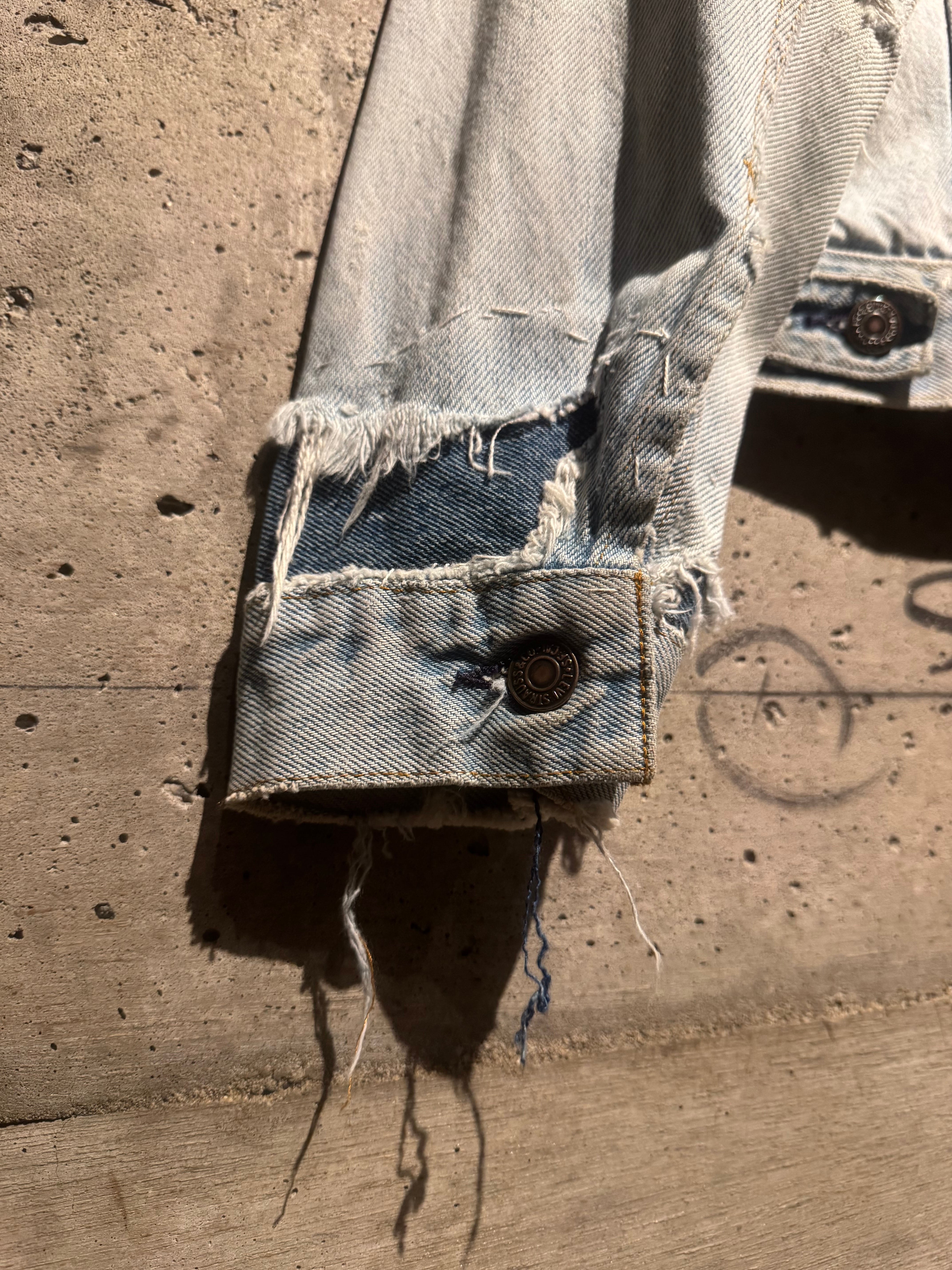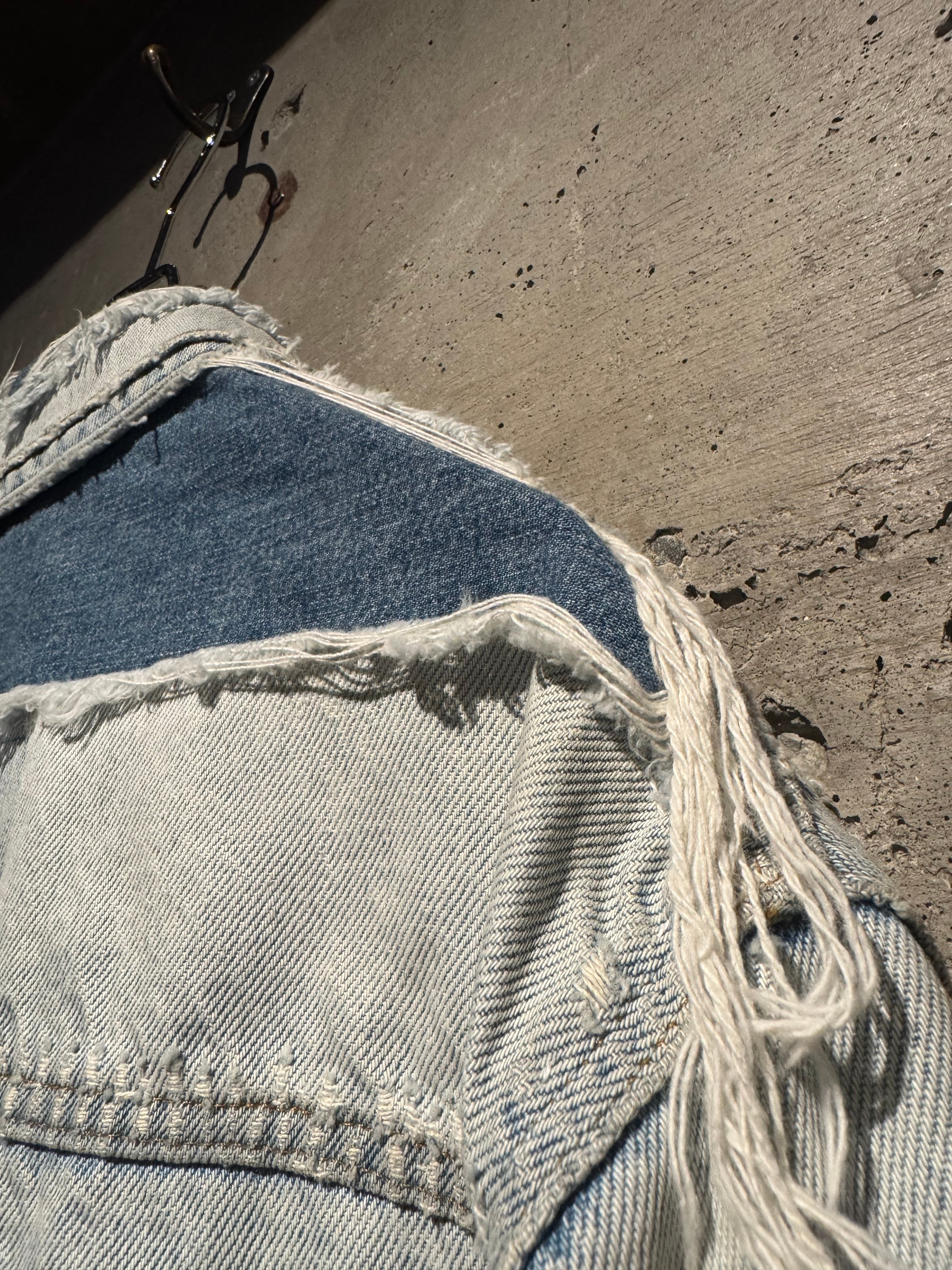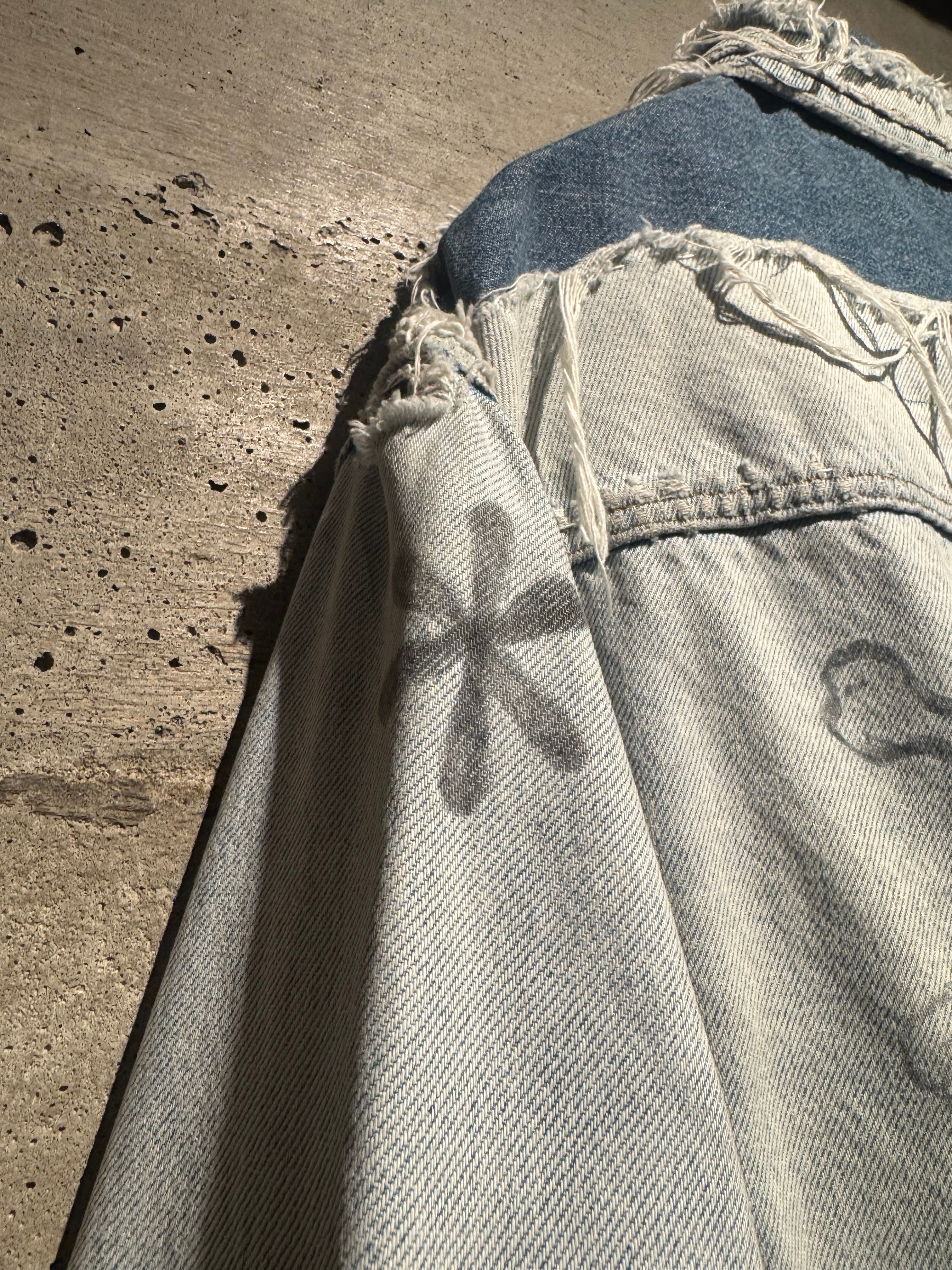 背面にはスカル、左肩には花と、前所有者によって描かれたハンドペイントが加わり、抜群の存在感を演出。それに加えて、随所に別生地をツギハギ。美しいフェードの効いたアイスウォッシュのボディのボロ感とも相まって、抜群の存在感を見せています。