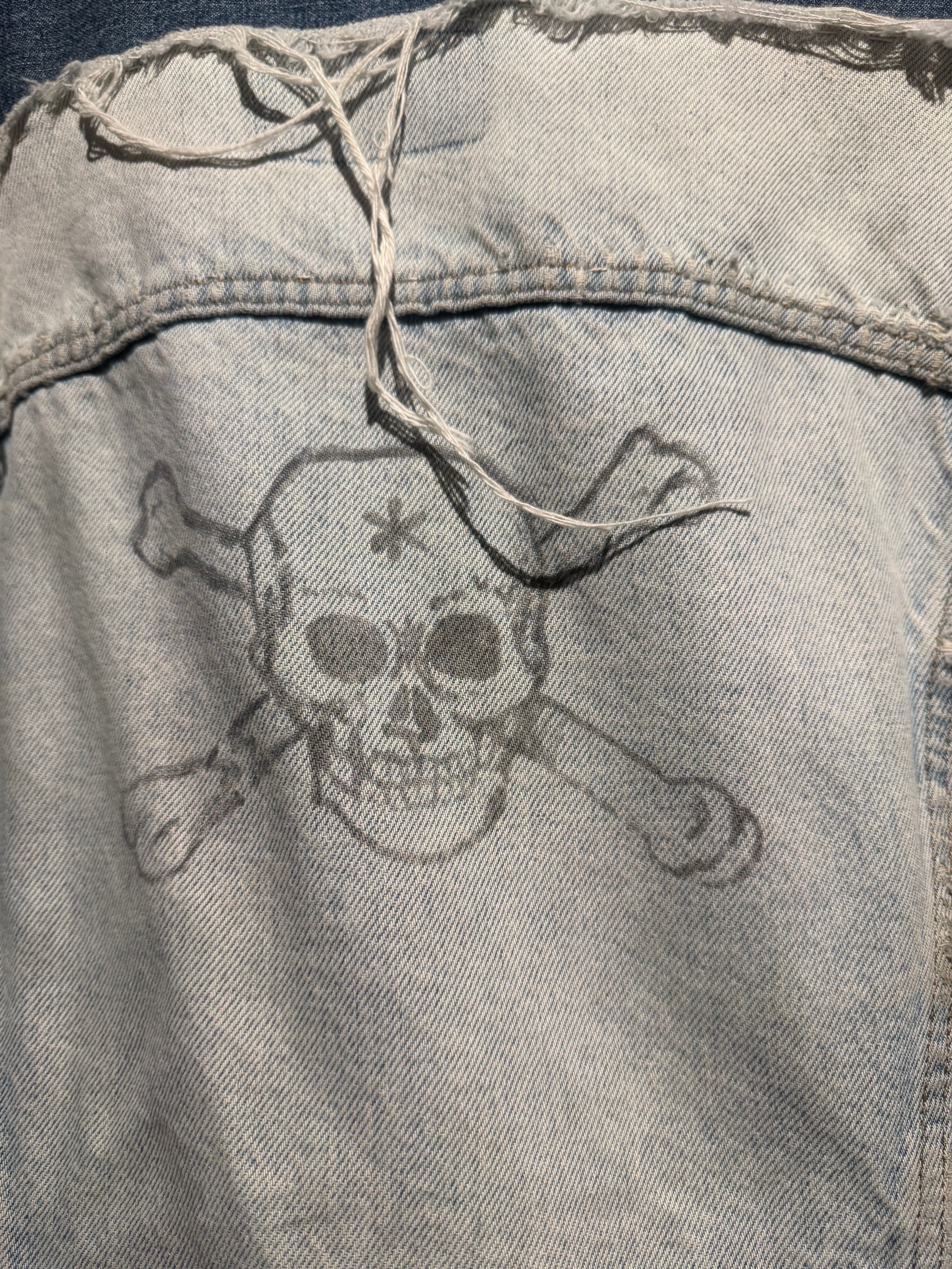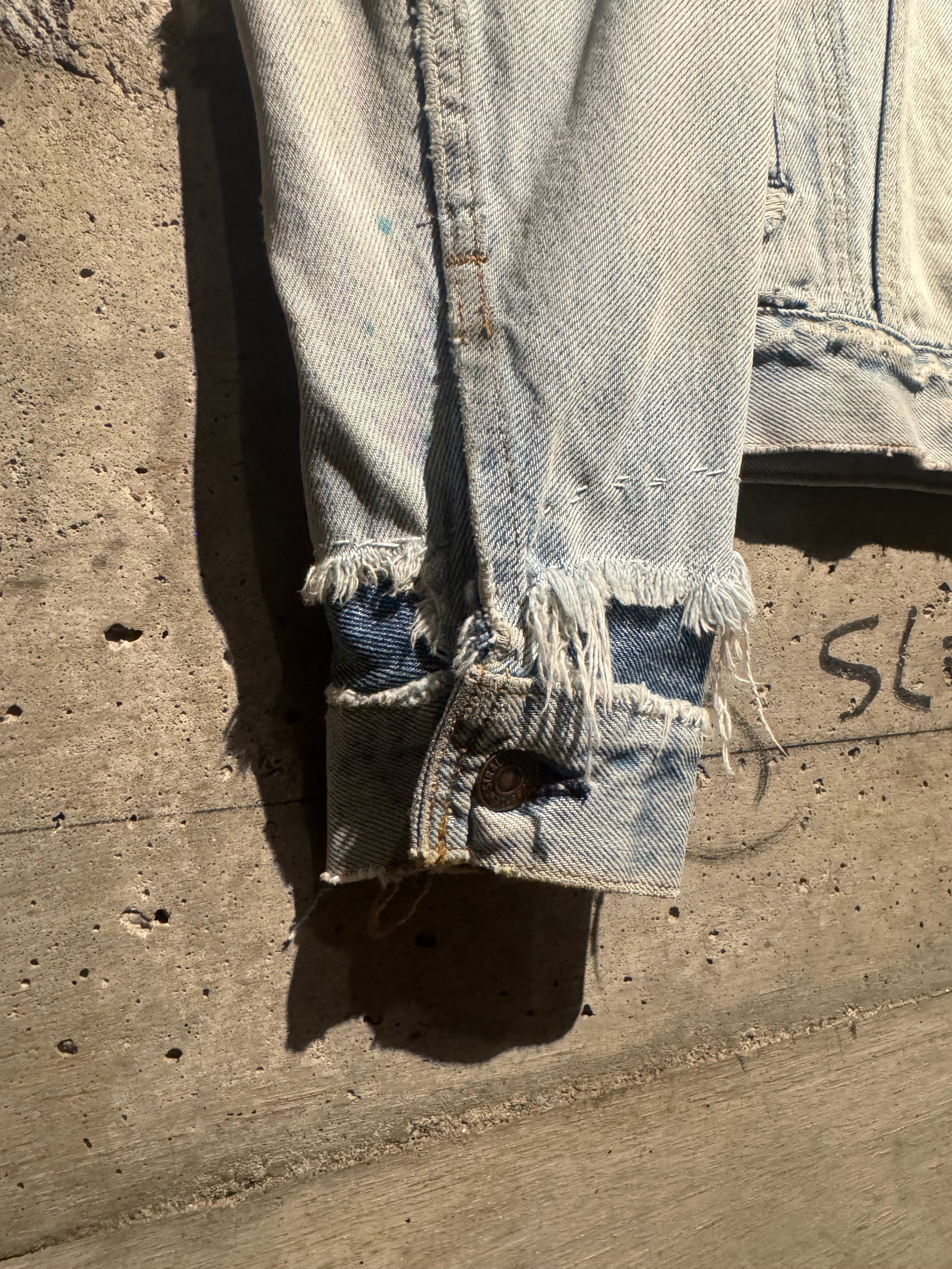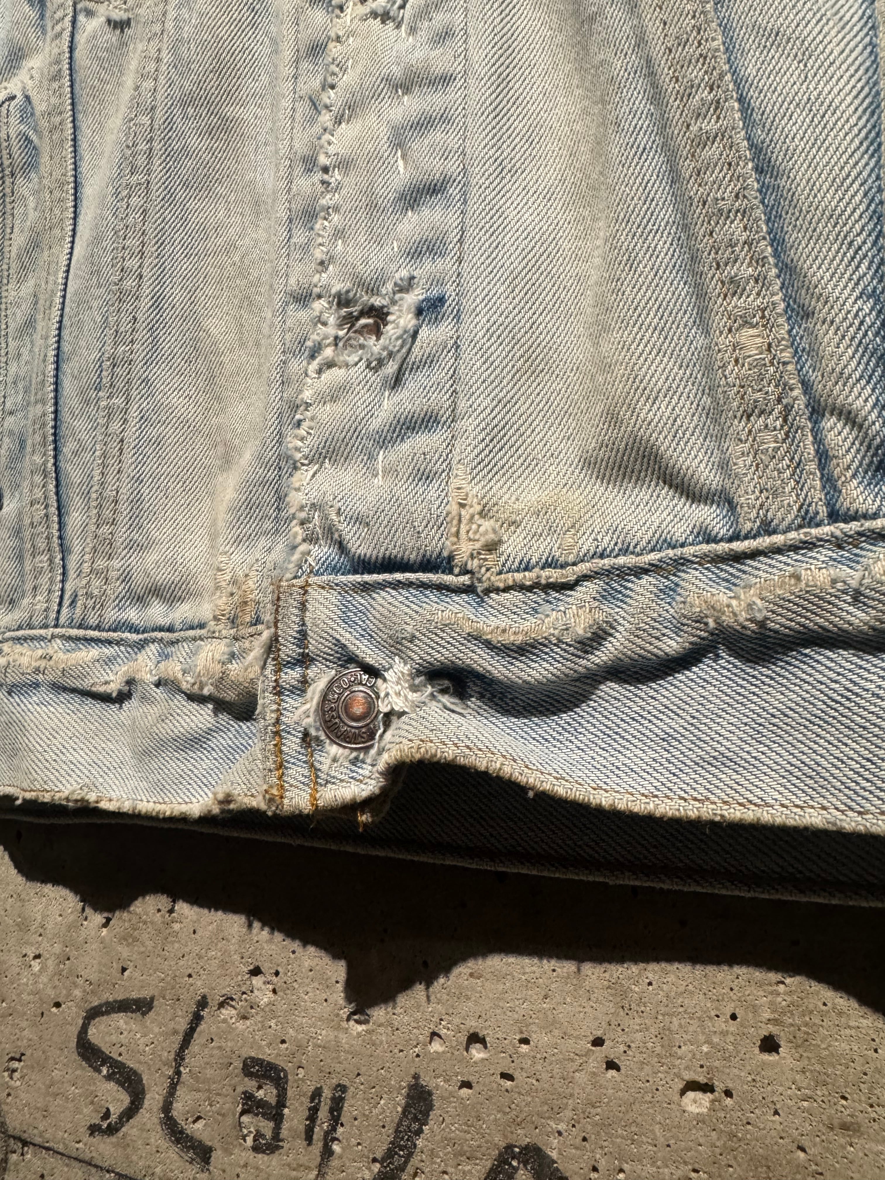 背面にはスカル、左肩には花と、前所有者によって描かれたハンドペイントが加わり、抜群の存在感を演出。それに加えて、随所に別生地をツギハギ。美しいフェードの効いたアイスウォッシュのボディのボロ感とも相まって、抜群の存在感を見せています。