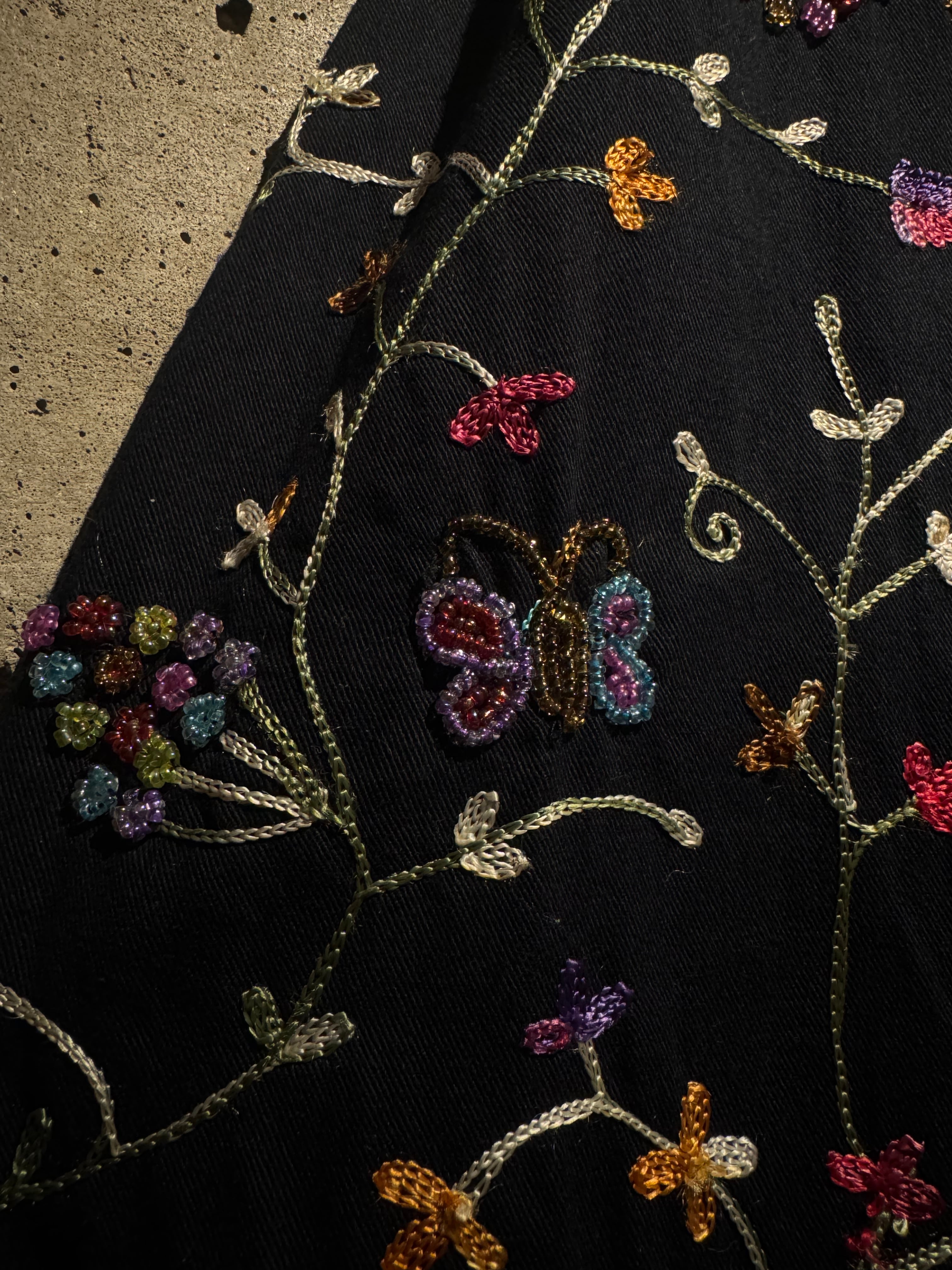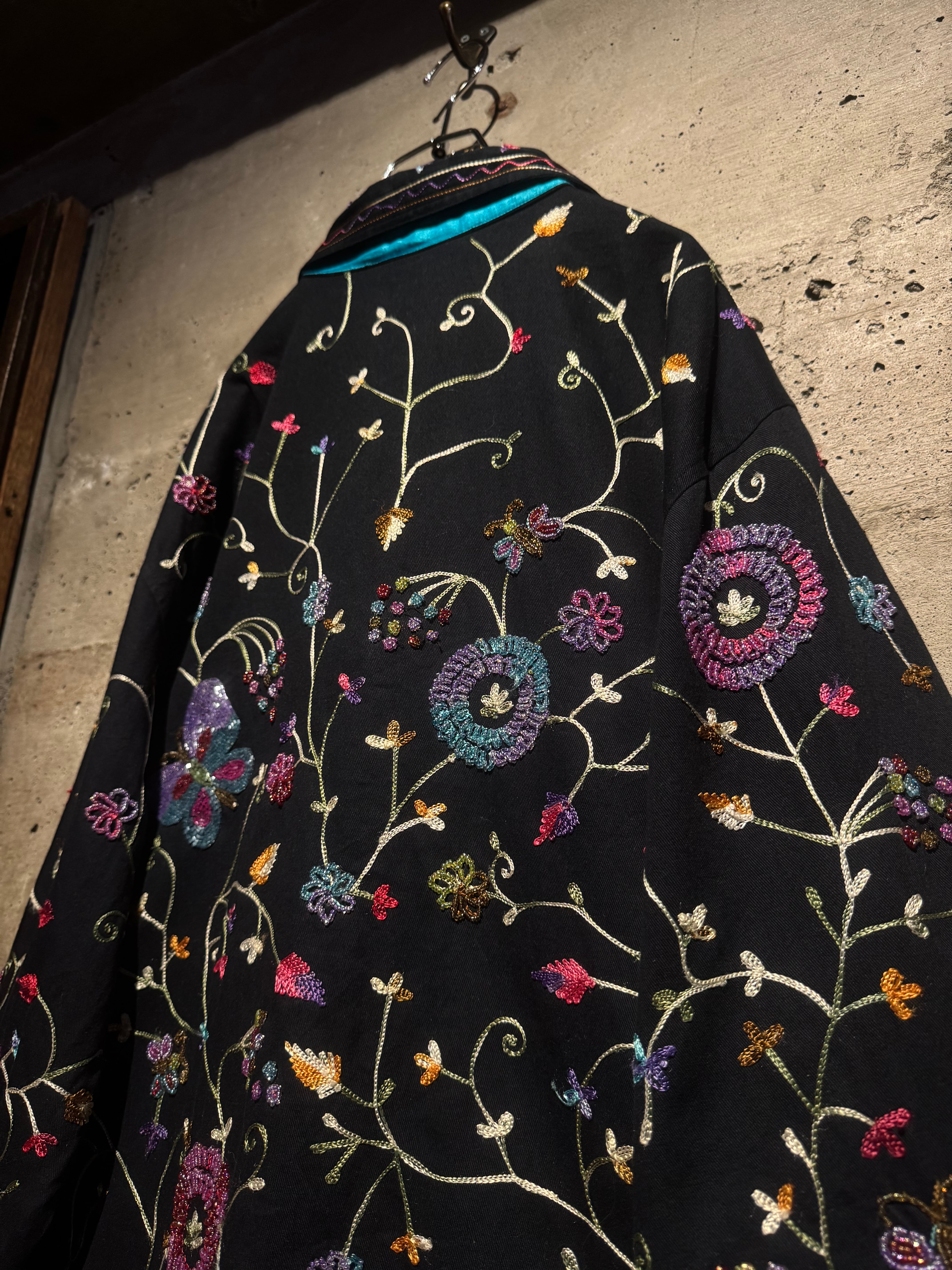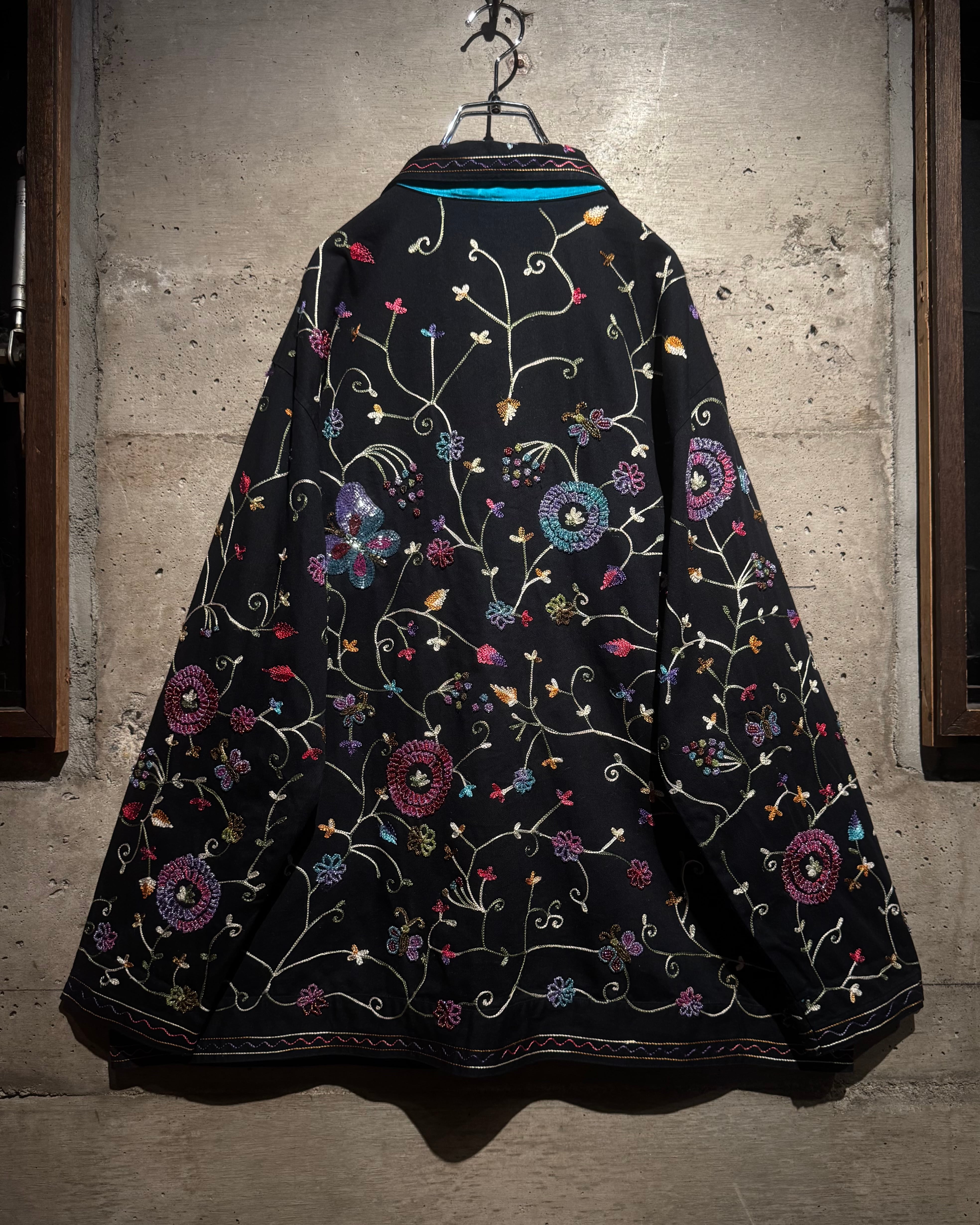 ブラックのコットンツイルをボディに、マルチカラーのチェーンステッチ刺繍とビーズ刺繍を贅沢に載せ、花や蝶といったモチーフを立体的かつ華やかに表現したデザインジャケット。