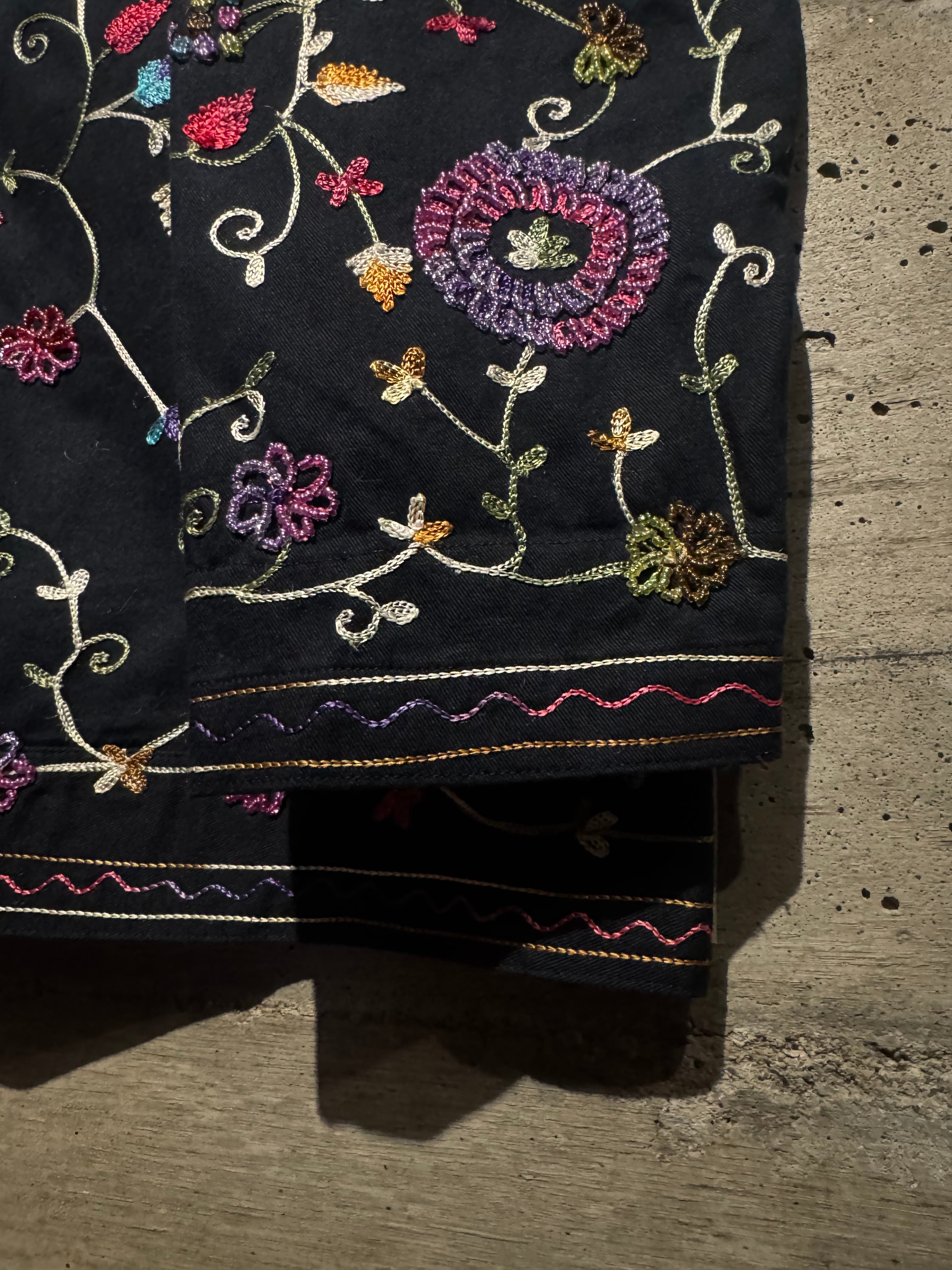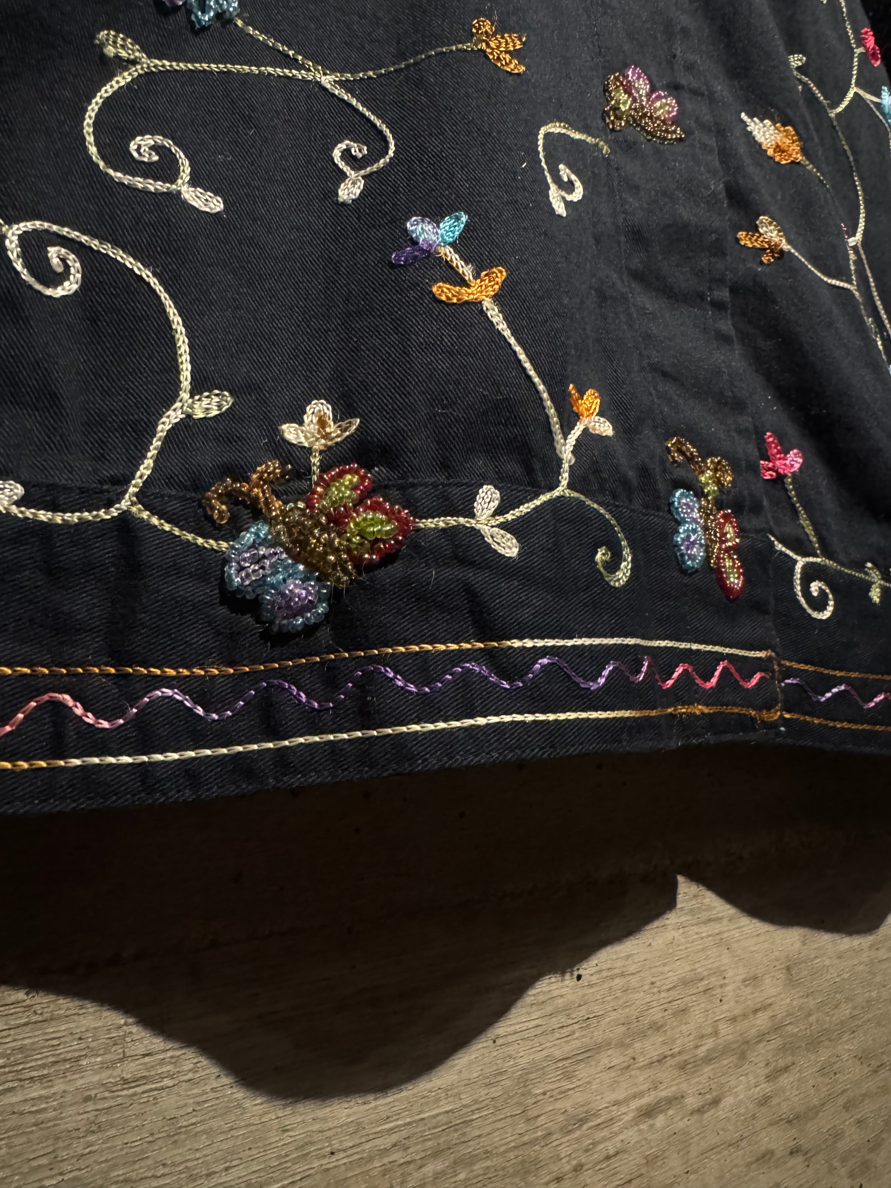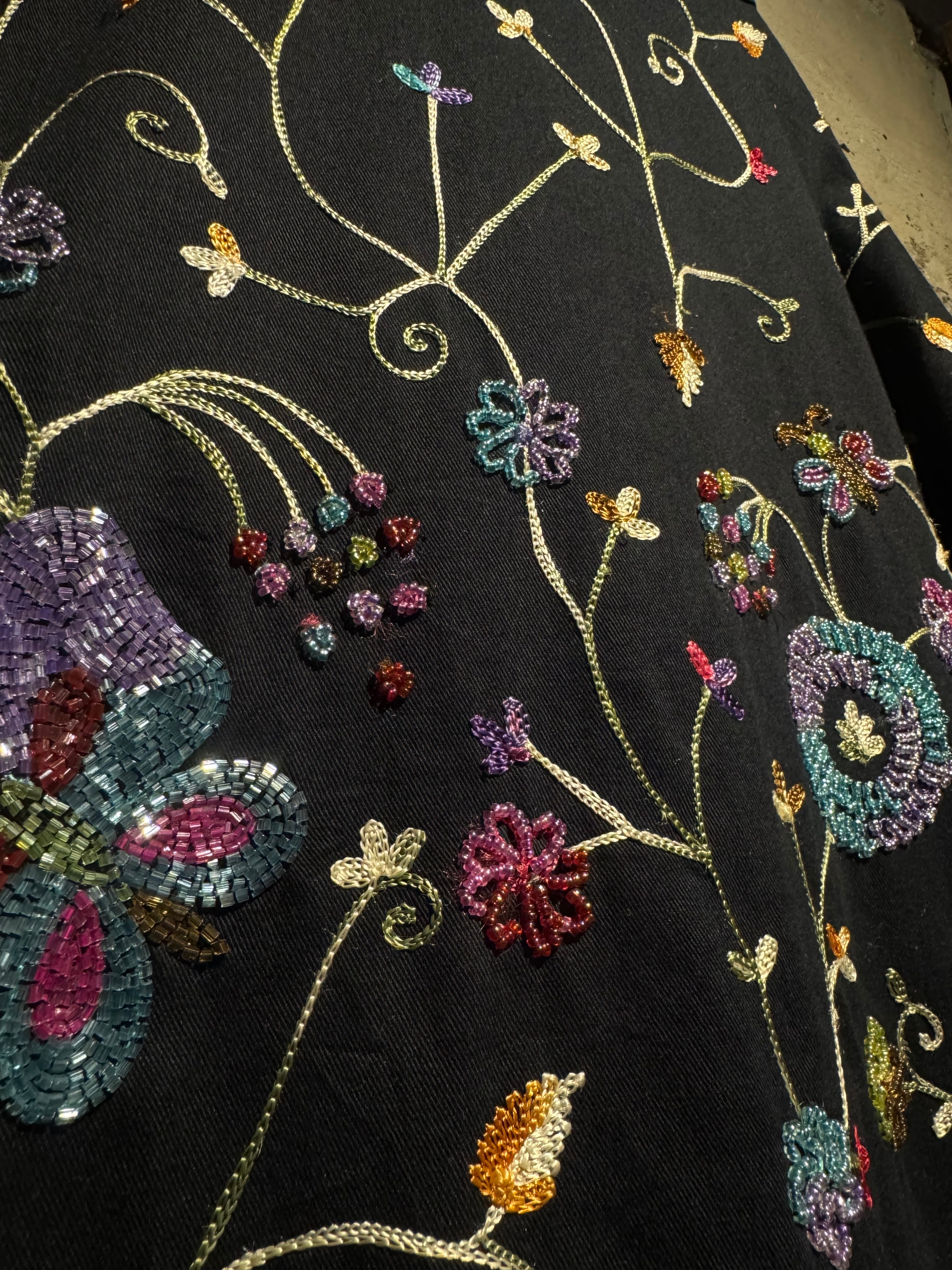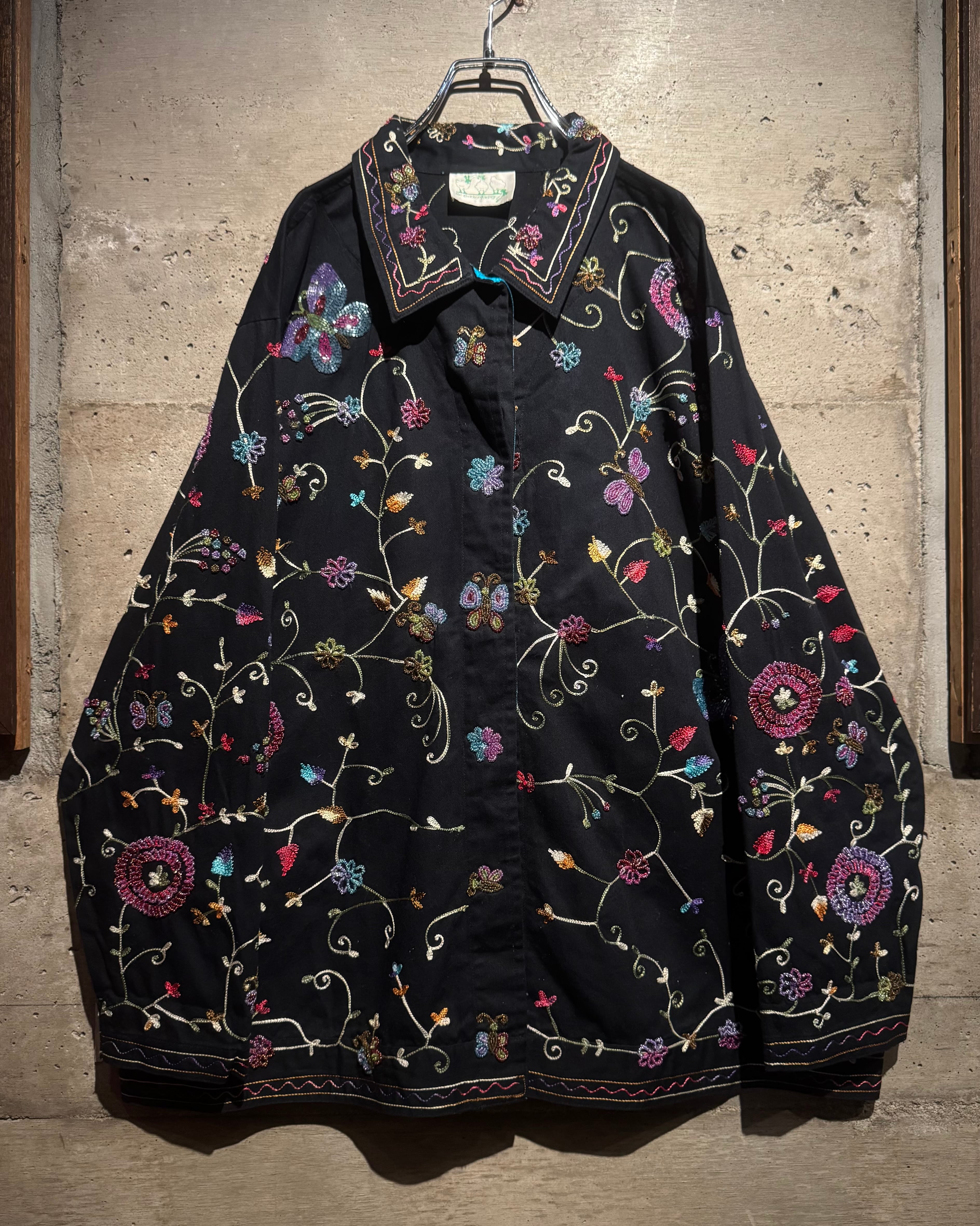 ブラックのコットンツイルをボディに、マルチカラーのチェーンステッチ刺繍とビーズ刺繍を贅沢に載せ、花や蝶といったモチーフを立体的かつ華やかに表現したデザインジャケット。