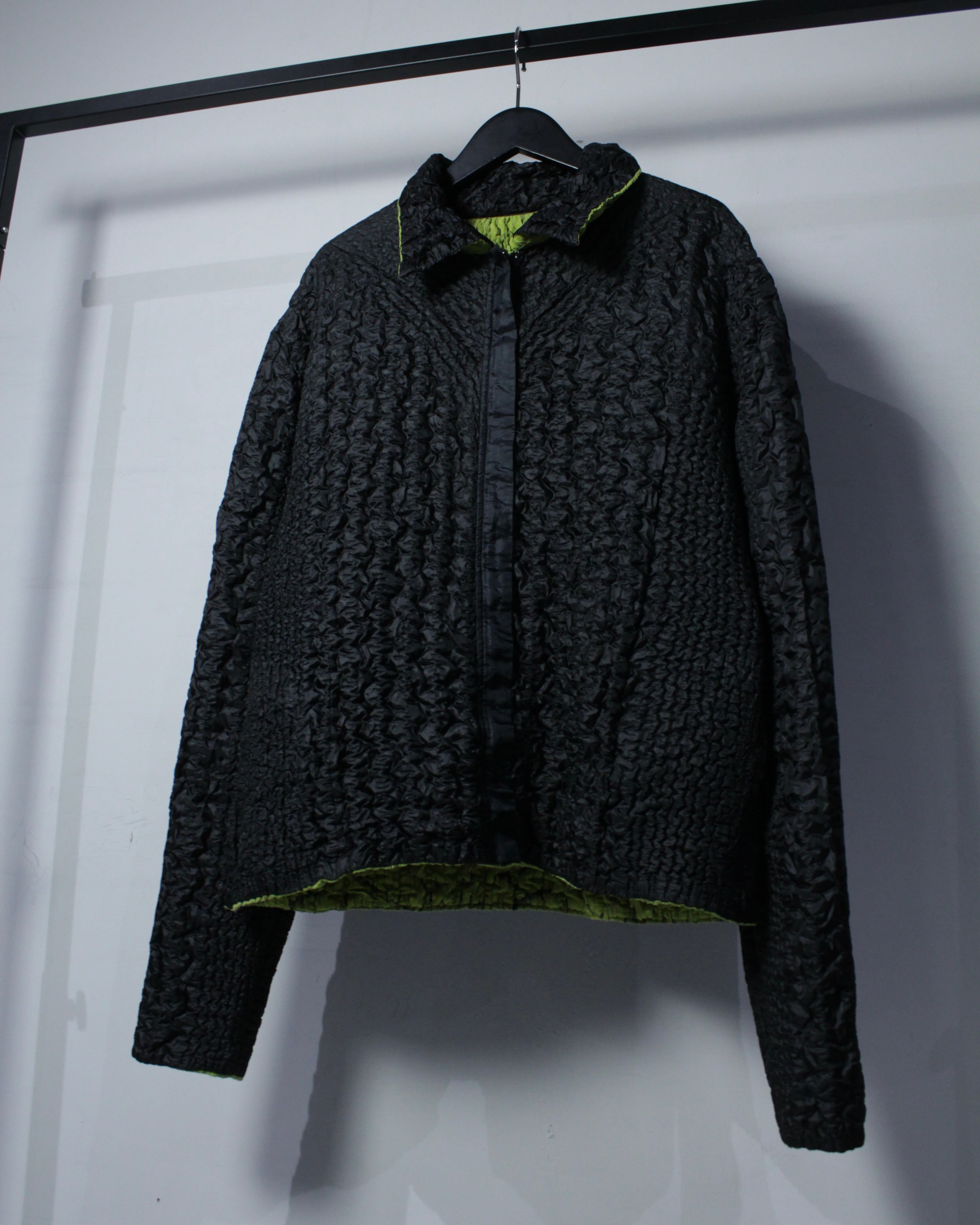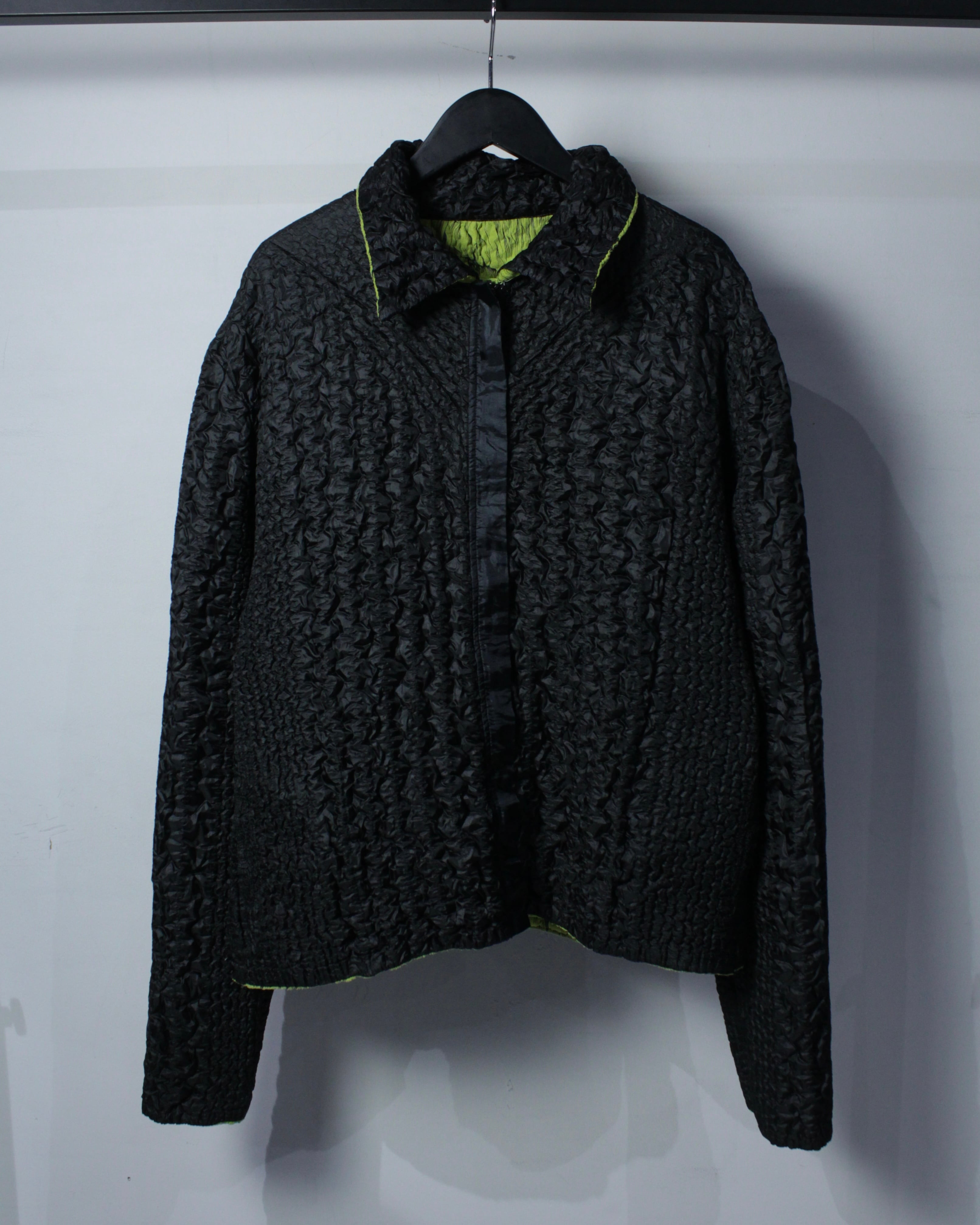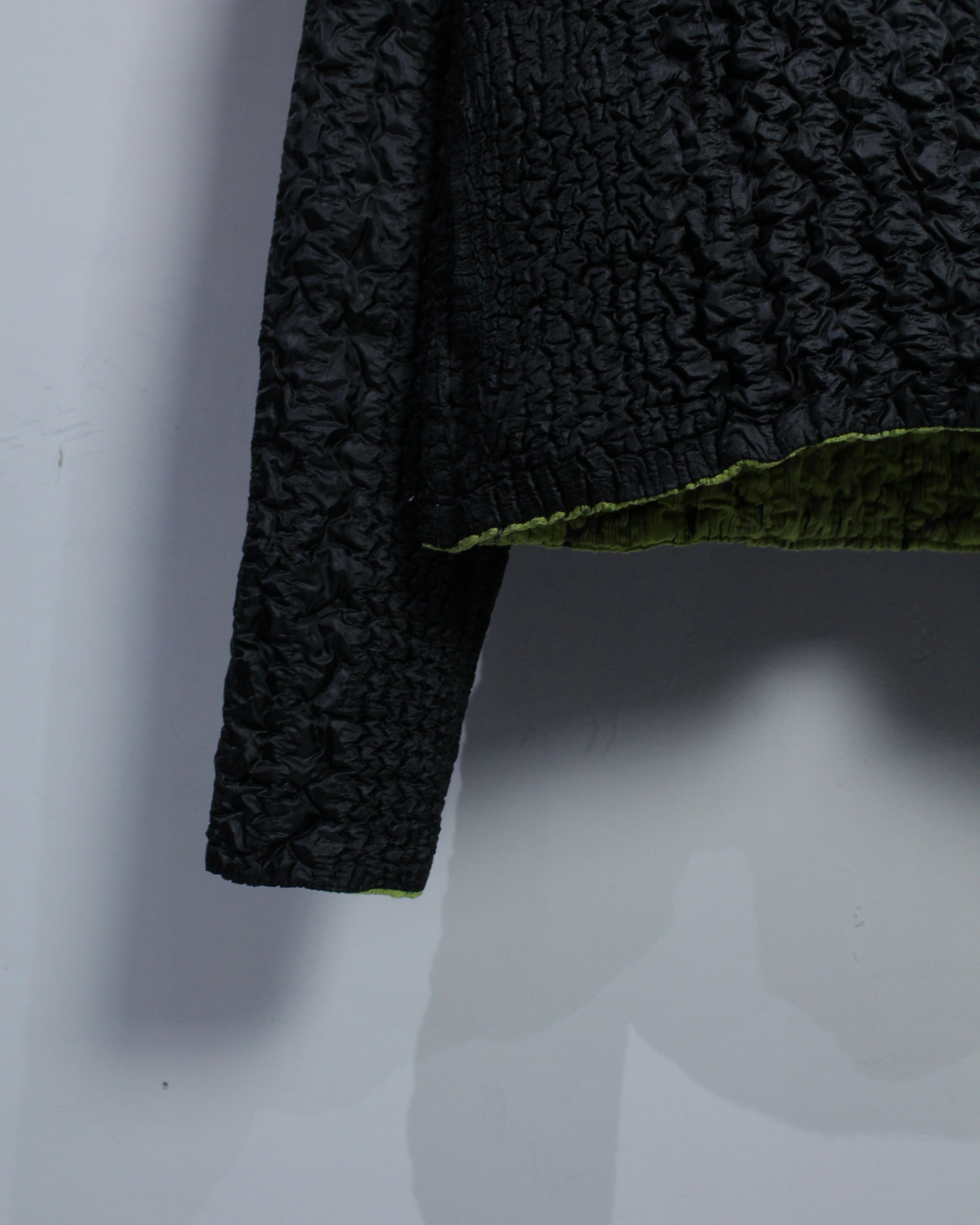 表面はブラックのボディに、全体へ凹凸のあるポップコーン状の加工を施したファブリックを採用。光の当たり方で陰影が生まれ、単色ながら奥行きのある表情に仕上がった1着。
