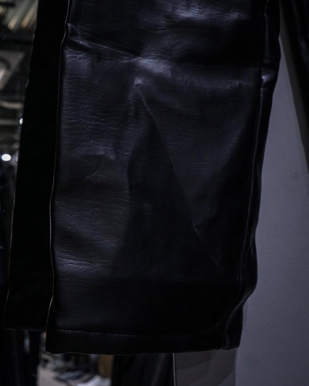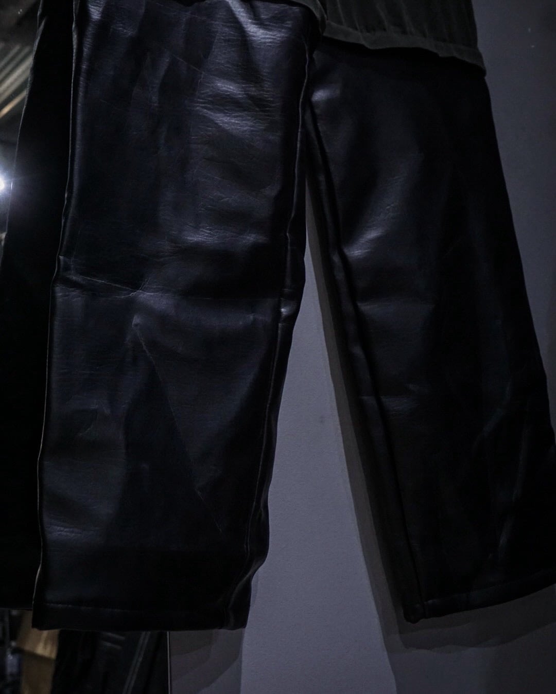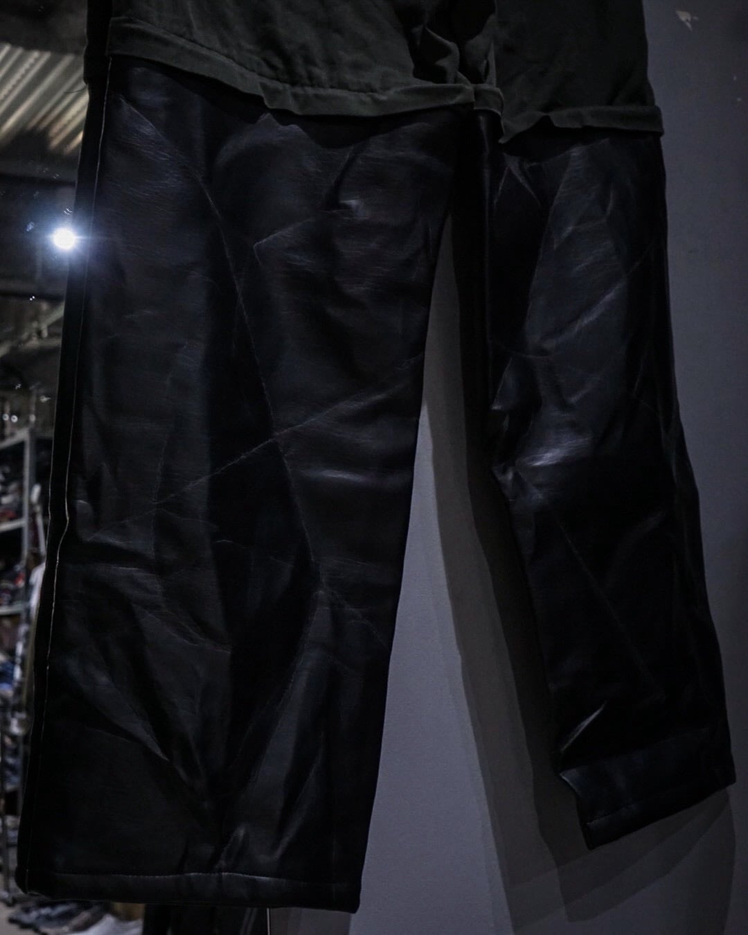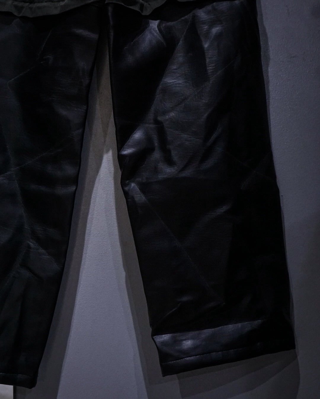 上部はタフなコットンベースのファブリック、対して膝下はしなやかで鈍い光沢を放つレザーに切り替えた異素材切り替えの1着。