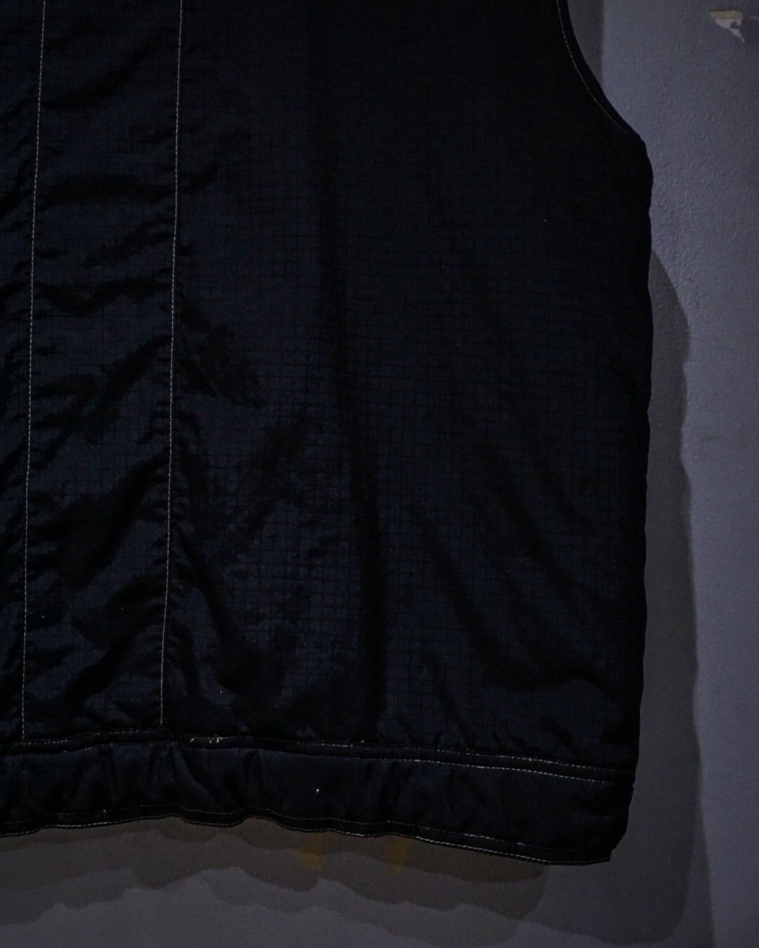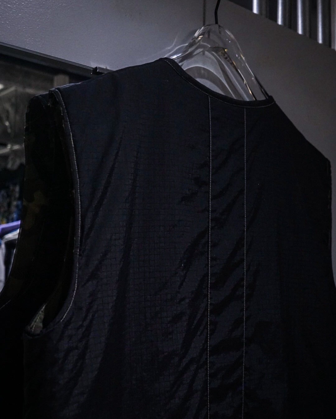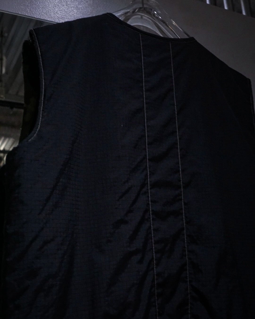 ハリのあるブラックのリップストップナイロンをボディに使用し、計7つのポケットを搭載したパデッドベスト。
