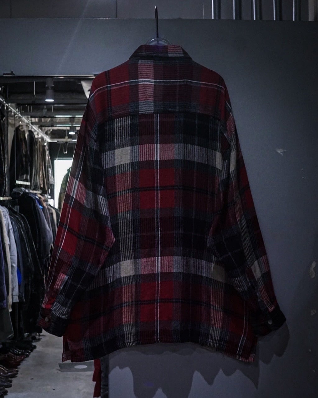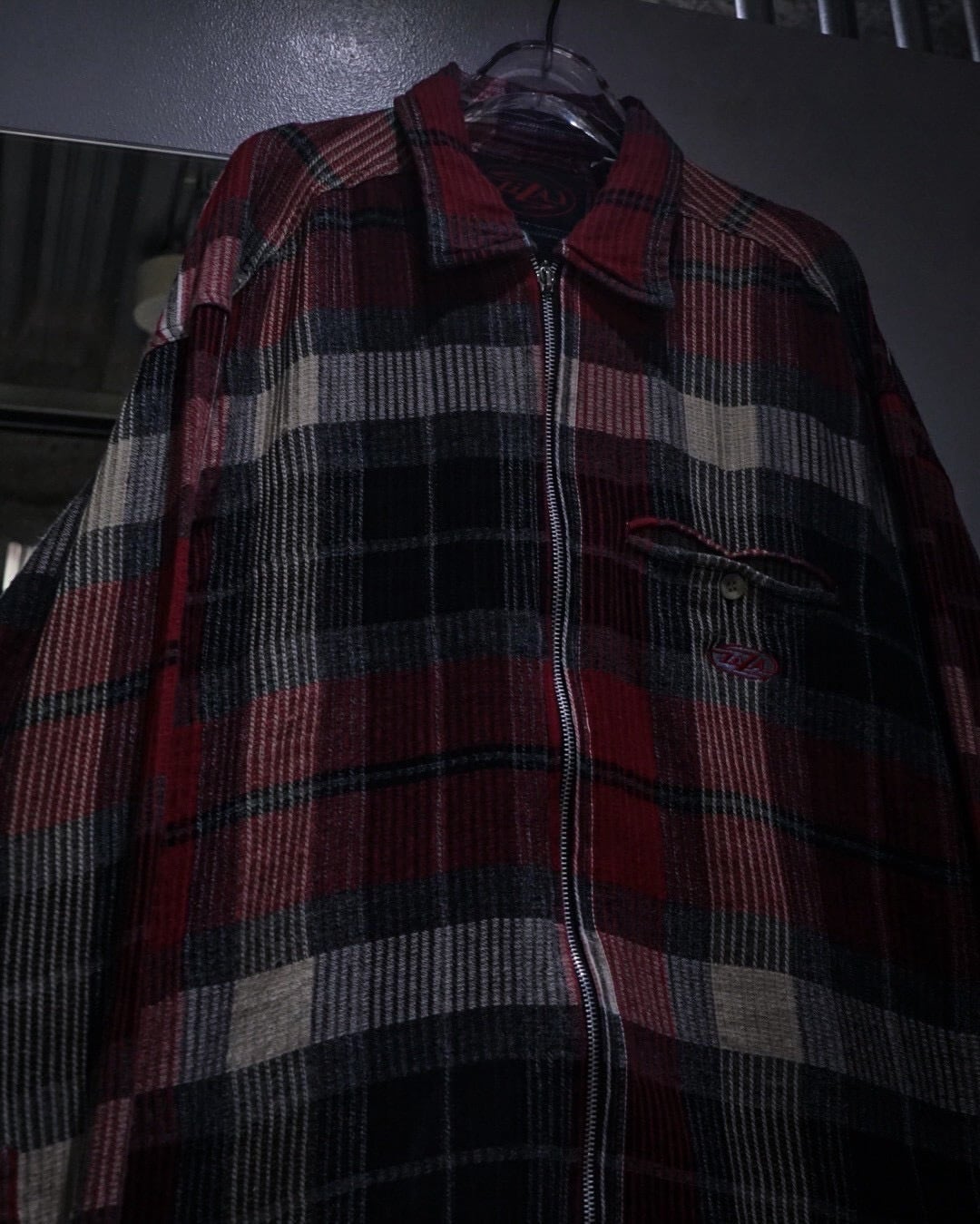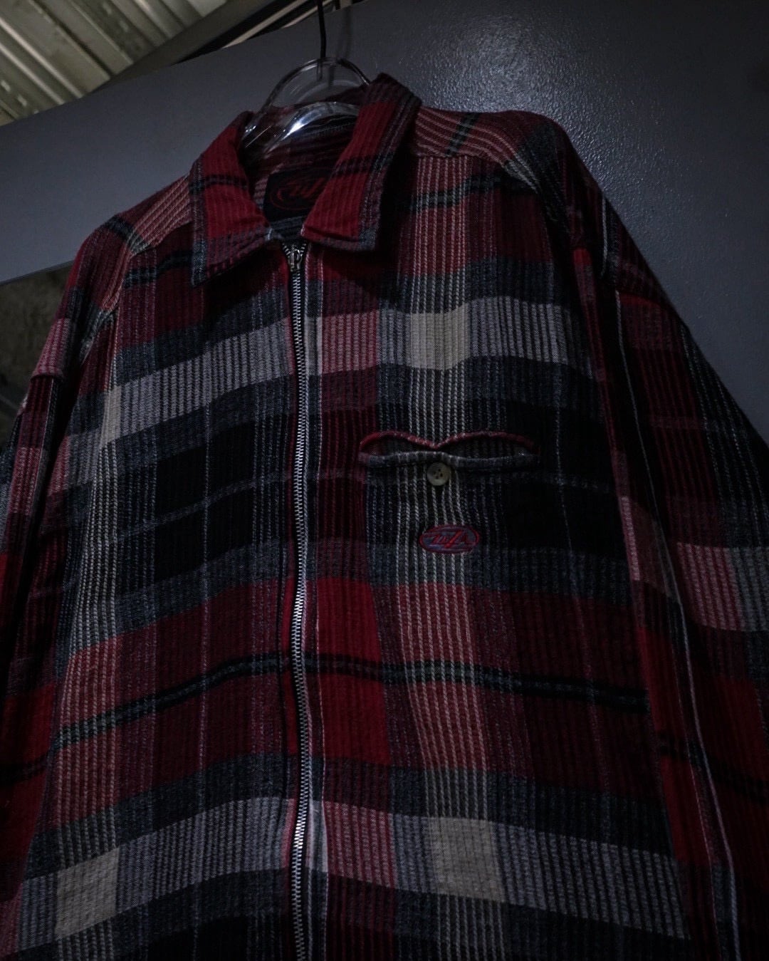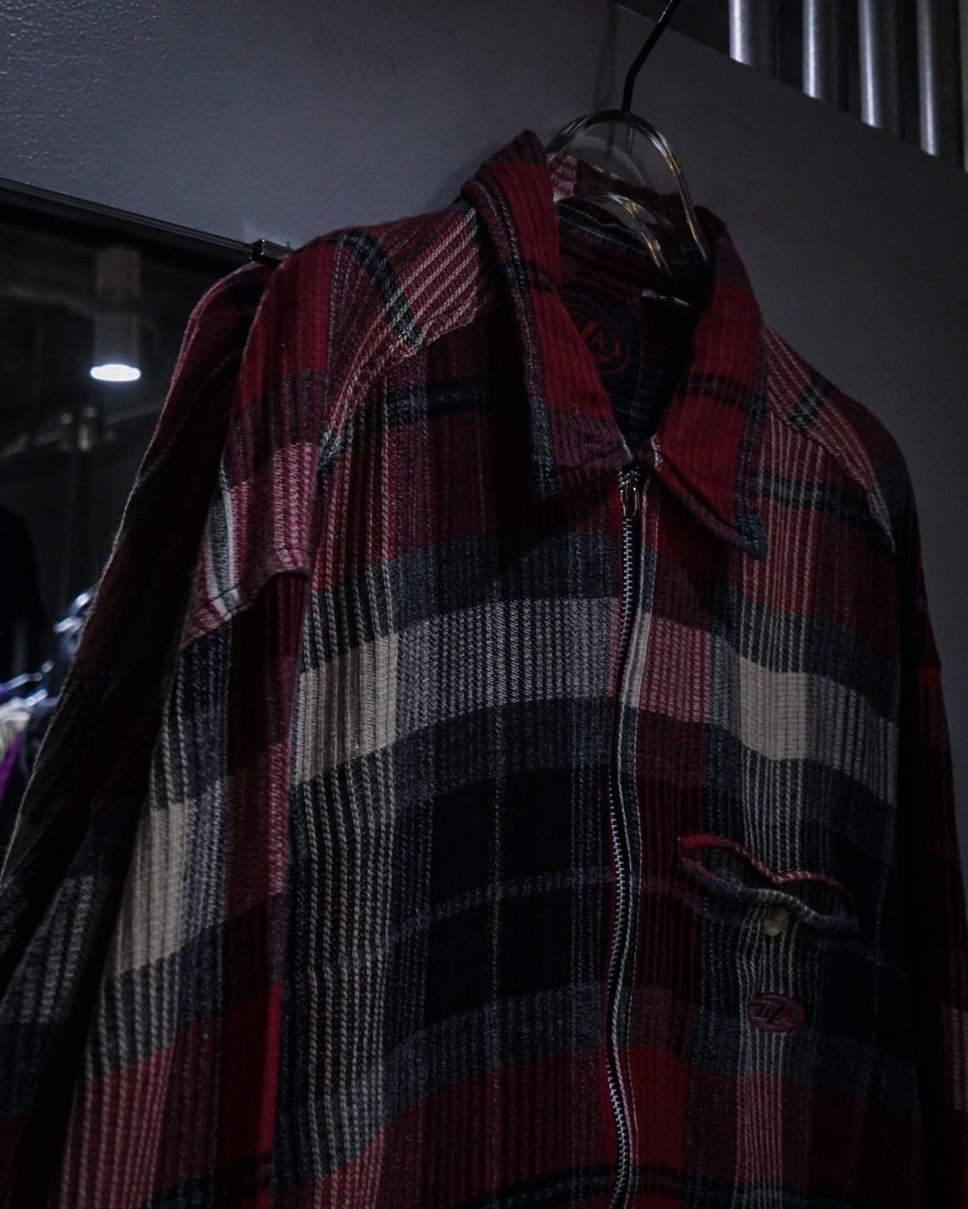 フロントはジップアップ仕様で、通常のシャツとは一線を画すデザイン。胸元にはポケットを配置し、その上に90〜00'sレイヴや横ノリ等のストリートカルチャーを想起させるオーバルロゴ刺繍が施されており、通常のアメカジ的チェックシャツとはまた違った味わいがあります。