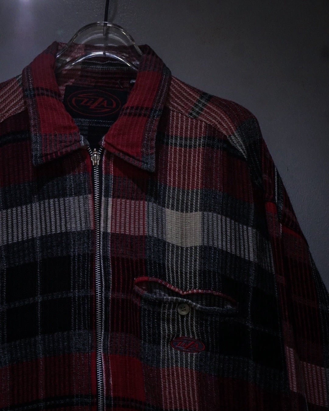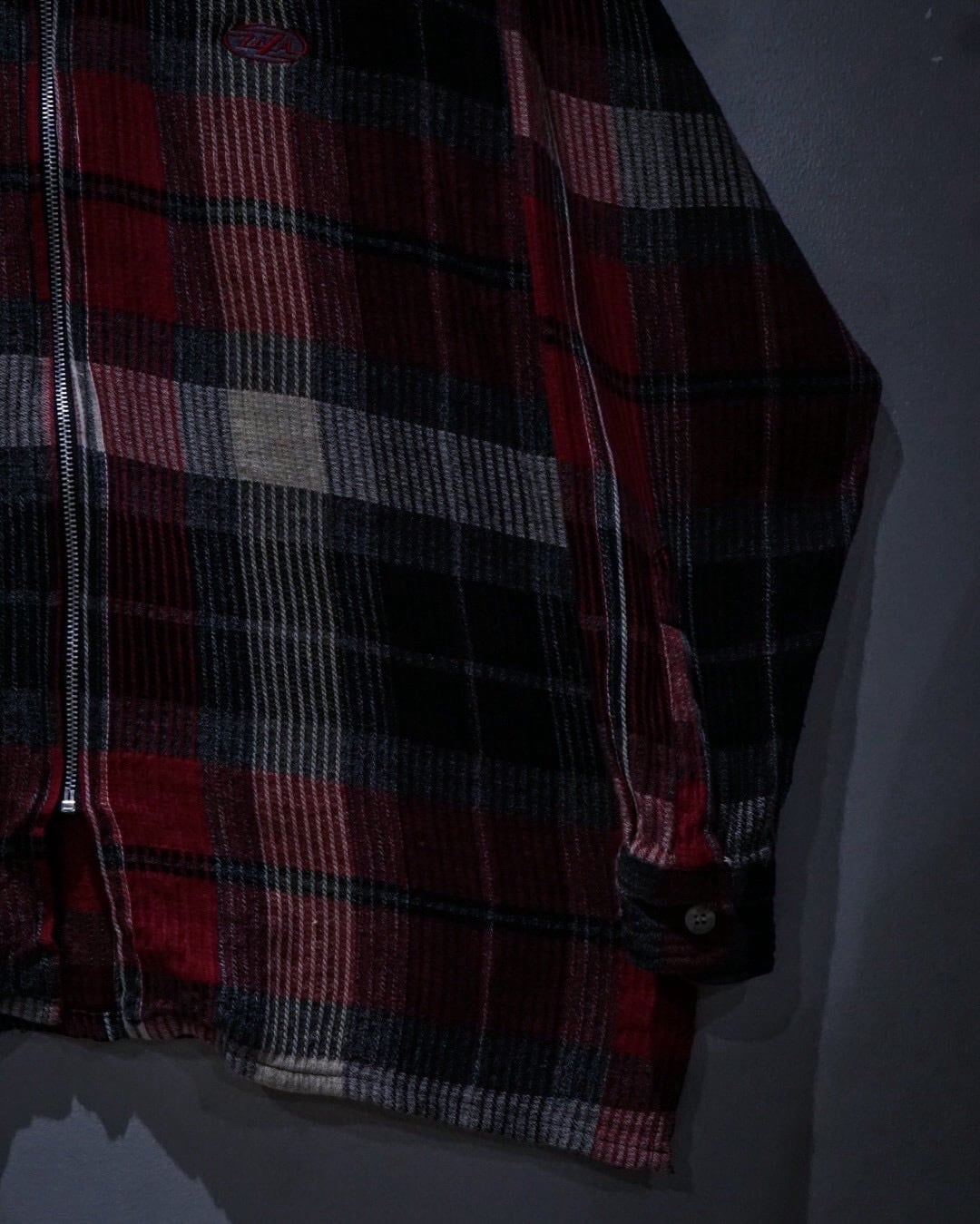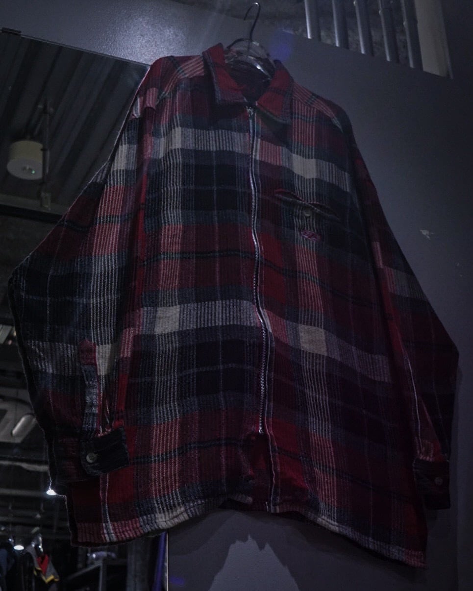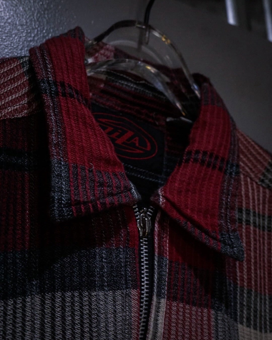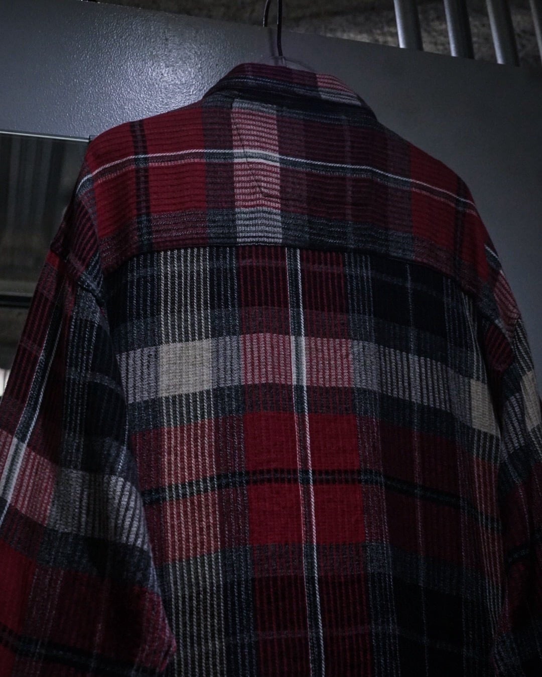 赤×黒×白の配色がスタイリングの主役を担う、チェック柄ジップアップシャツジャケットをご紹介いたします。