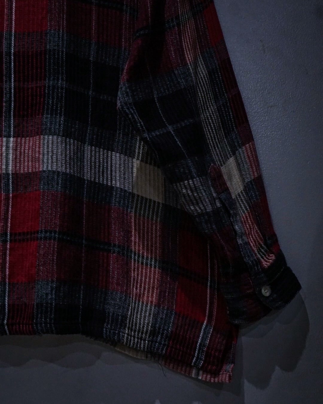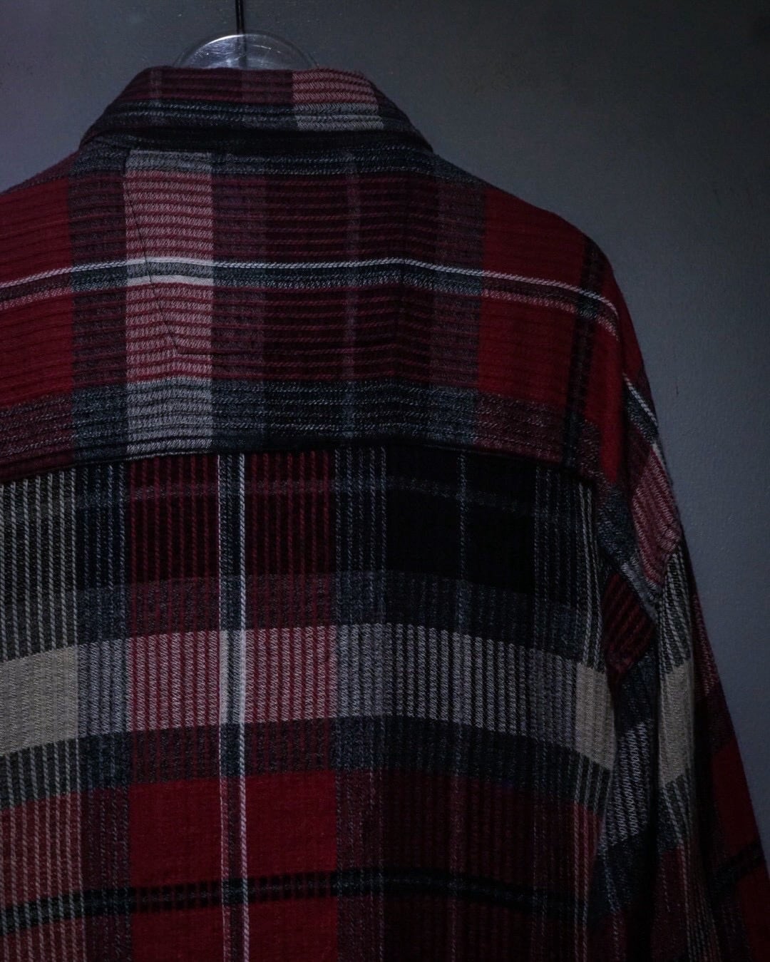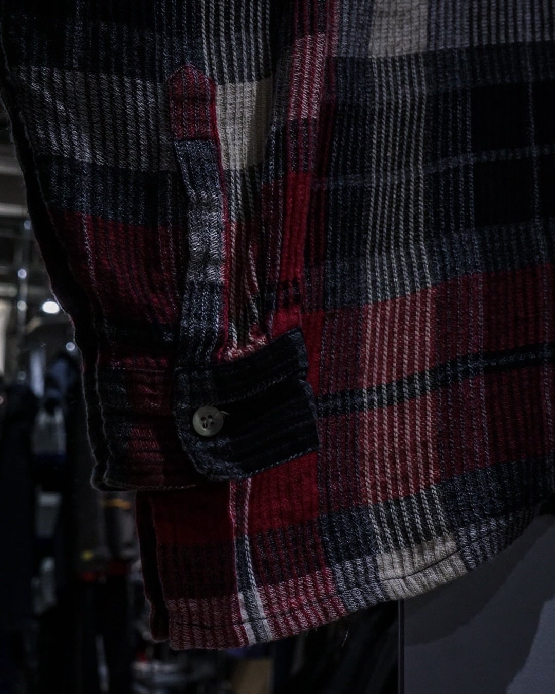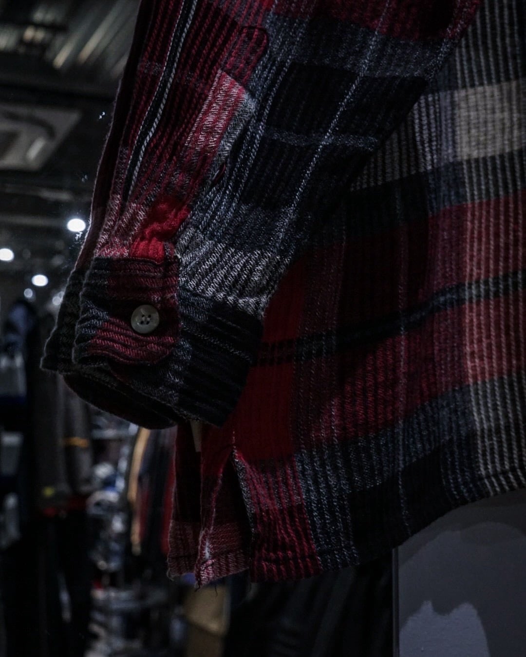 赤×黒×白の配色がスタイリングの主役を担う、チェック柄ジップアップシャツジャケットをご紹介いたします。
