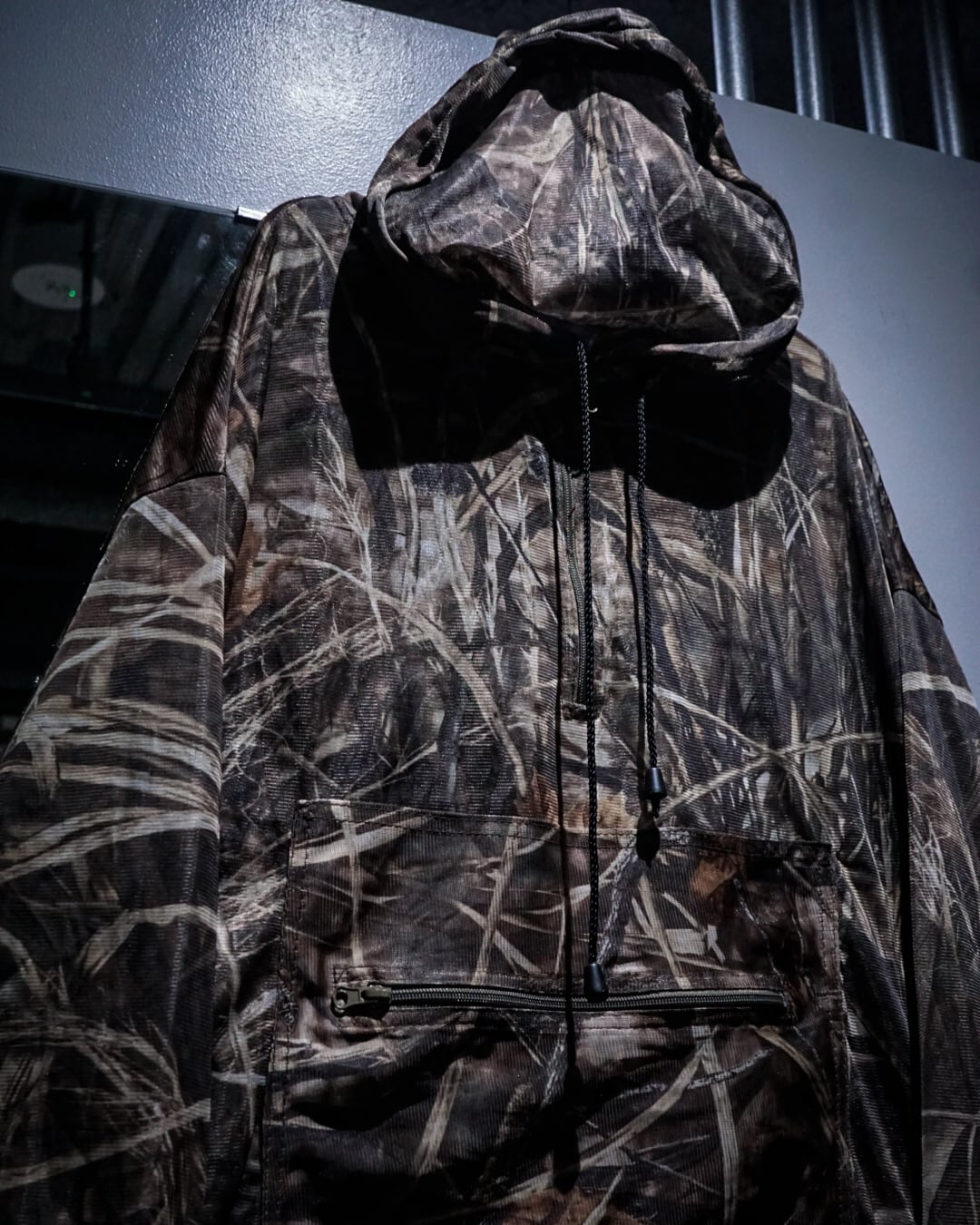 フロントはハーフジップ仕様に加え、フード部分までジップが走るフルジップ。ポケットやドローコードなど、実用性を意識したディテールも随所に配置されており、機能服としての背景をしっかりと感じられます。