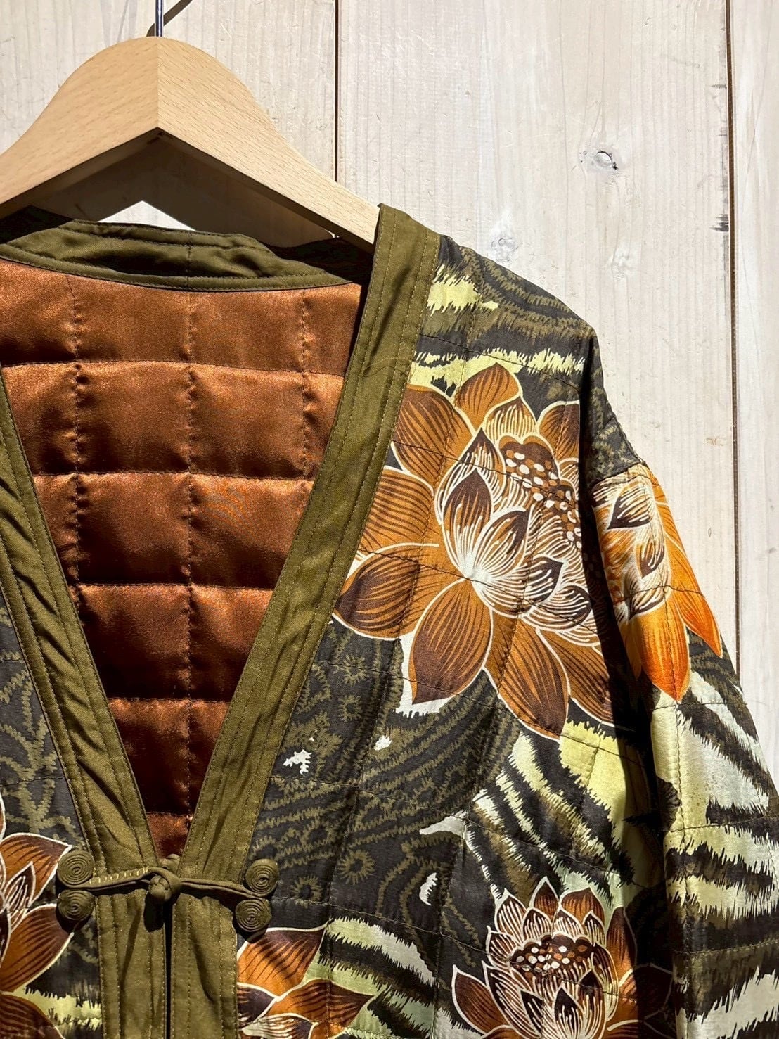 フロントにはチャイナボタンを配し、Vネック仕様で抜け感のあるディテールに。両面ともにしっかりと作り込まれており、デザイン性と実用性を兼ね備えた完成度の高い仕上がりに。
