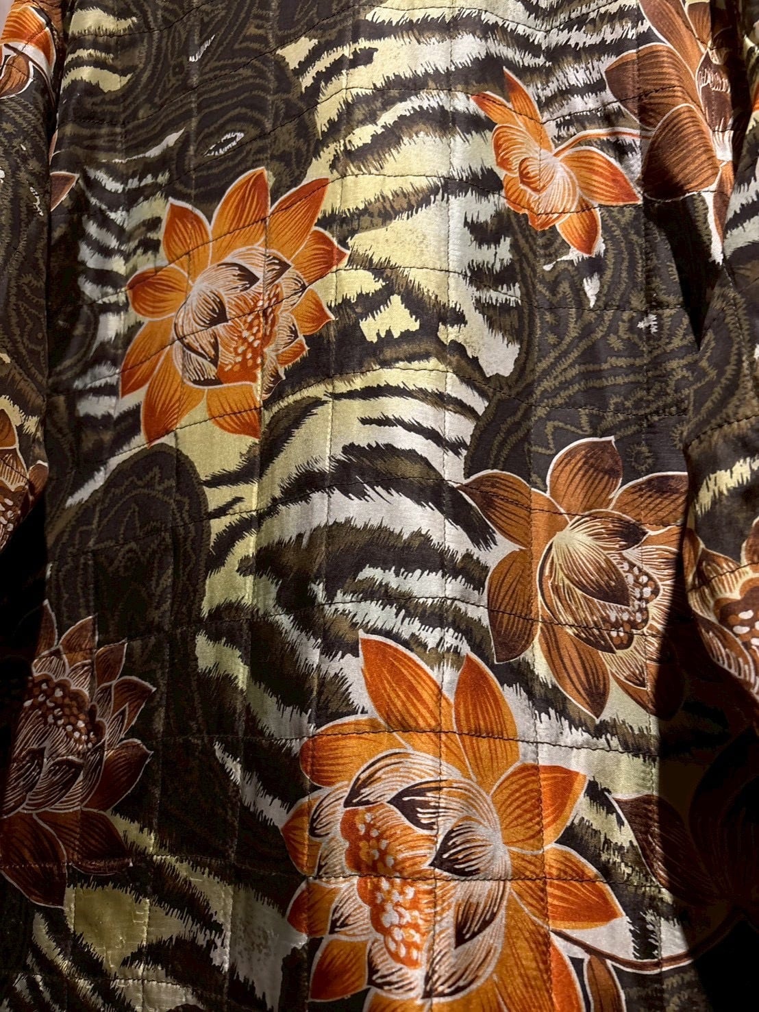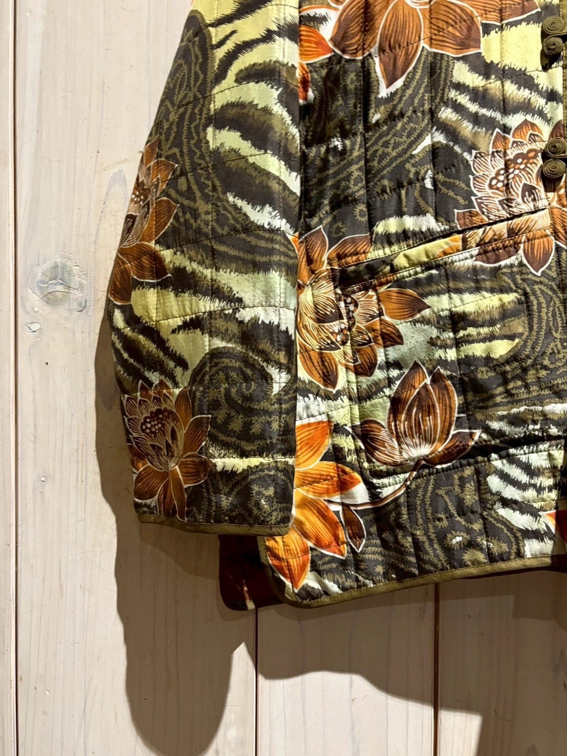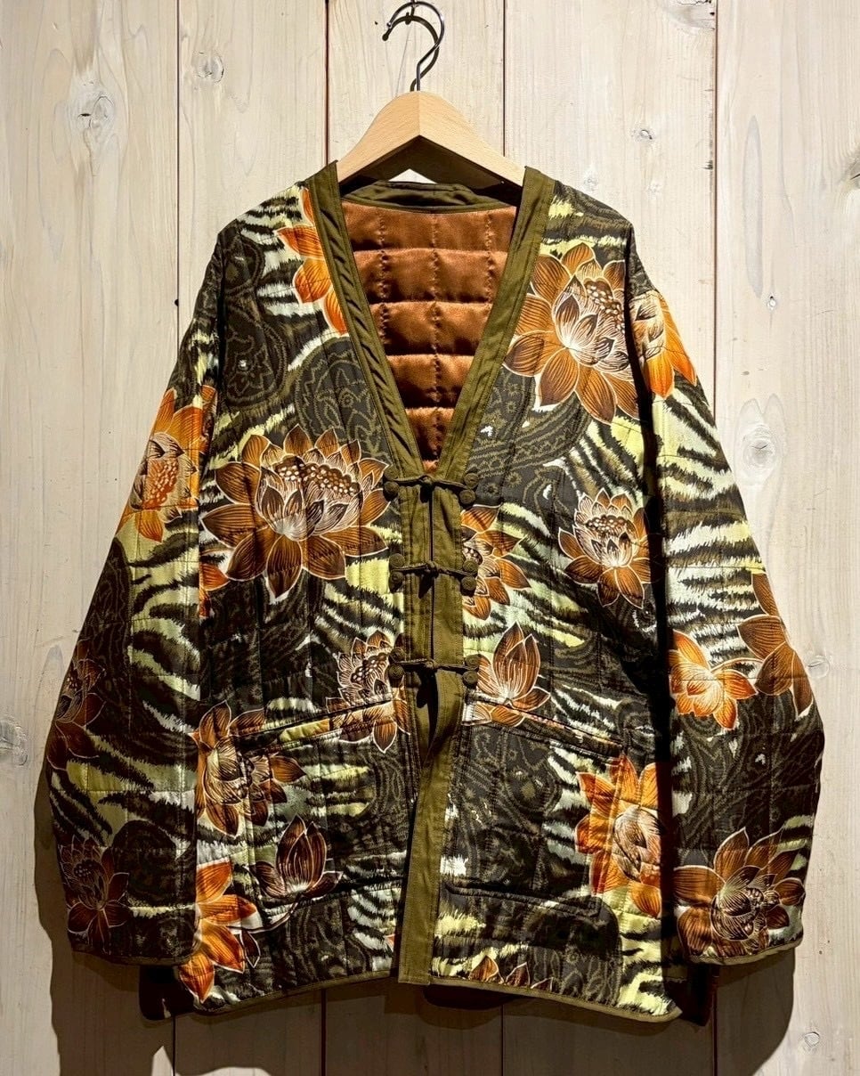 ペイズリーやフラワー、タイガーパターンを織り交ぜたインパクトのある総柄を落とし込み、奥行きのある配色と相まって圧倒的な存在感を放つ表面。