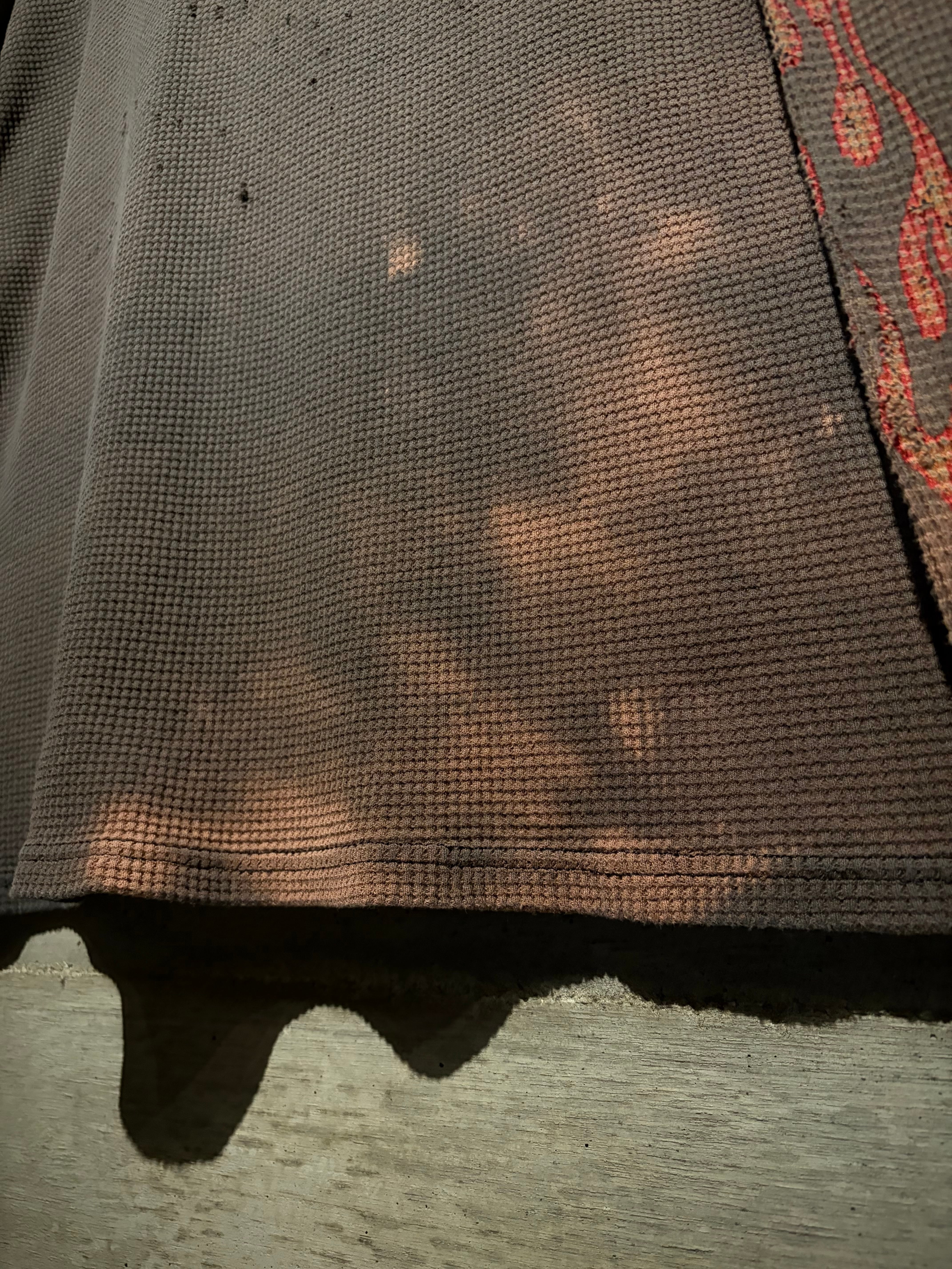 激しいフェードによって褪色したブラウンカラーのボディと、随所に効いたダメージが退廃的な表情を演出。フロントにはロゴプリント、袖には高い人気を誇るフレイムパターンを配した、デザイン&雰囲気共に抜群な1枚。