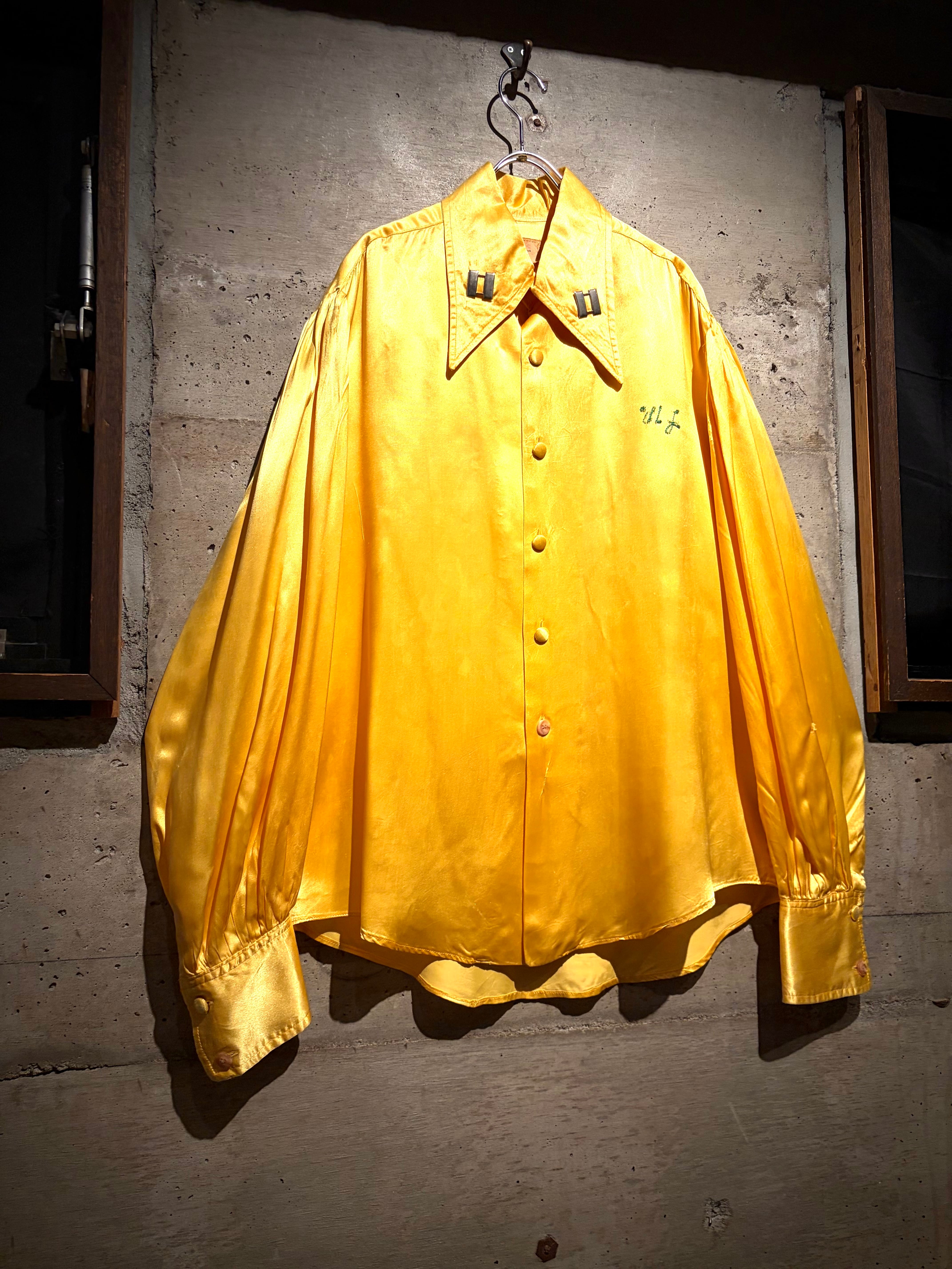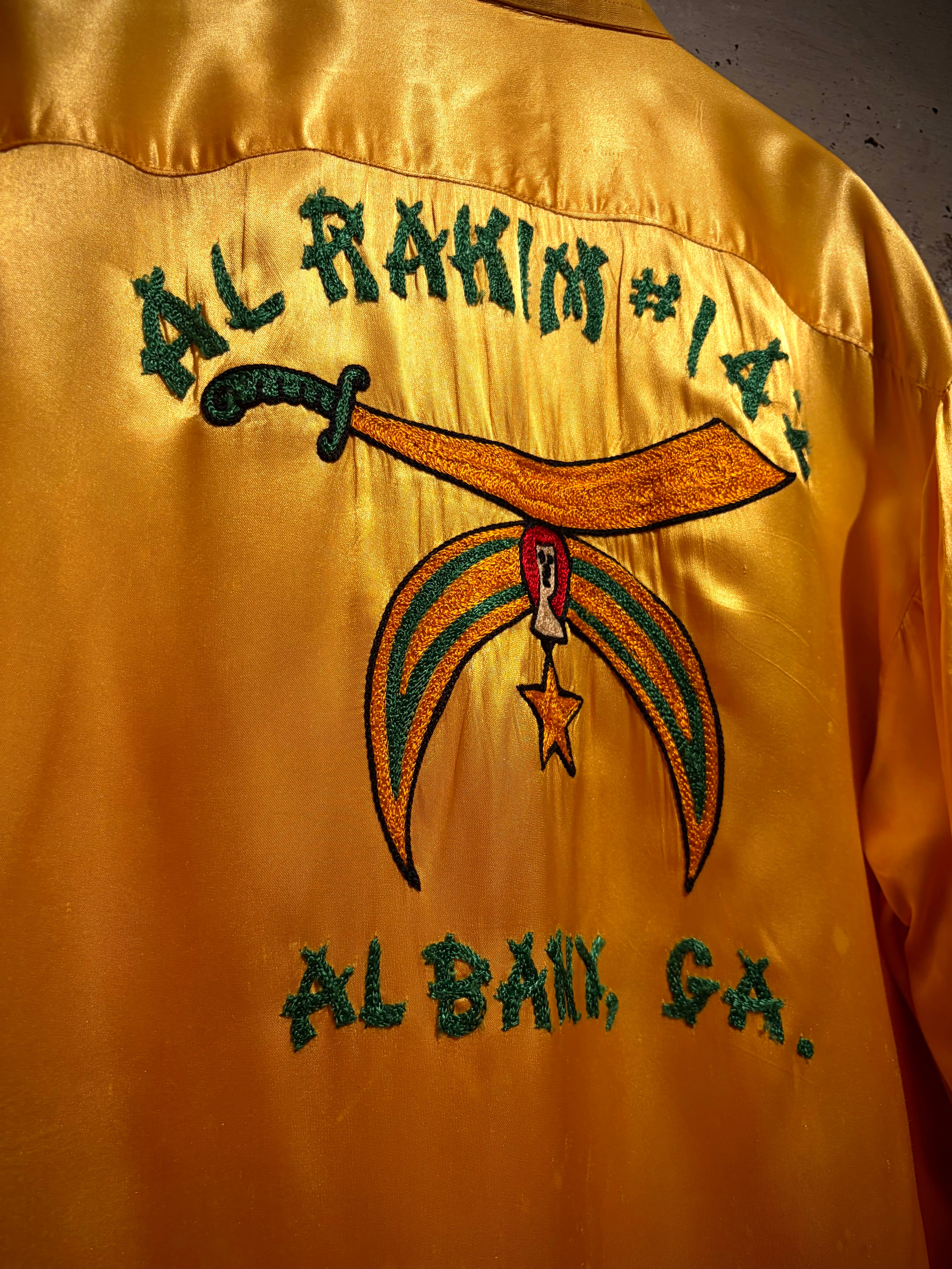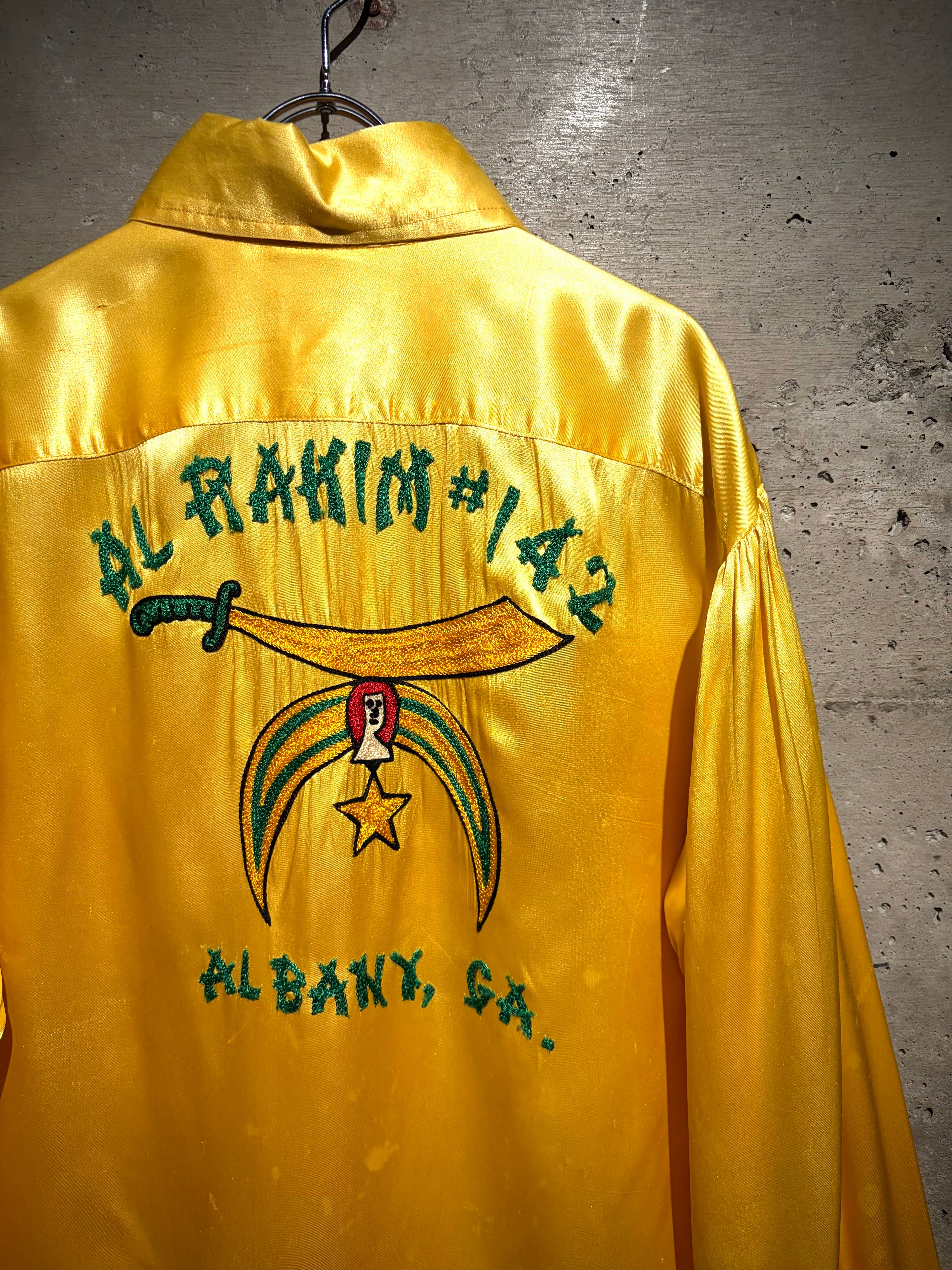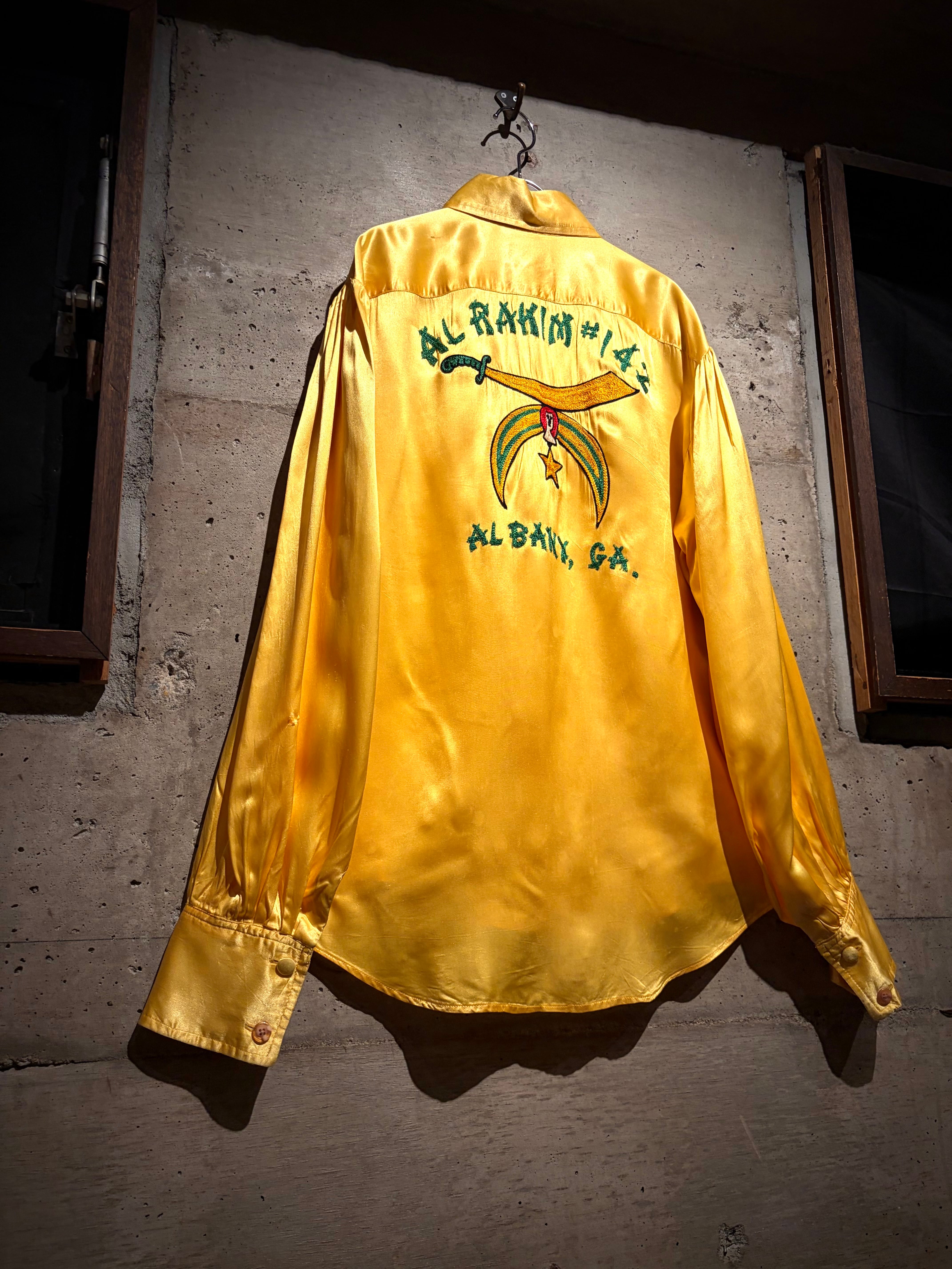 光沢感のある滑らかなサテン生地をボディに用い、シュライナーのシンボルマークをチェーンステッチ刺繍で背面に落とし込んだ、40's〜50'sのサテンシャツ。