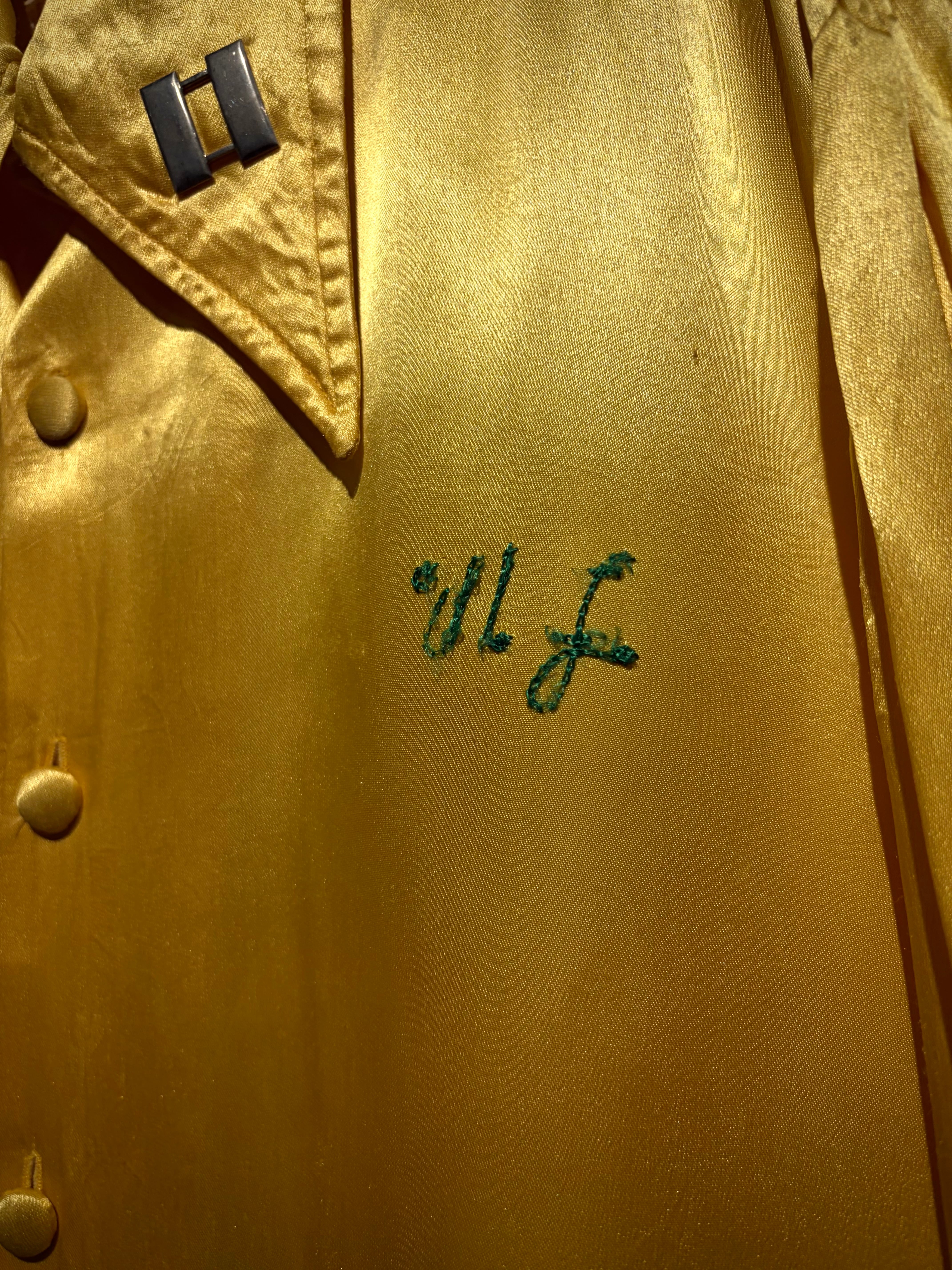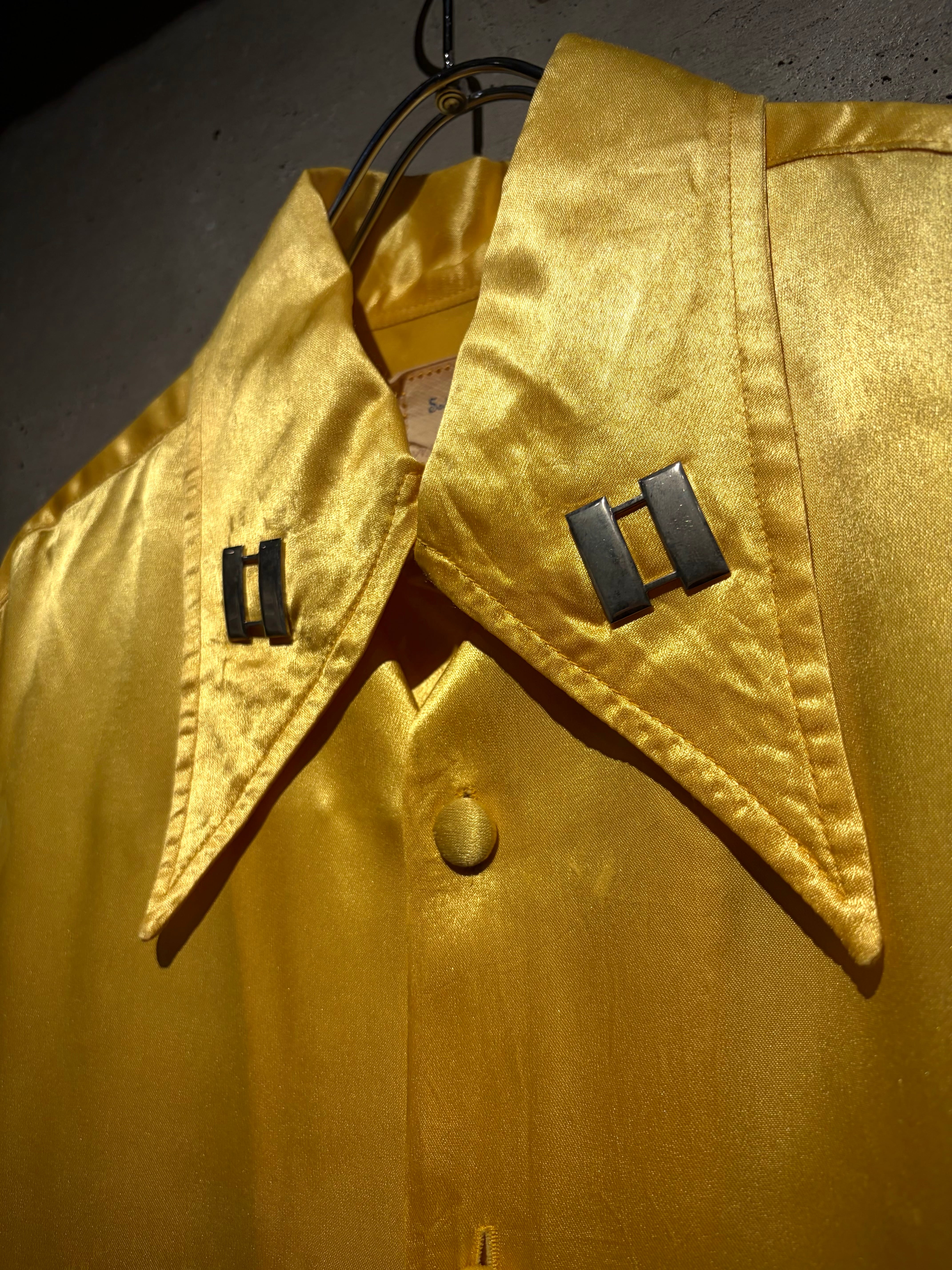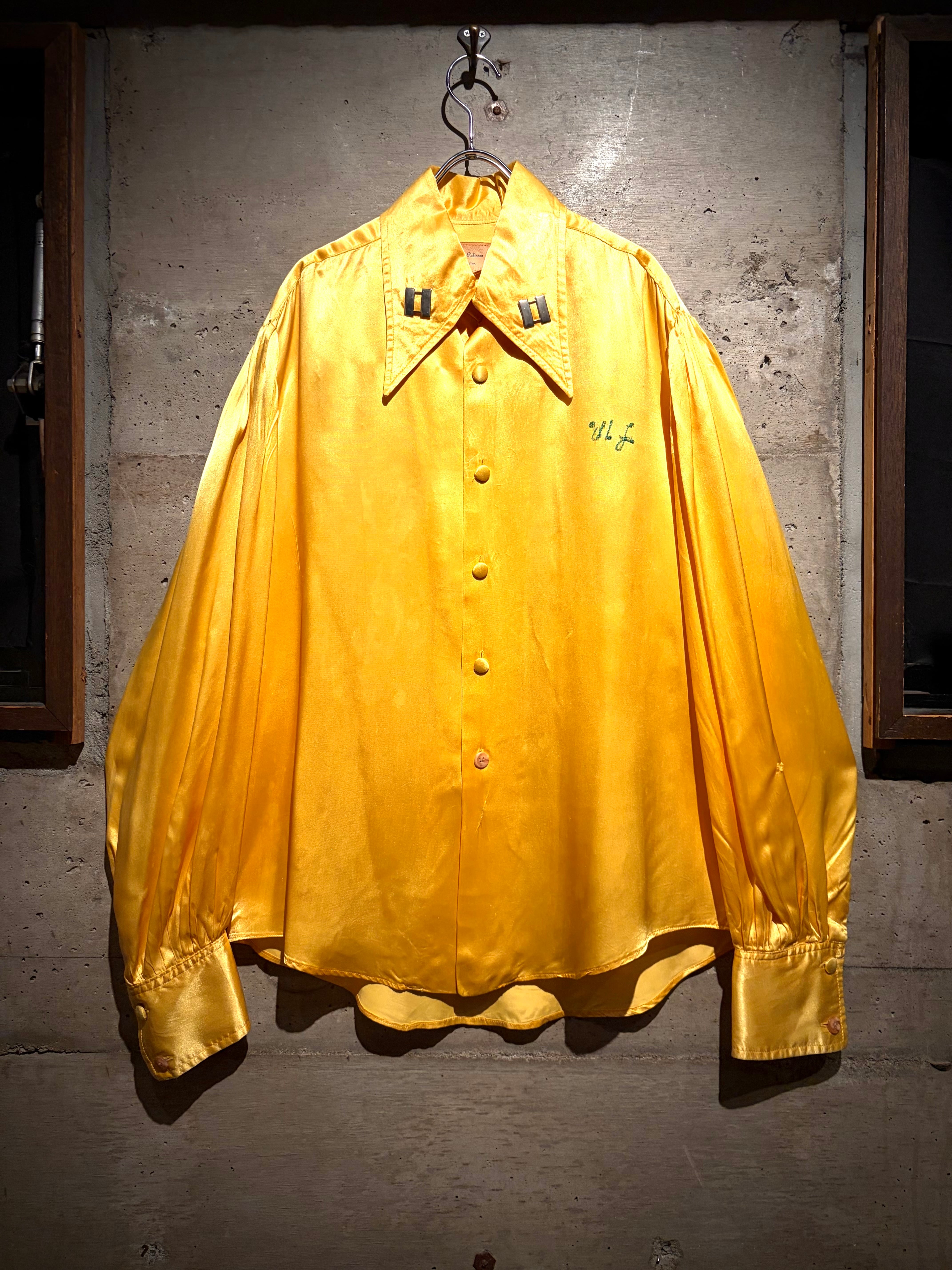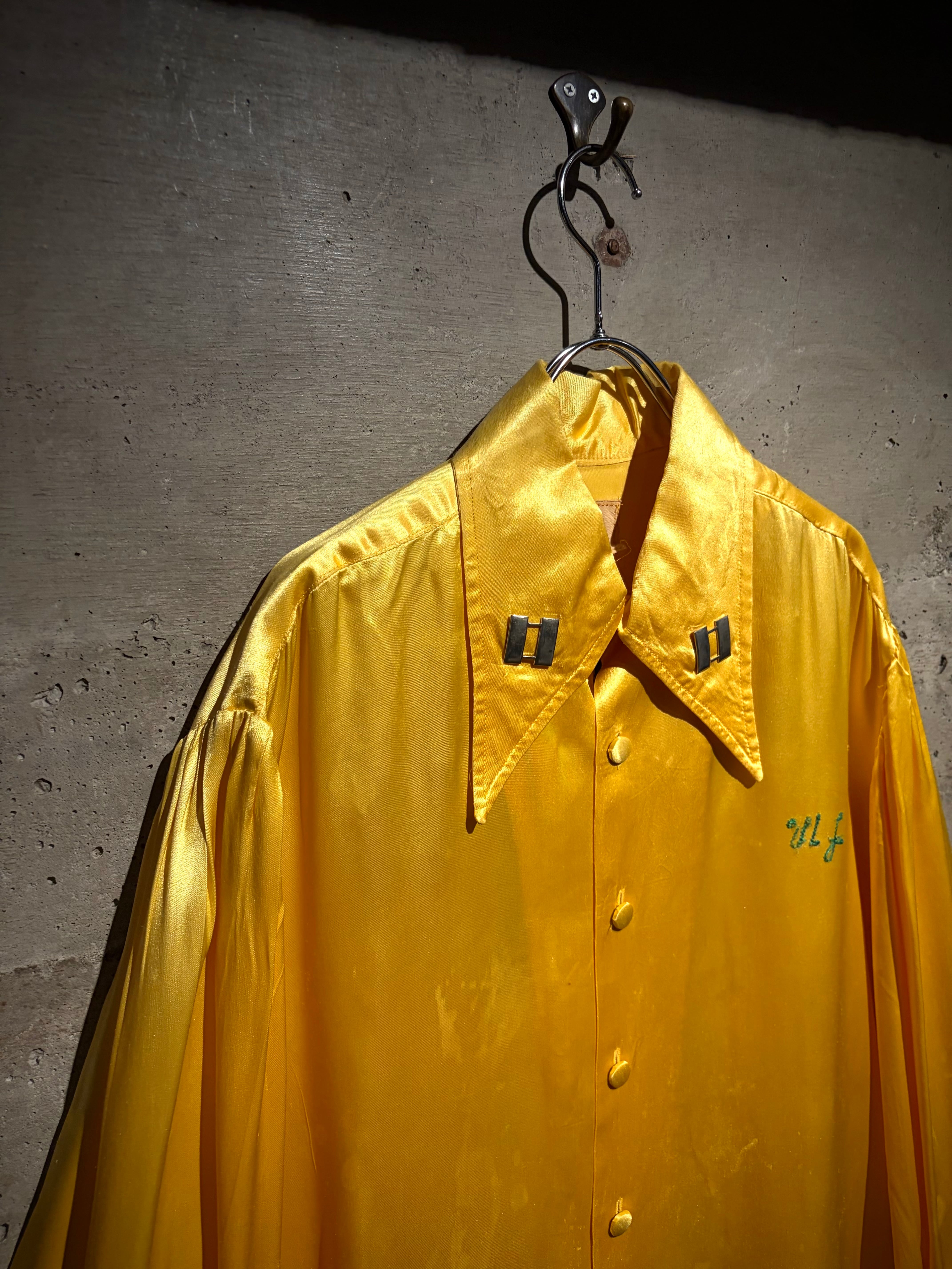 光沢感のある滑らかなサテン生地をボディに用い、シュライナーのシンボルマークをチェーンステッチ刺繍で背面に落とし込んだ、40's〜50'sのサテンシャツ。