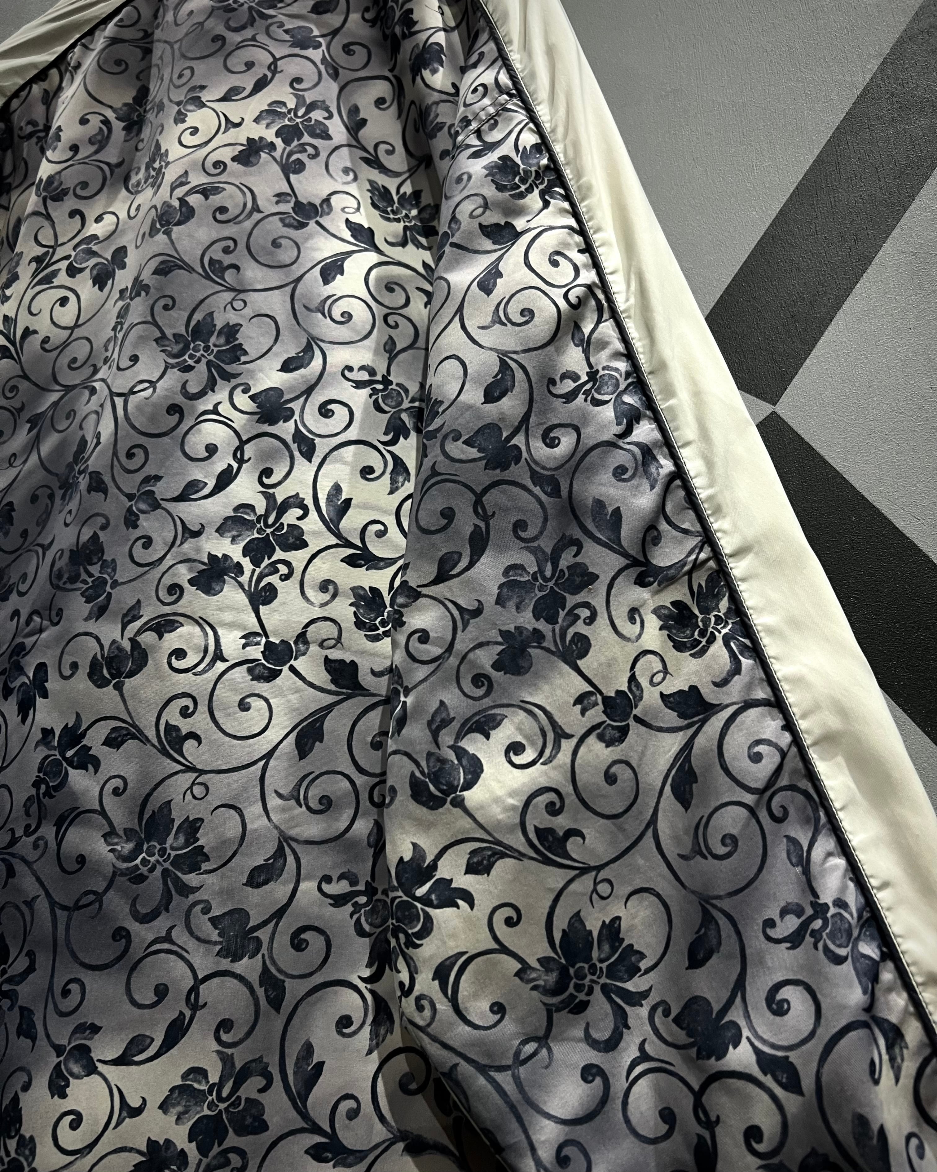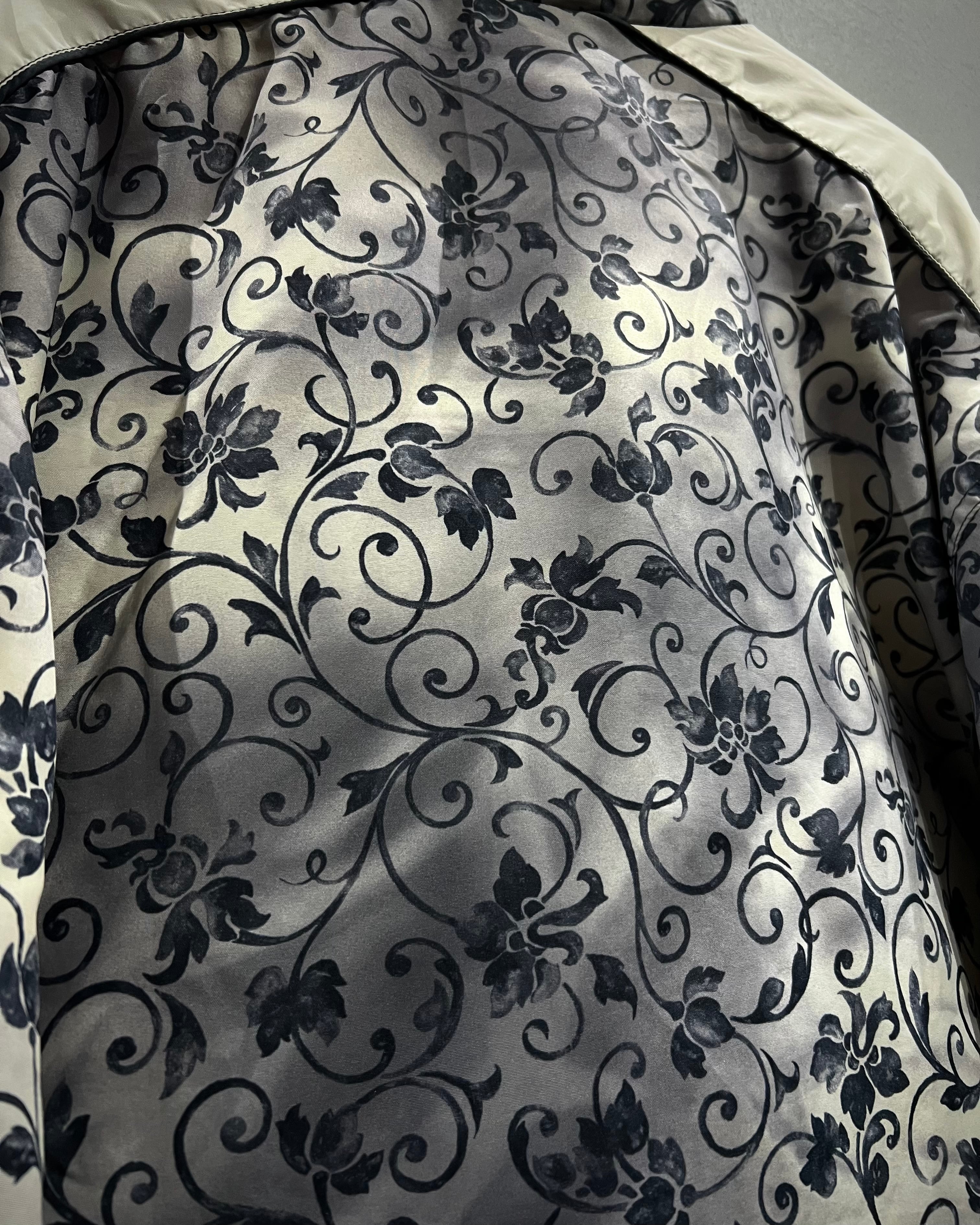 ボディには全面に施されたボタニカル柄が印象的で、モノトーンベースながらも奥行きと華やかさを兼ね備えた1着。
