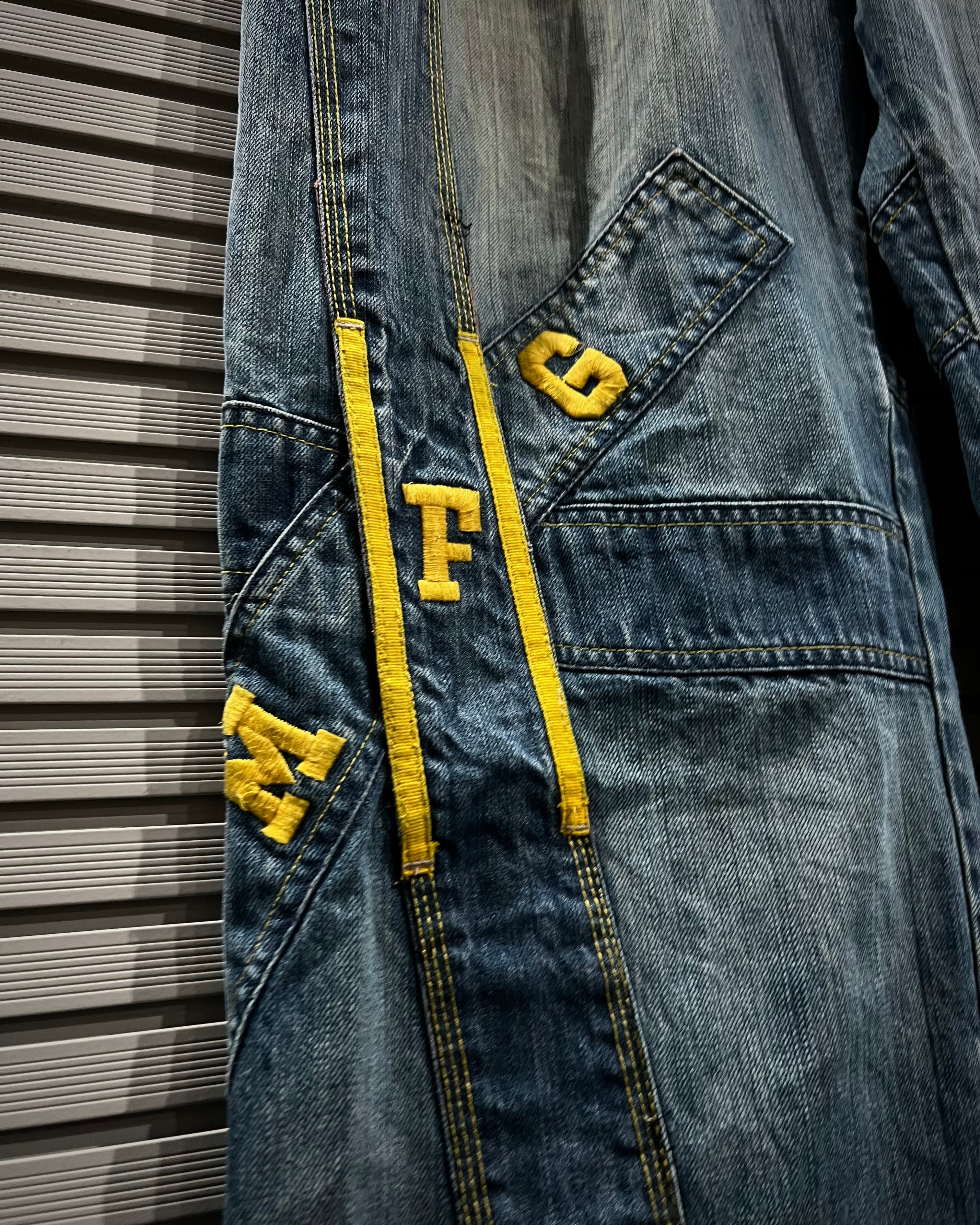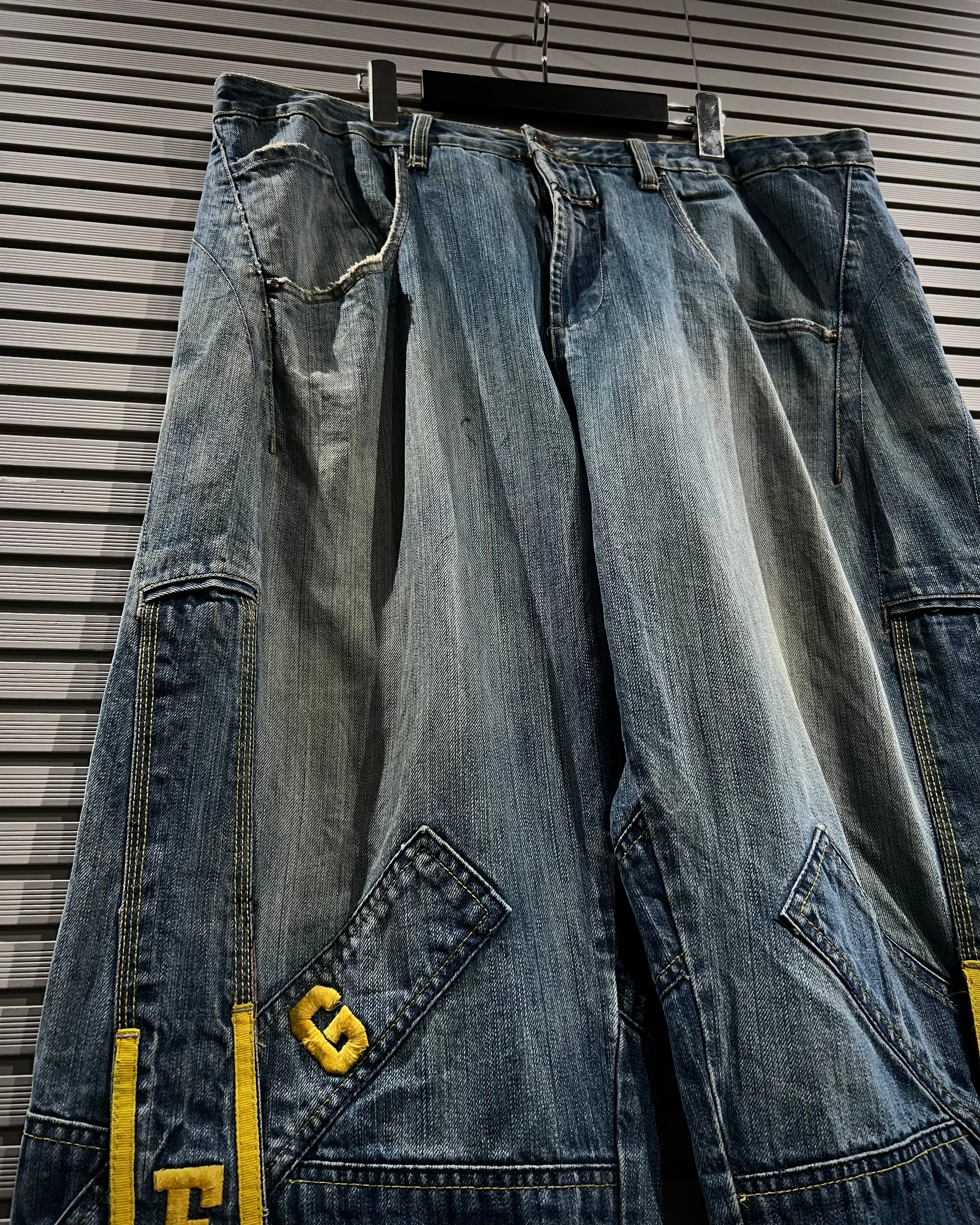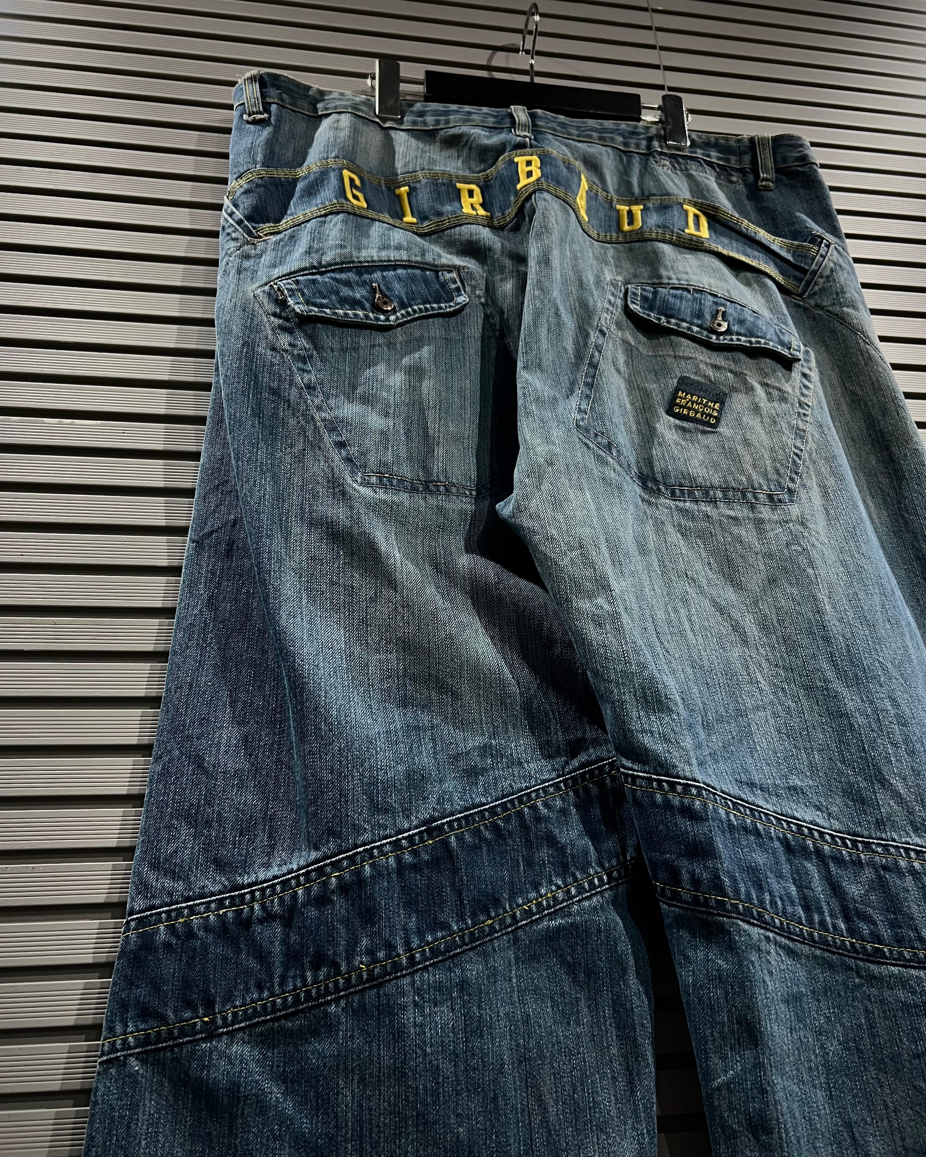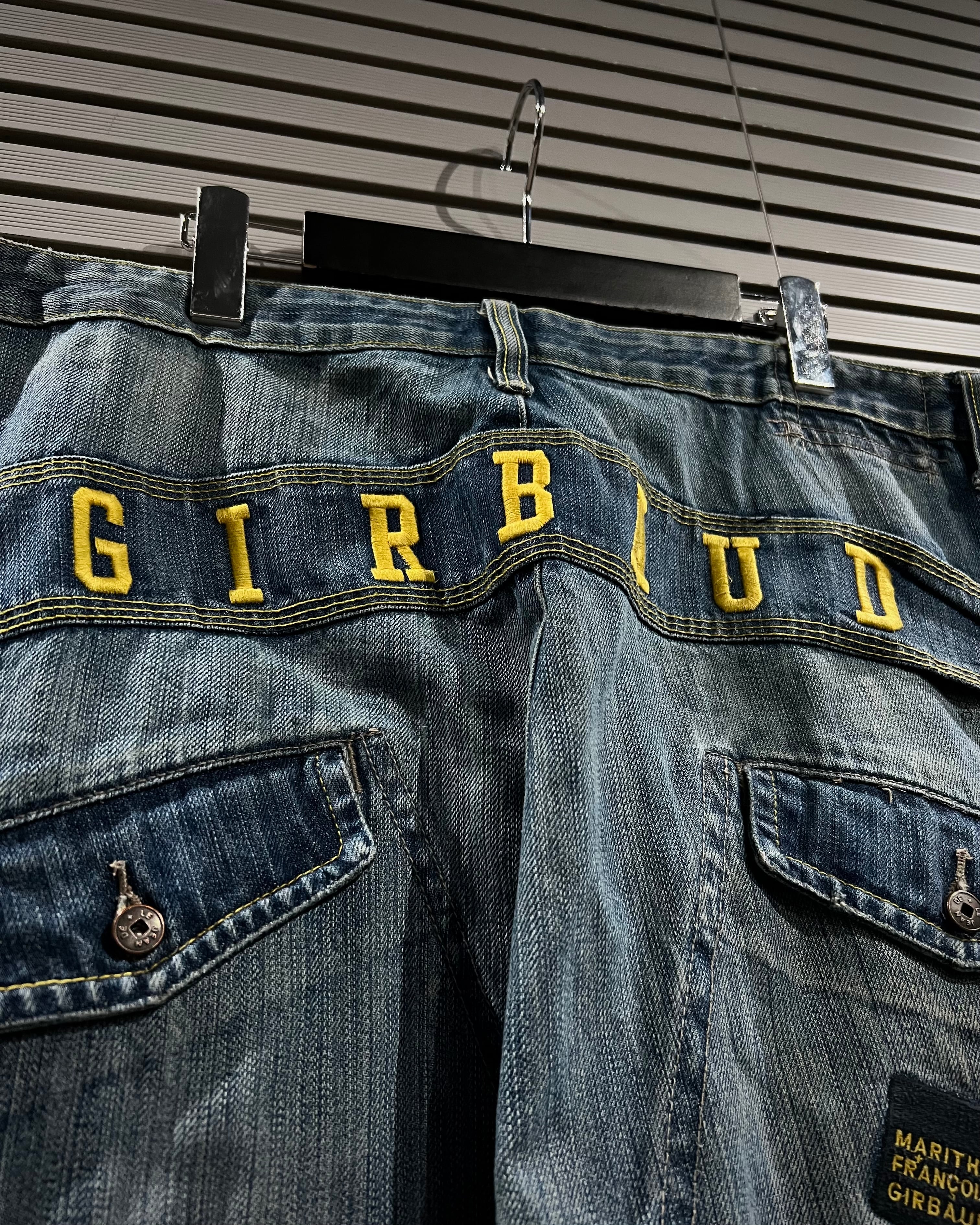 フロントを大胆に横断する斜めのXポケットはジルボーの代名詞とも言えるディテールをON。加えてテープ状の切り替えに配されたブランドロゴ刺繍、バックヨークに走る“GIRBAUD”のレタリングなど、随所にアイコニックな要素が散りばめられています。