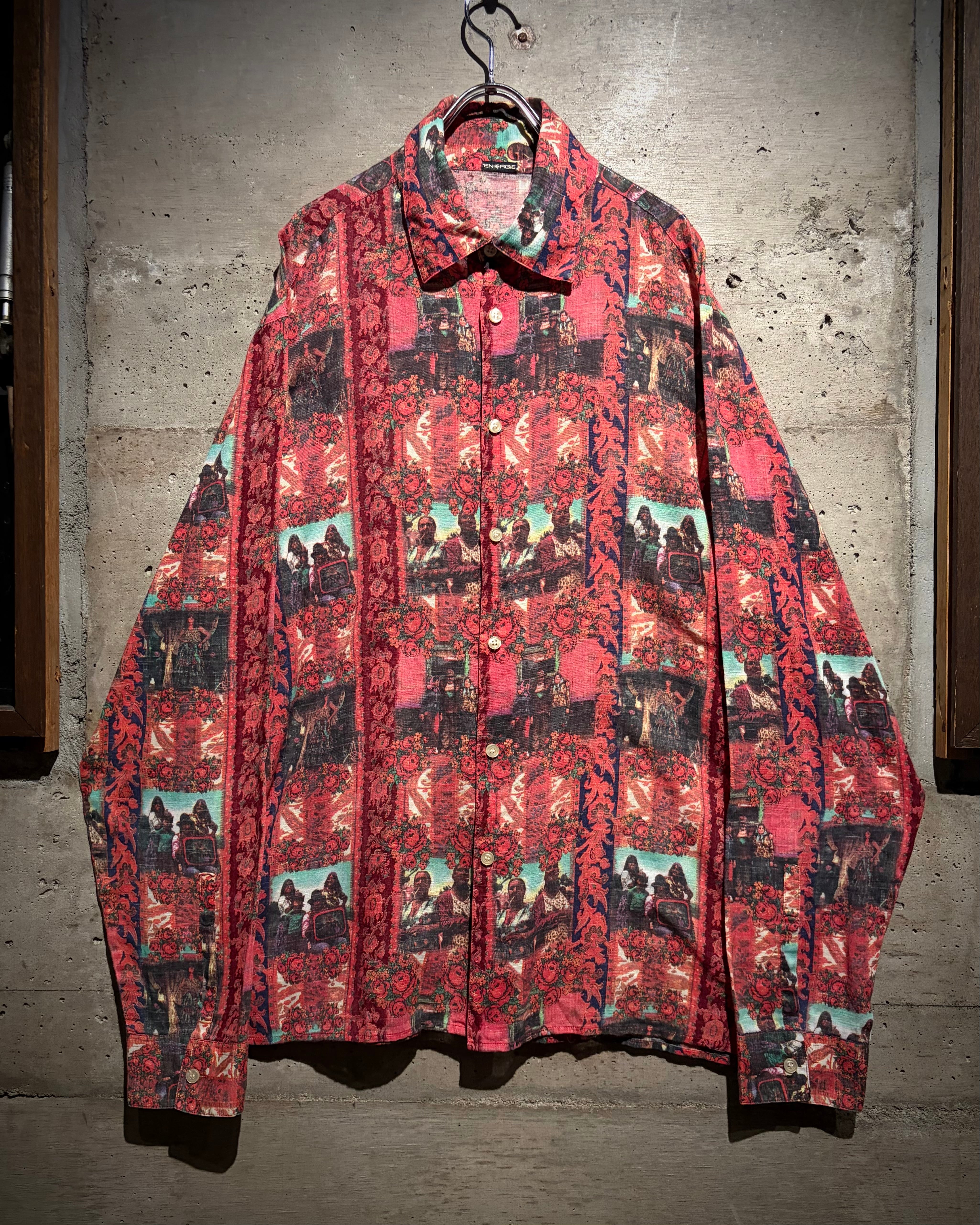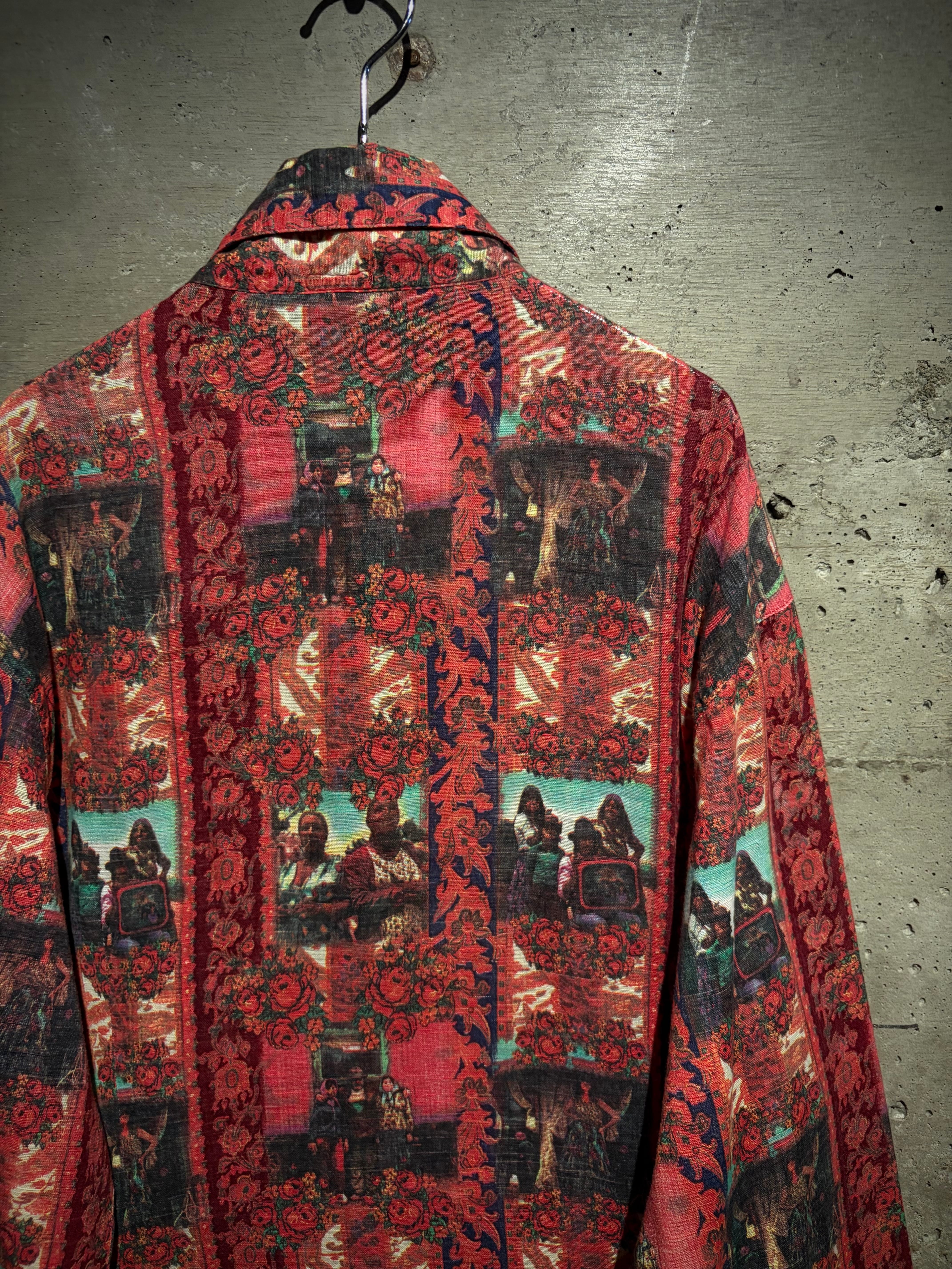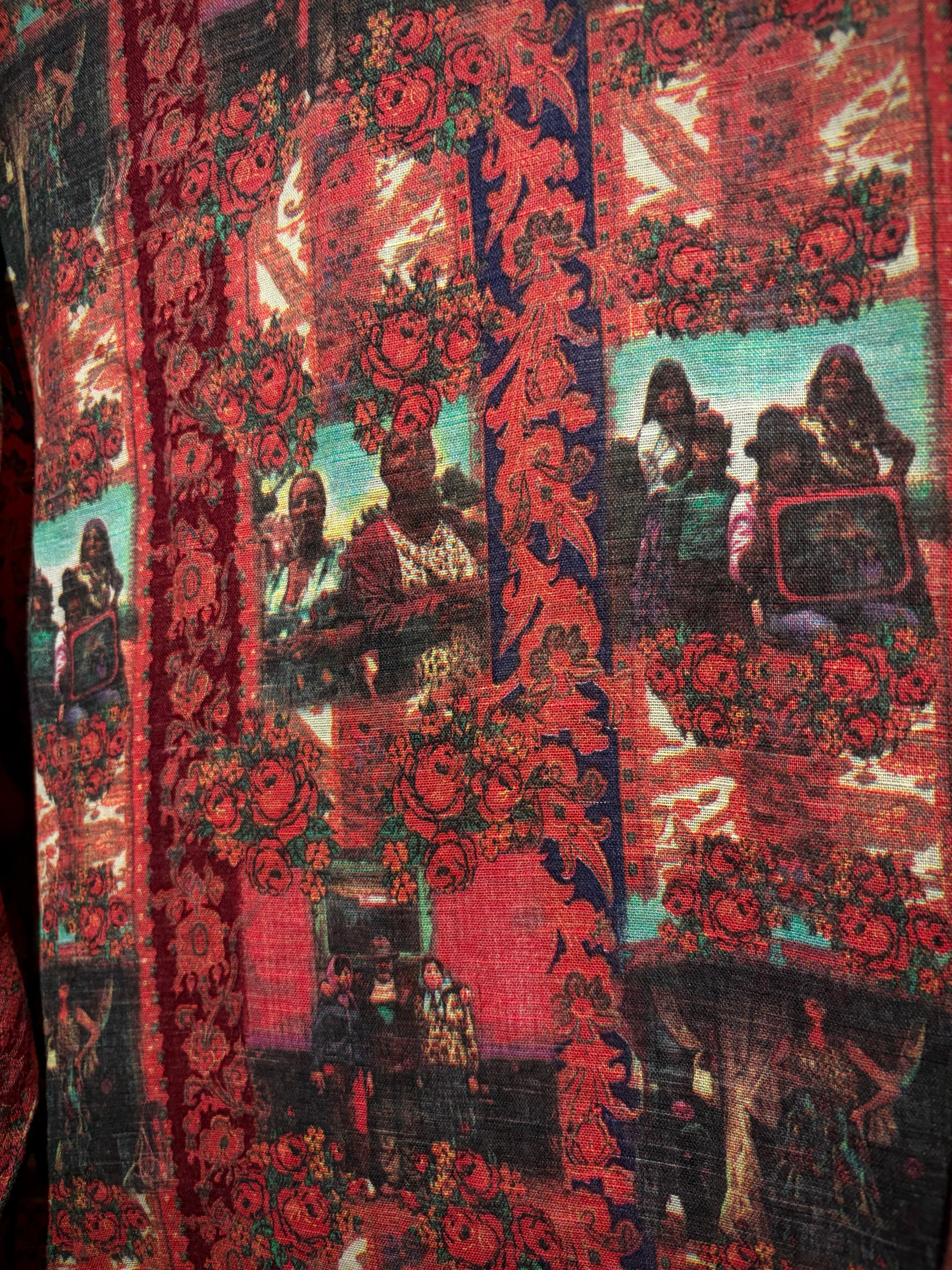 日常のワンシーンを切り取ったようなフォトグラフィックを全面に載せ、華やかなフラワーモチーフや装飾的なパターンを重ねたデザインが印象的な1着。