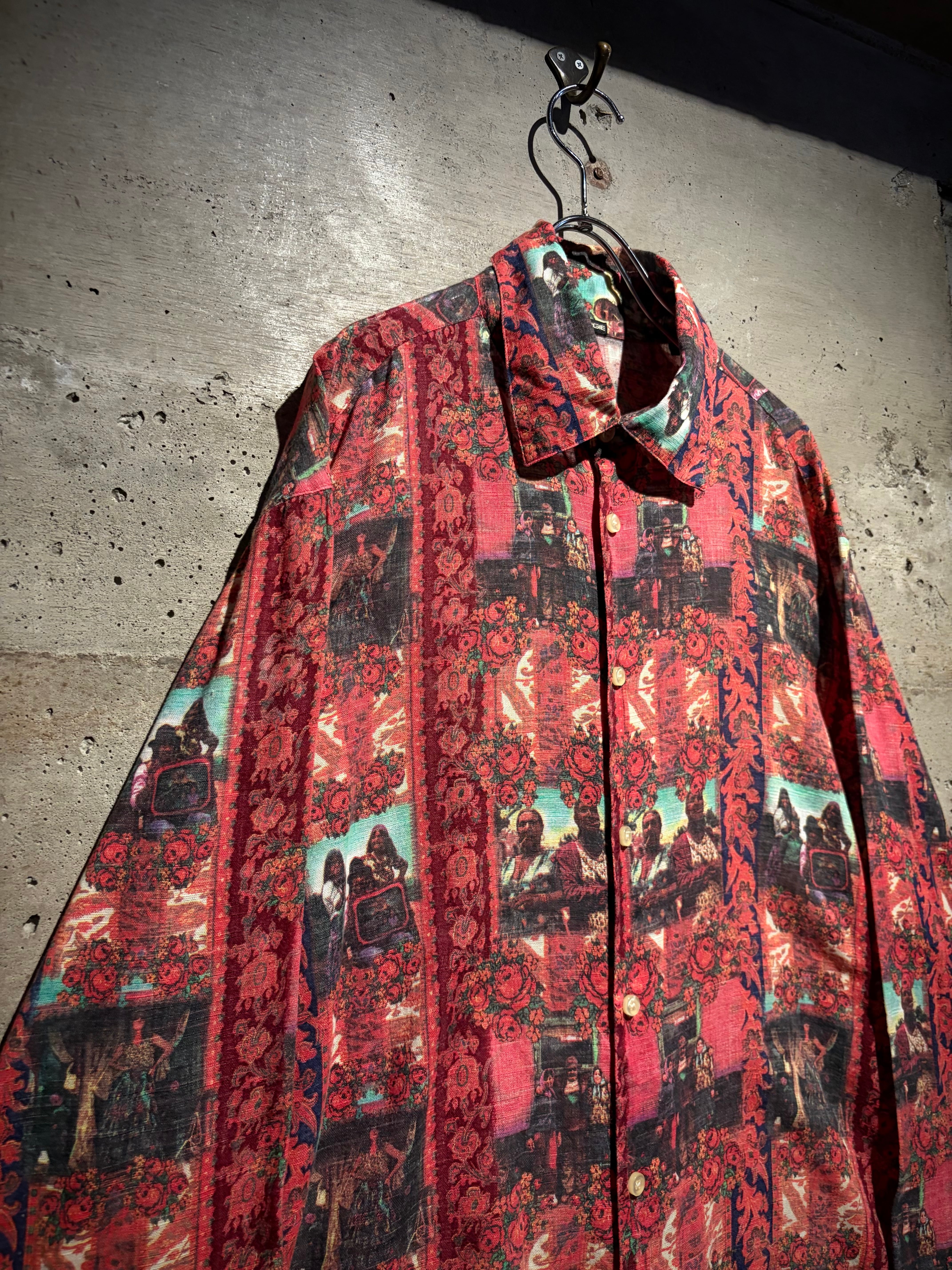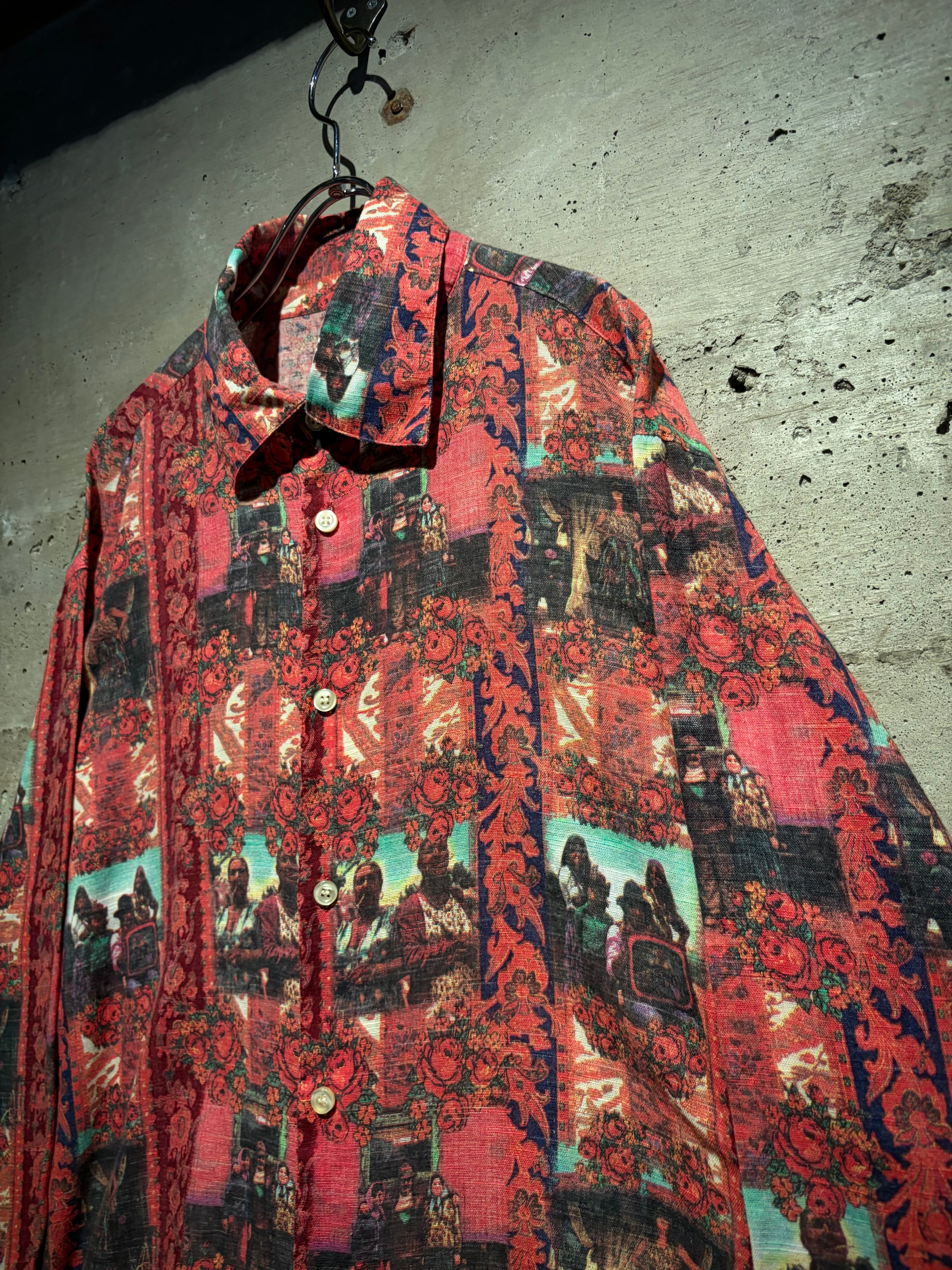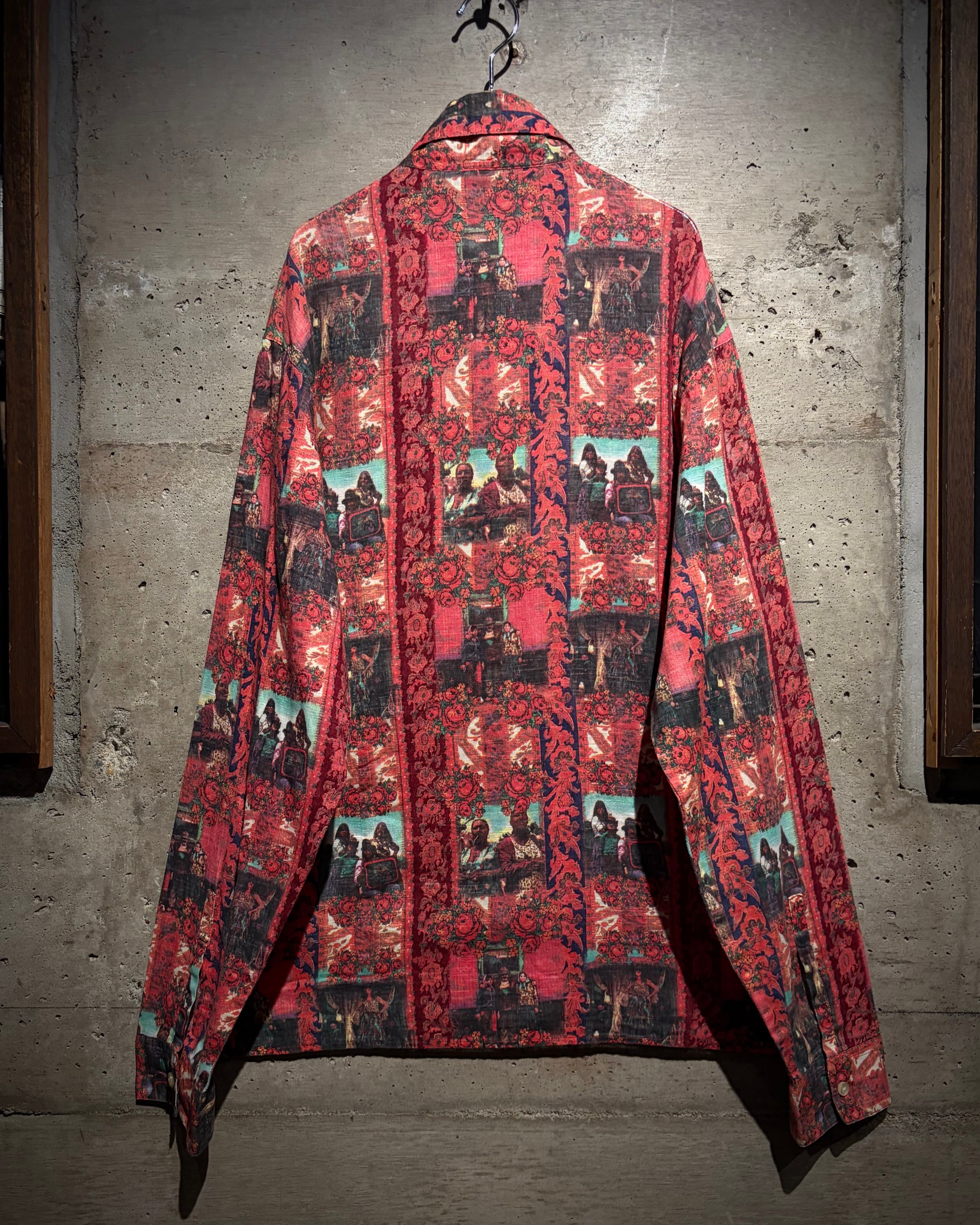 日常のワンシーンを切り取ったようなフォトグラフィックを全面に載せ、華やかなフラワーモチーフや装飾的なパターンを重ねたデザインが印象的な1着。