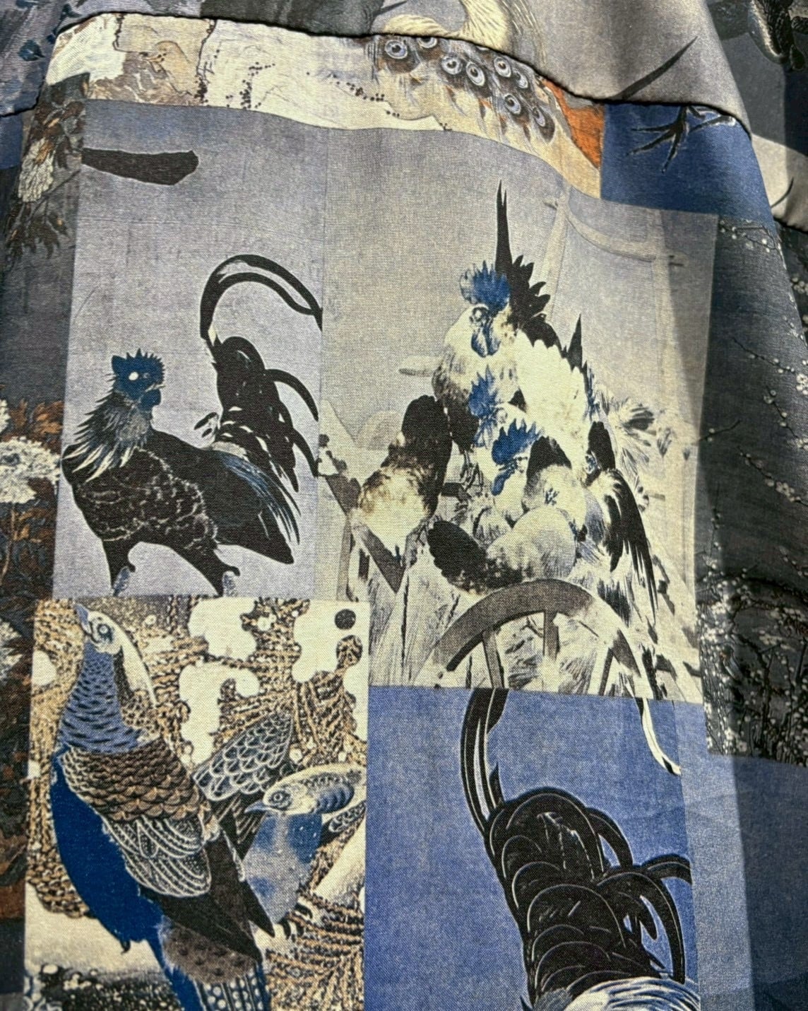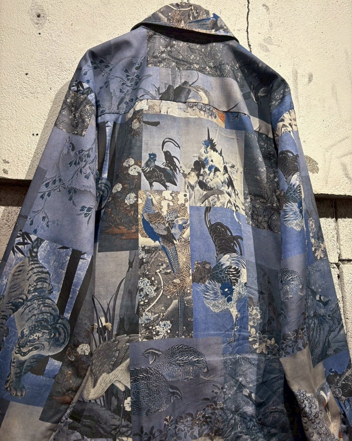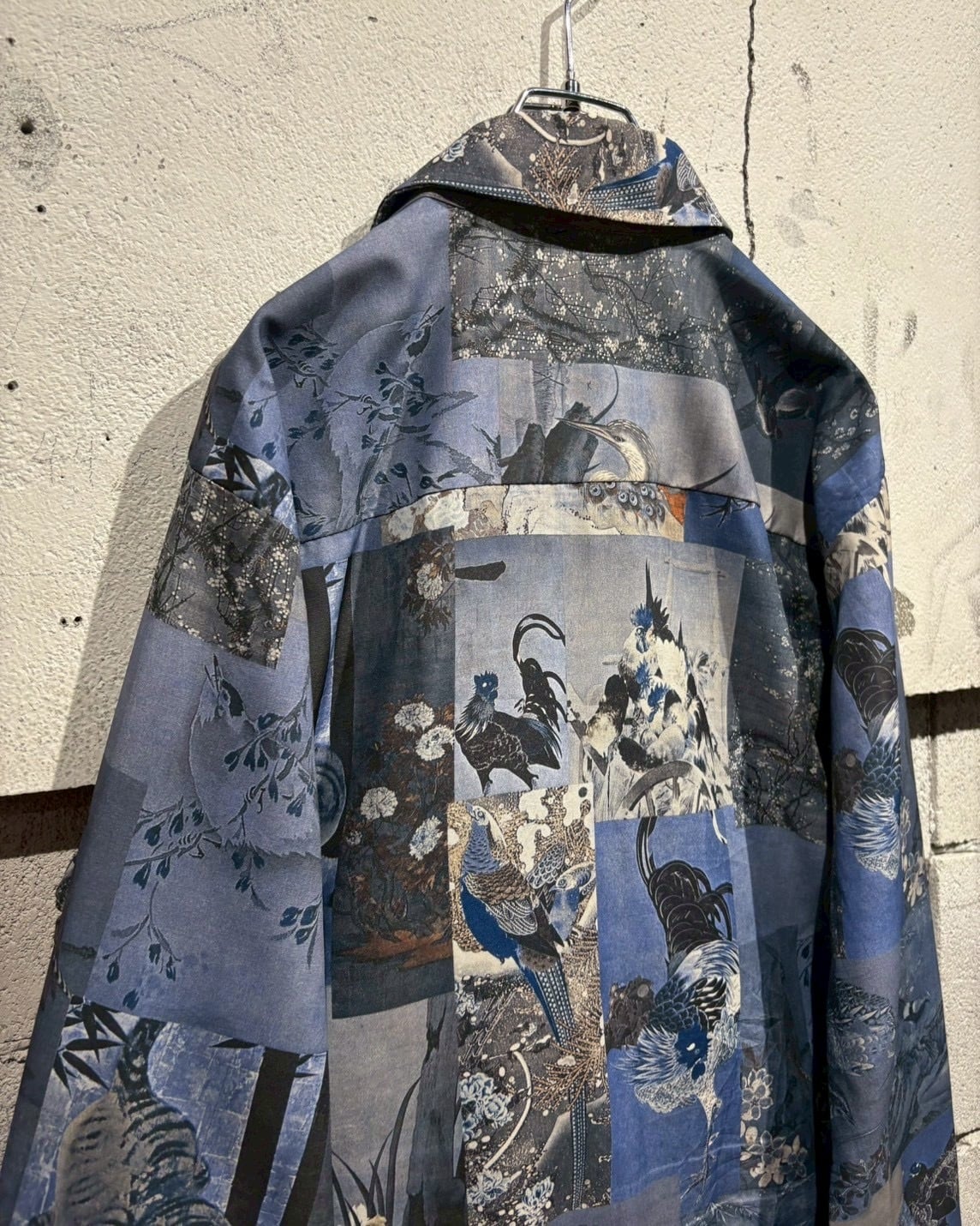 鳥や虎、草花といったオリエンタルな図案を転写プリントで表現することで、奥行きのあるグラフィックを構築し、唯一無二の存在感を演出。ブルーベースで統一された落ち着きのある配色も相まって、派手さの中に品の良さを感じさせる仕上がりに。