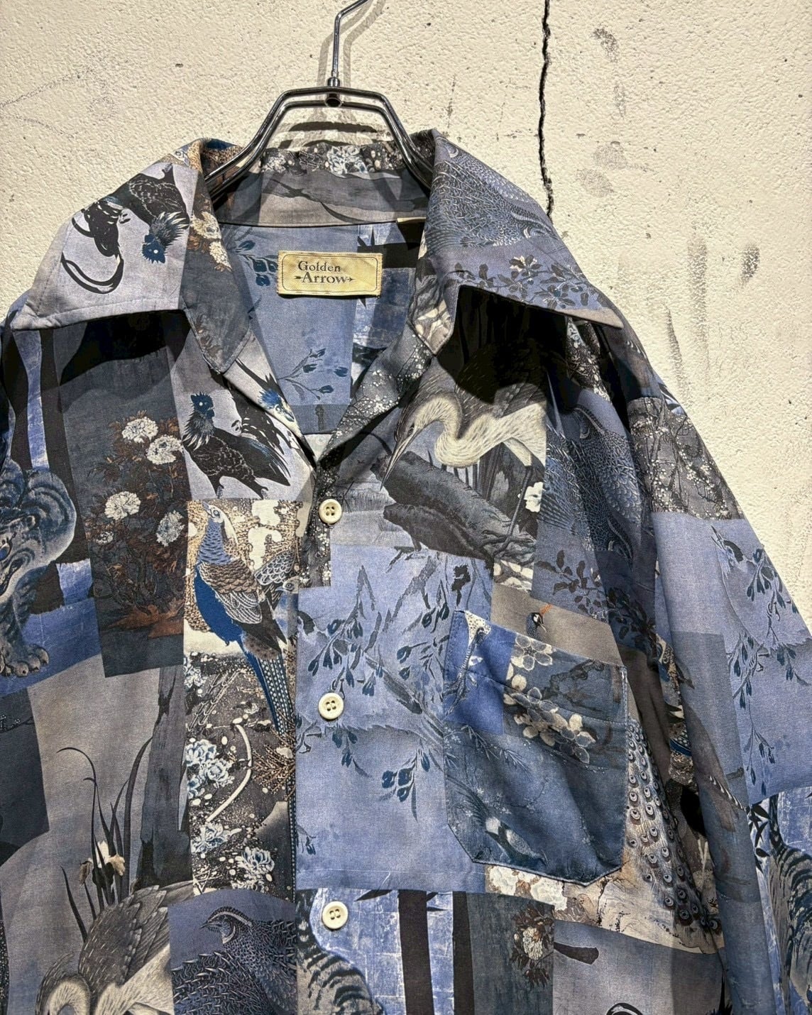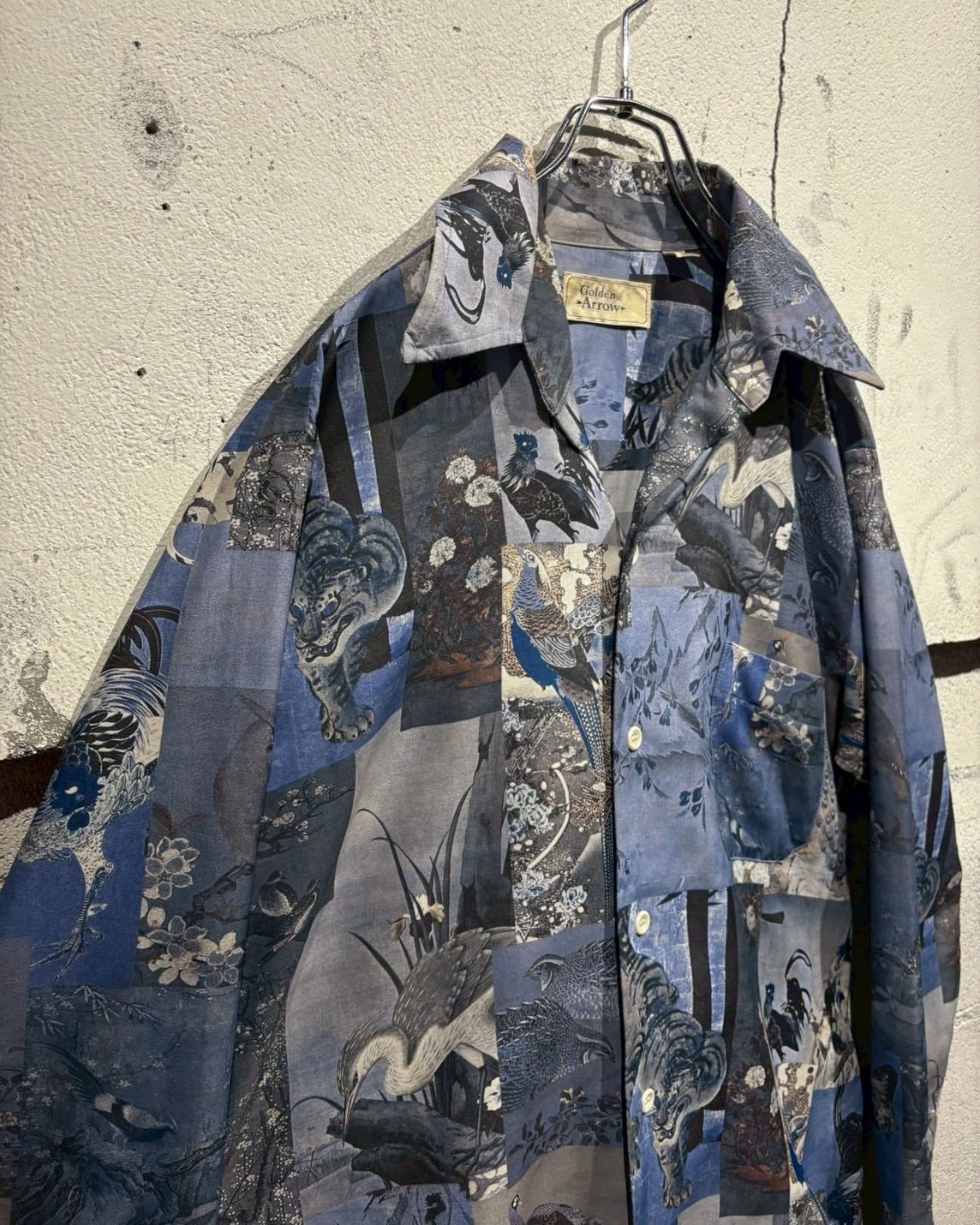 70’s Golden Arrowより、ボディ全面にパネル状で和のモチーフが配された、転写プリントシャツ。