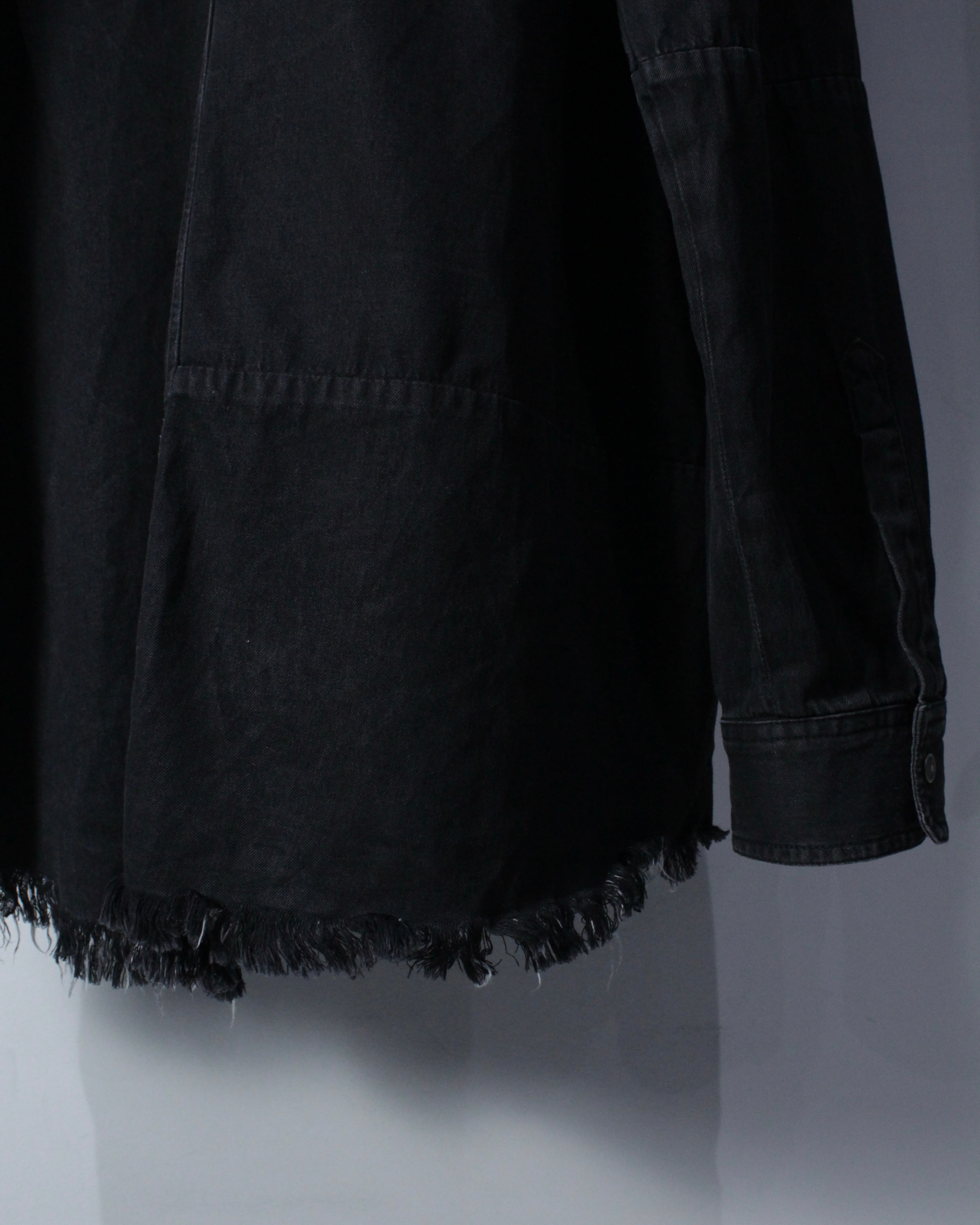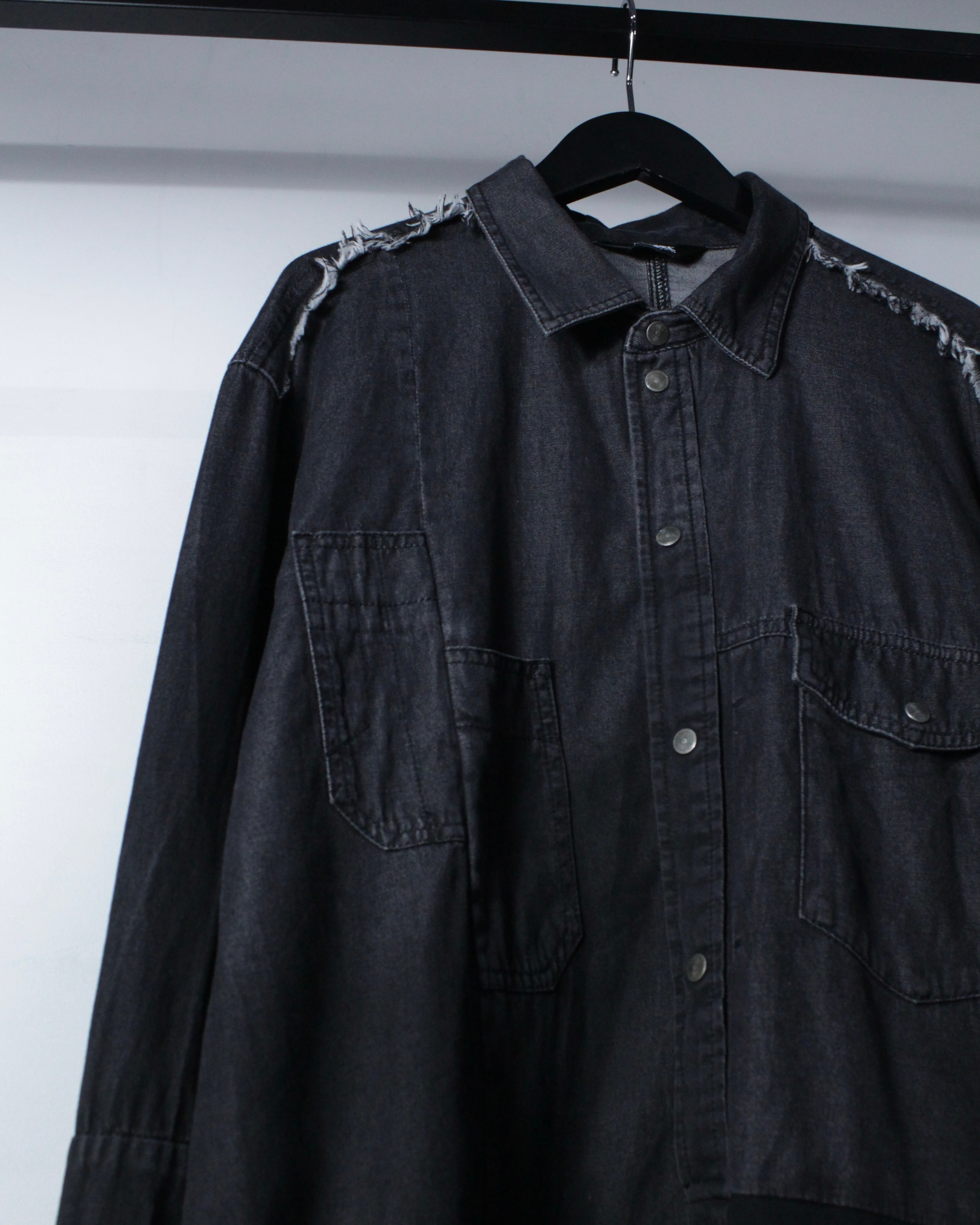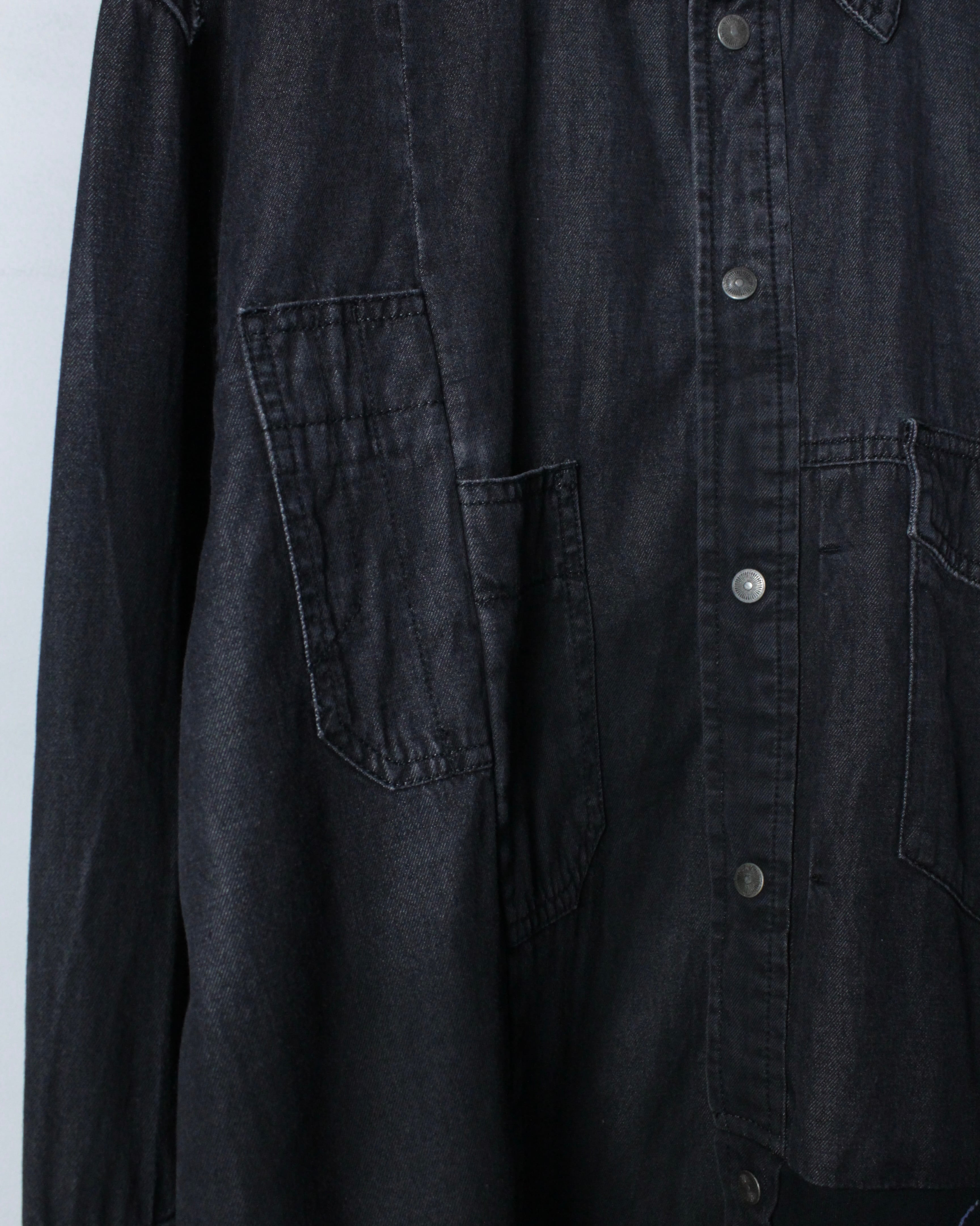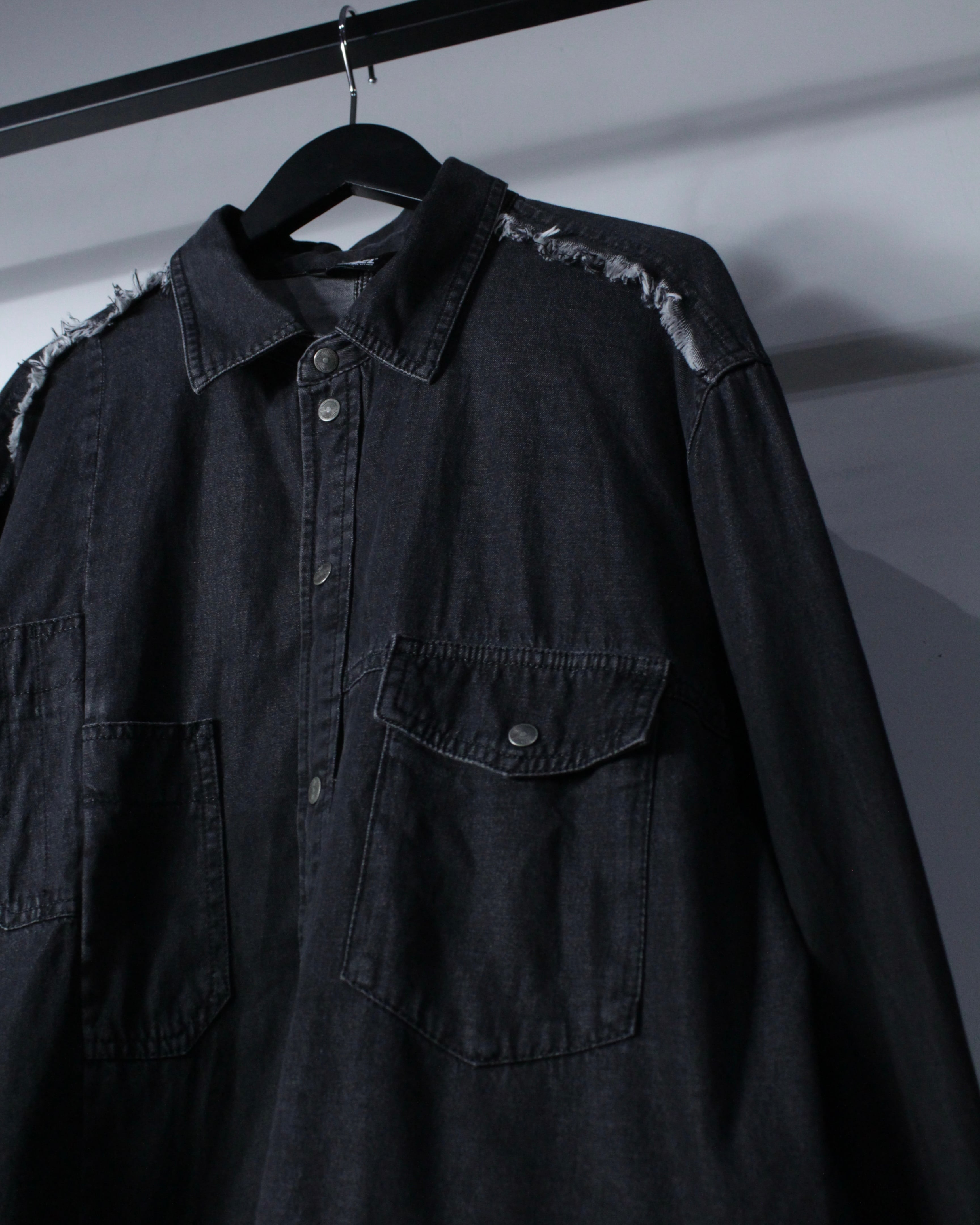 ブラックデニムをベースに、フェード感を帯びた退廃的な風合いが魅力の一着。タフなデニム生地でありながら、着込まれたような柔らかさと奥行きのある色落ちが共存し、無骨さと洗練を兼ね備えた仕上がりとなっています。