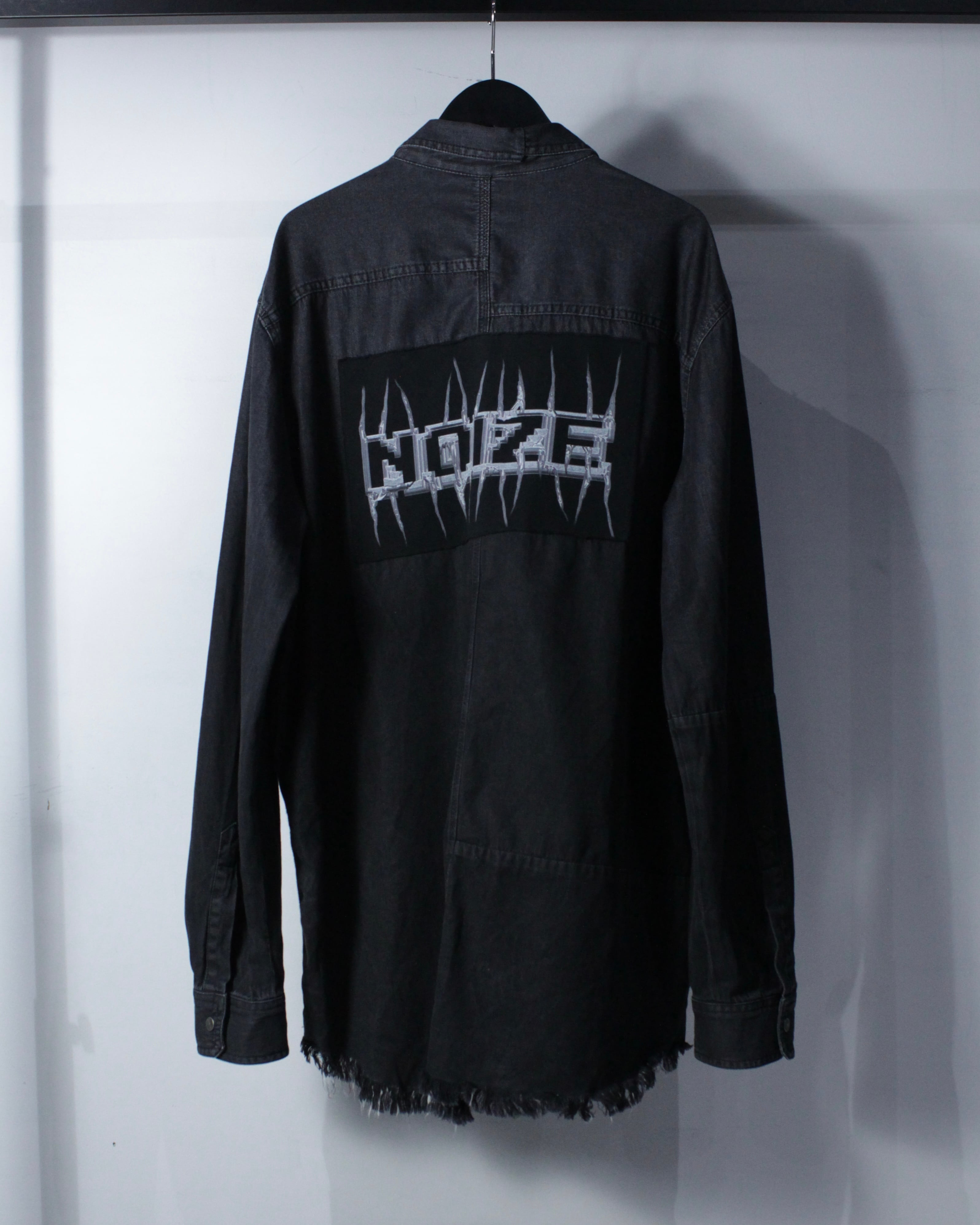 フロントはミニマルなボタン仕様に、左右のフラップポケットを配置した王道のワークディテール。肩部分には大胆なダメージ加工を施し、ラフさを演出しつつ、裾はカットオフ仕様でブランドらしいグランジ感をプラス。さらに裾部分にはグリッチ調の人物グラフィック、バックにはインパクトのあるロゴプリントを落とし込み、視覚的なインパクトも抜群です。