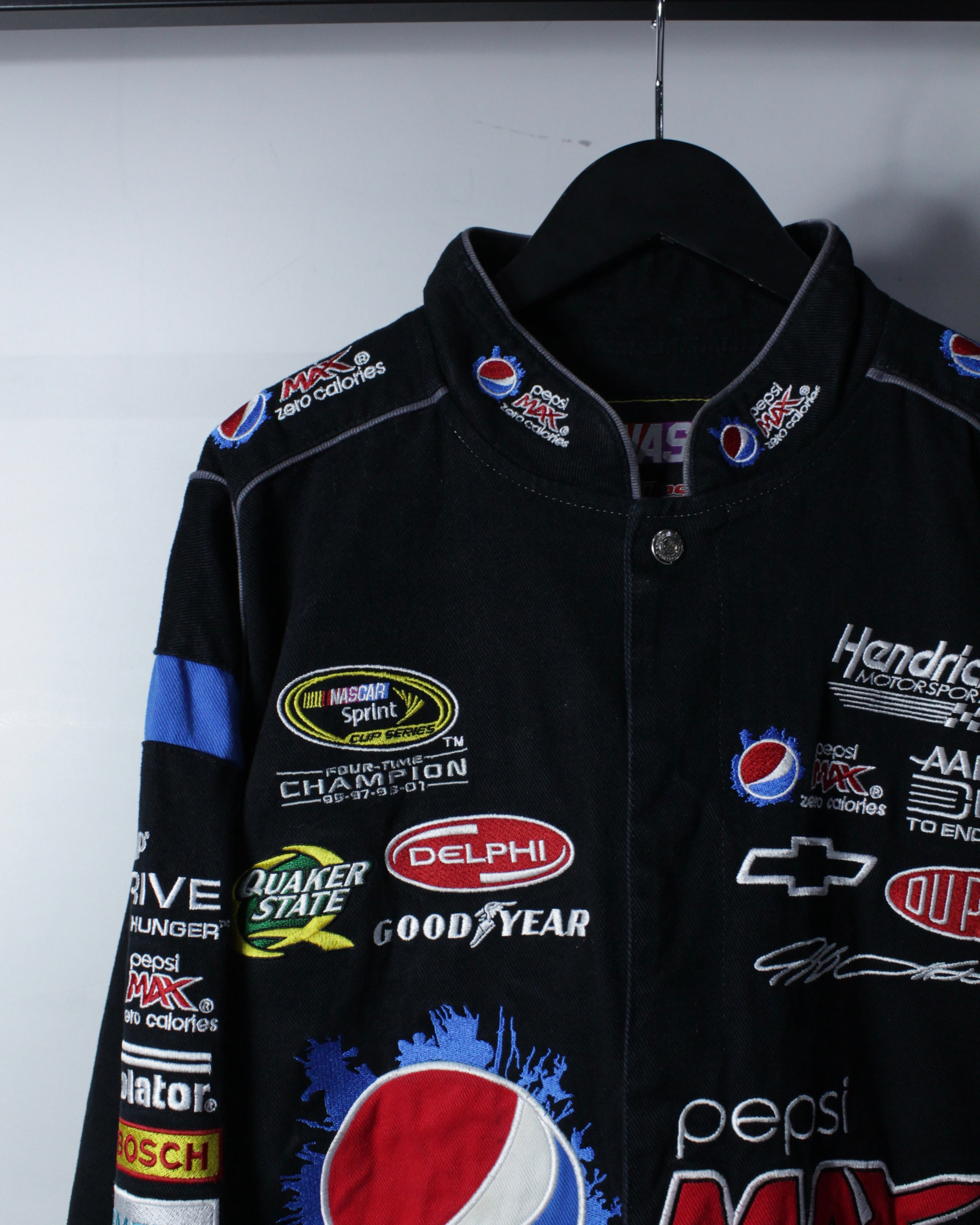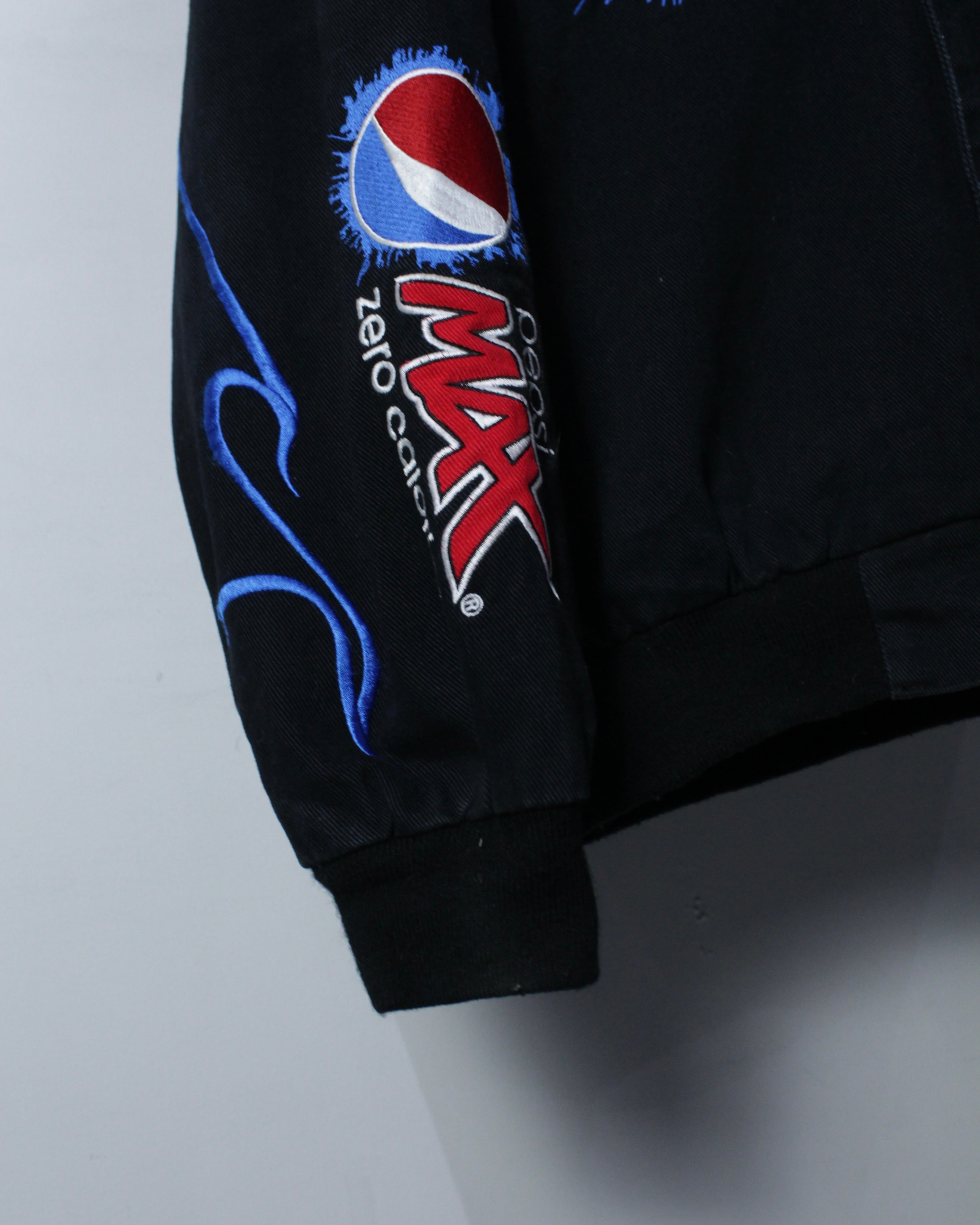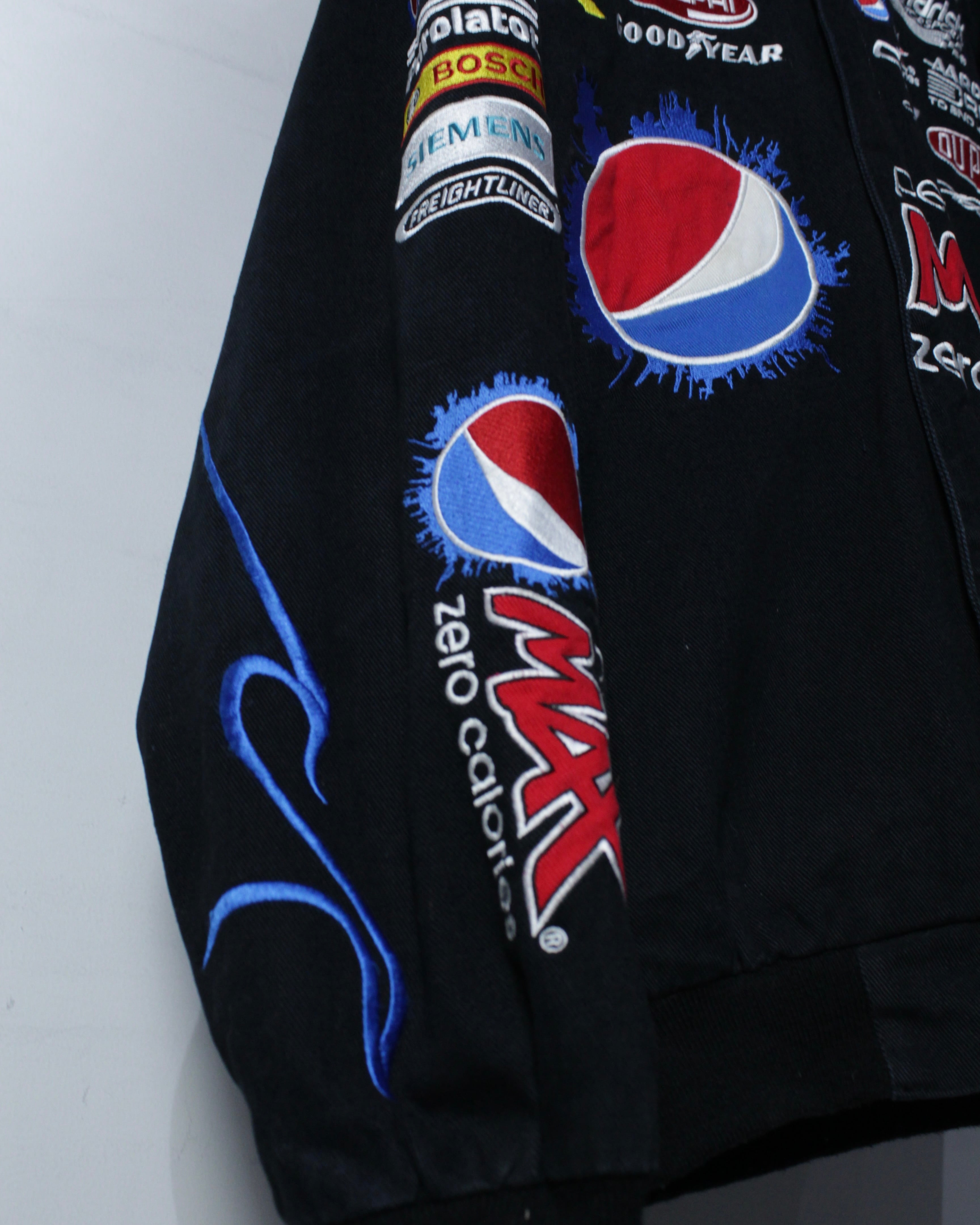 ブラックボディをベースに、Pepsi MAXをはじめとするスポンサーロゴを全面に落とし込んだ、圧倒的存在感を誇る一着。肉厚でタフなポリエステルボディに、発色の良い刺繍とワッペンを多用し、レーシングカルチャー特有のスピード感と無骨さを体現しています。