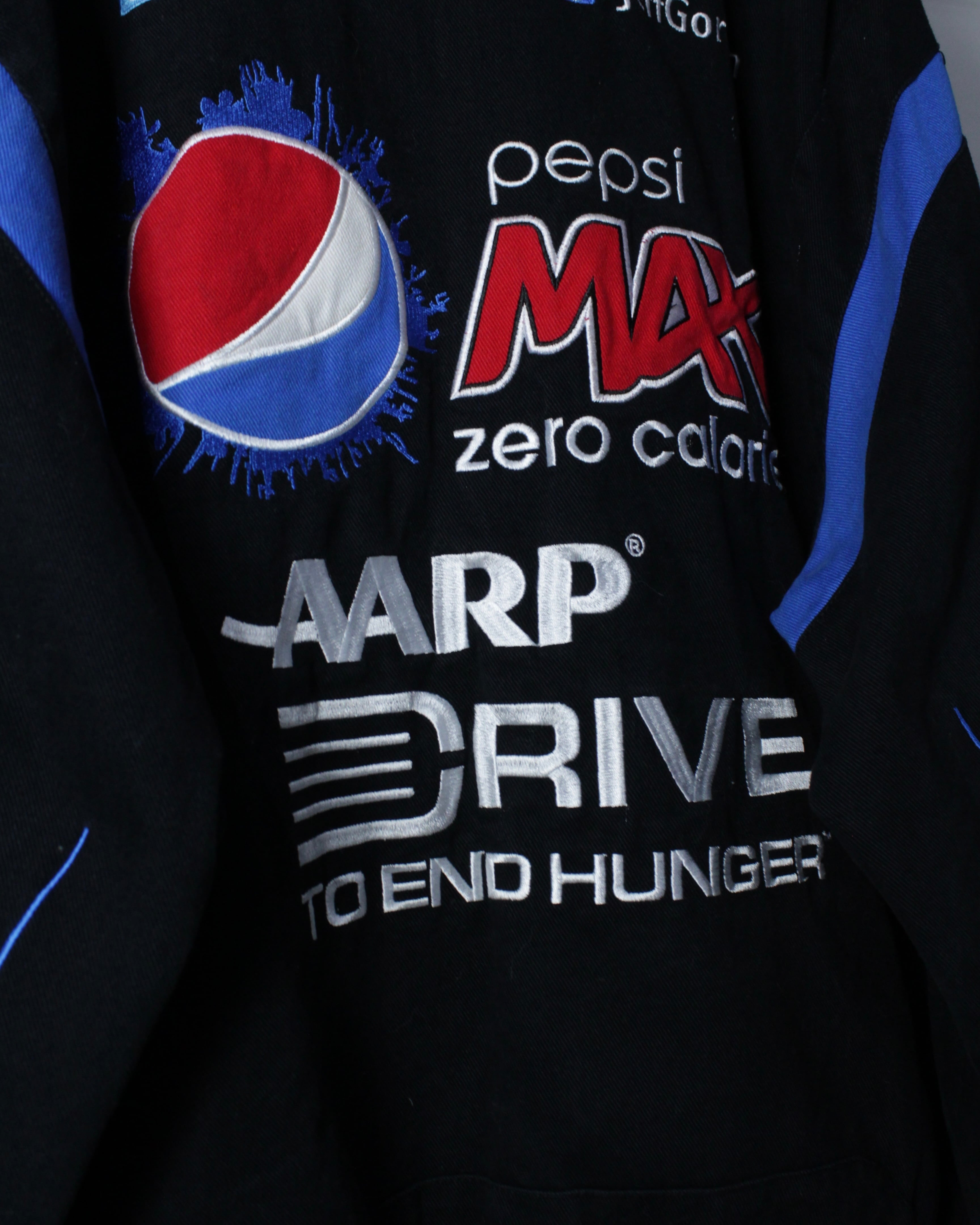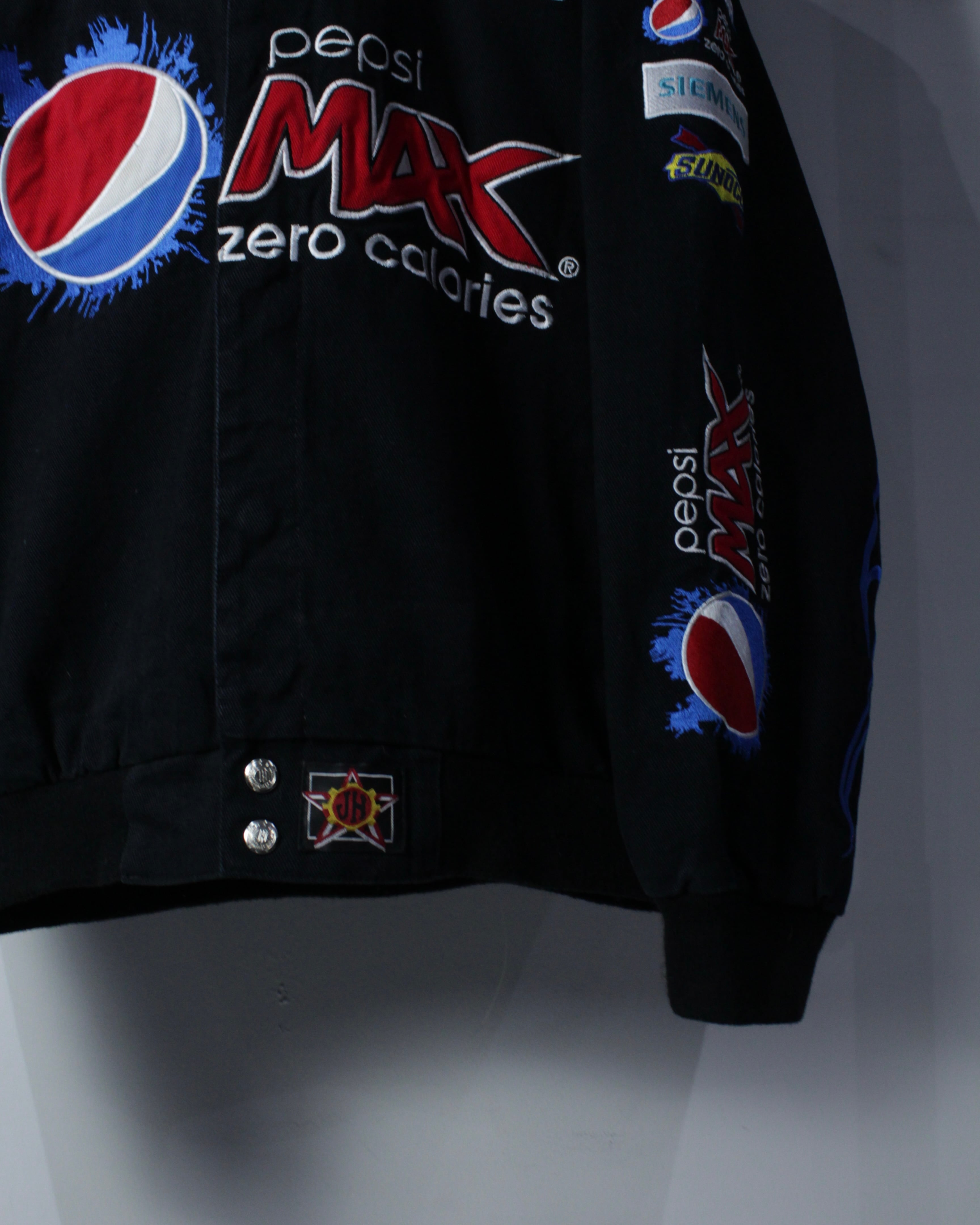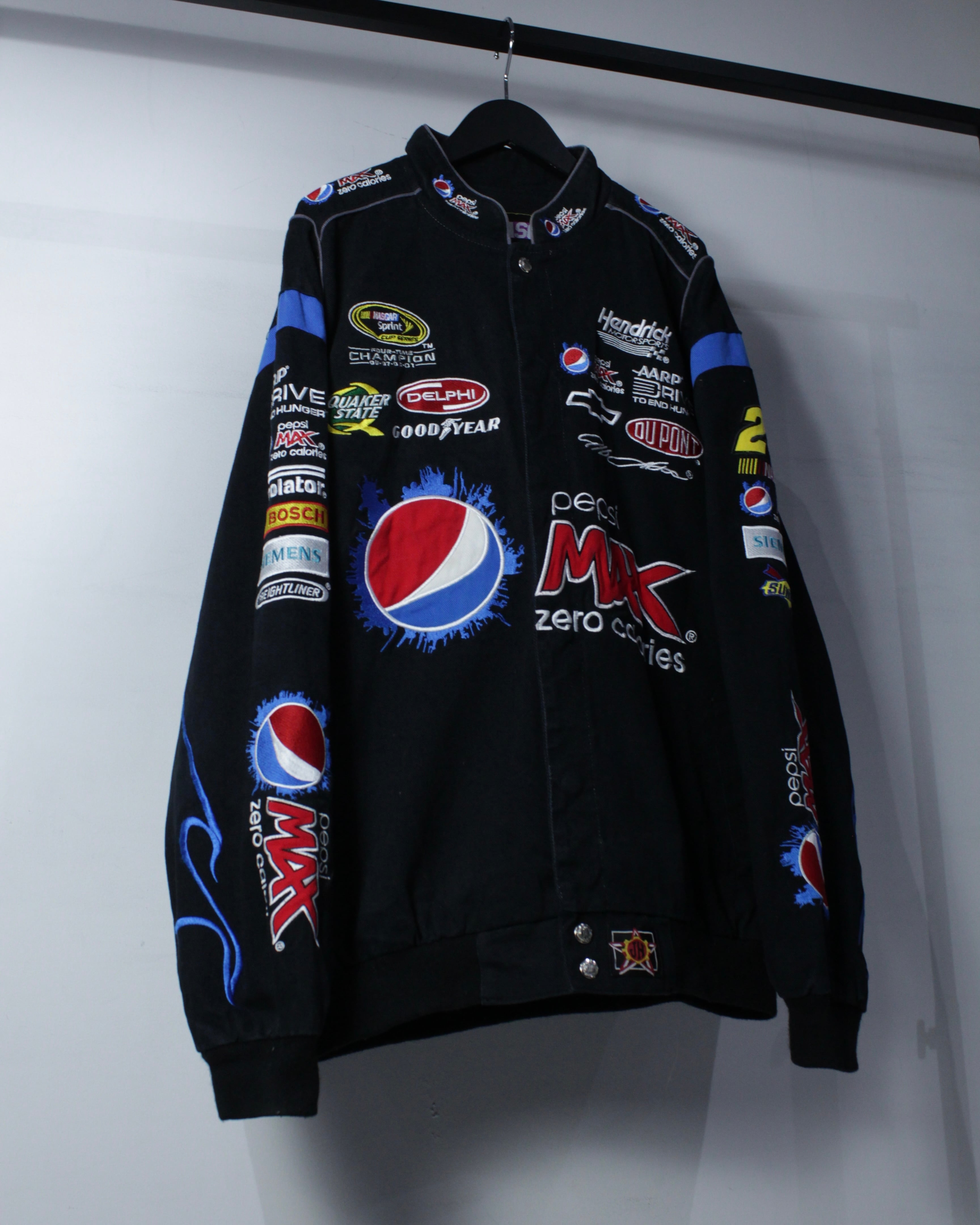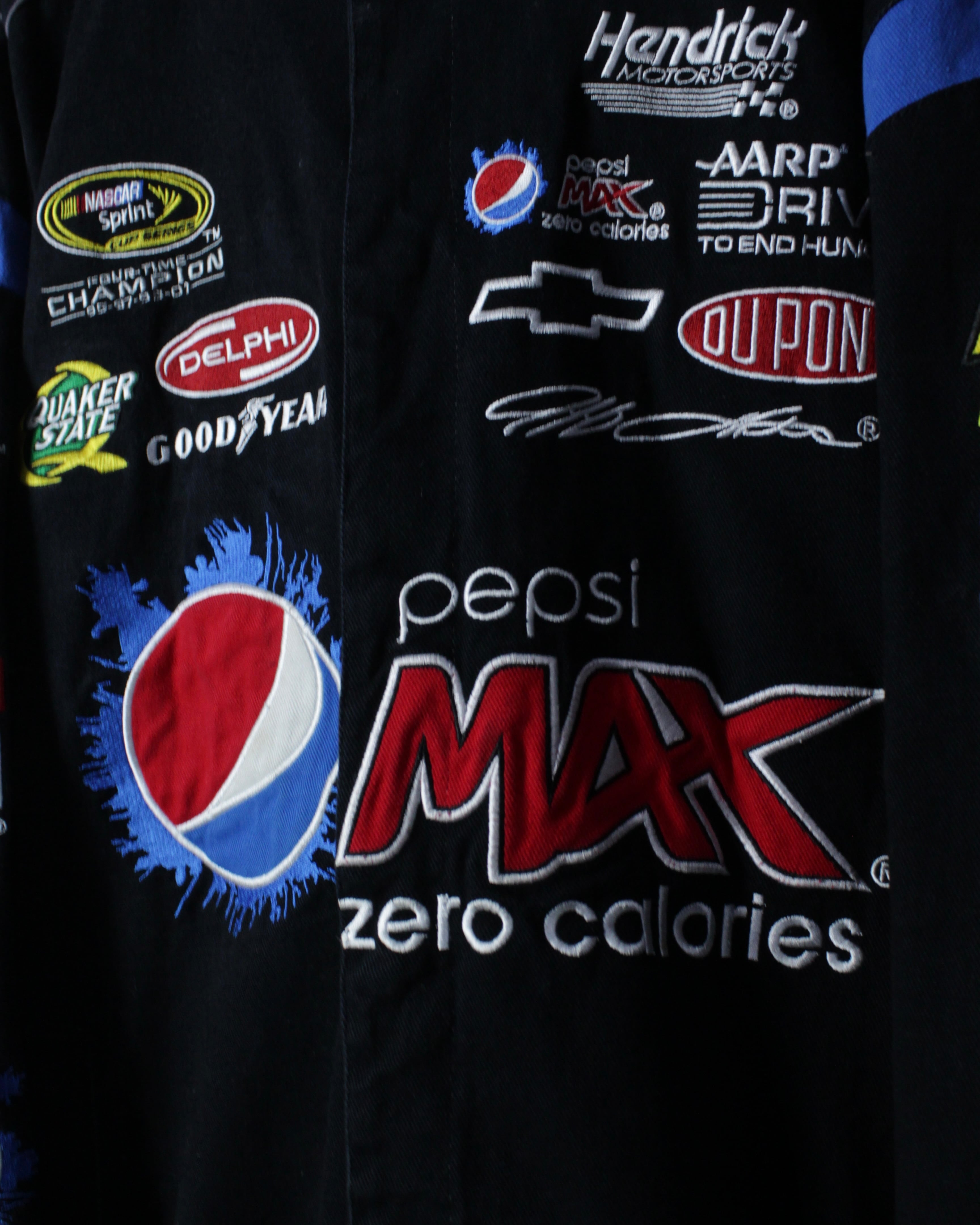 ブラックボディをベースに、Pepsi MAXをはじめとするスポンサーロゴを全面に落とし込んだ、圧倒的存在感を誇る一着。肉厚でタフなポリエステルボディに、発色の良い刺繍とワッペンを多用し、レーシングカルチャー特有のスピード感と無骨さを体現しています。