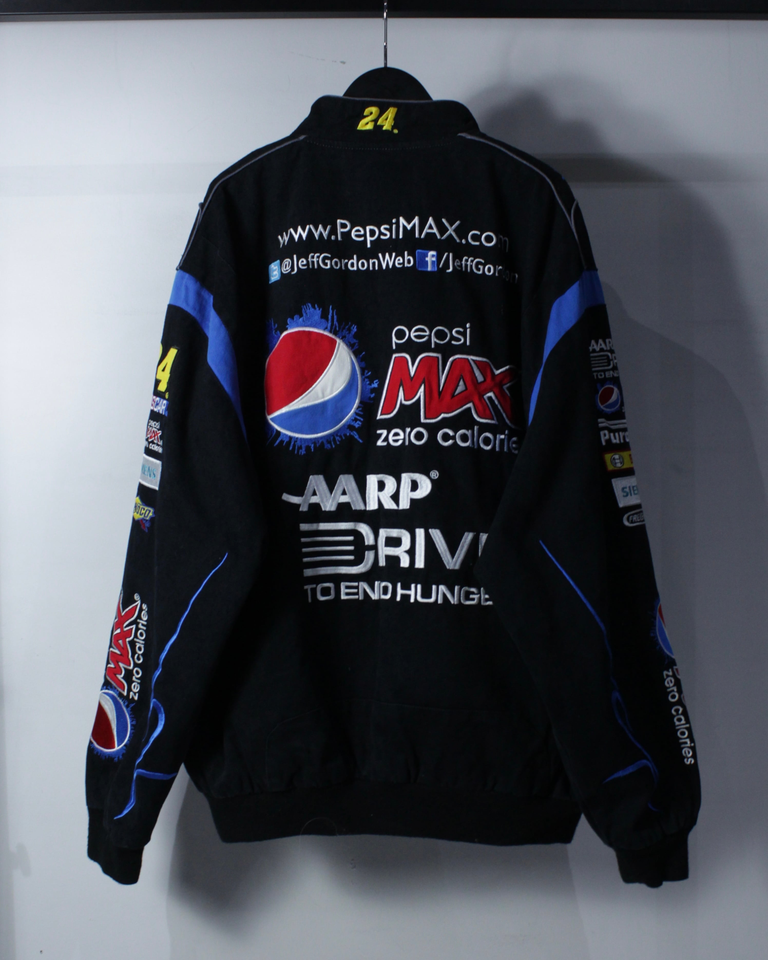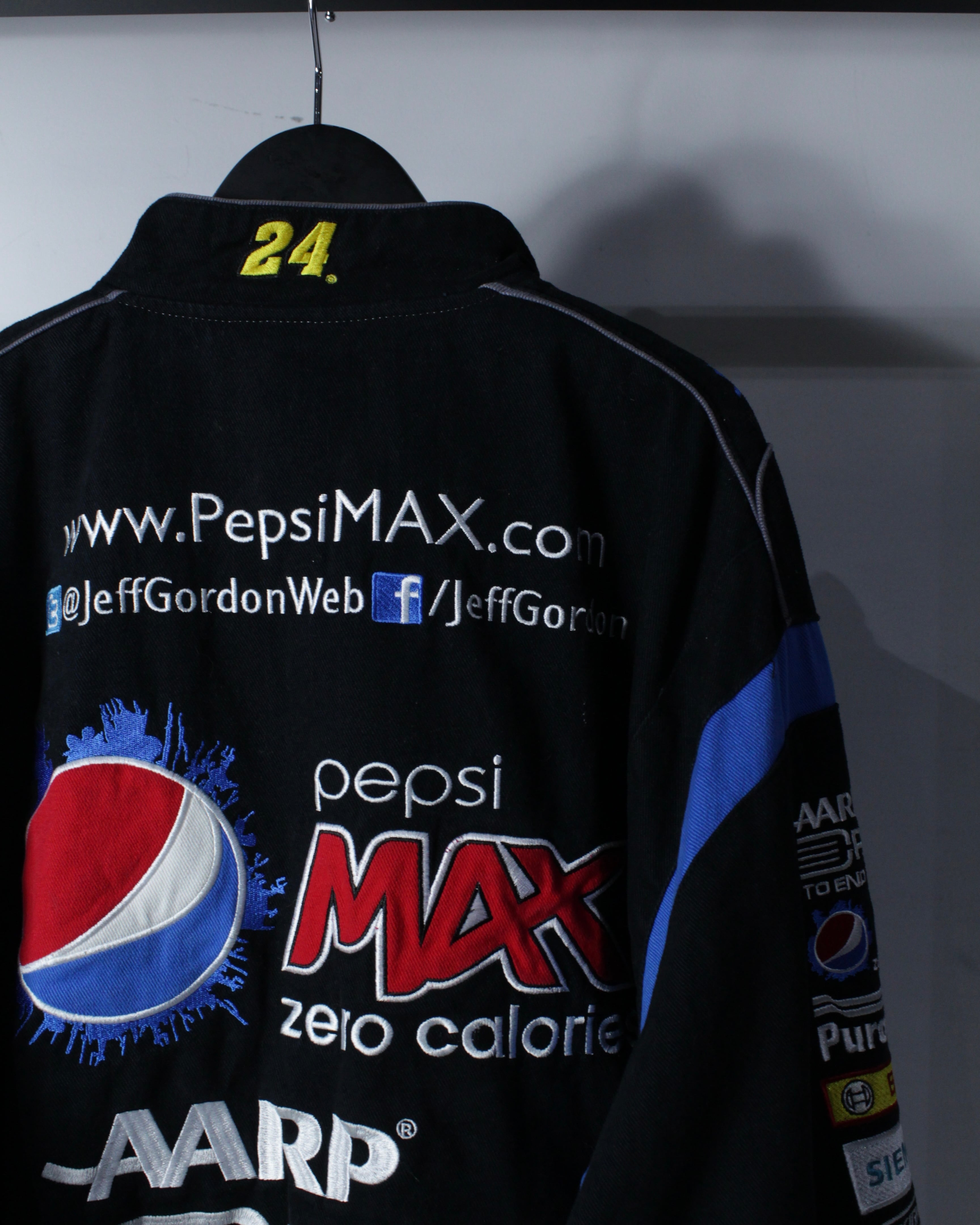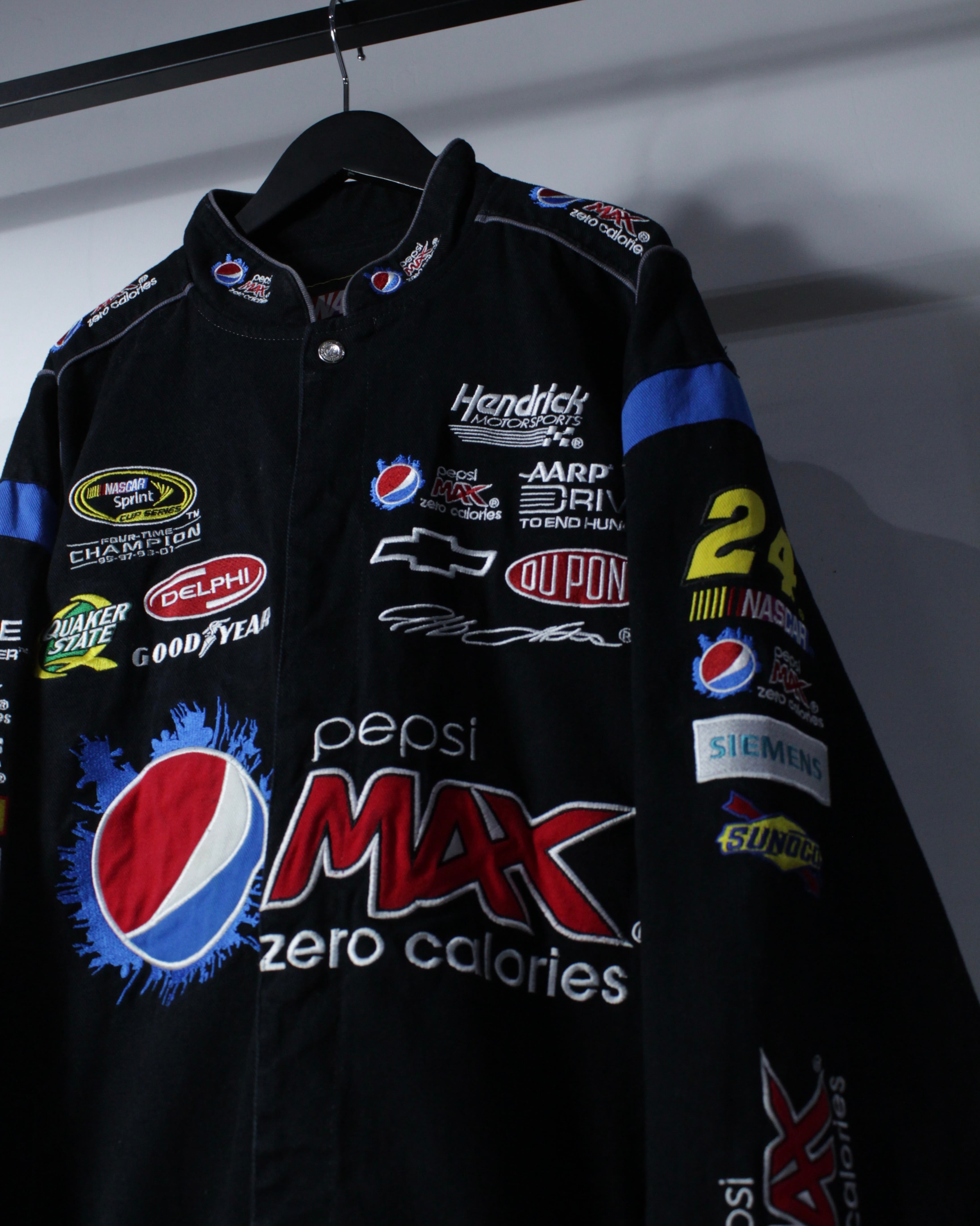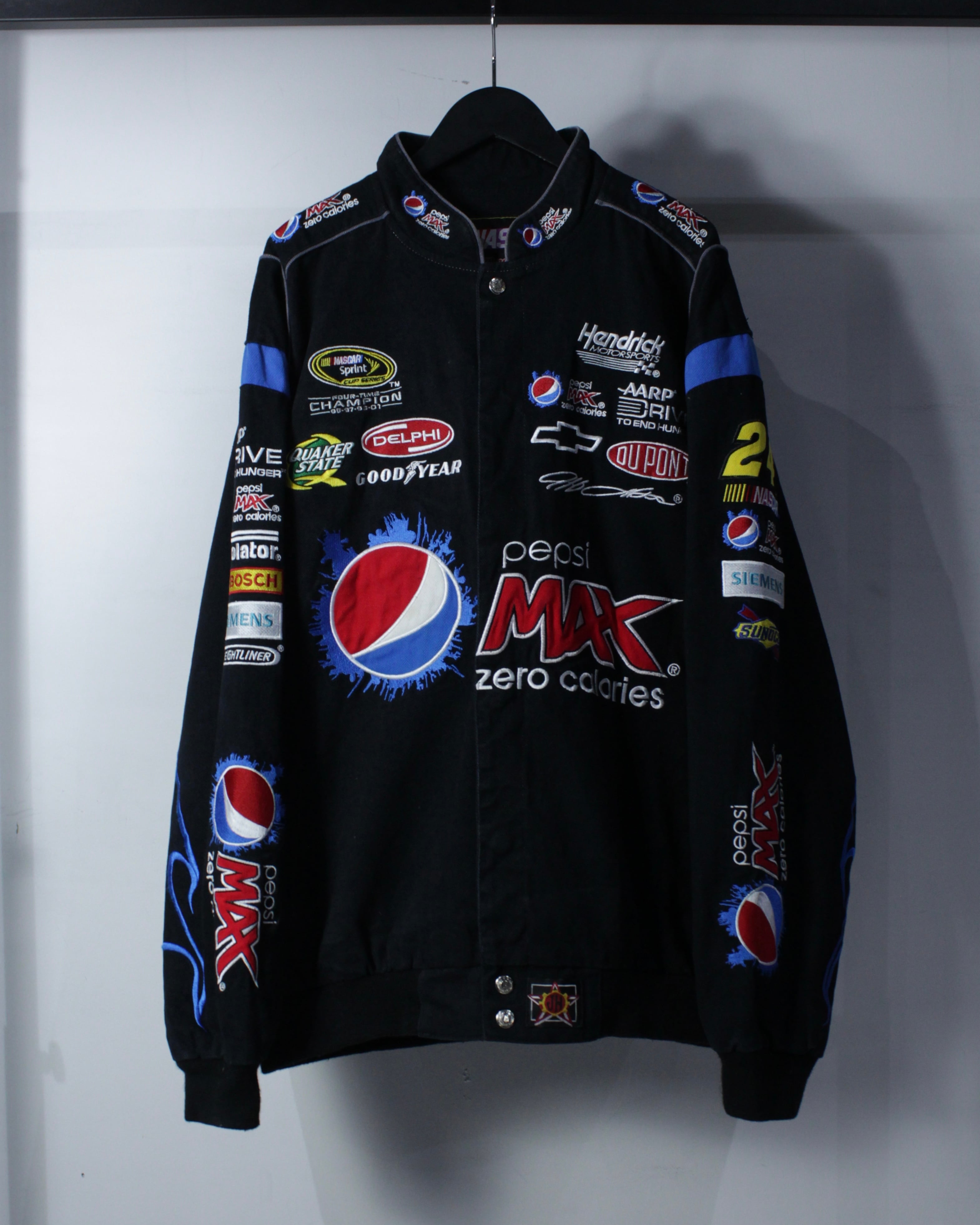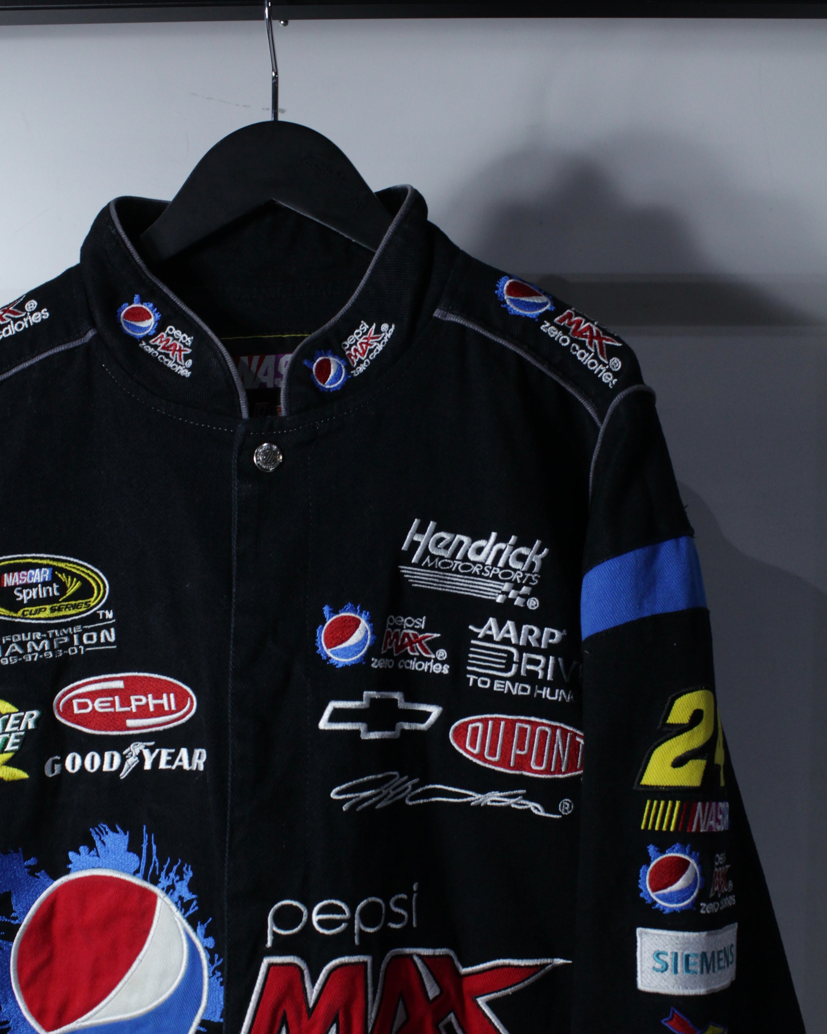 フロントにはHendrick MotorsportsやGoodyear、DUPONTなどの企業ロゴを贅沢に配置。袖やバックにも抜かりなくロゴが施され、どの角度から見ても成立する完成度の高さ。ネックにはナンバリング“24”の刺繍、バックには大判のPepsi MAXロゴとURLプリントが入り、実際のレーシングチームウェアさながらのディテールに仕上がっています。