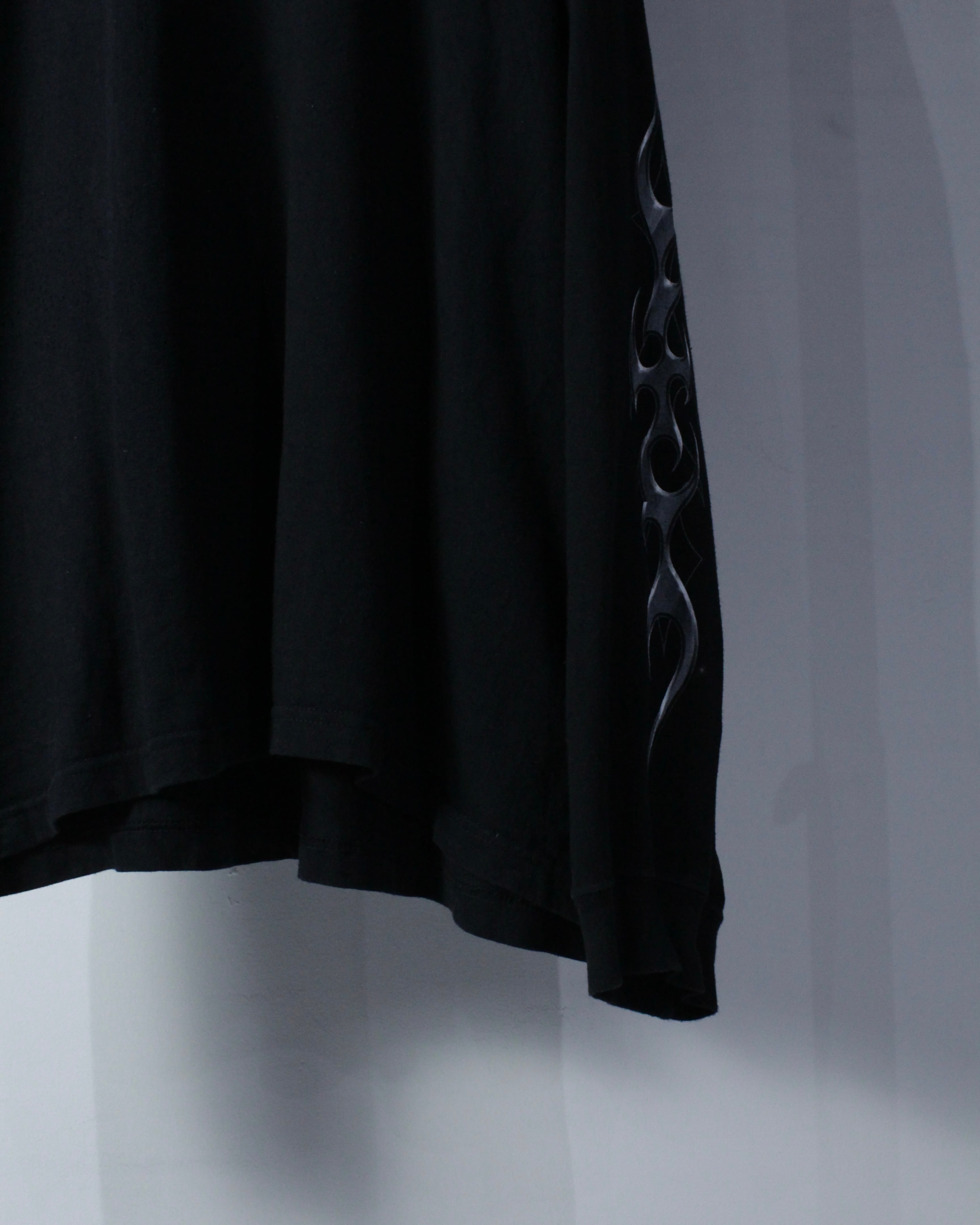 袖にはシルバーのフレイムパターンを走らせ、モーターカルチャーらしい無骨さとスピード感をプラス。シンプルな配色ながらも、細部にまで拘り抜かれたグラフィックワークが光る一着です。