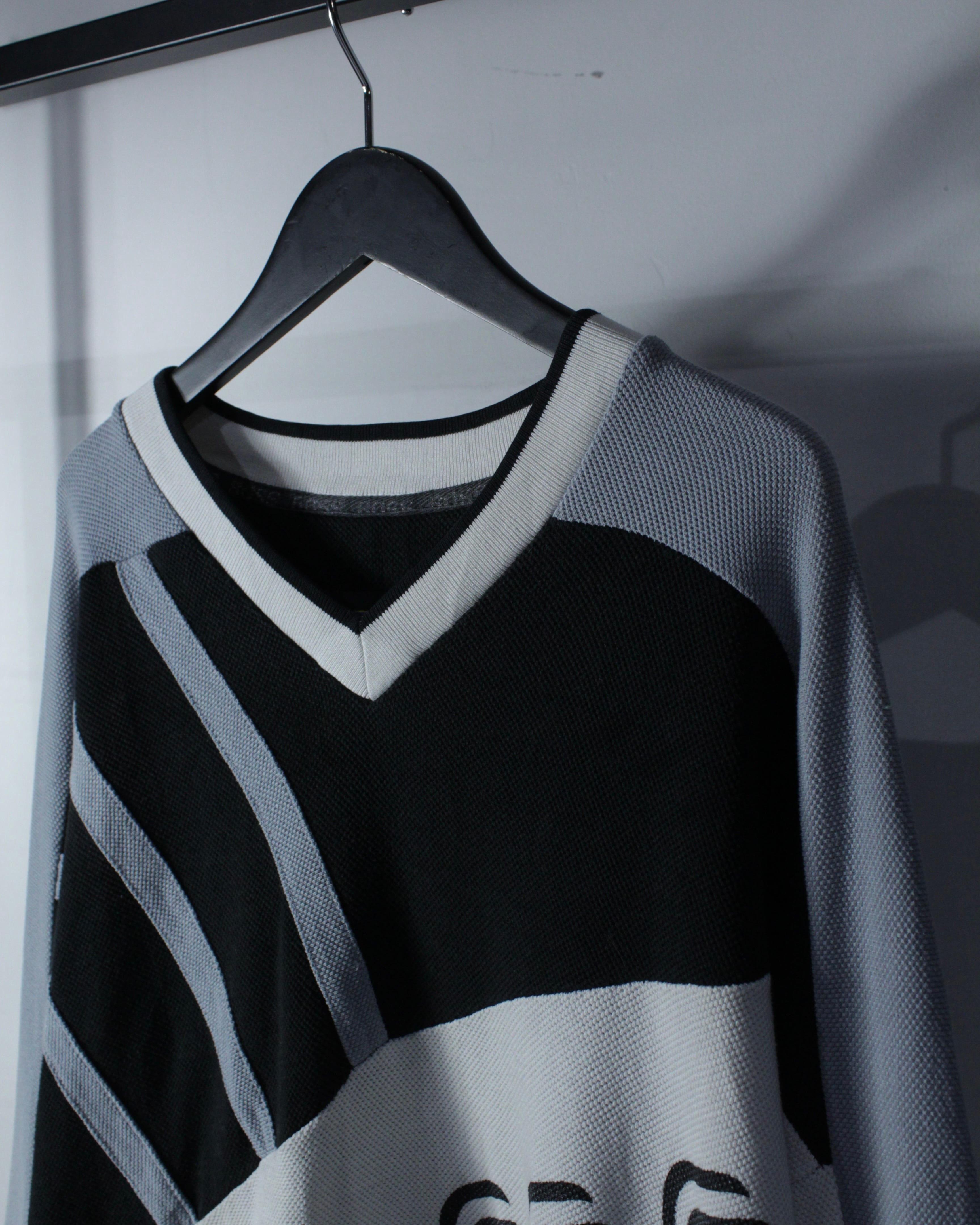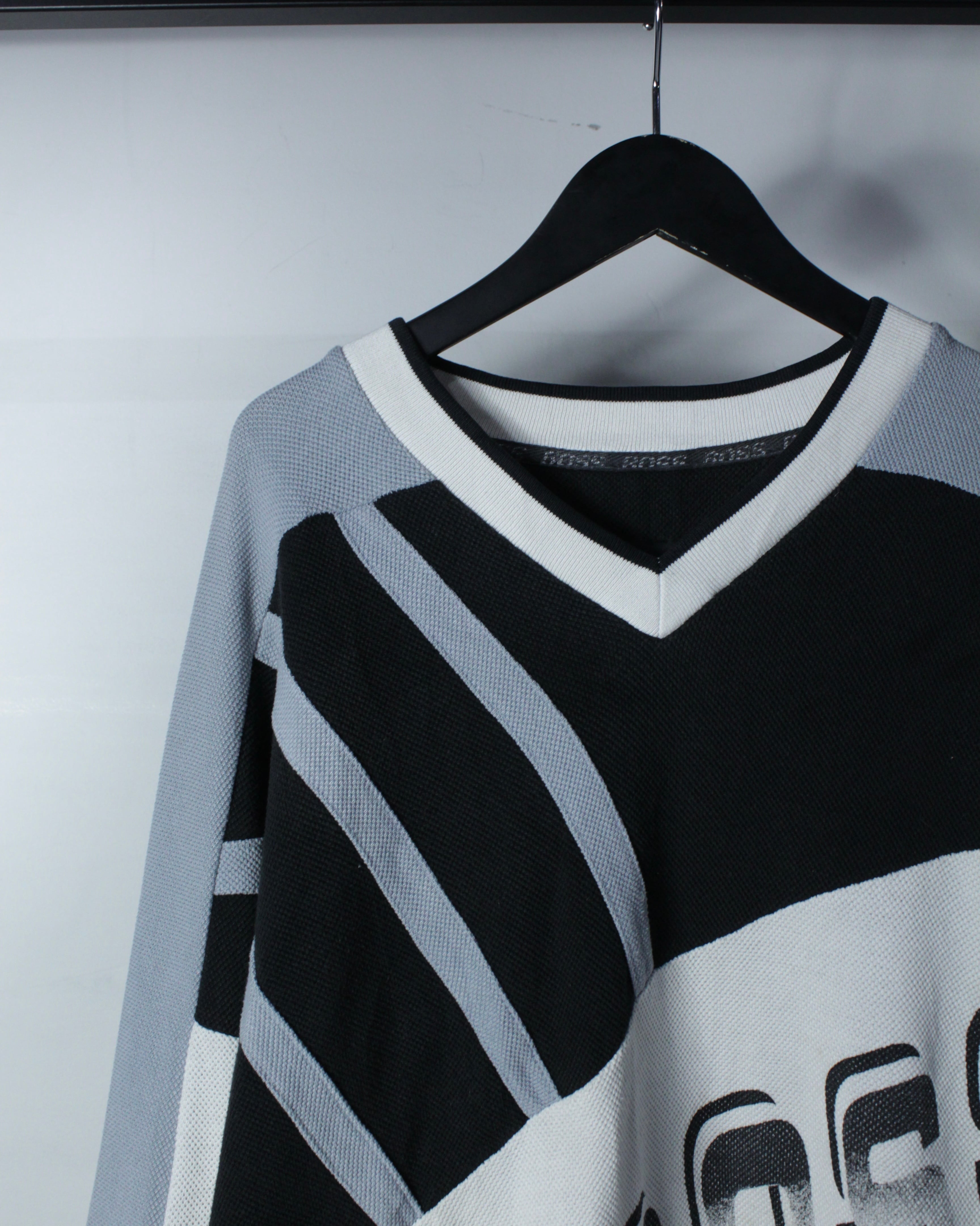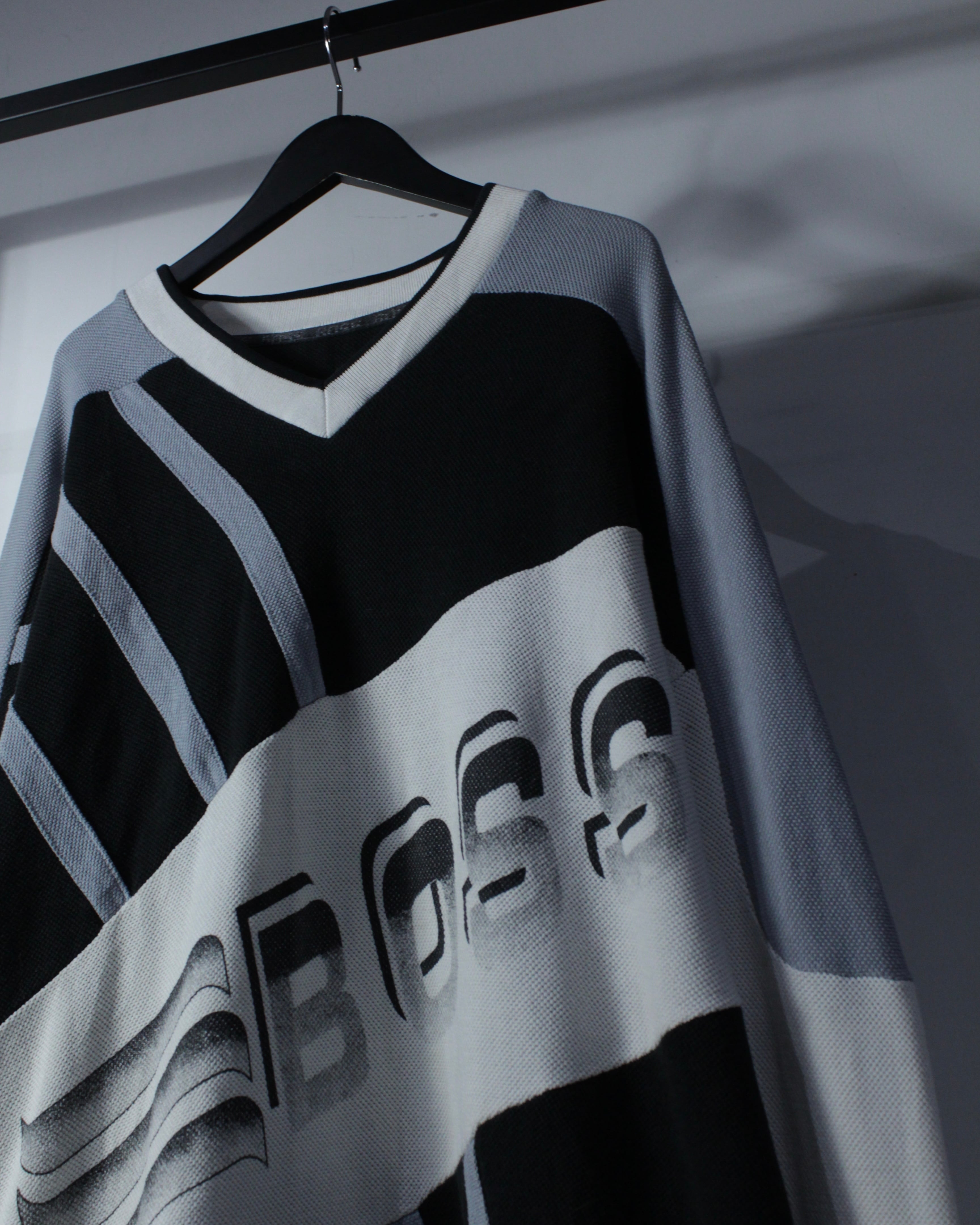 Vネック仕様や袖口のラインデザインも相まって、どこかゲームシャツを彷彿とさせるルックスも◎ ルーズなサイジングのため、デニムやカーゴ、ワイドパンツと合わせたストリートな着こなしにはもちろん、インナーを差し込んだレイヤードスタイルにも対応可能です。