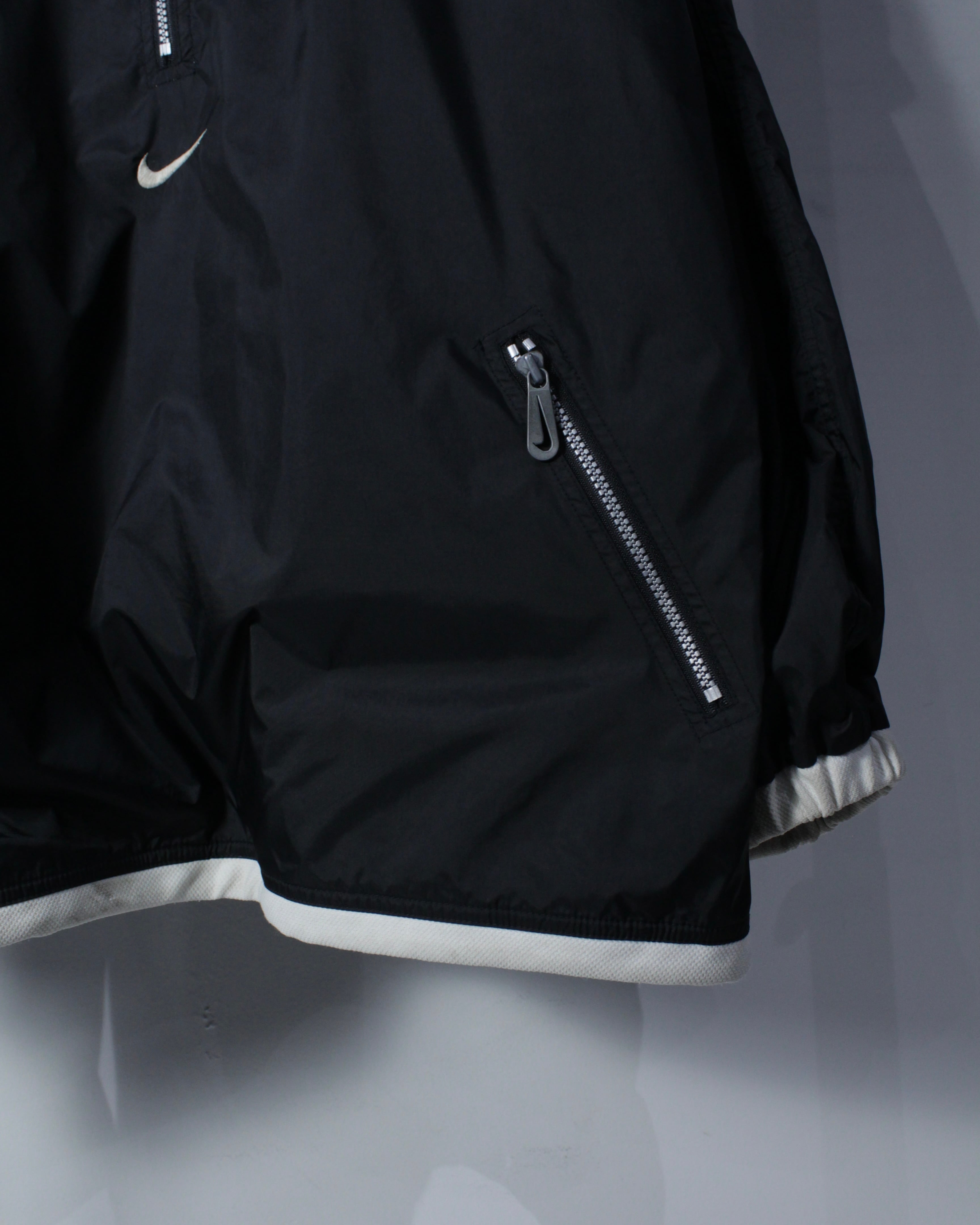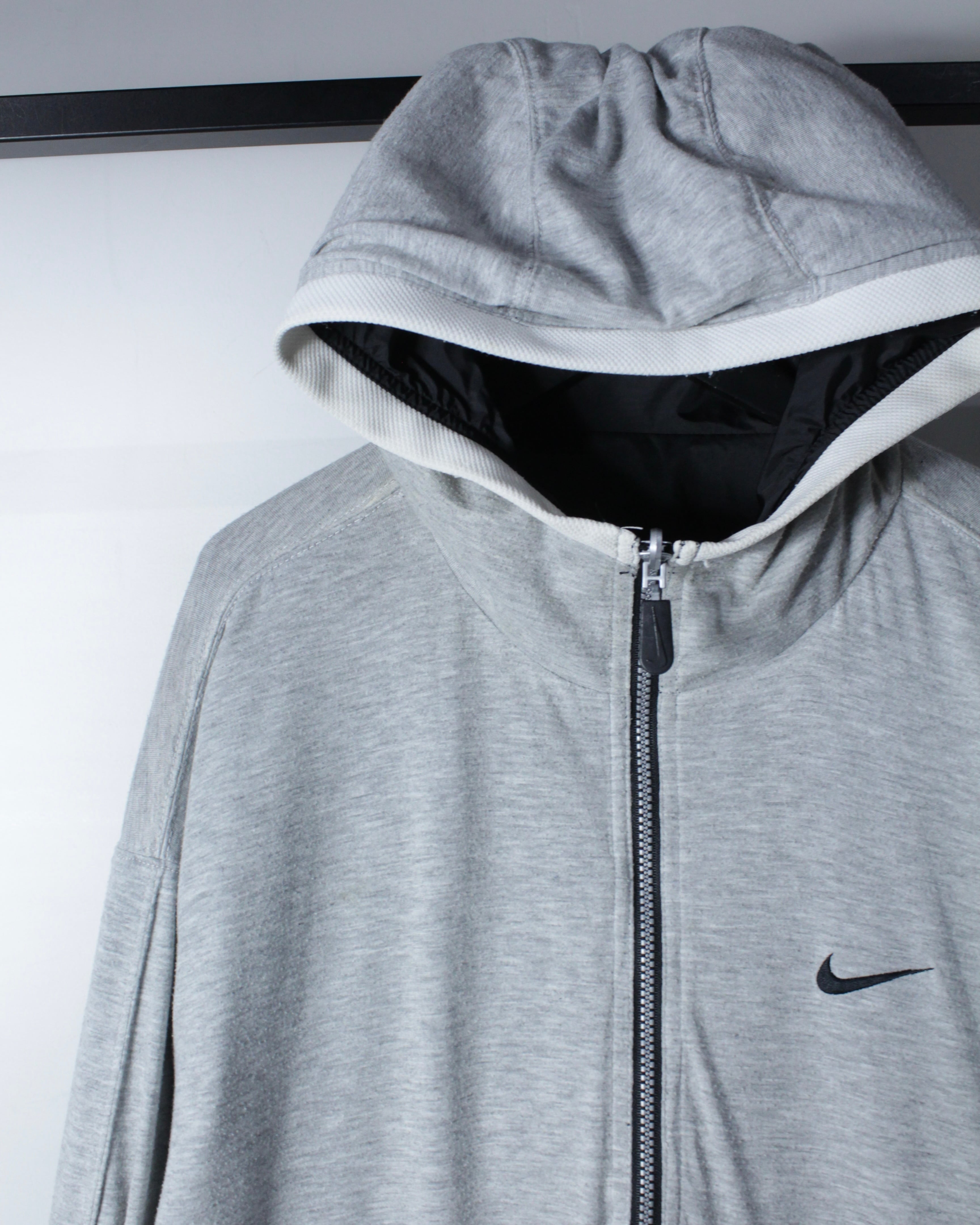 ブラックナイロンのシェルとグレースウェットのコンビネーションにより構成されたリバーシブル仕様。片面はマットな質感のナイロンボディにミニスウッシュを配したシンプルかつ洗練された表情、もう片面は柔らかなスウェット地でカジュアルな雰囲気を演出できる、二面性を楽しめる一着となっております。
