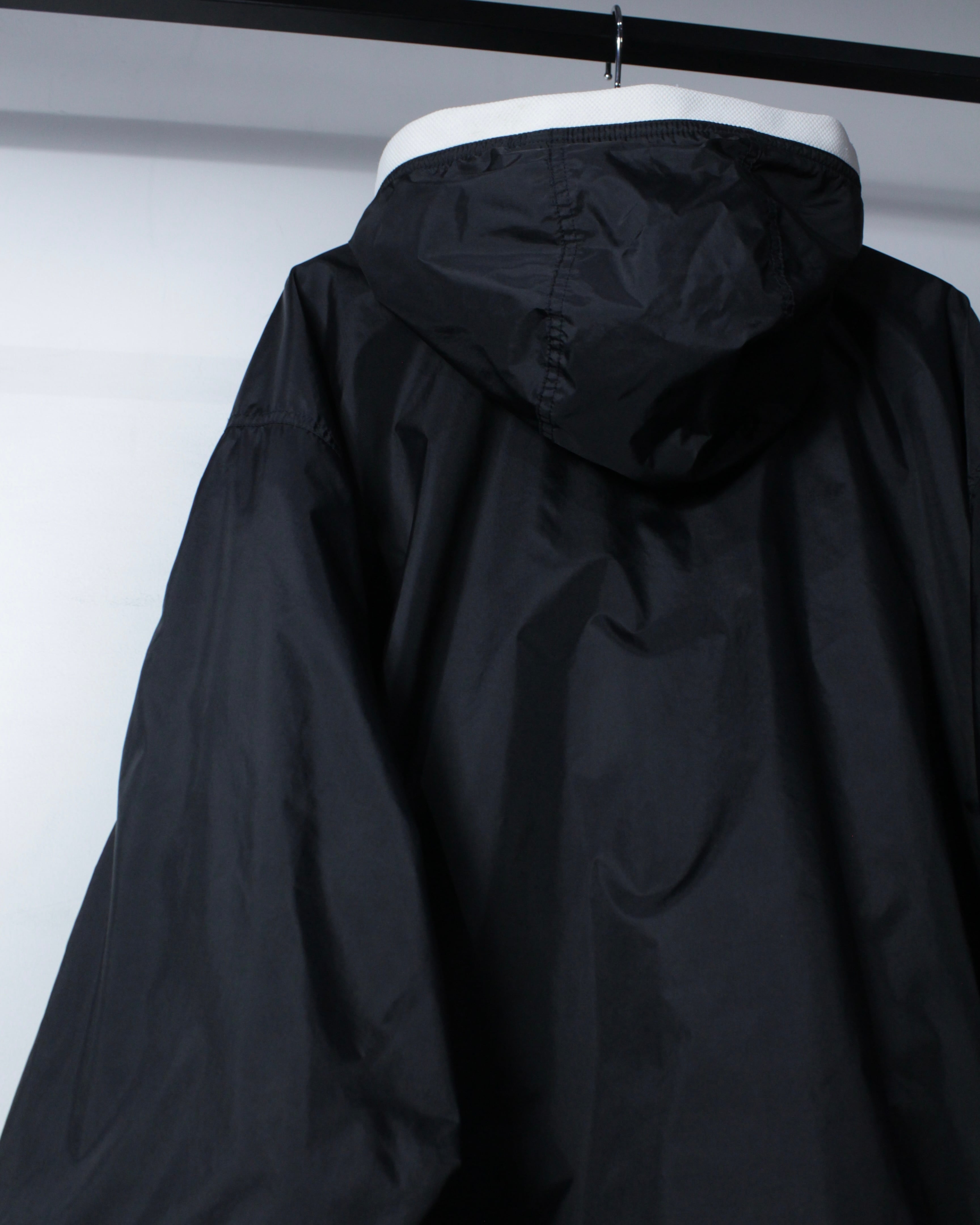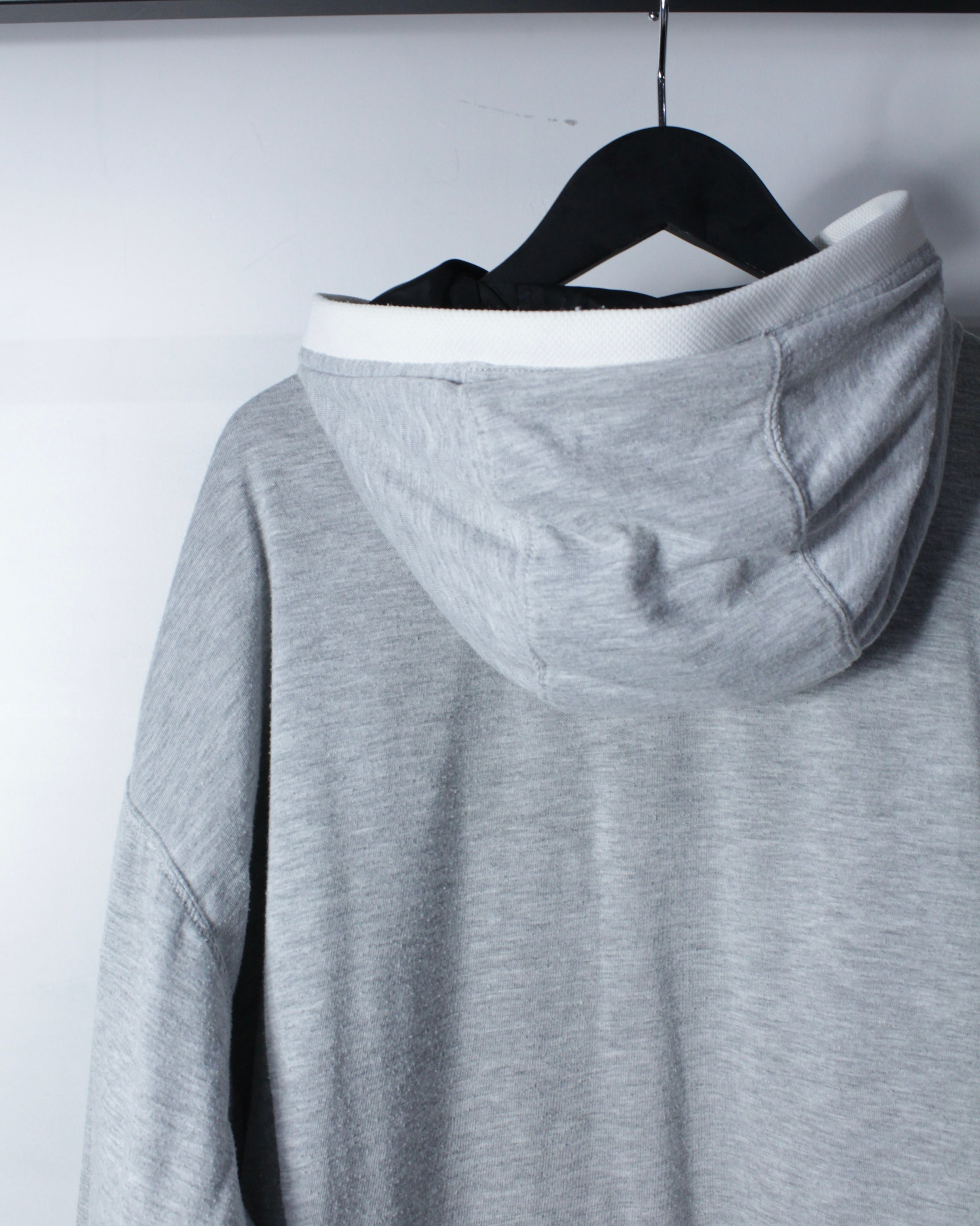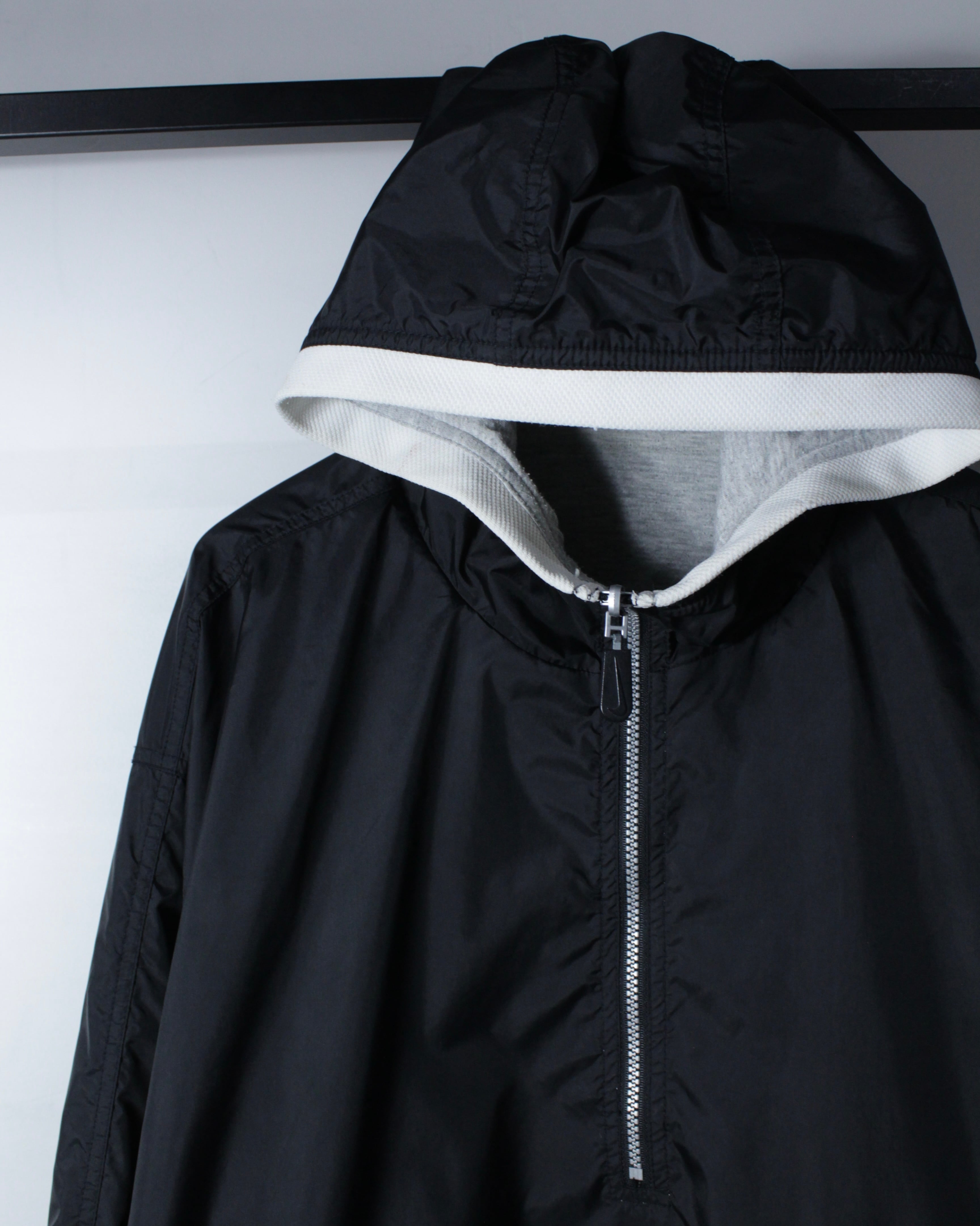 フロントのハーフジップ仕様に加え、ジップ付きポケットやフード、裾のドローコードなど実用性の高いディテールを完備。軽量なナイロンと肌馴染みの良いスウェットの切り替えにより、防風性と快適性を両立し、シーズン問わず着用可能な汎用性の高さも魅力です。