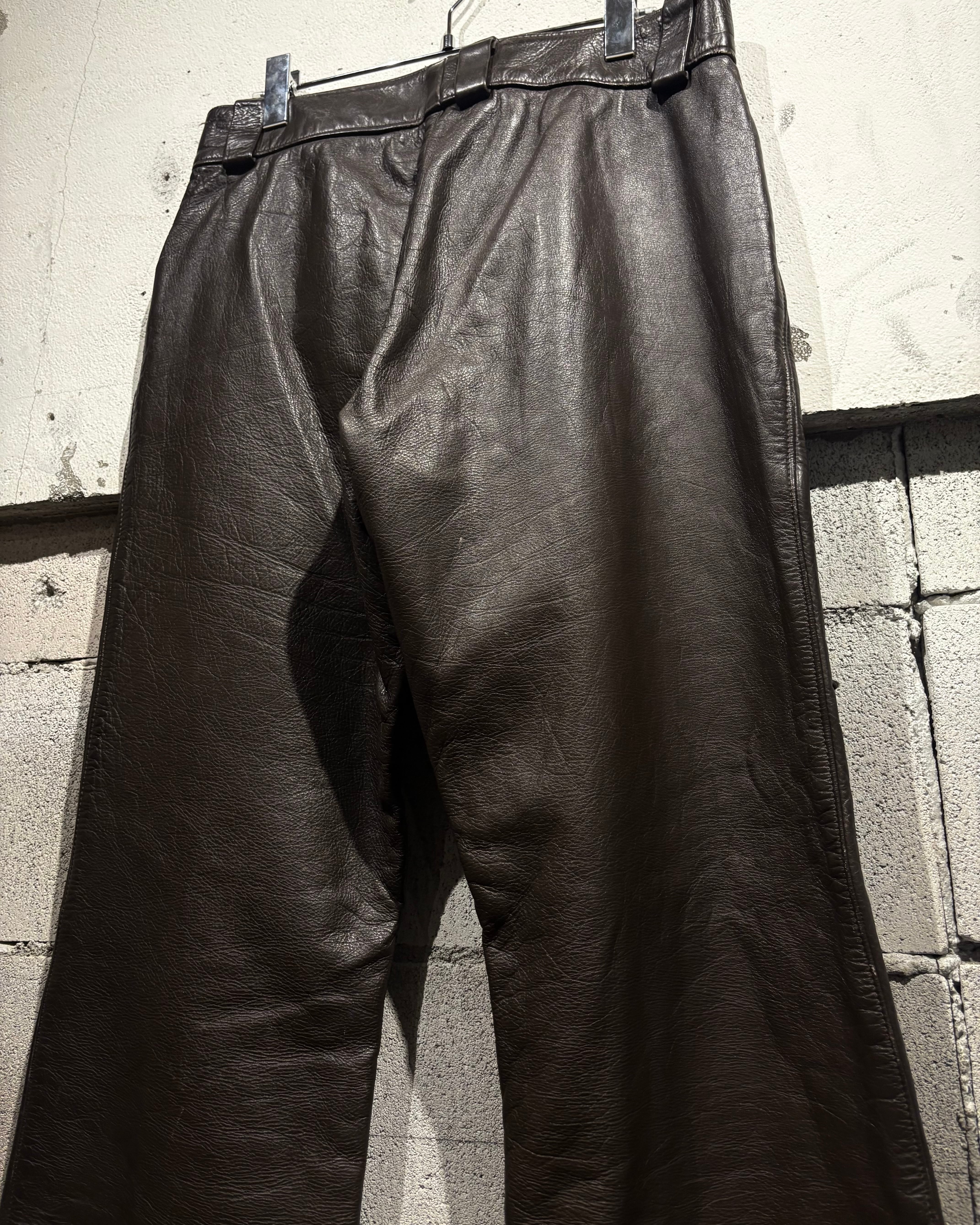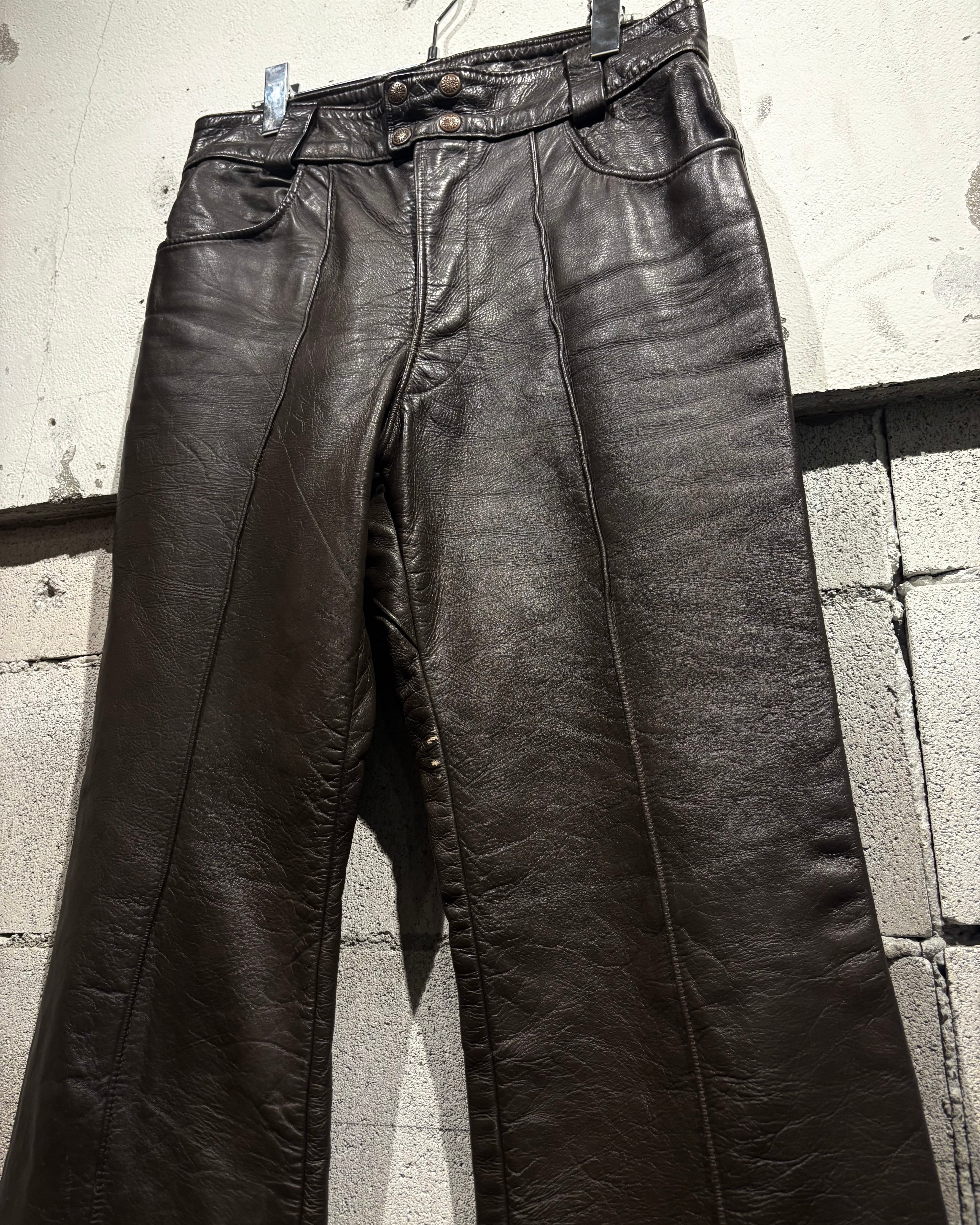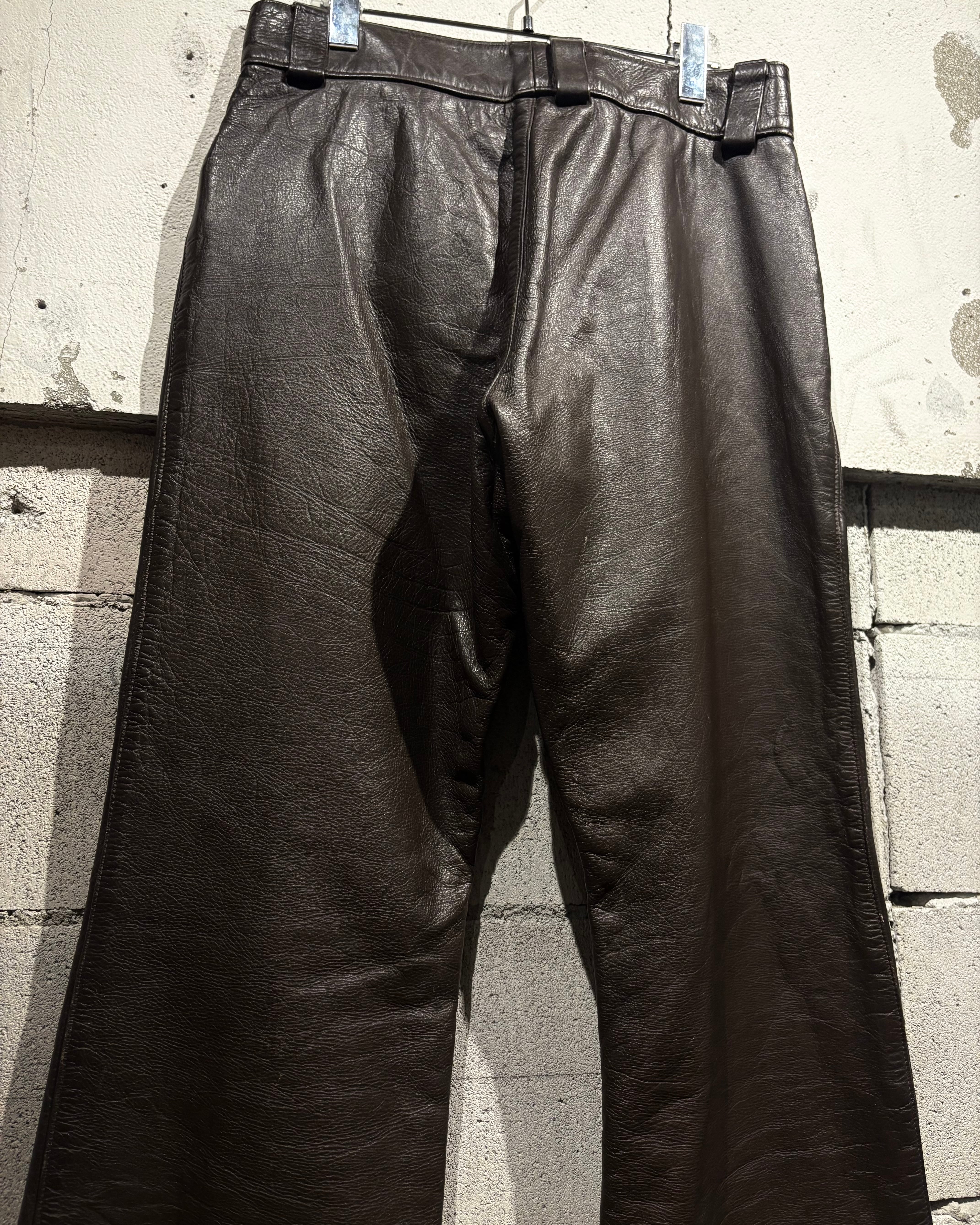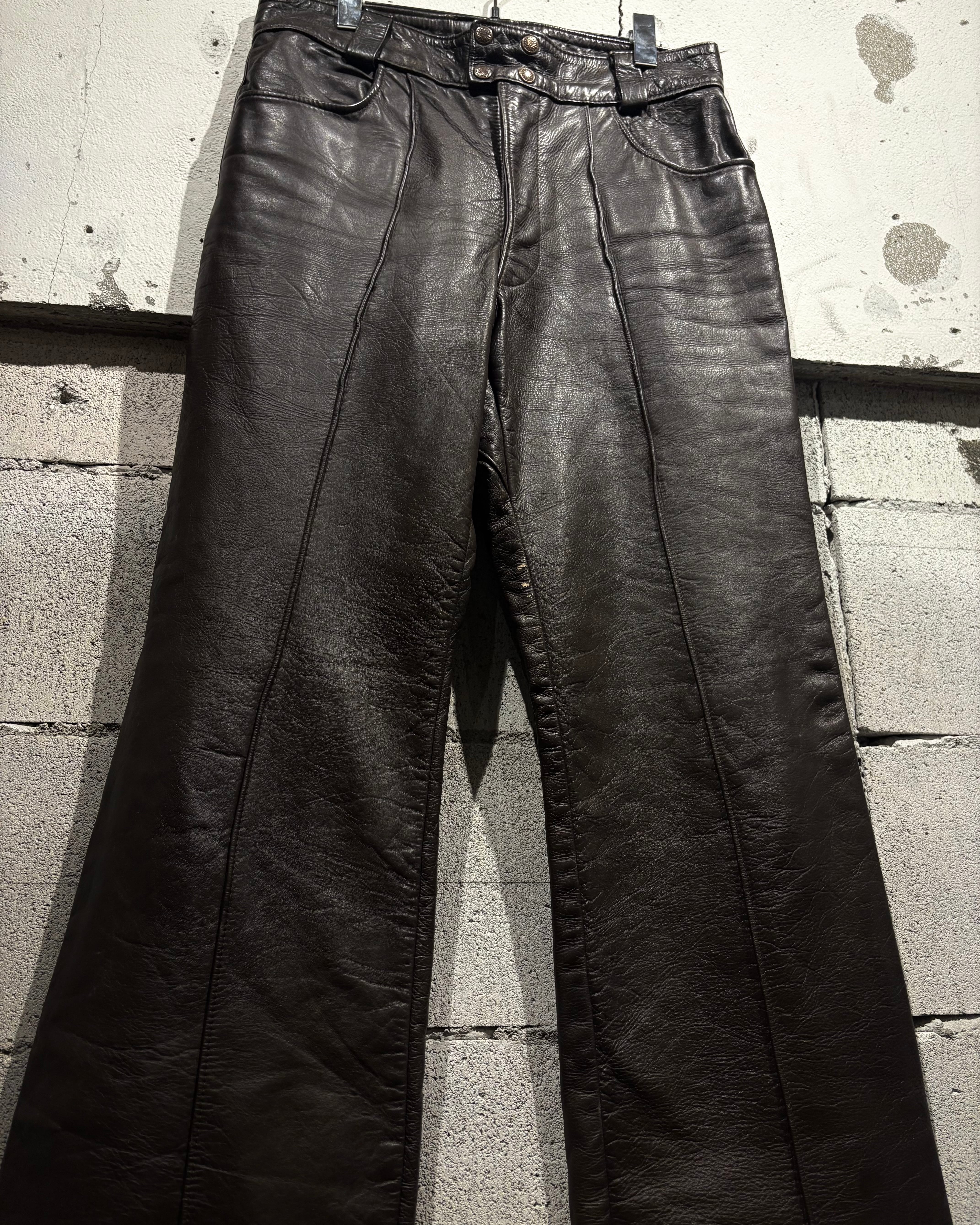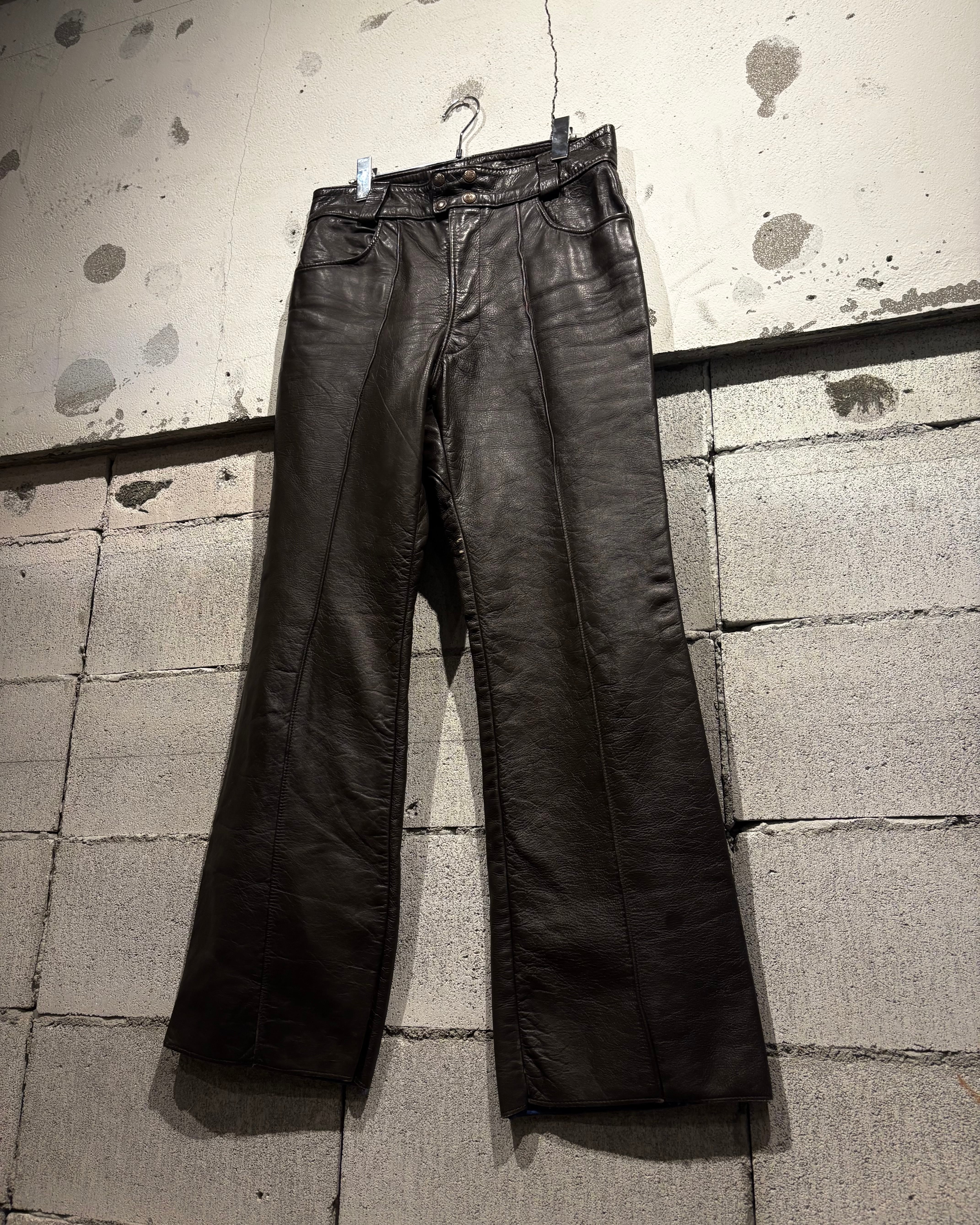 肉厚でしなやかなリアルレザーを贅沢に使用した、レザーフレアパンツの逸品。タフなルックスながら、ブラウンの色味が上品さも漂わせてます。
