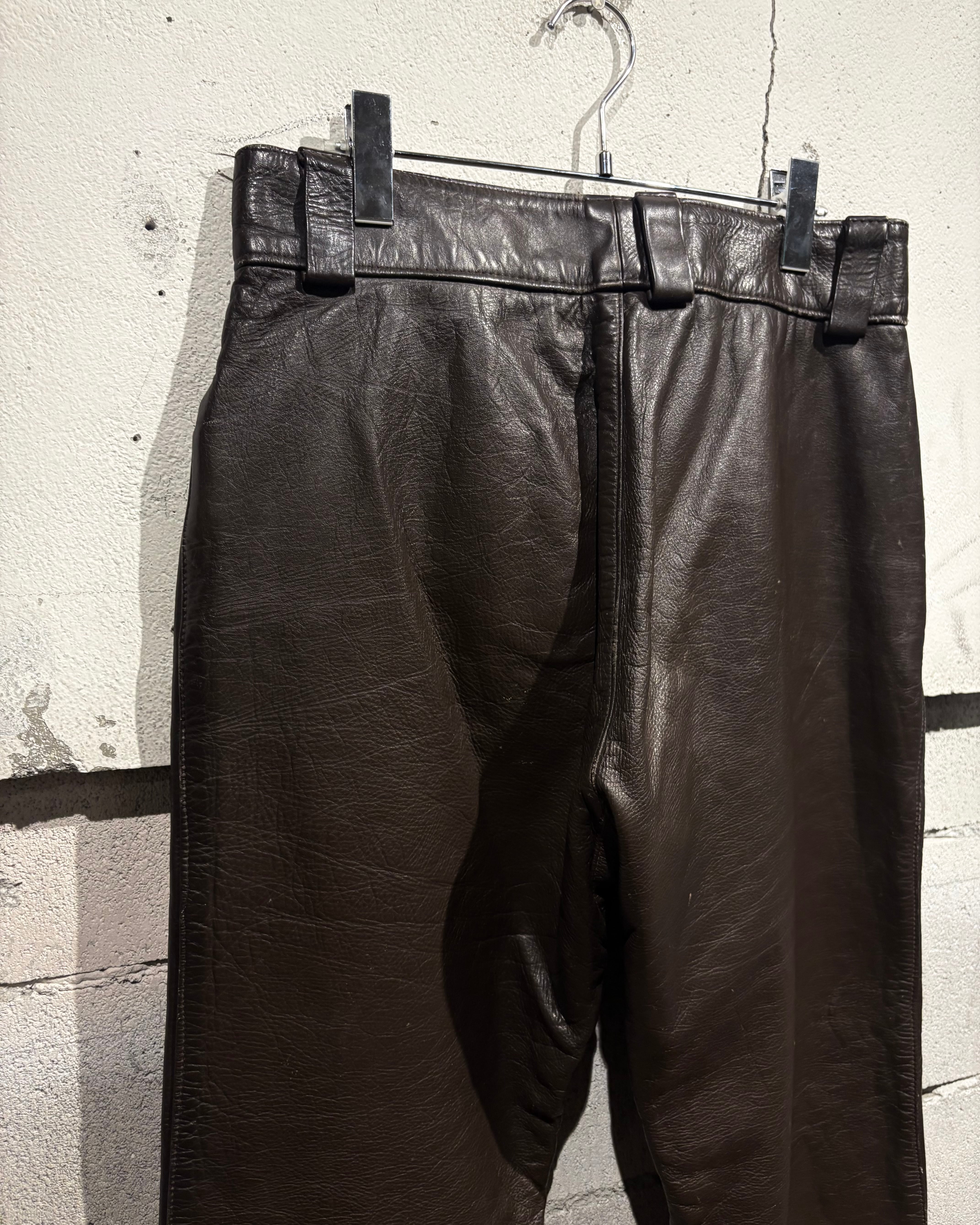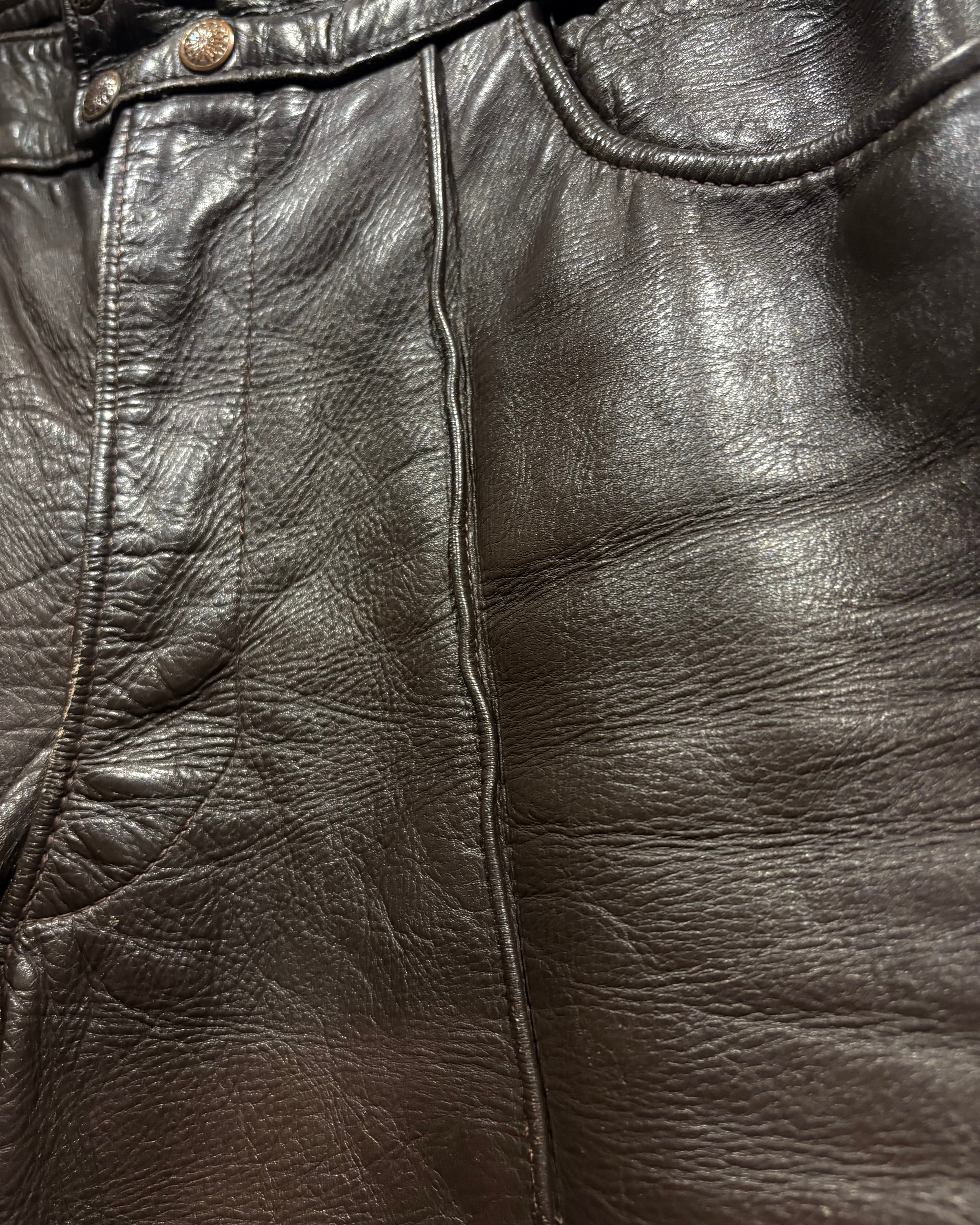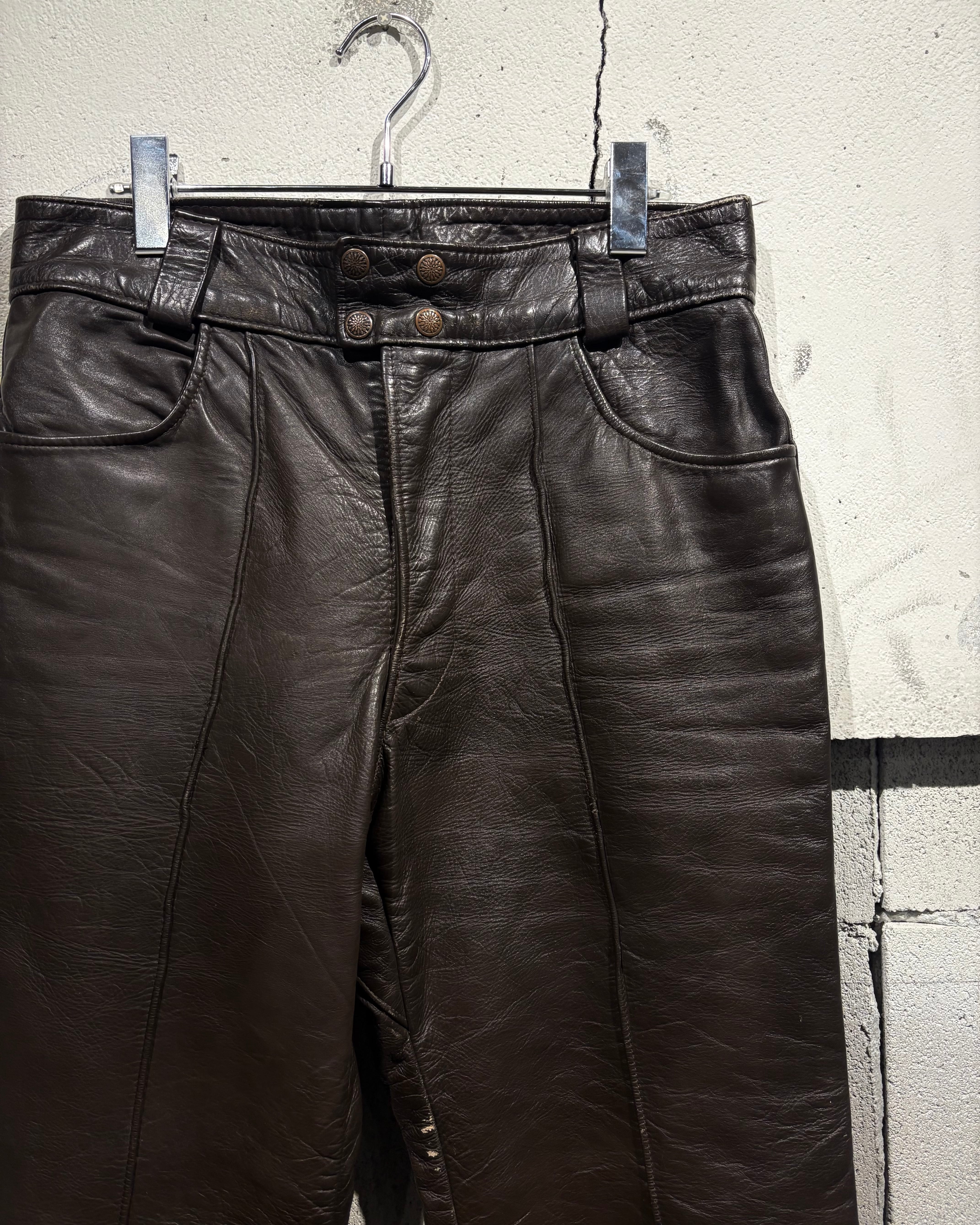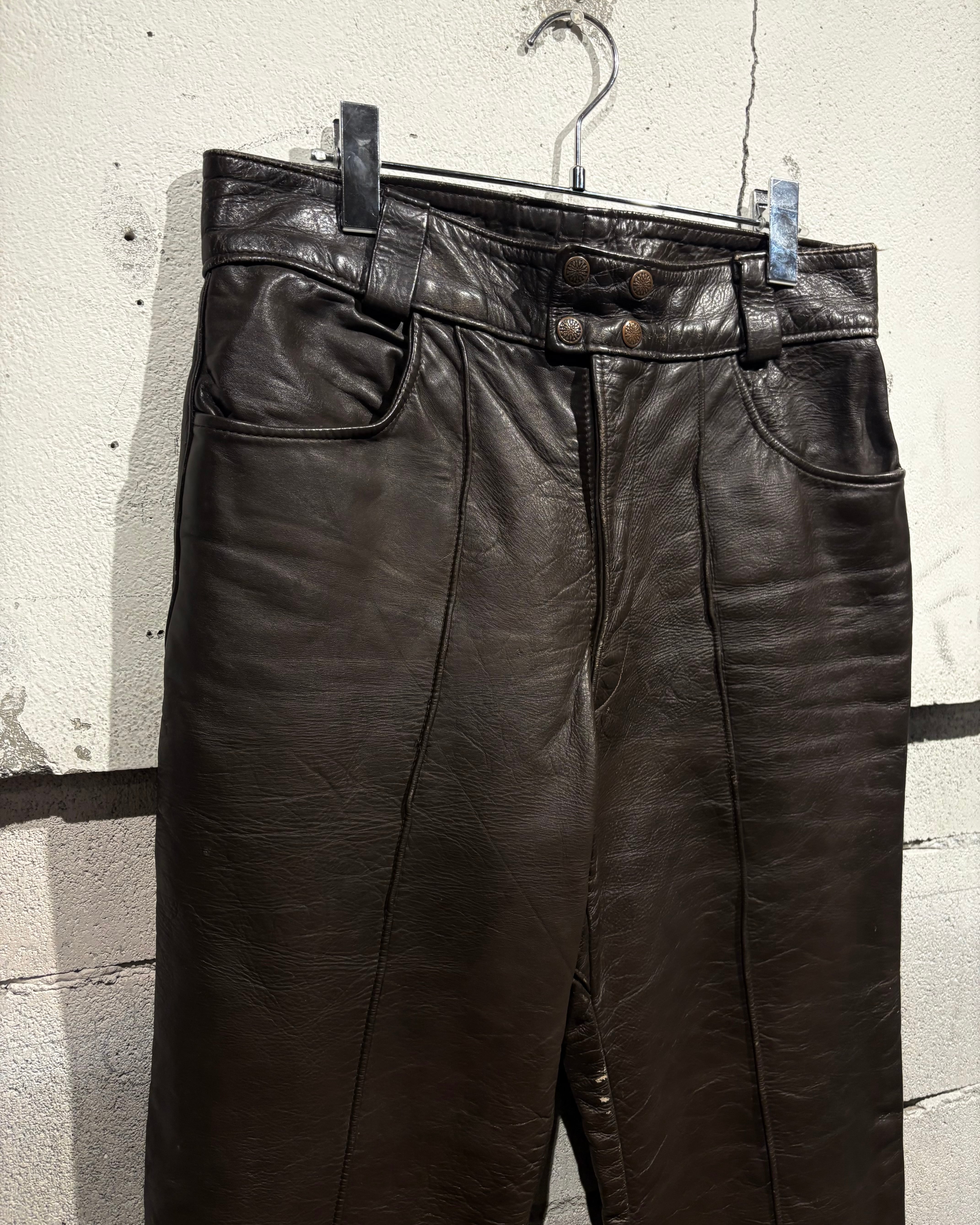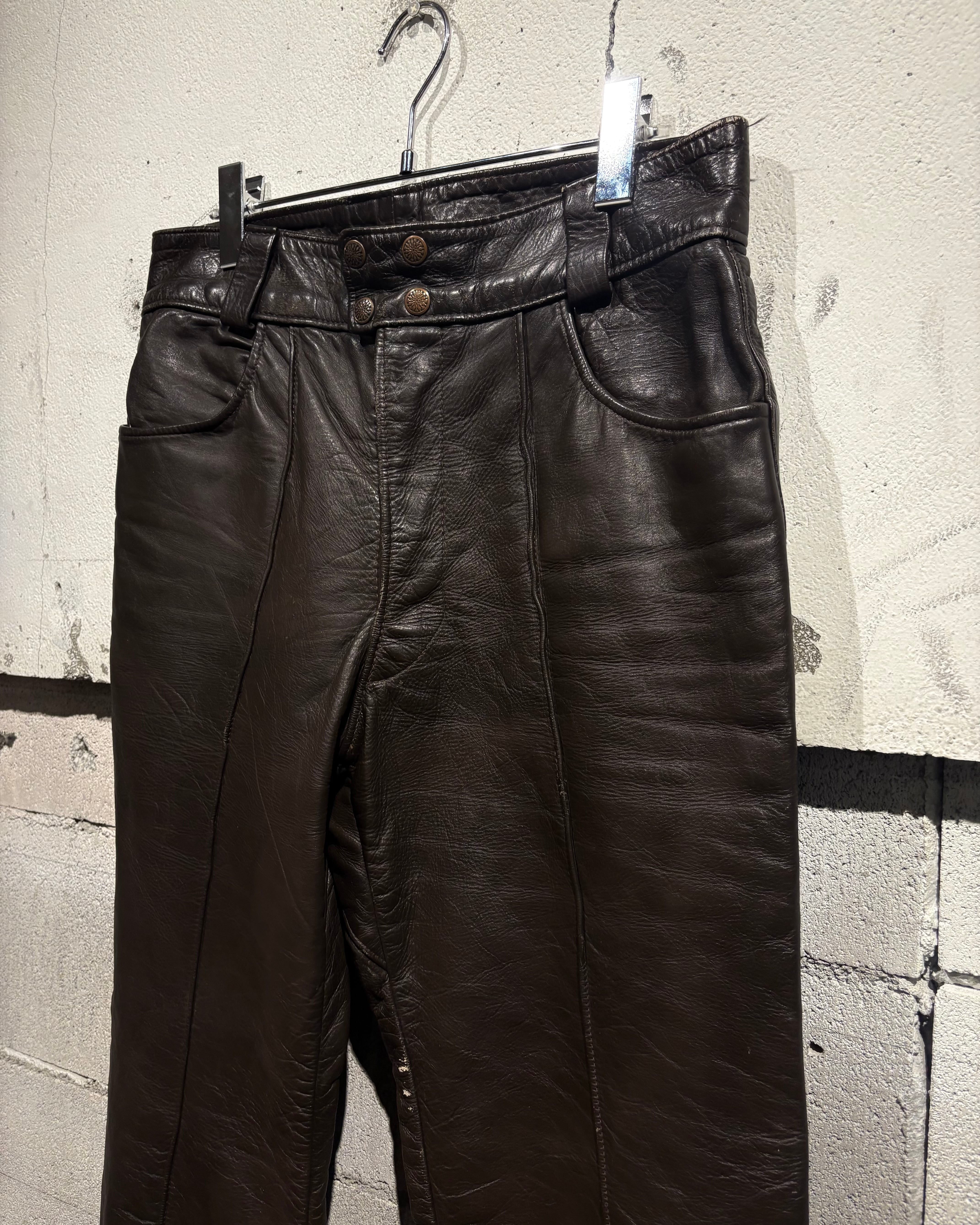 肉厚でしなやかなリアルレザーを贅沢に使用した、レザーフレアパンツの逸品。タフなルックスながら、ブラウンの色味が上品さも漂わせてます。