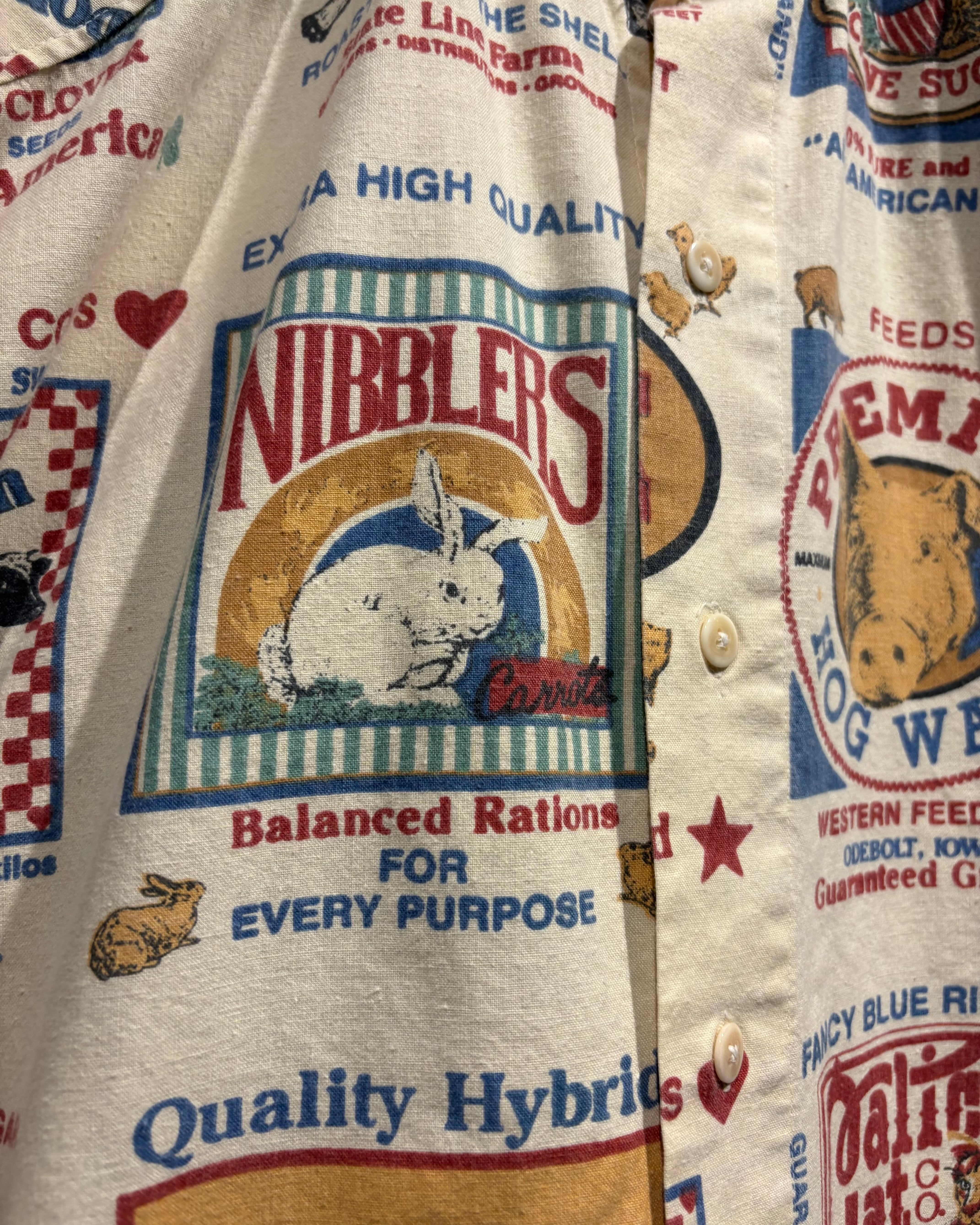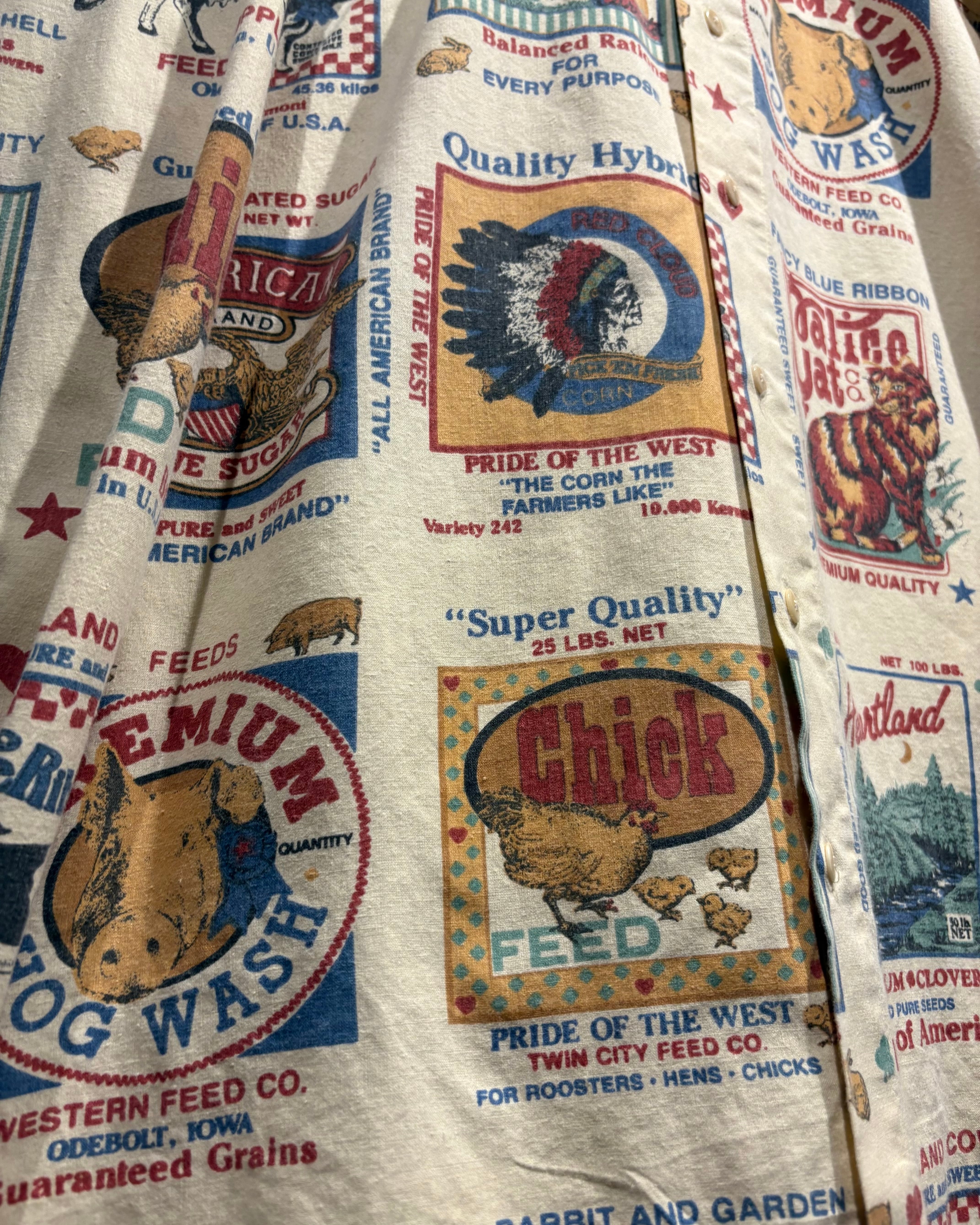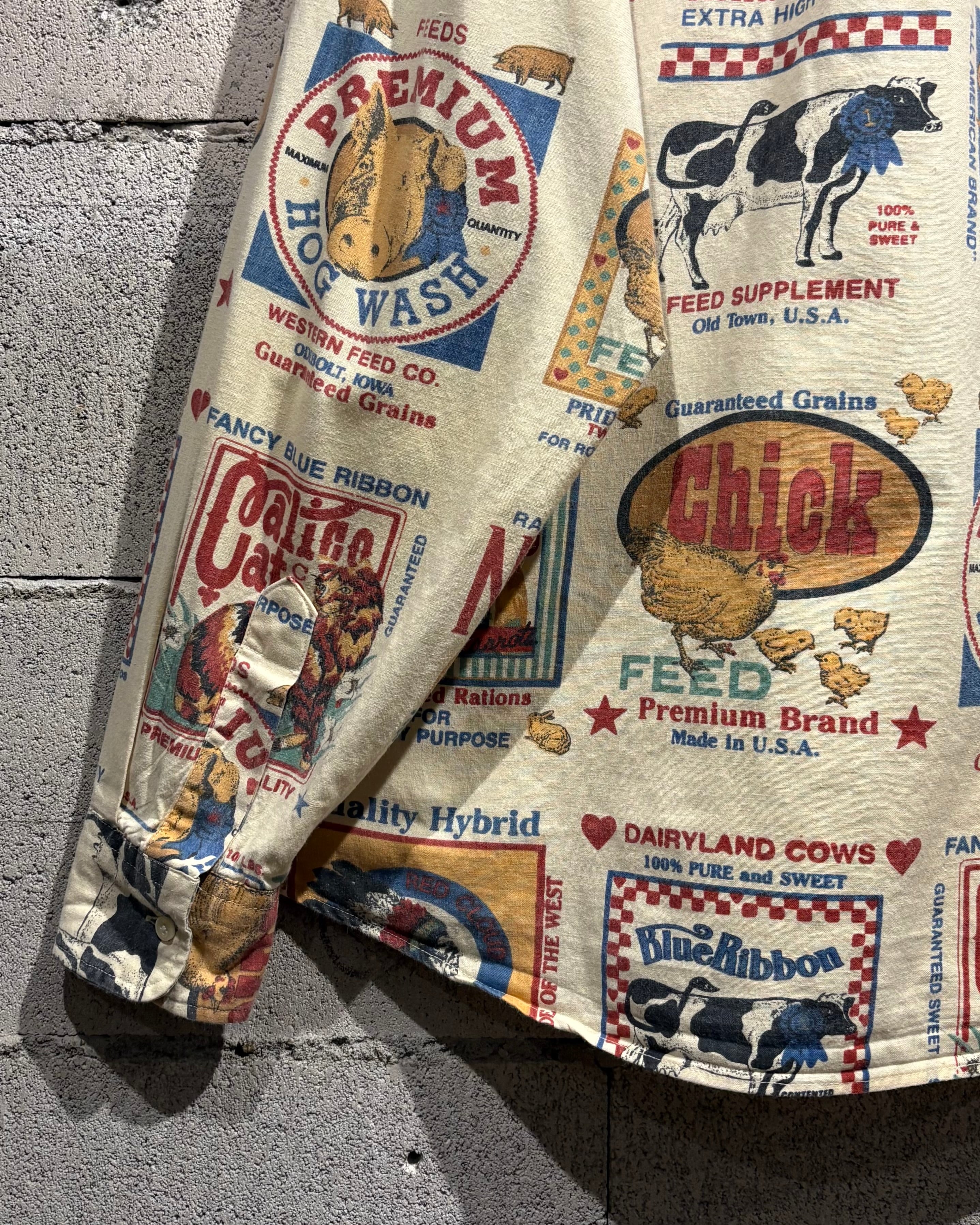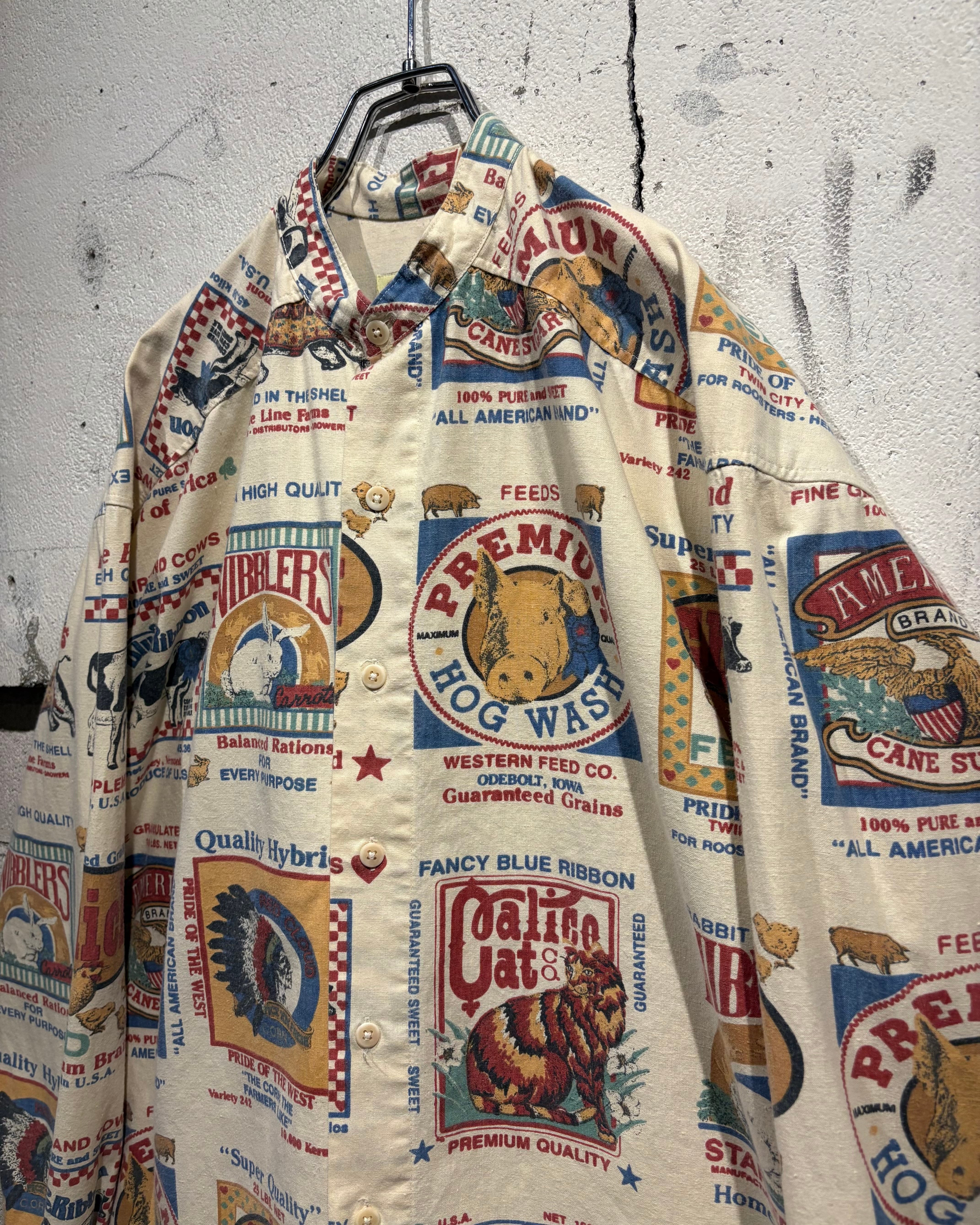 ベージュベースのボディ全面に、フィードサックをモチーフにした総柄プリントを落とし込んだ1着。