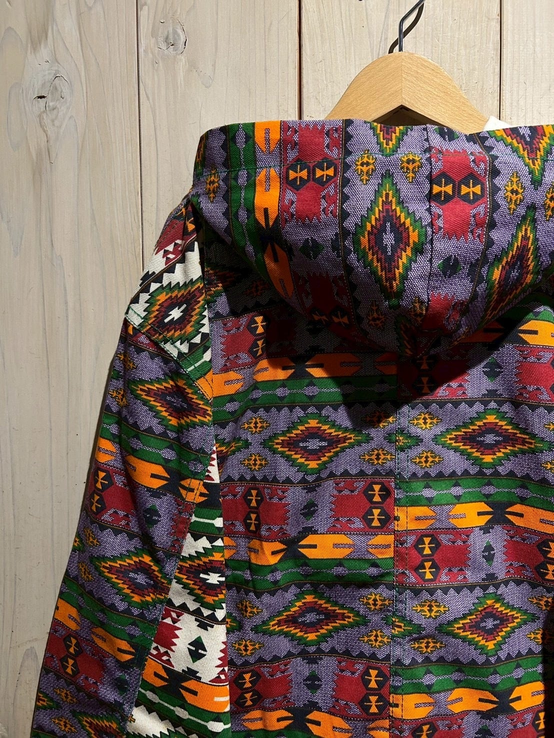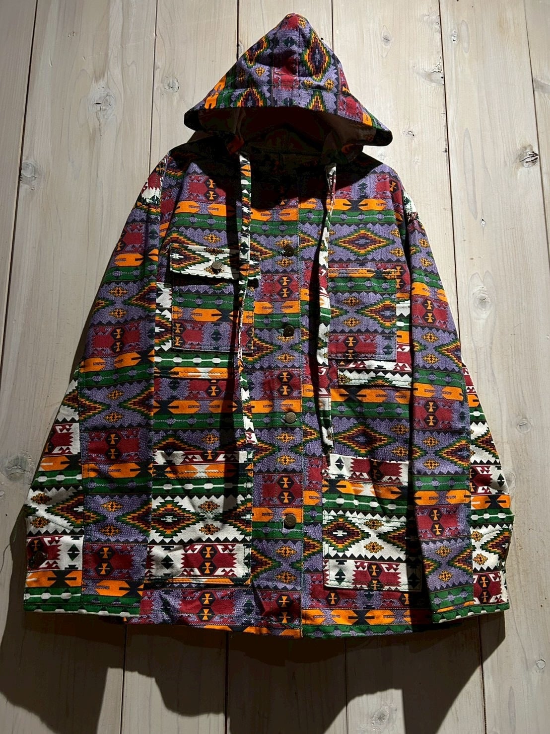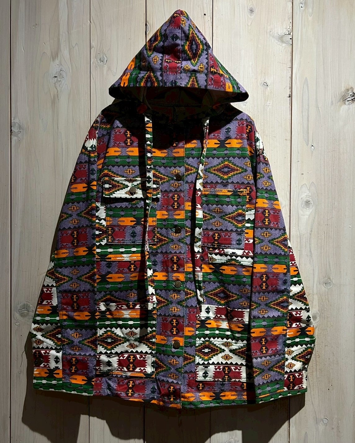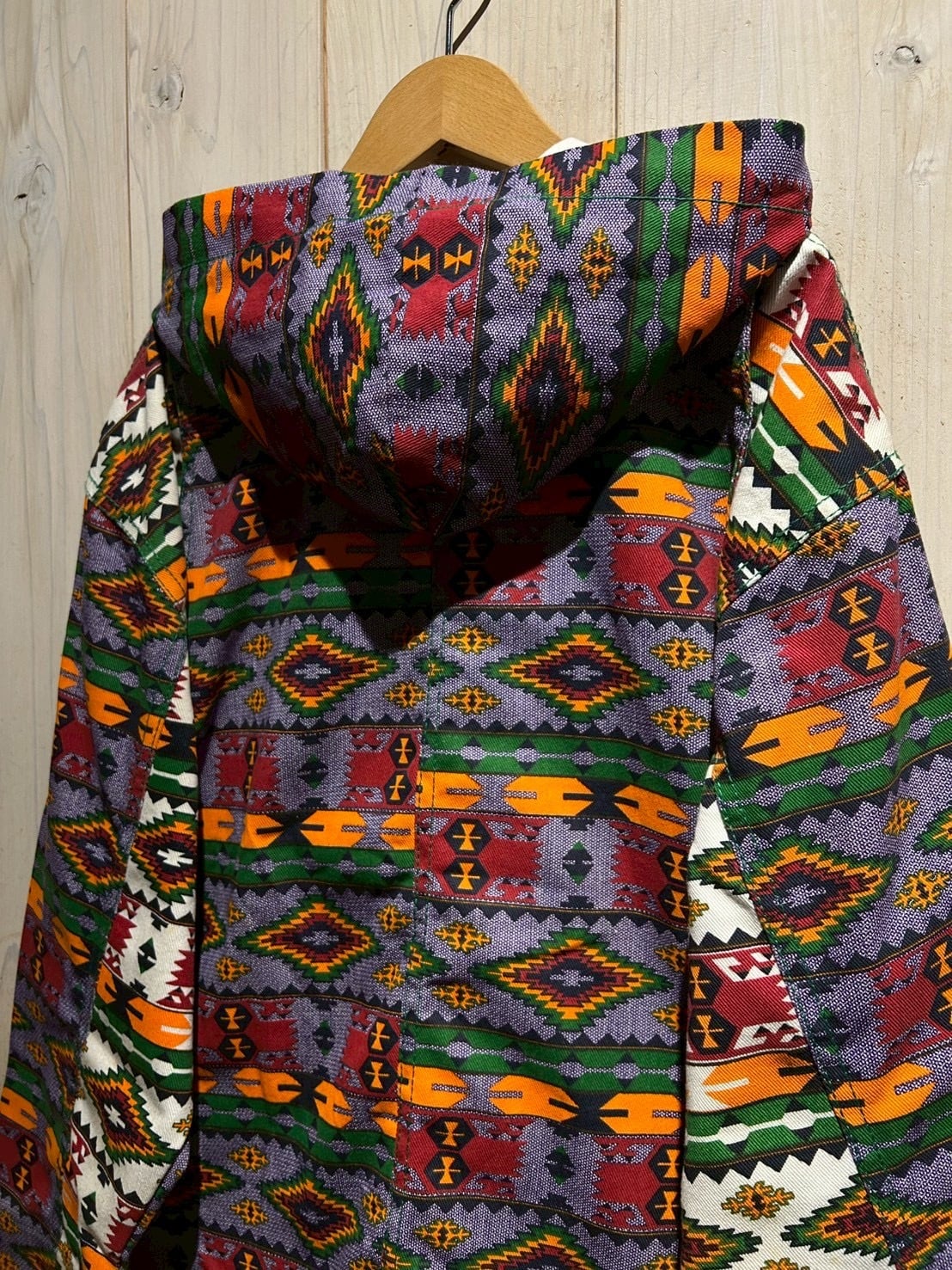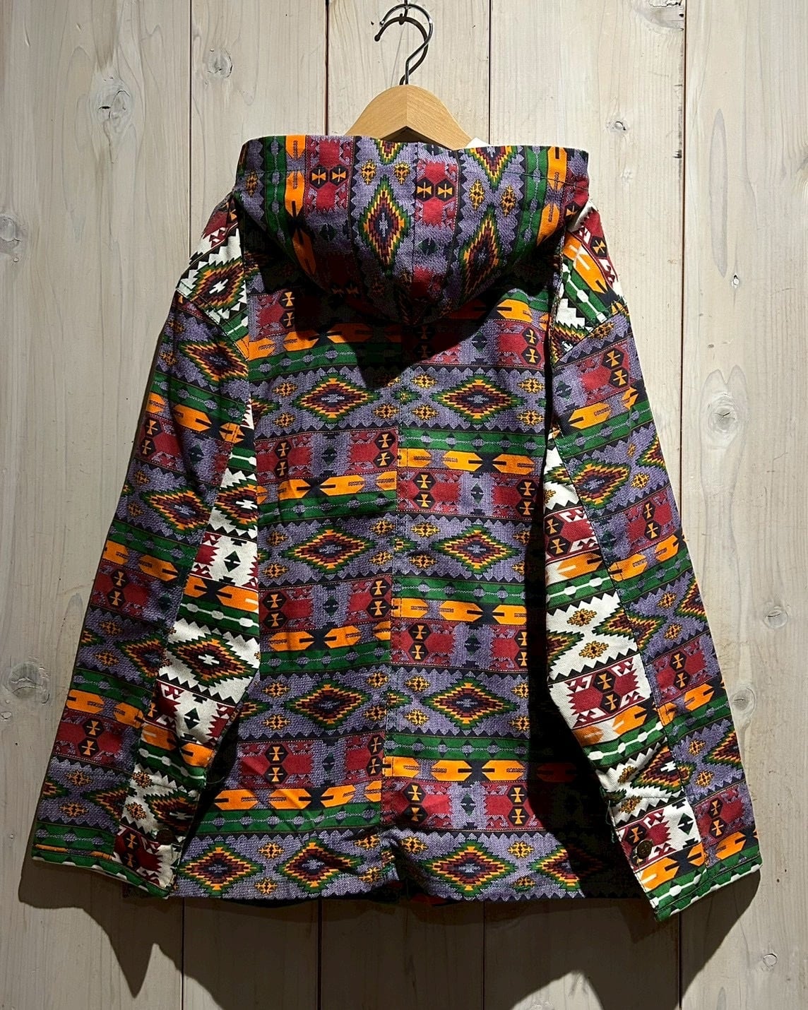 存在感抜群のネイティブ柄を全面に落とし込んだ、USA製80'sフーディジャケットをご紹介いたします。