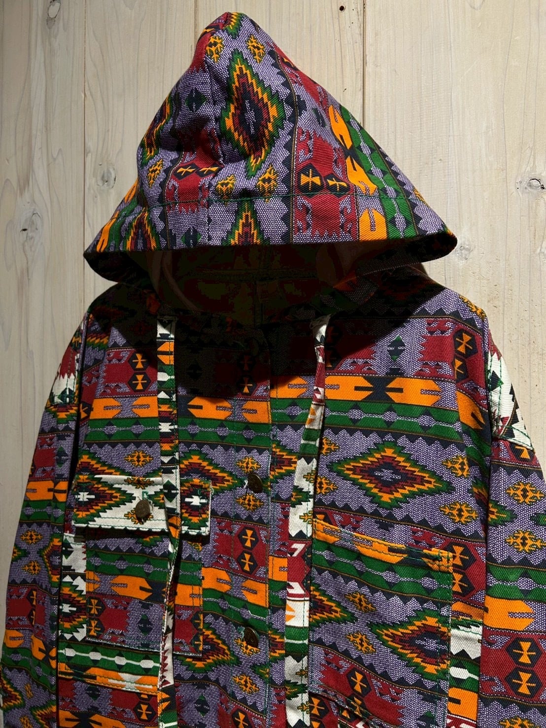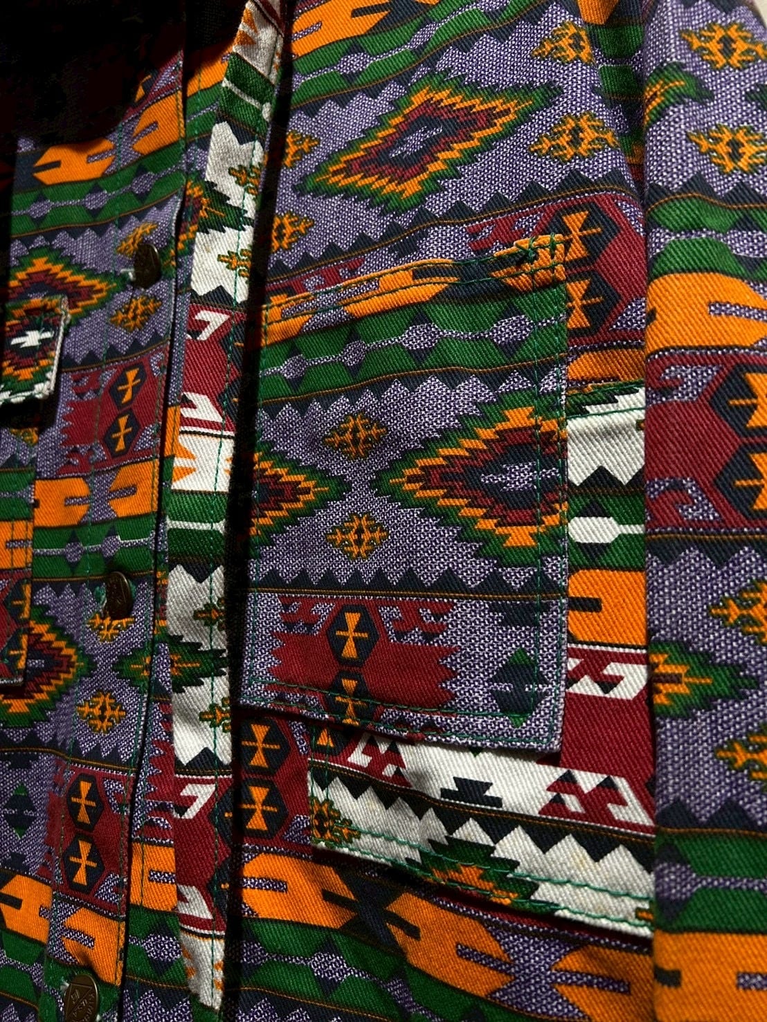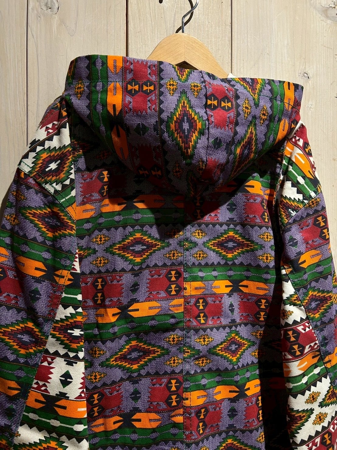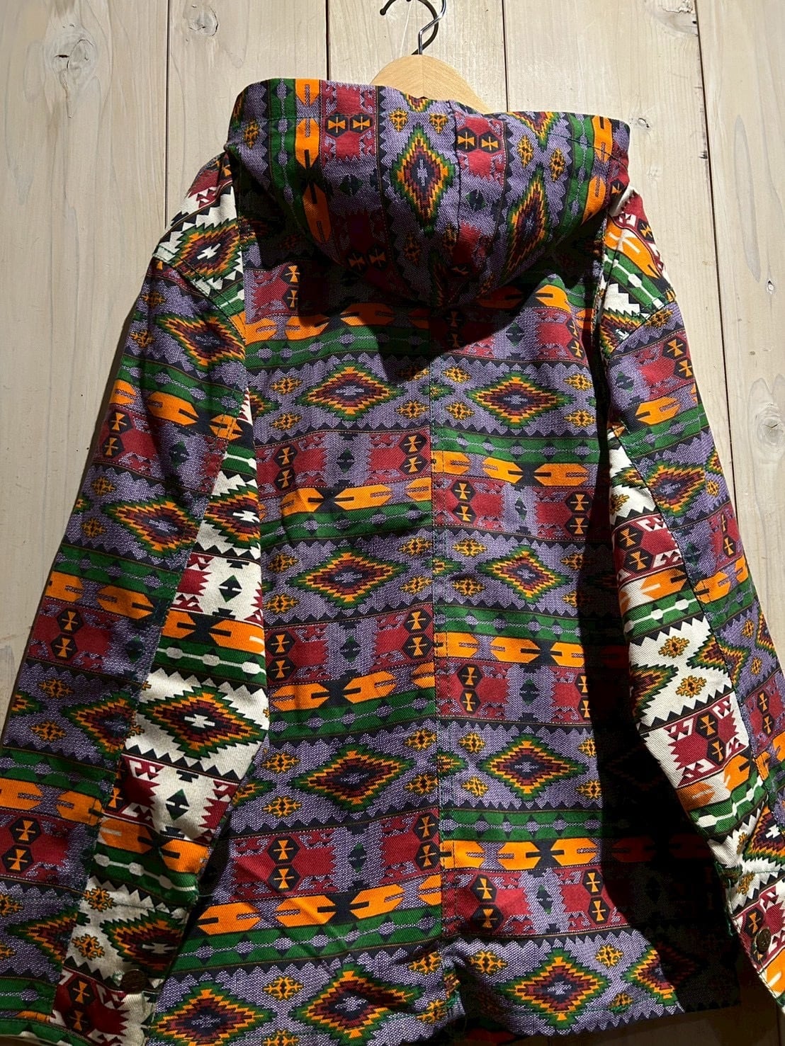 存在感抜群のネイティブ柄を全面に落とし込んだ、USA製80'sフーディジャケットをご紹介いたします。