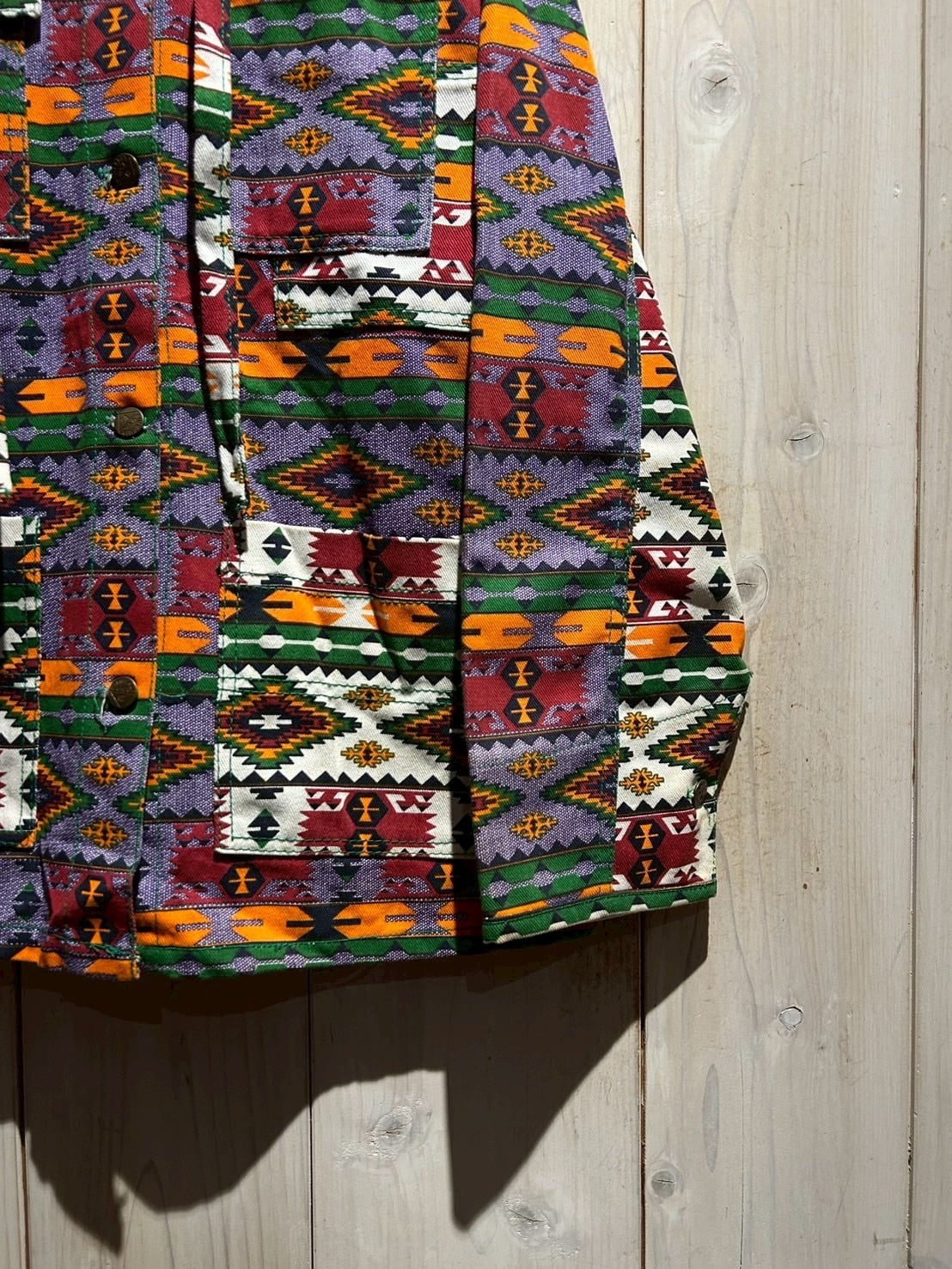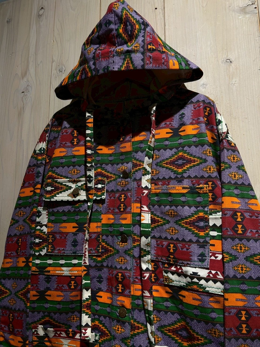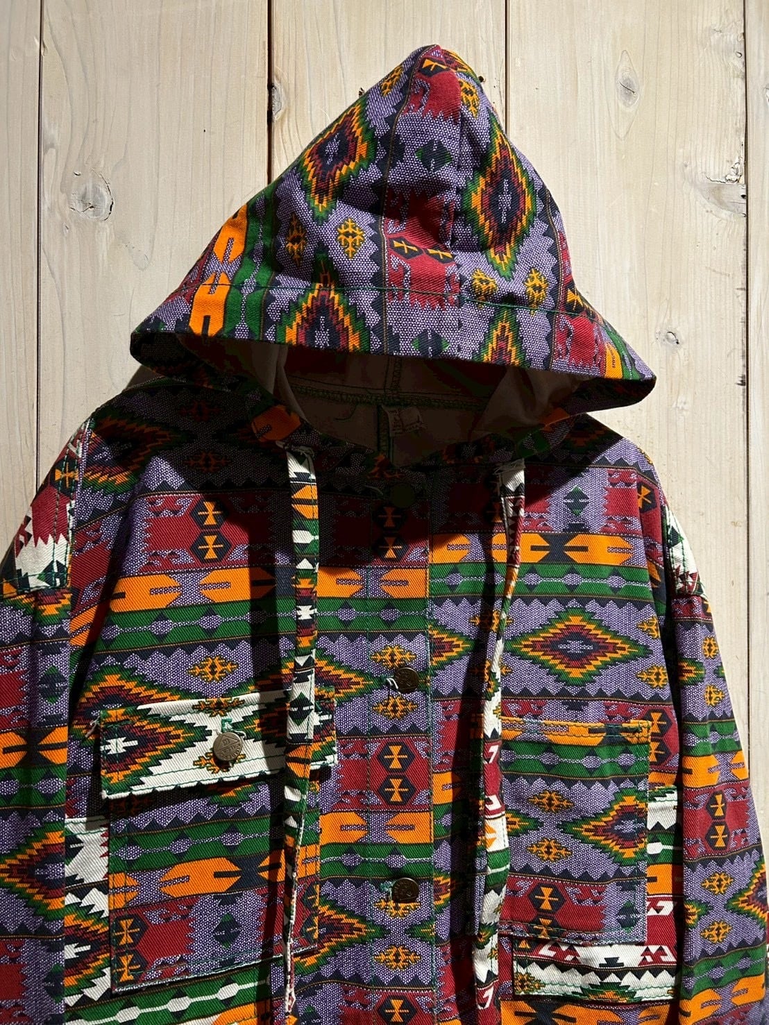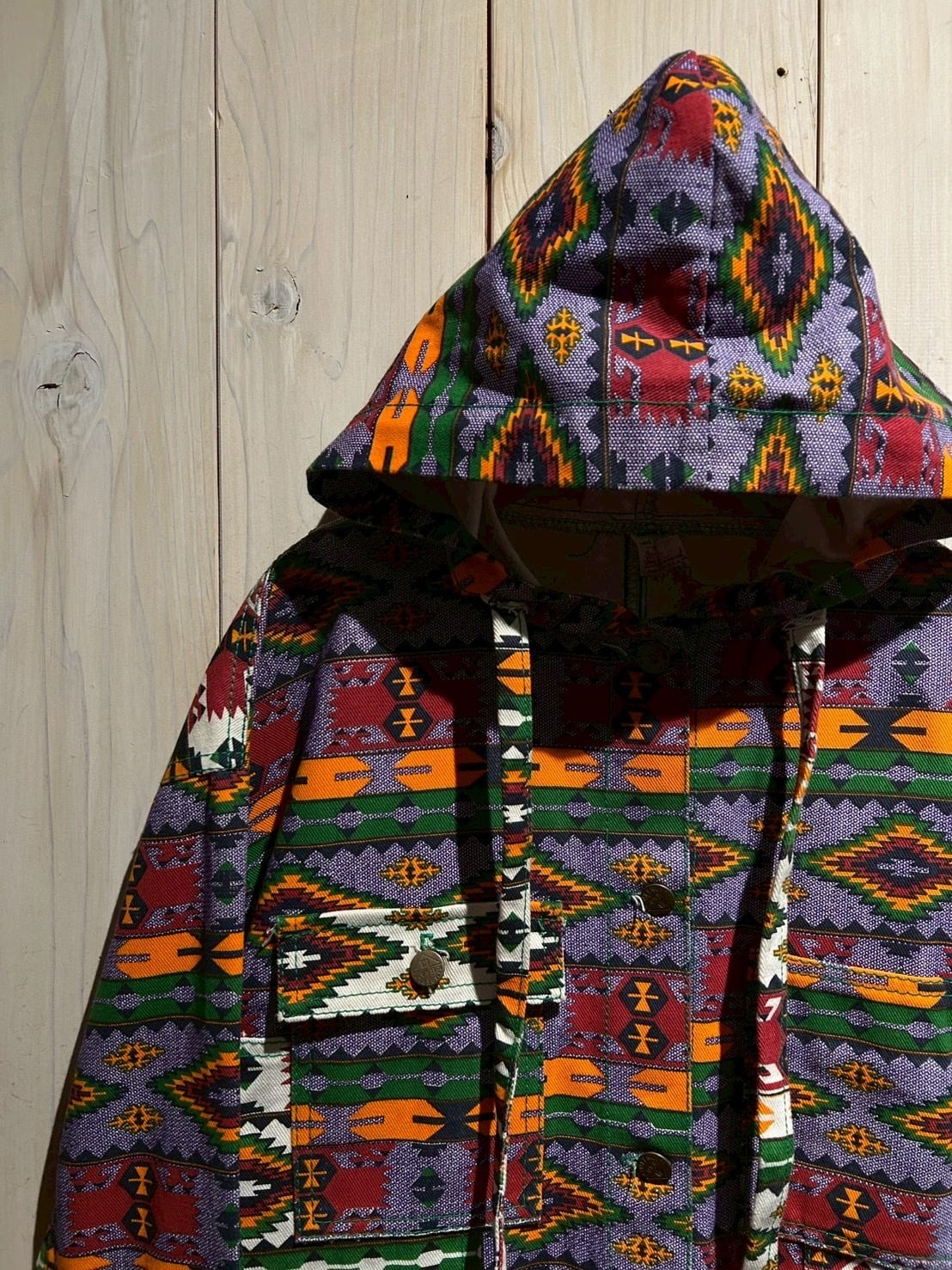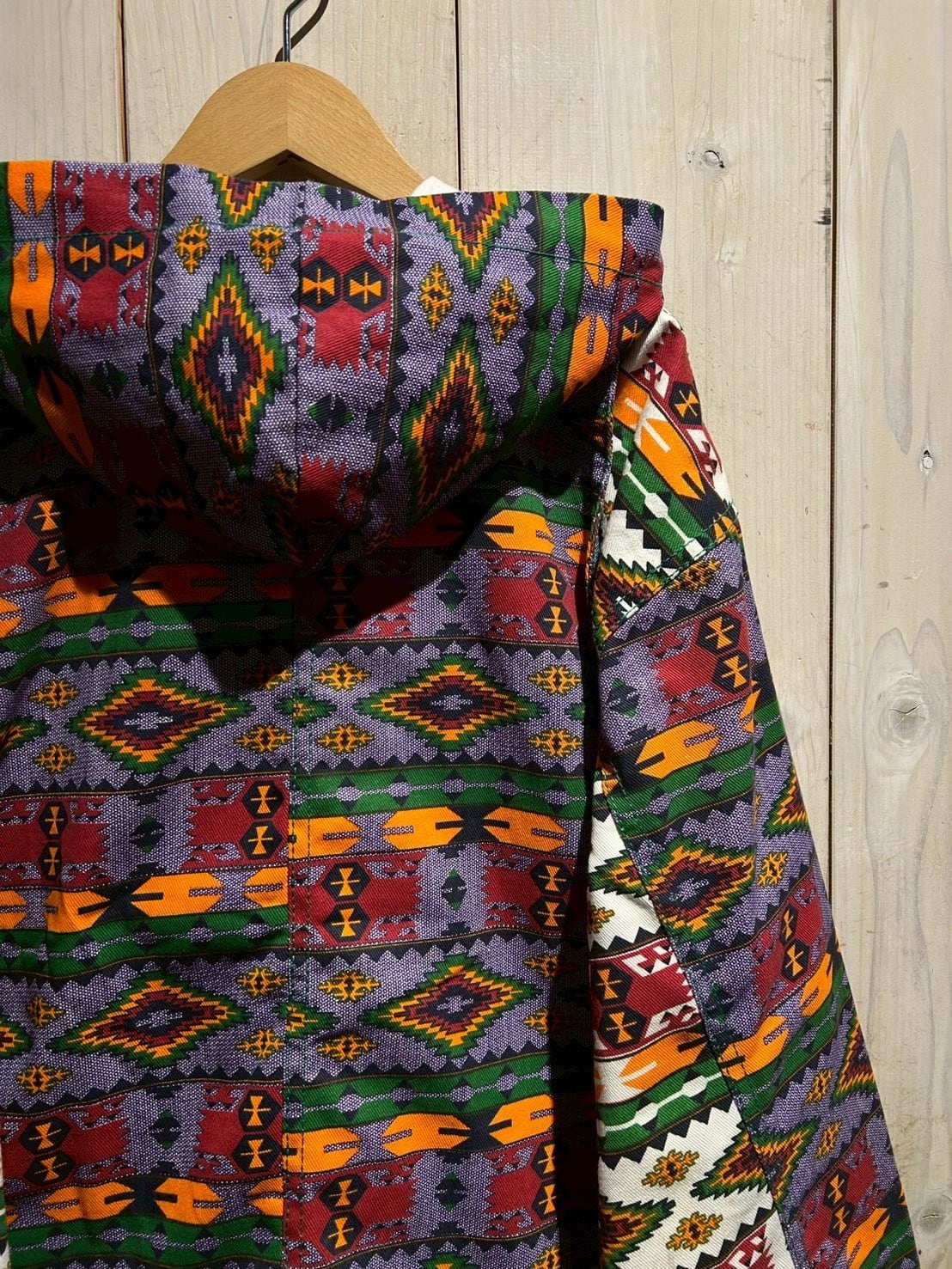 存在感抜群のネイティブ柄を全面に落とし込んだ、USA製80'sフーディジャケットをご紹介いたします。