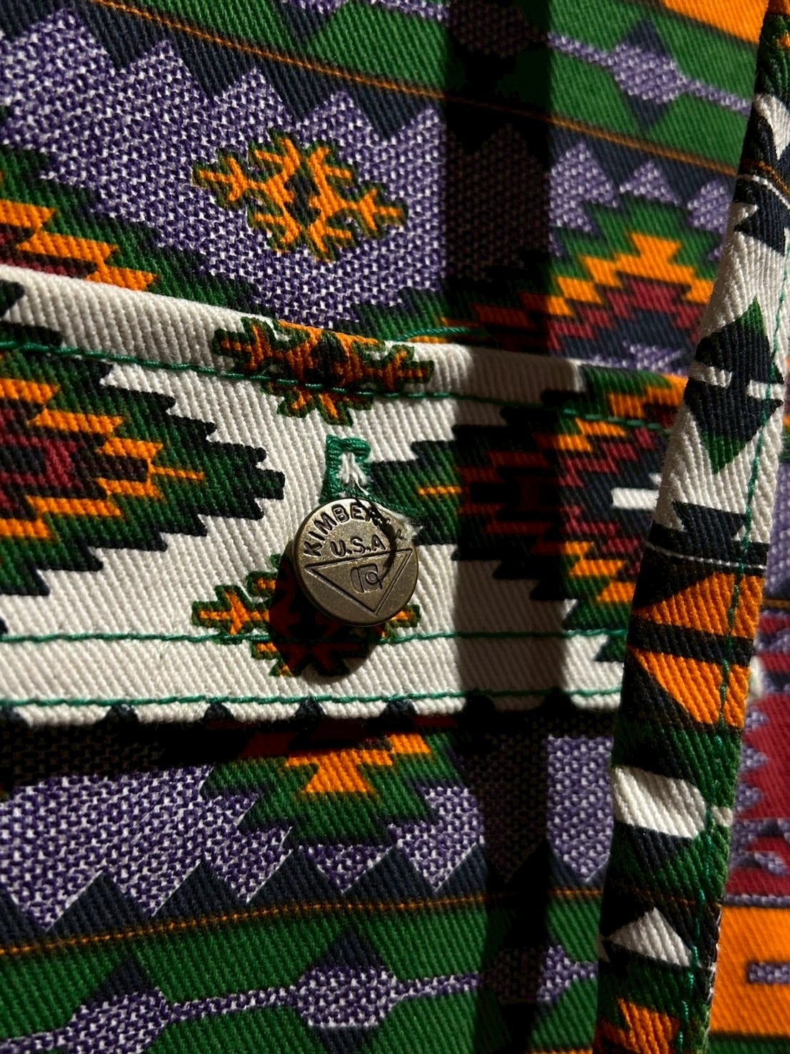 ボディにはレッド、グリーン、パープル、オレンジといった多色使いのネイティブパターンを採用。幾何学的な柄が織りなすインパクトのあるデザインでありながら、どこか温かみのある雰囲気を感じさせる1着に。