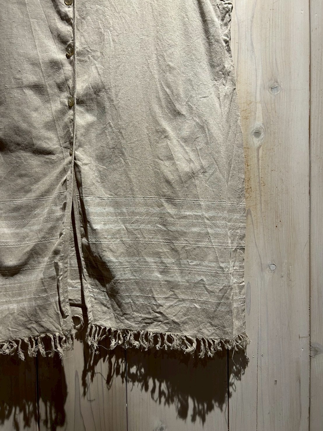 フロントはVネックのボタン仕様でスッキリとした印象に。裾にはフリンジを施すことで、ラフさと抜け感をプラスし、ナチュラルな雰囲気の中に程よいデザイン性を感じさせるディテールに仕上がっています。