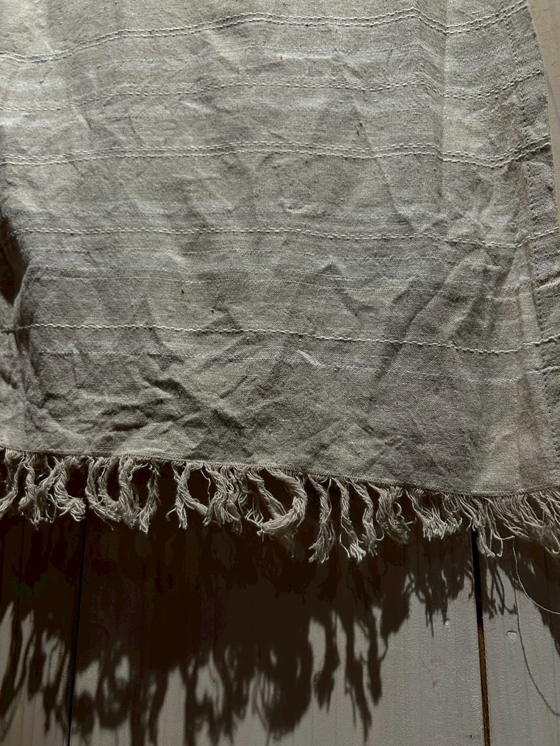 生成りのような優しい色味に、裾付近にはさりげなくボーダーを走らせることで、シンプルながらも表情に奥行きを持たせた1着に仕上がっています。